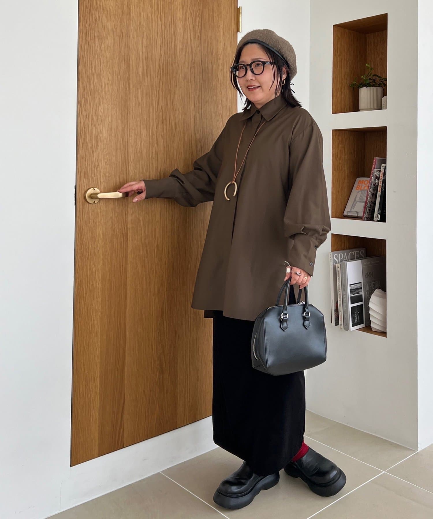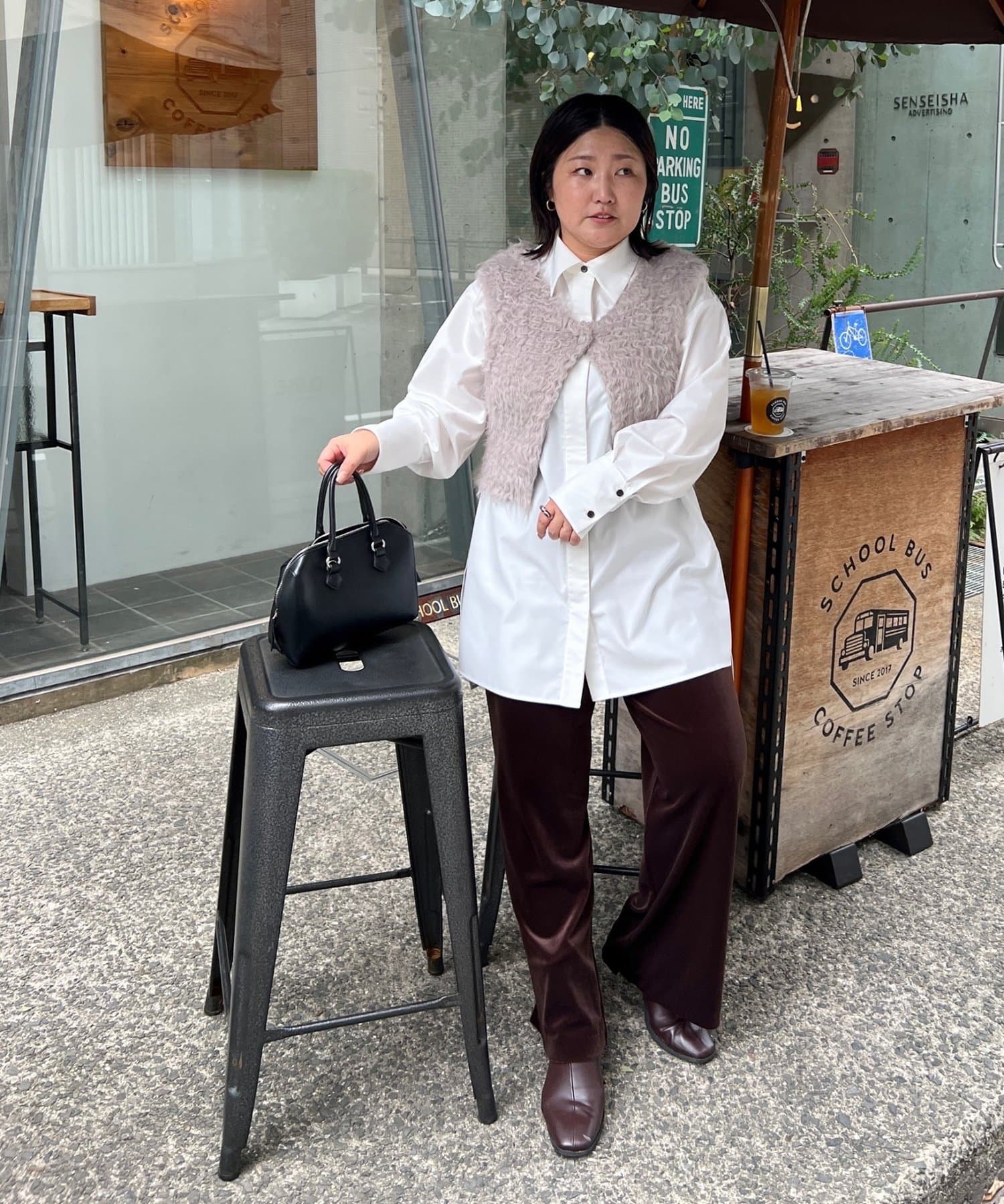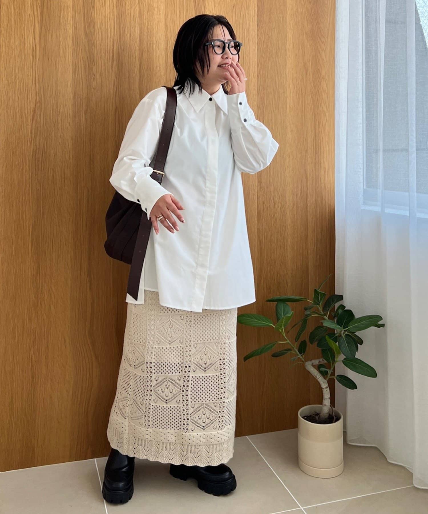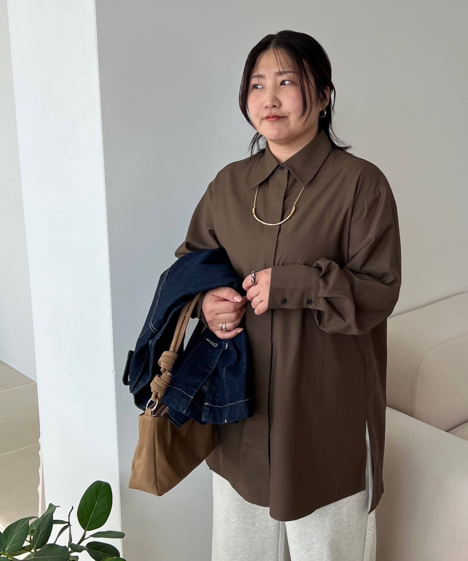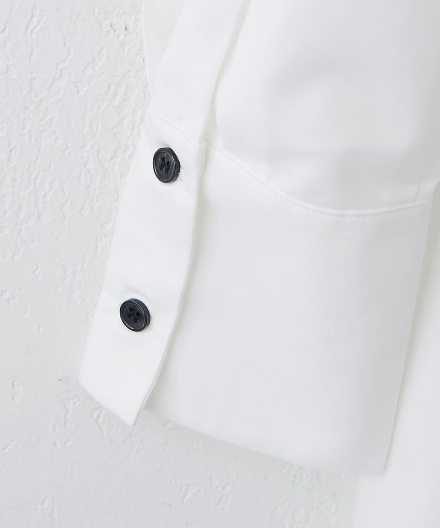 シャツは少し衿元は大きめにトレンド感も無理なく取り入れ、黒ボタンがアクセントに。比翼ボタンにすることで、どんなコーデにも使いやすい、スッキリ見えにこだわりました。