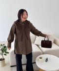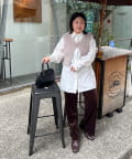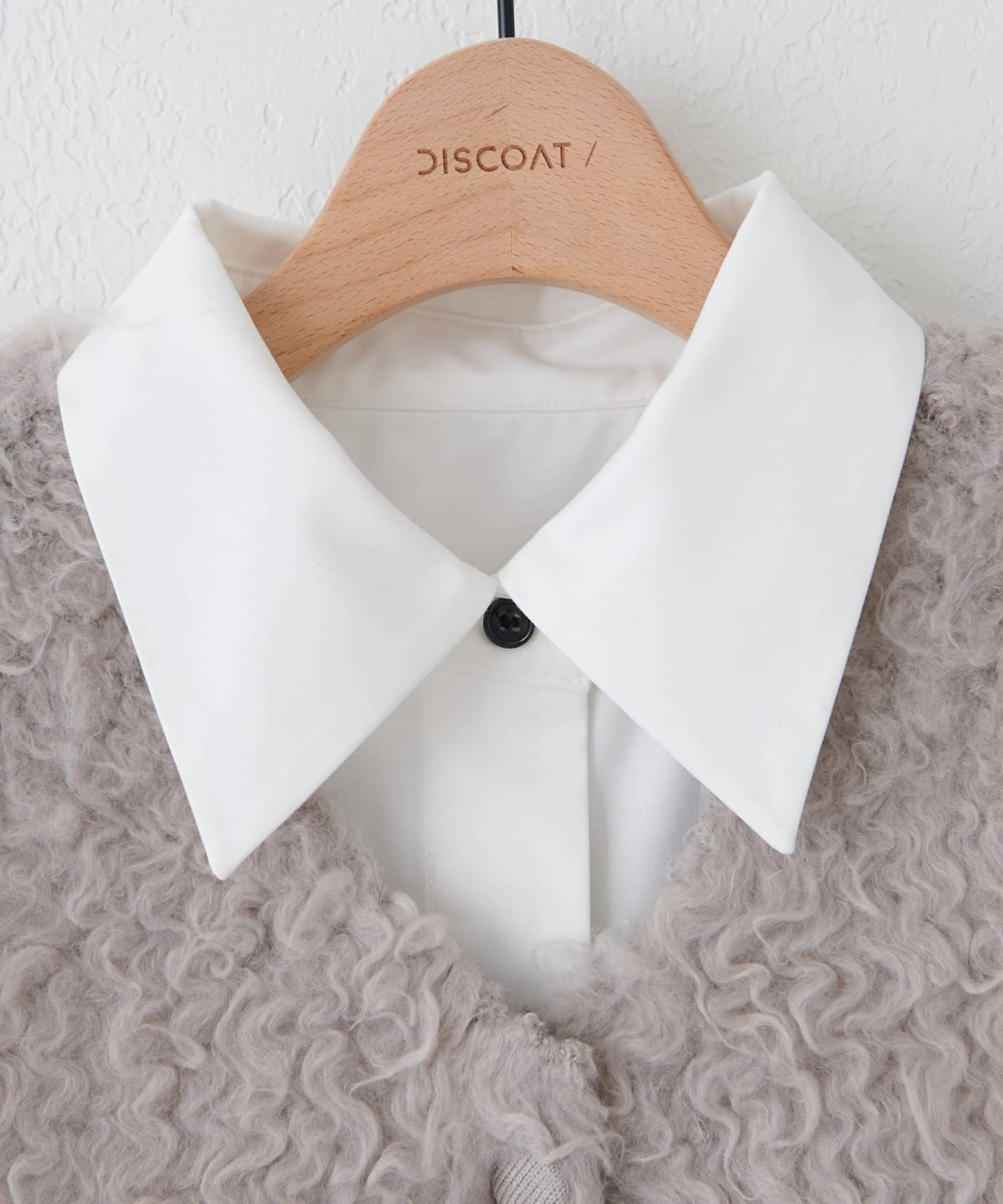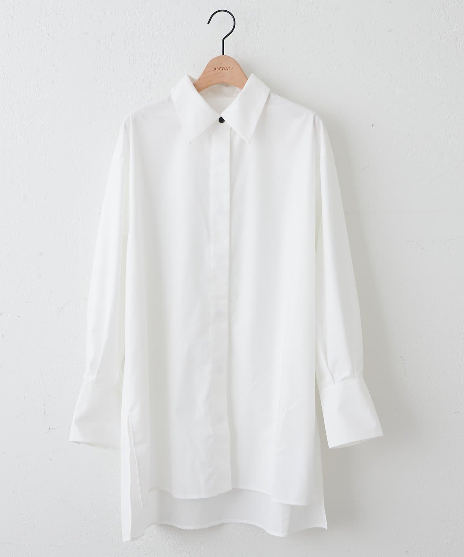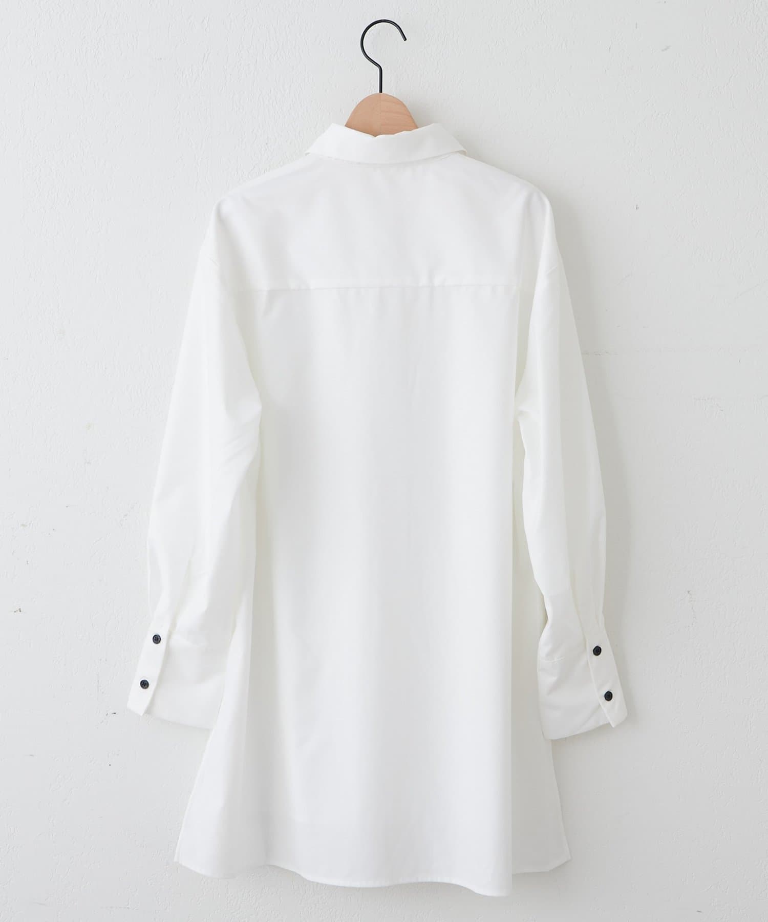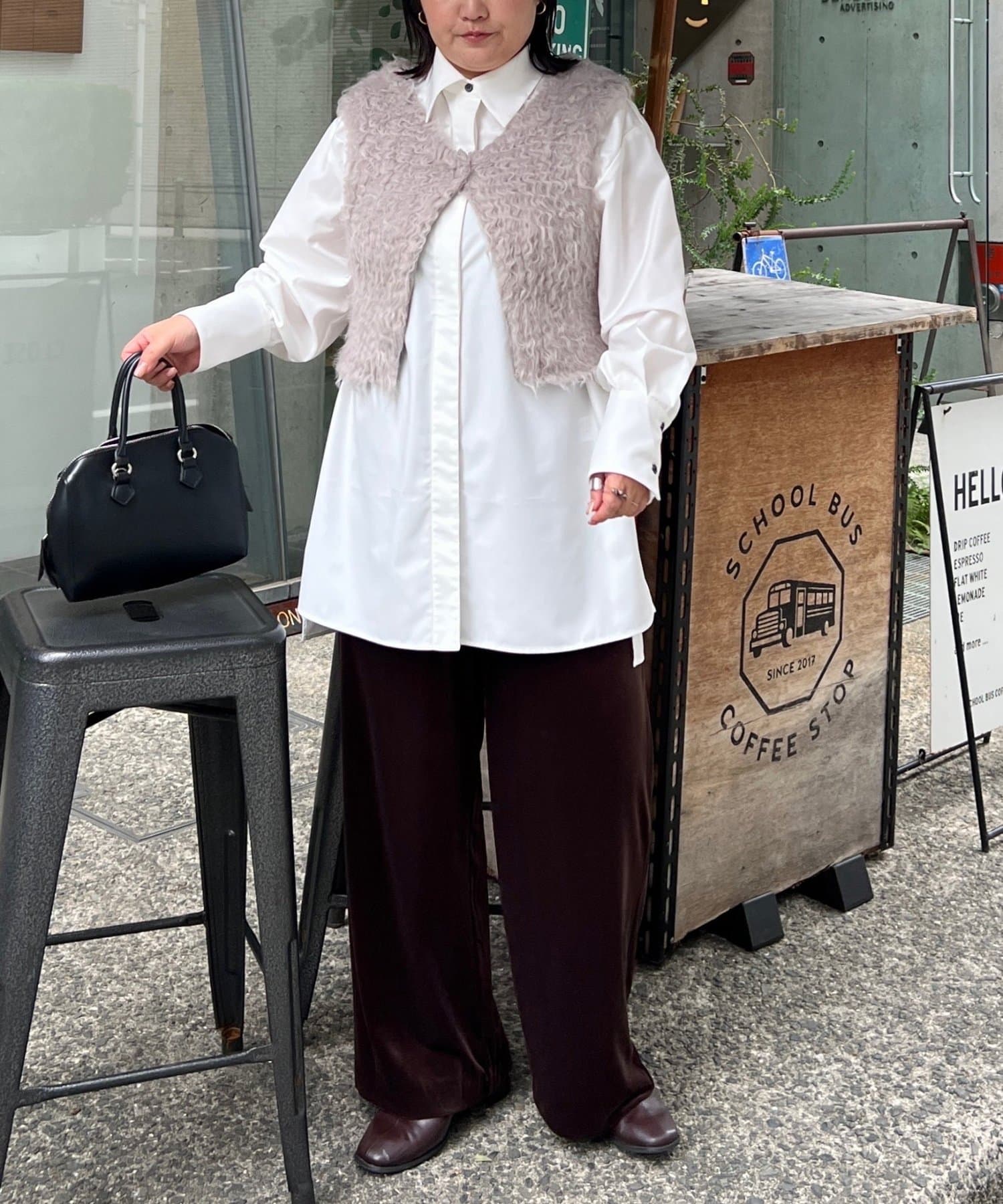 シャツは少し衿元は大きめにトレンド感も無理なく取り入れ、黒ボタンがアクセントに。比翼ボタンにすることで、どんなコーデにも使いやすい、スッキリ見えにこだわりました。