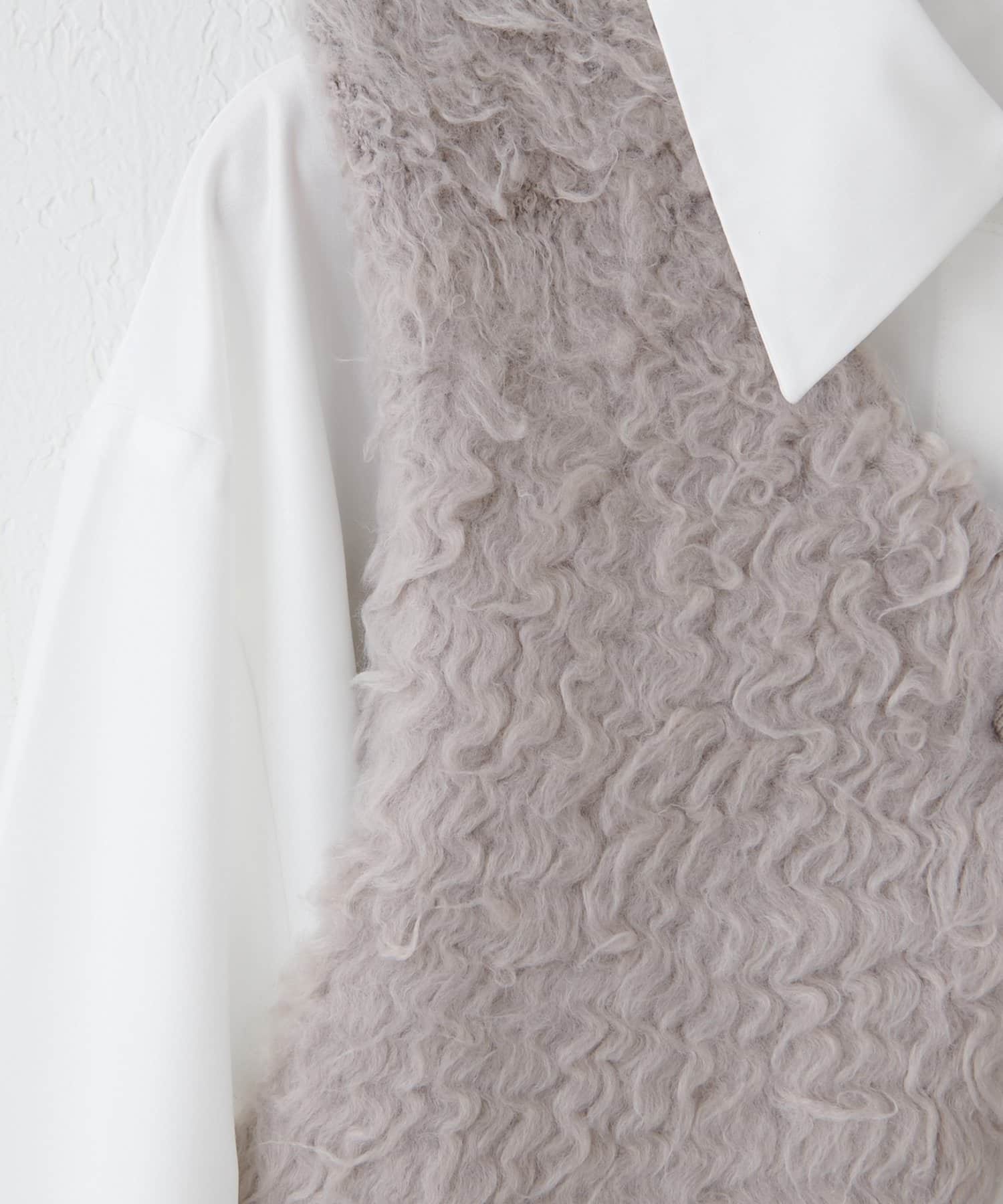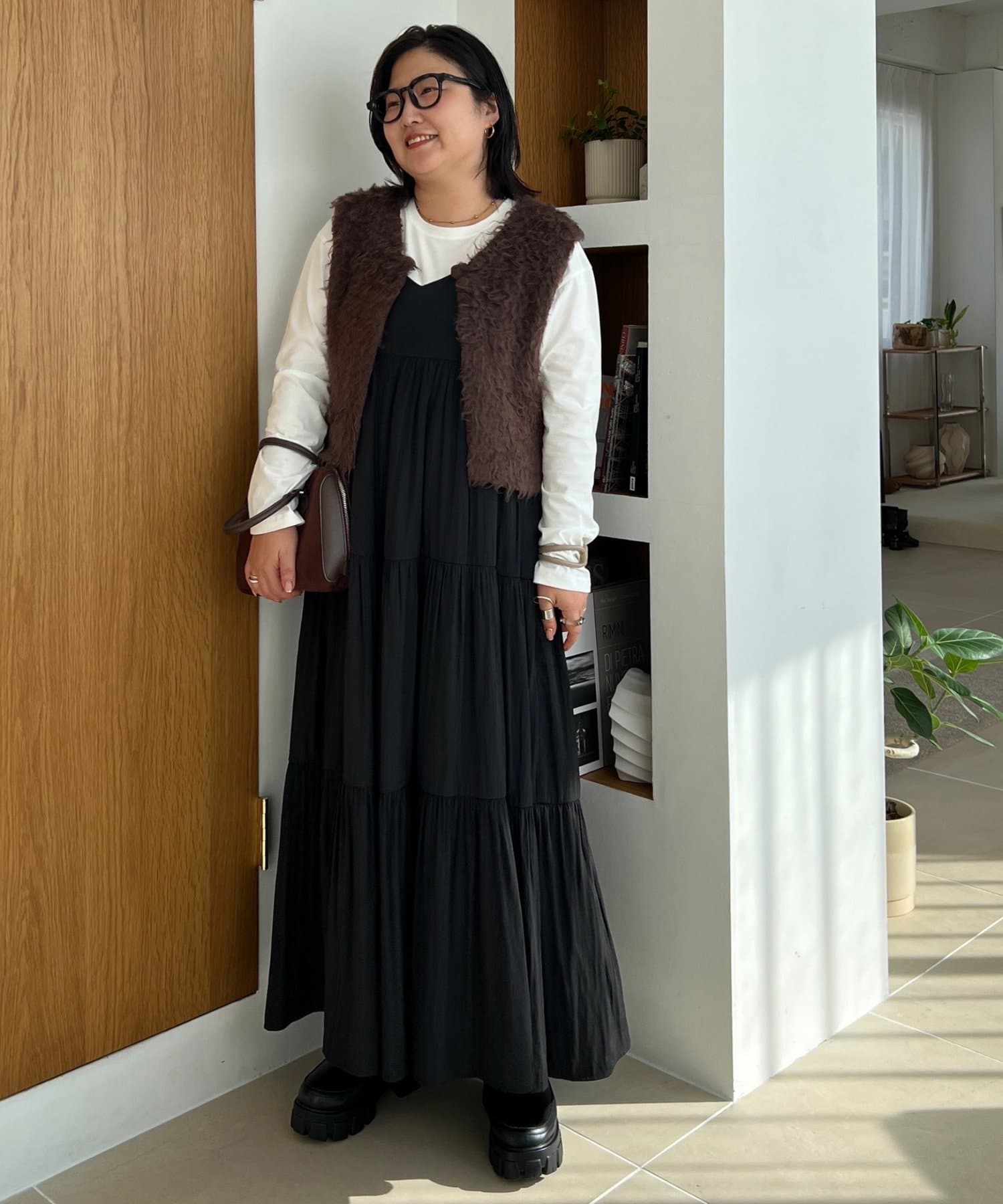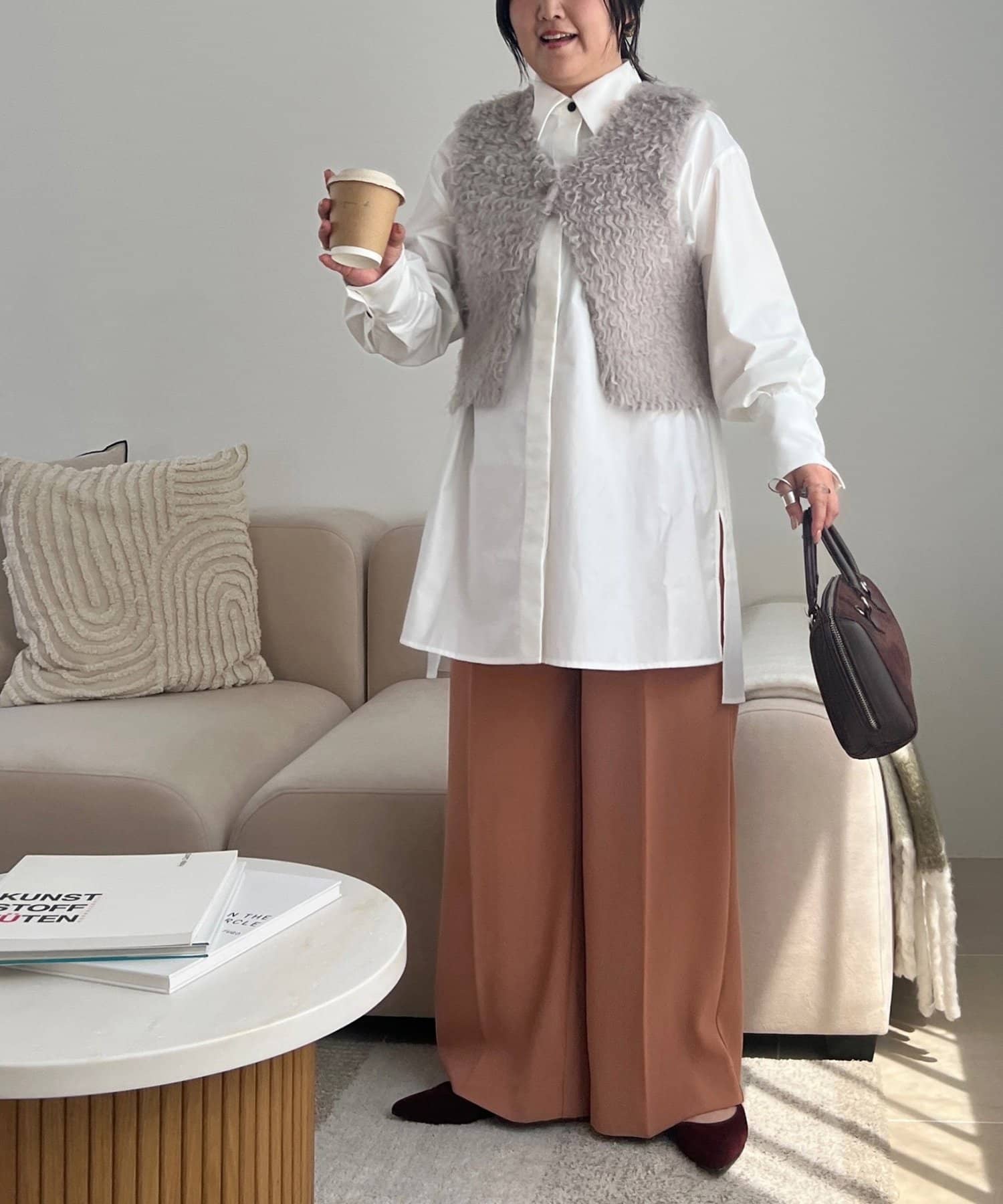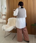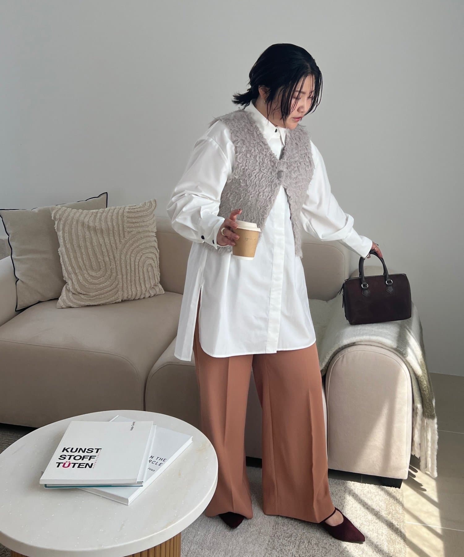 ベストは、深めの首元で詰まりをなくし、ボタン1つで留め、裾は開くデザインに。こうすることで抜け感が自然に出来るので、着るだけでスタイルアップします。