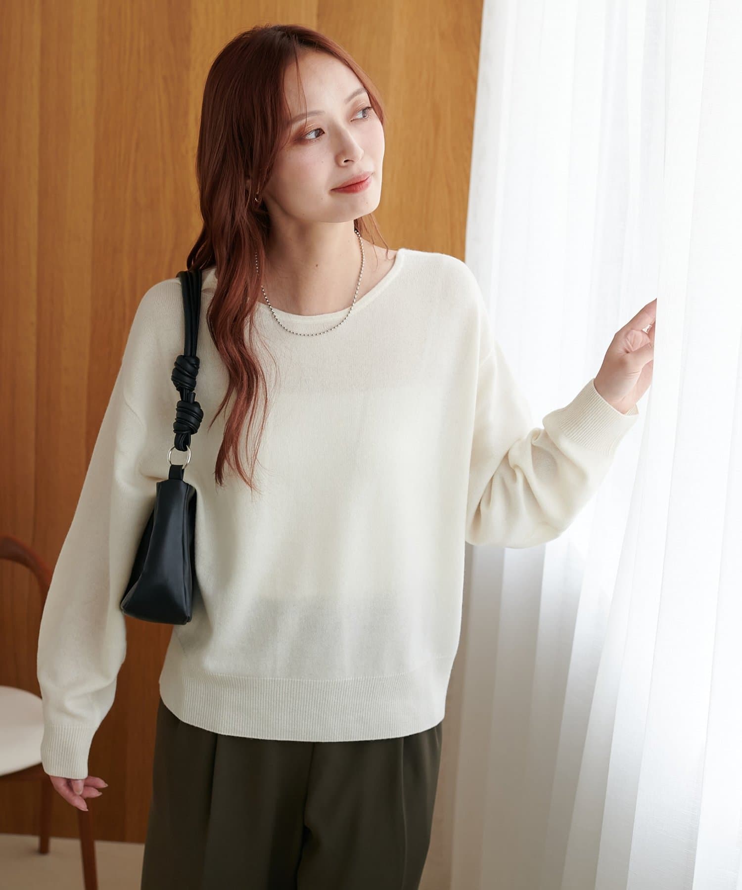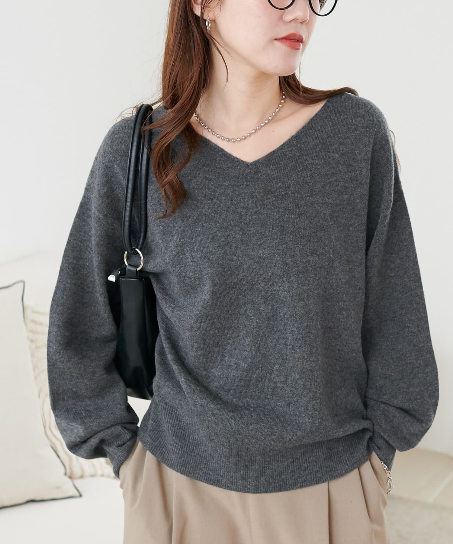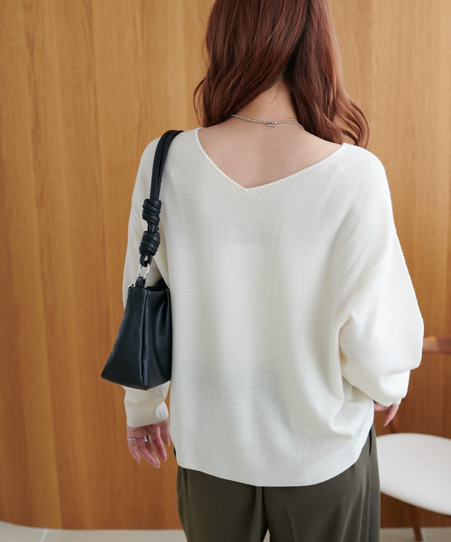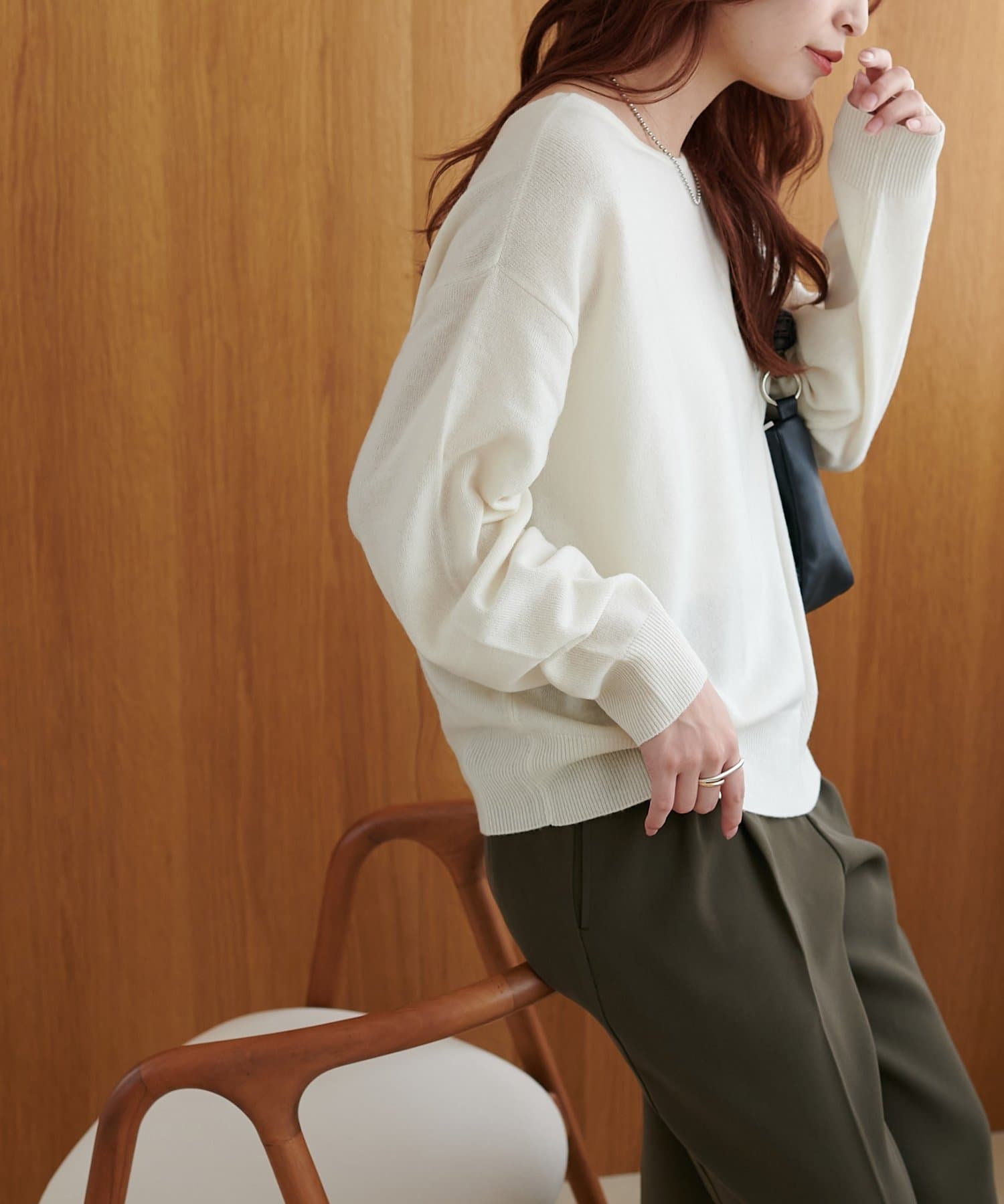 クルーネックを前にすればシンプルで上品な雰囲気、Vネックを前にすれば抜け感のあるフェミニンな印象へとチェンジできます。