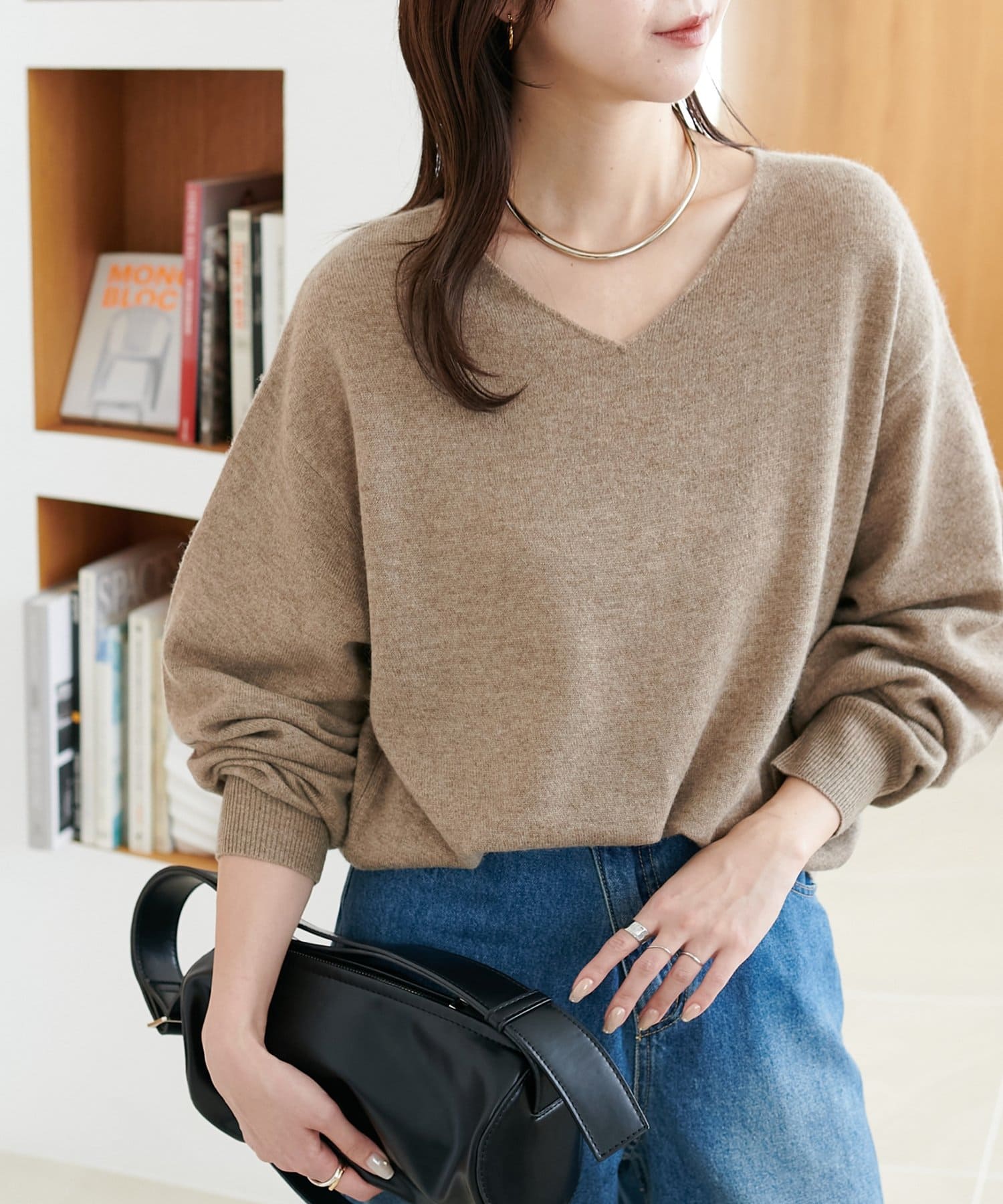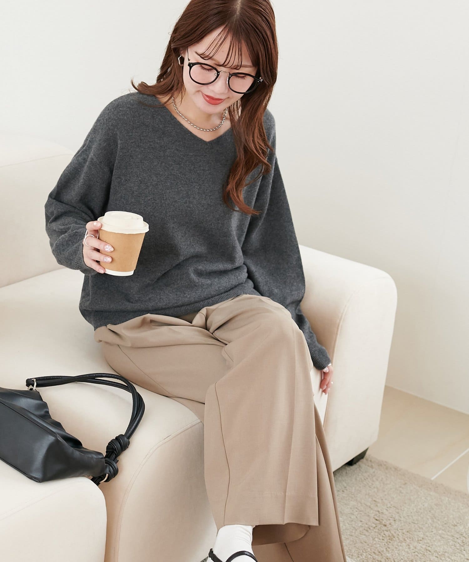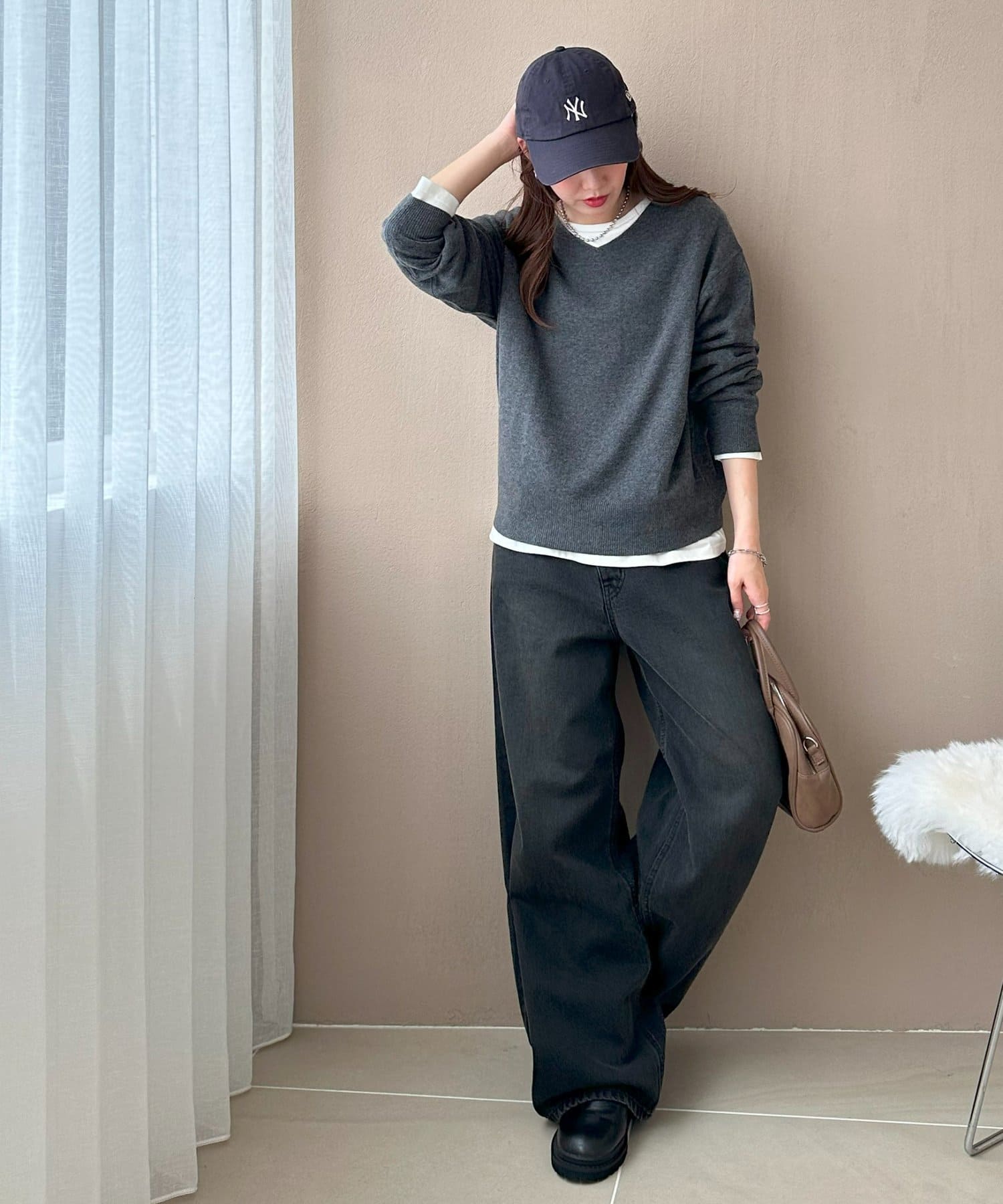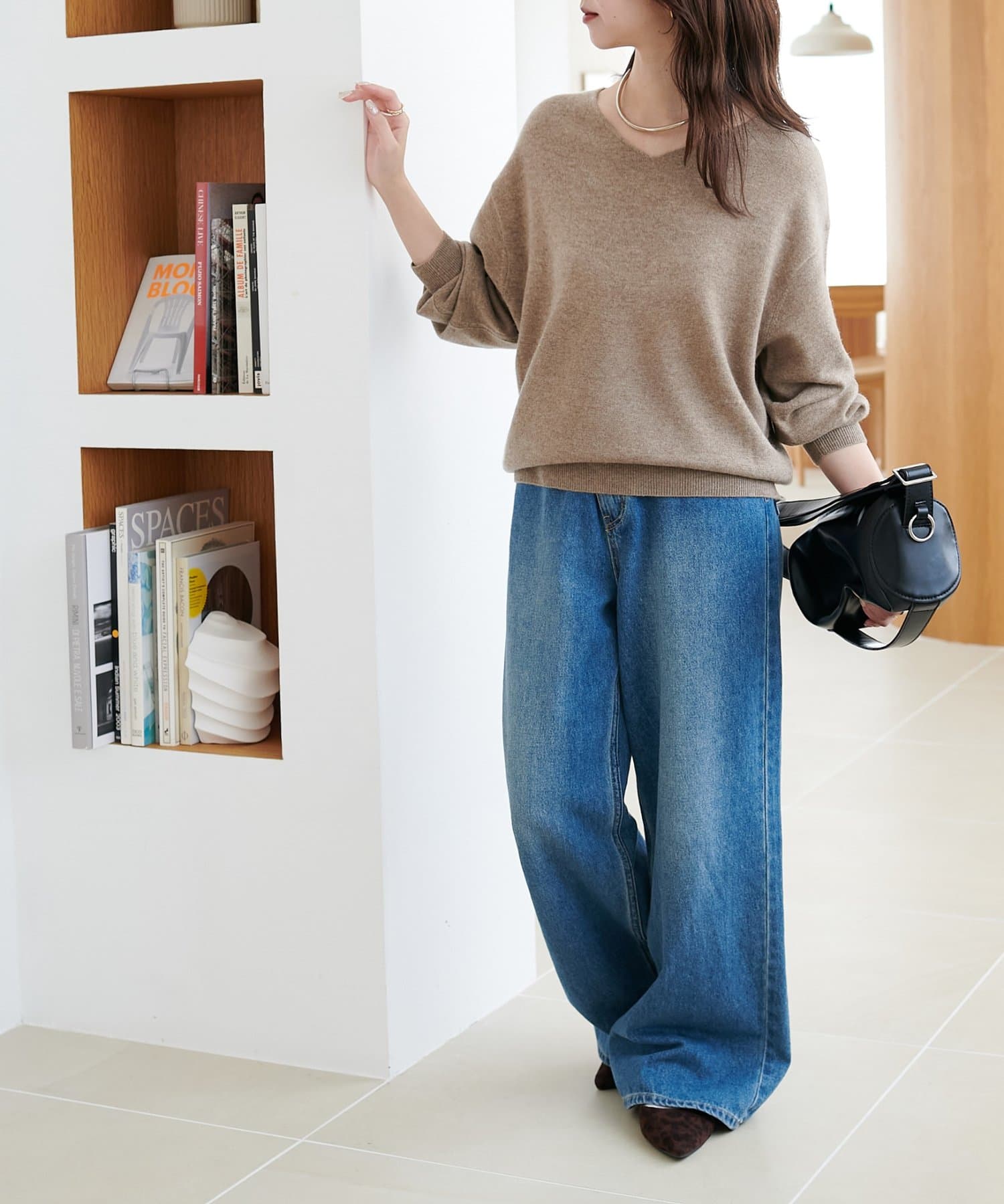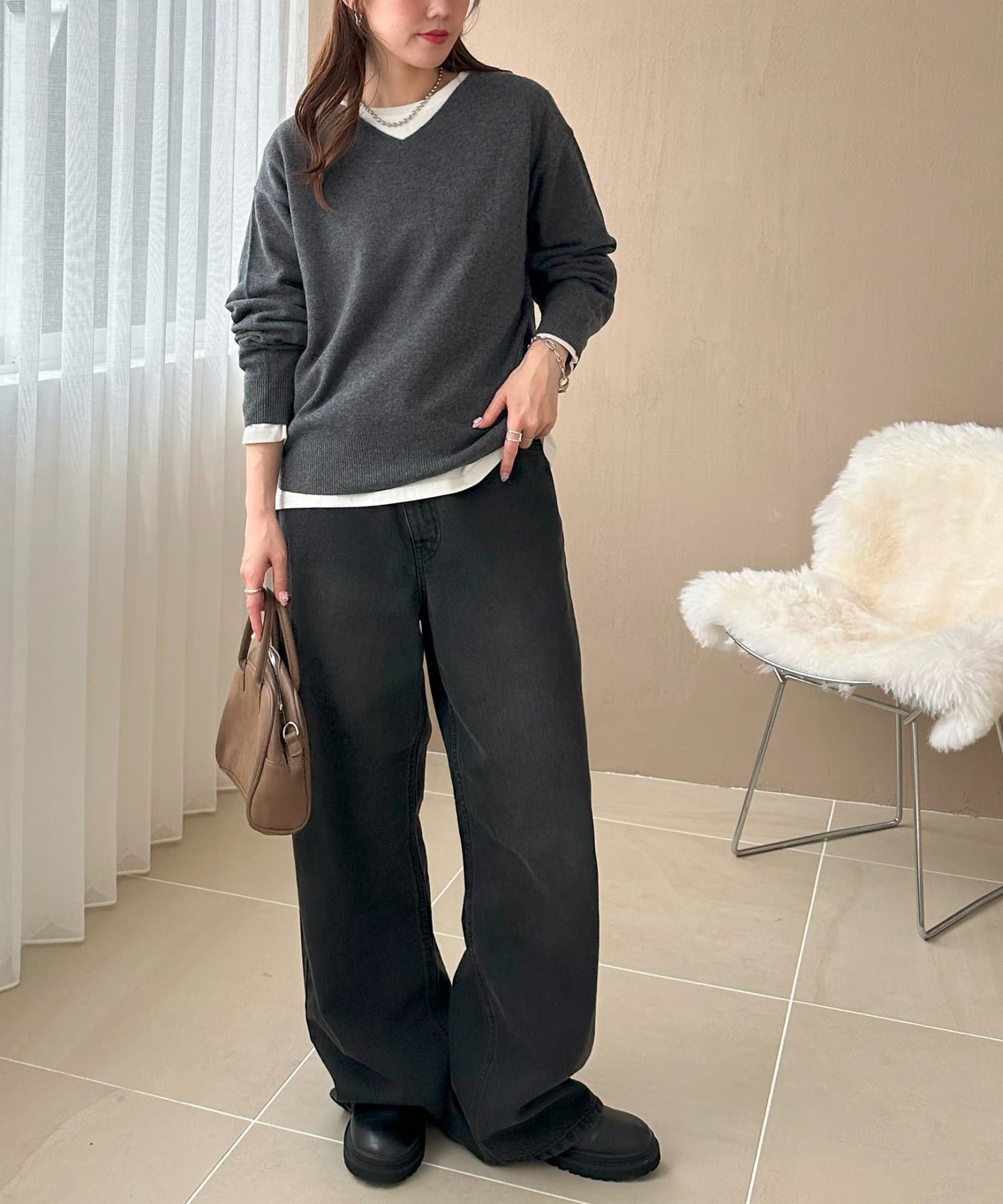 Vネックを前に:デニムやワイドパンツと合わせて、抜け感のあるリラックススタイルに。
