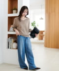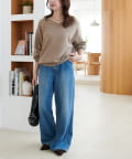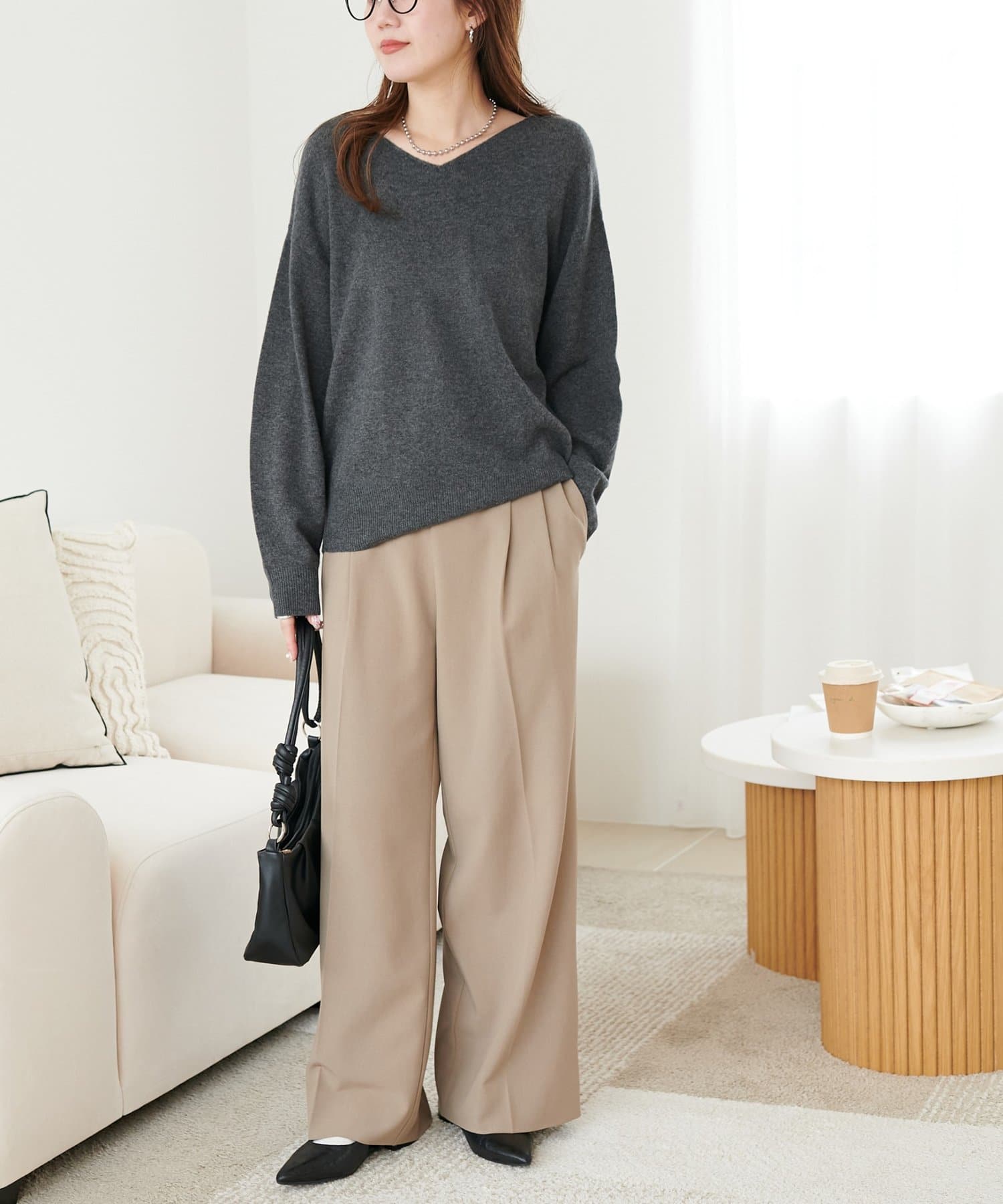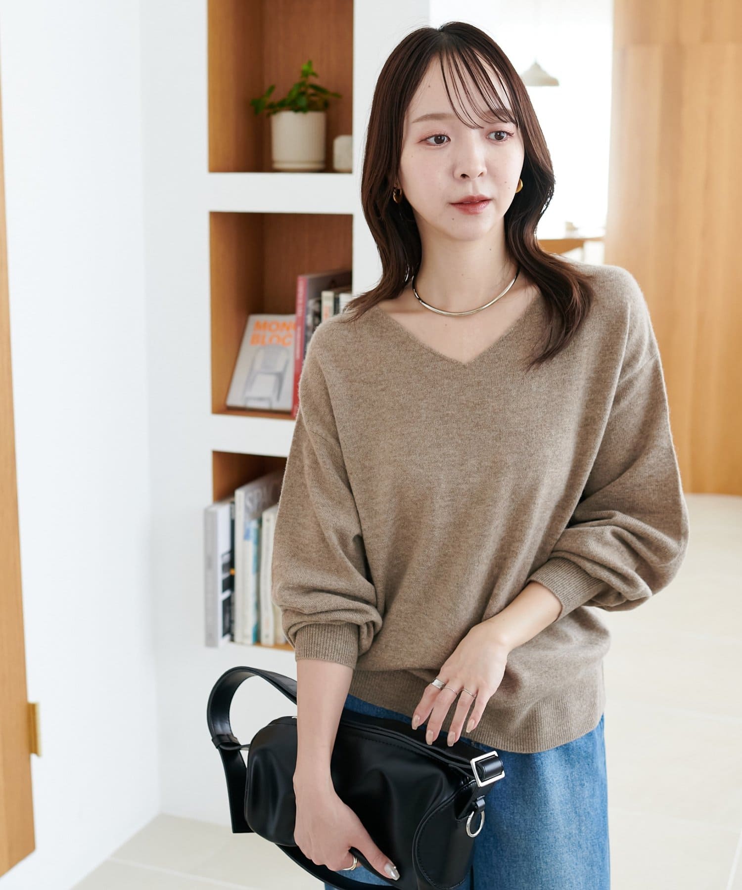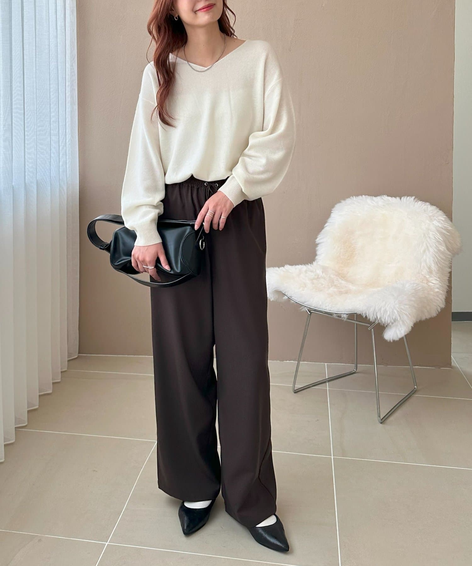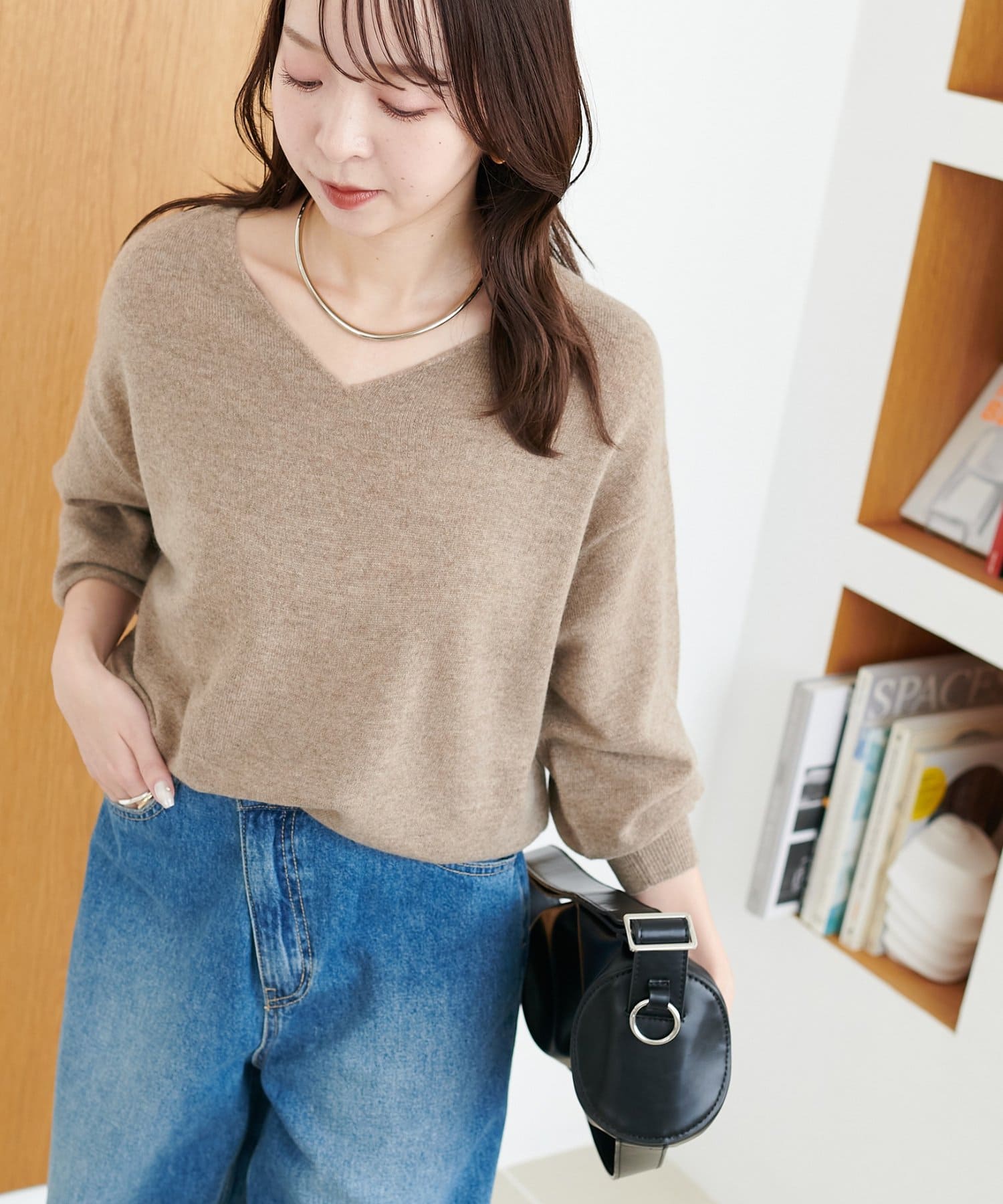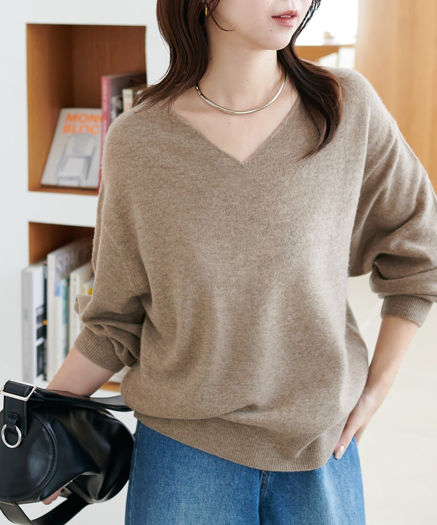 Vネックを前に:デニムやワイドパンツと合わせて、抜け感のあるリラックススタイルに。