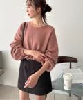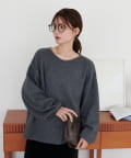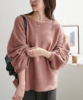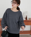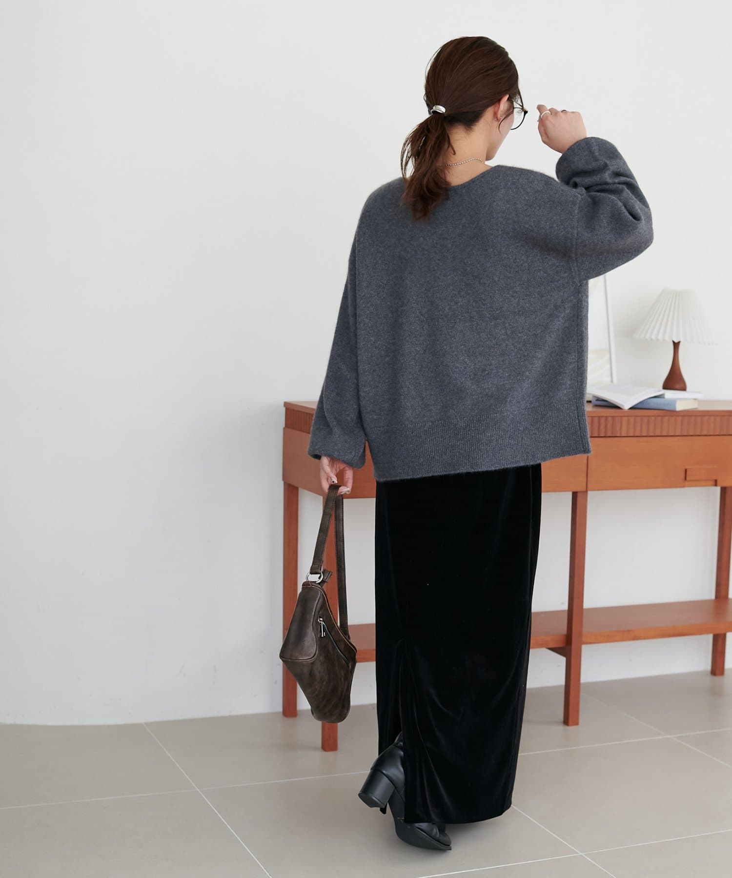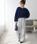 肩の位置を落としたドロップショルダーとワイドな身幅が、こなれ感を引き出しつつ、体のラインを拾わずに自然にカバー。