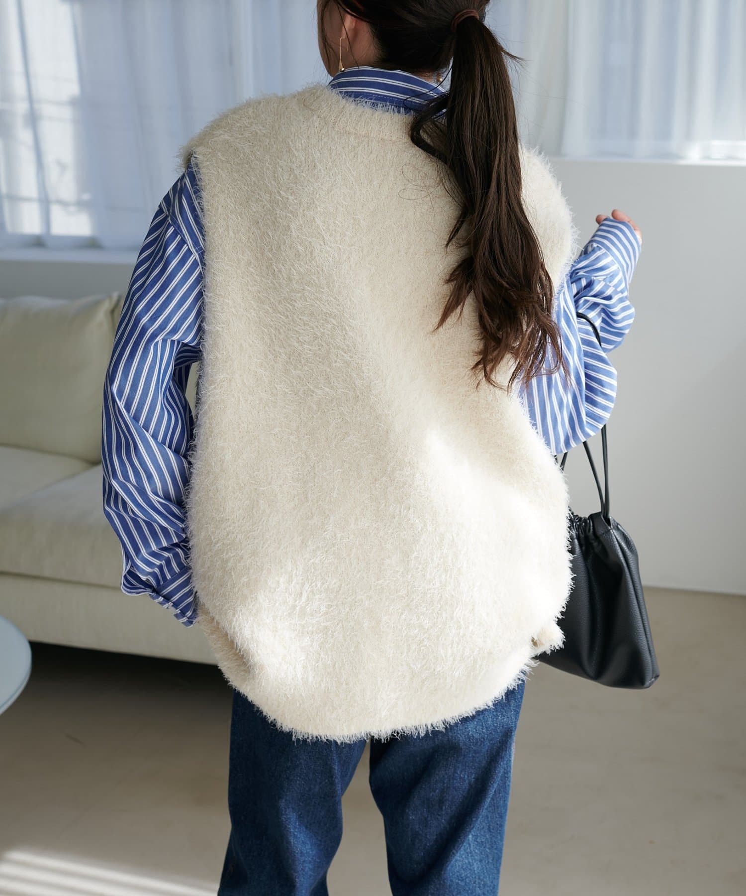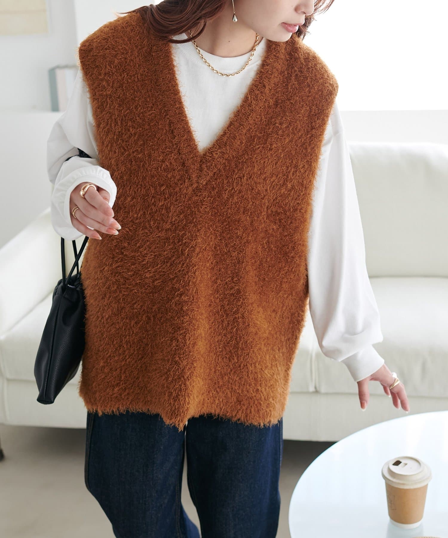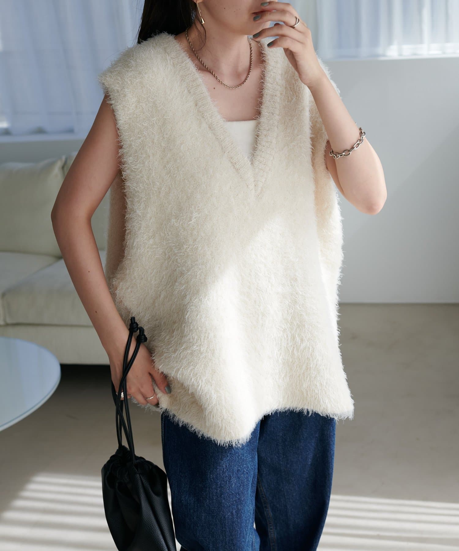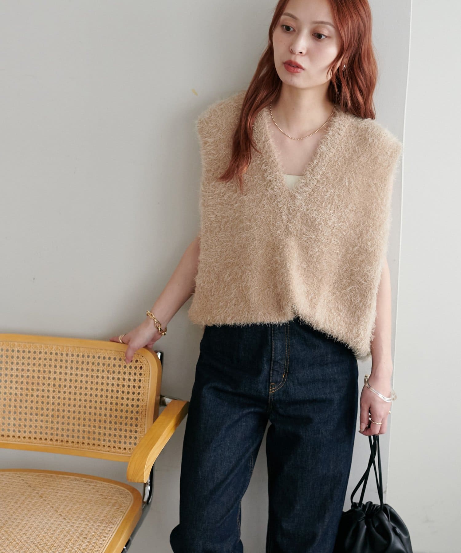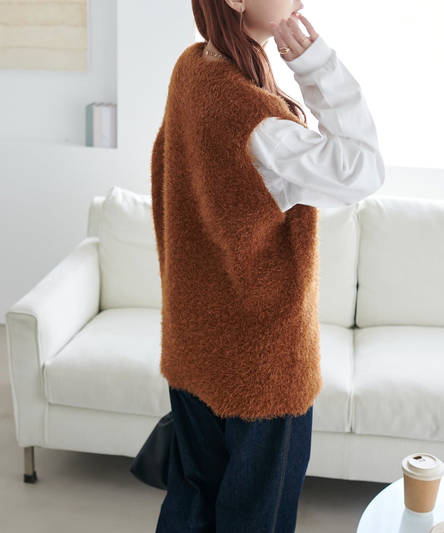 レイヤードコーデに重宝するベストをふわっとしたフェザーの生地で仕立てました。
