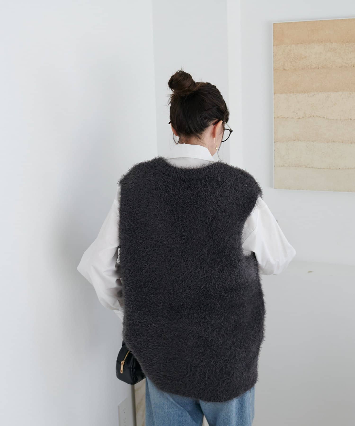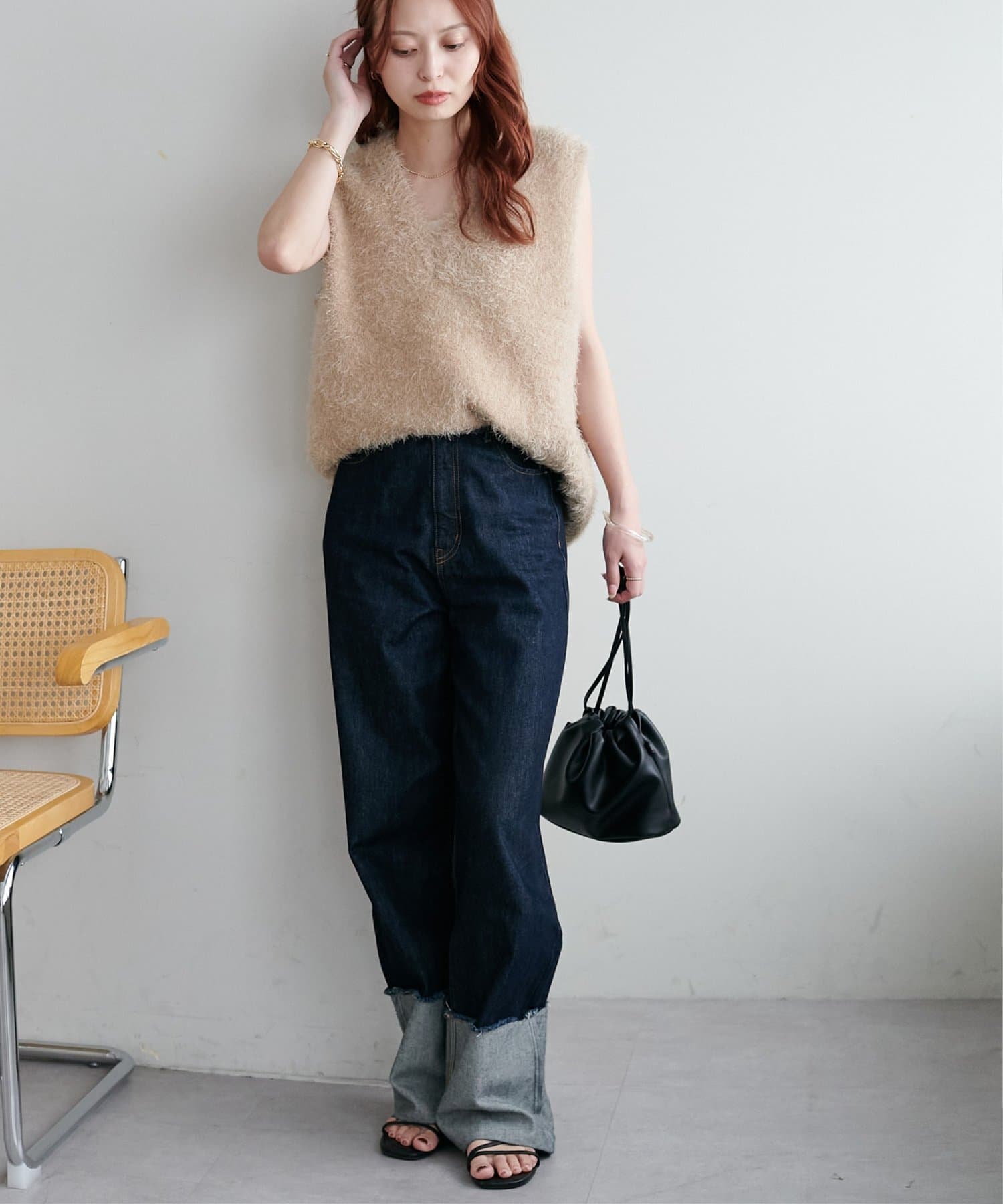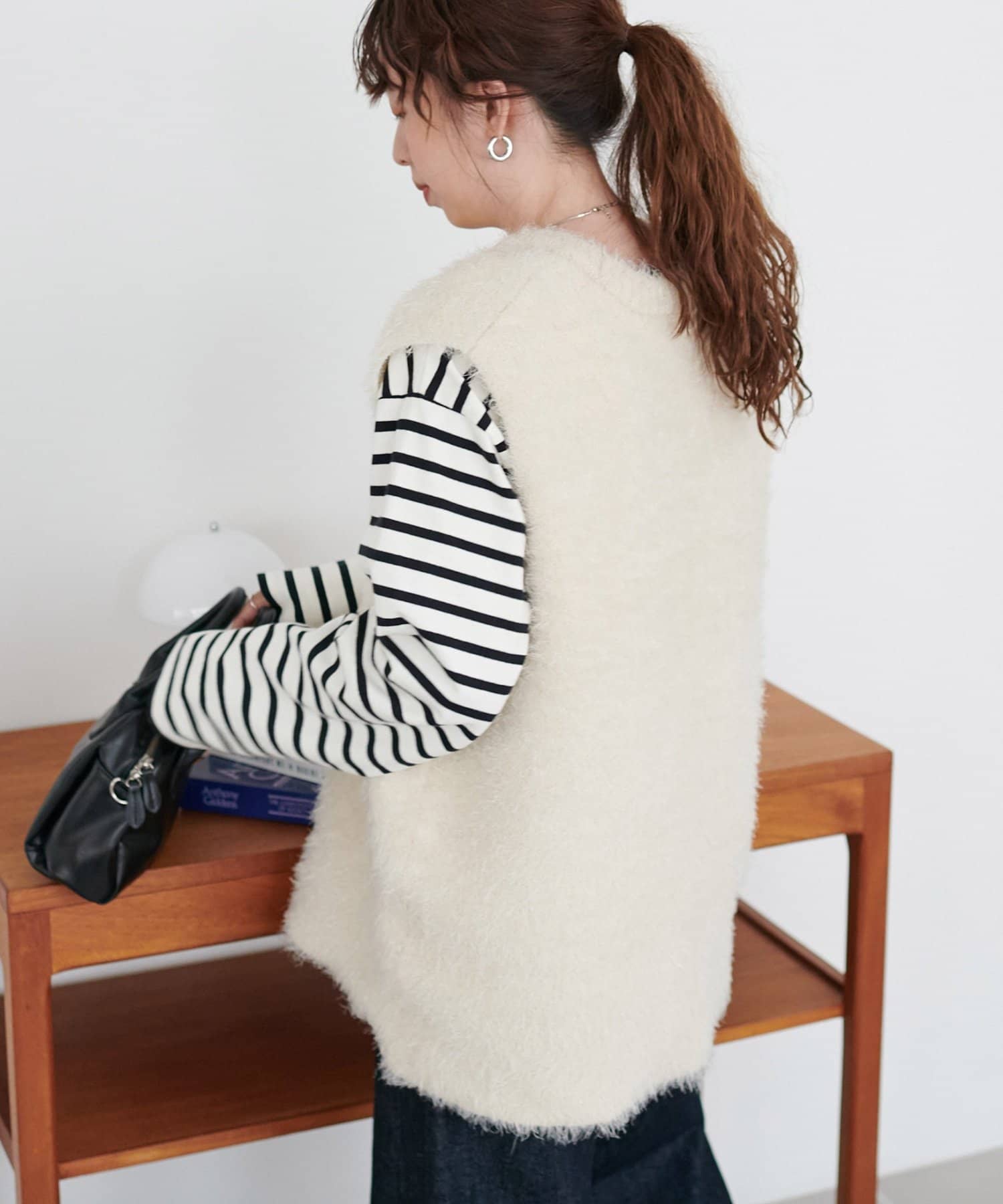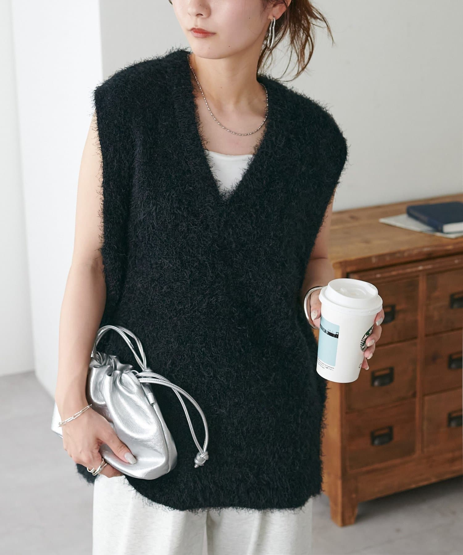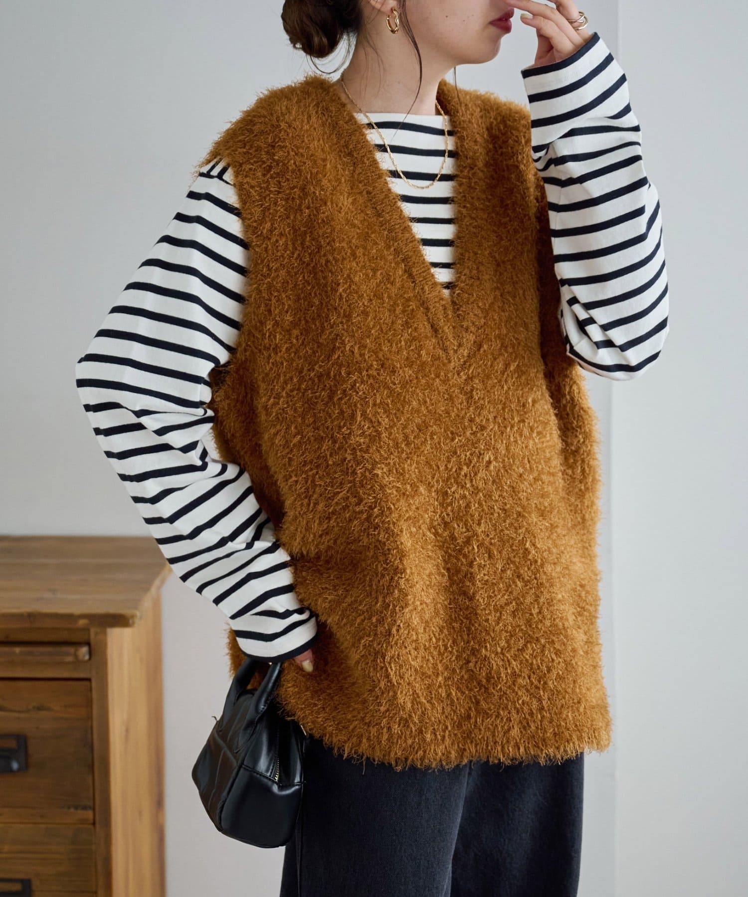 レイヤードコーデに重宝するベストをふわっとしたフェザーの生地で仕立てました。