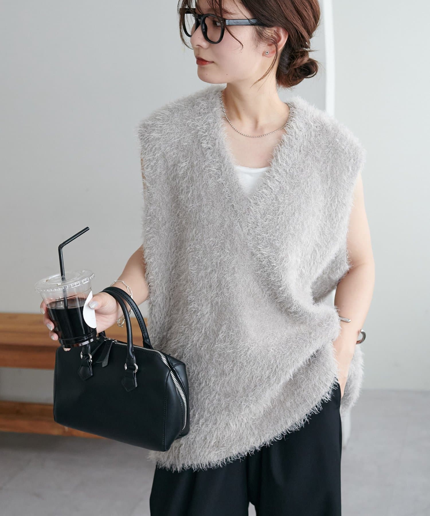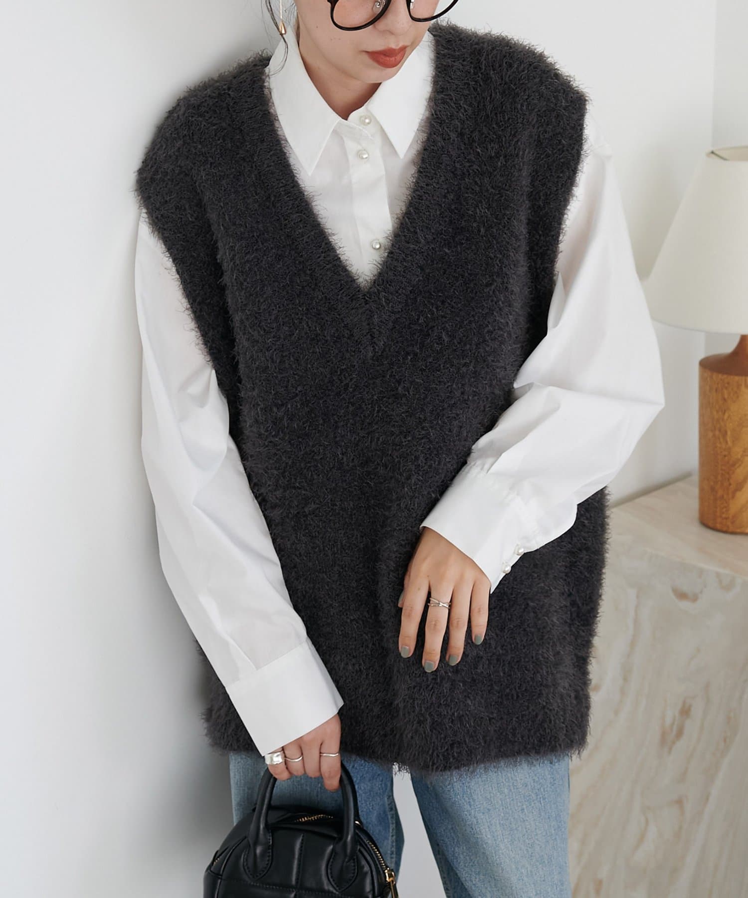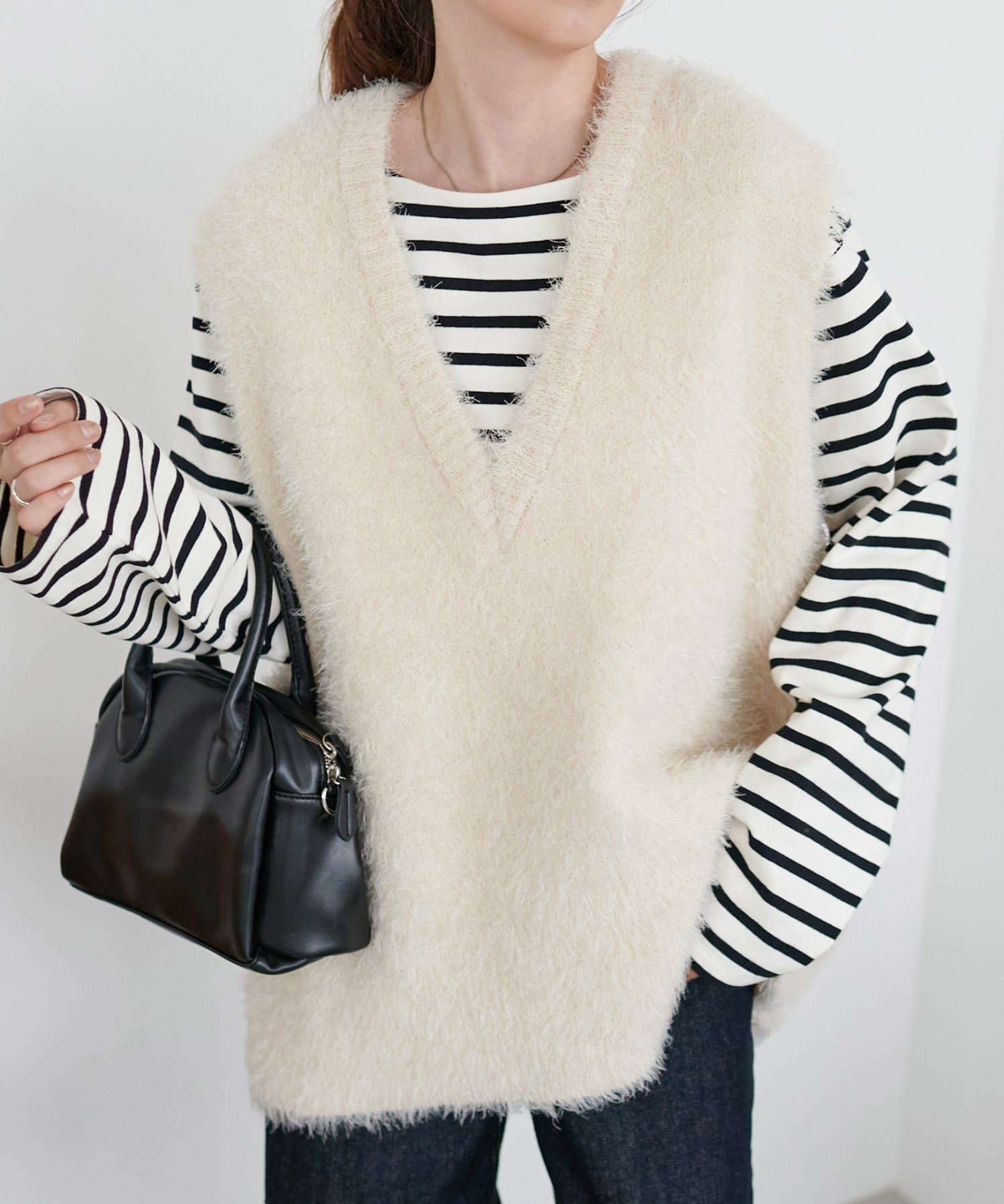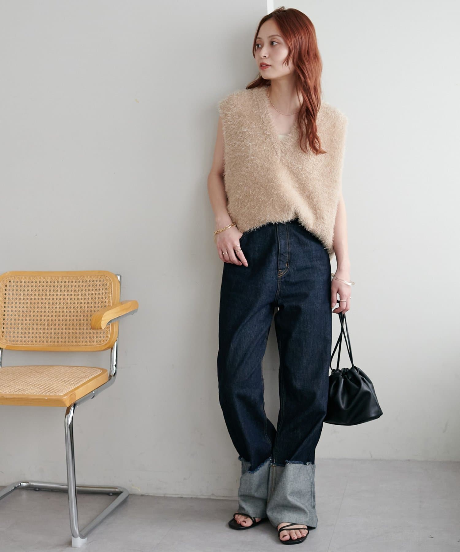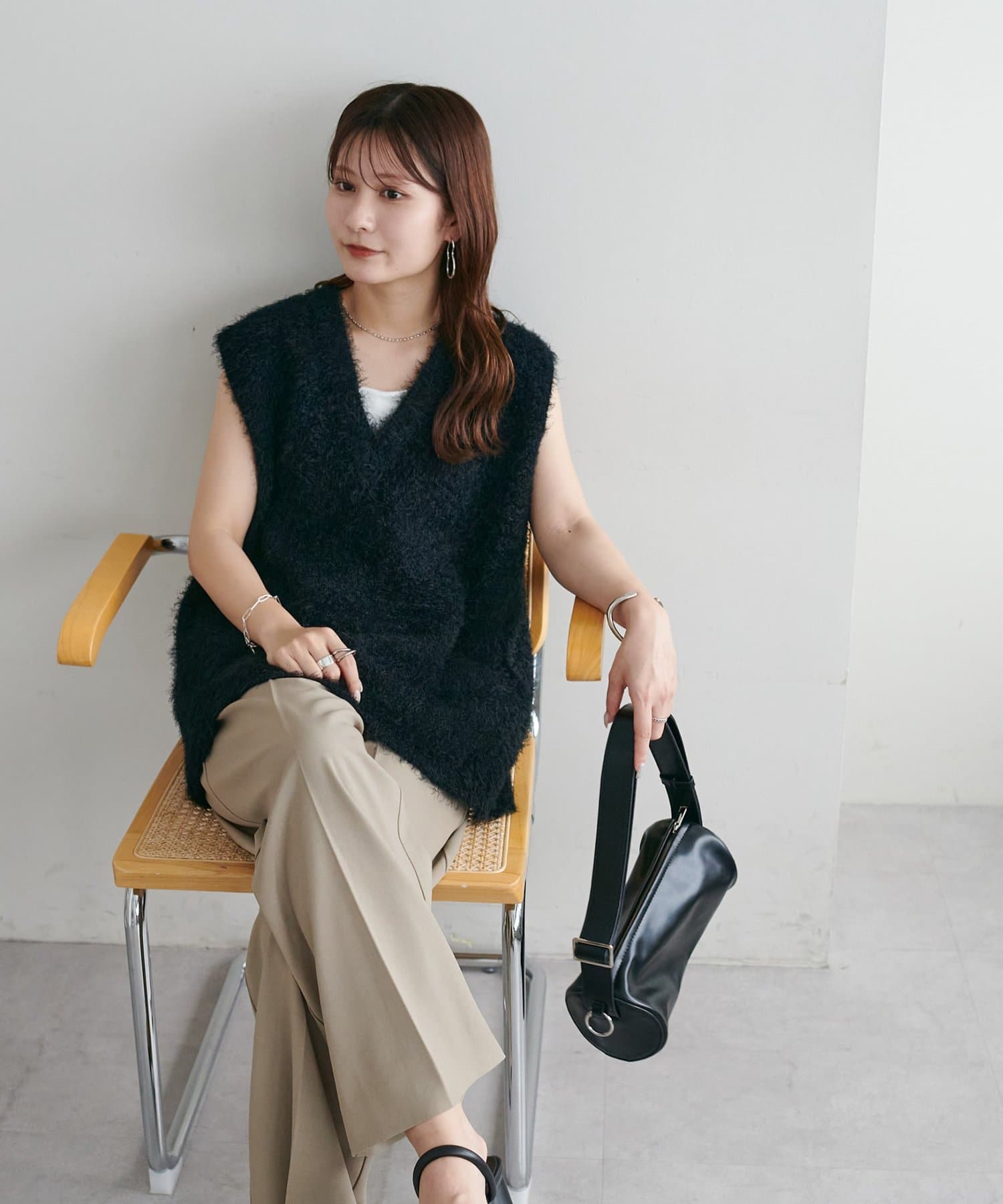 レイヤードコーデに重宝するベストをふわっとしたフェザーの生地で仕立てました。