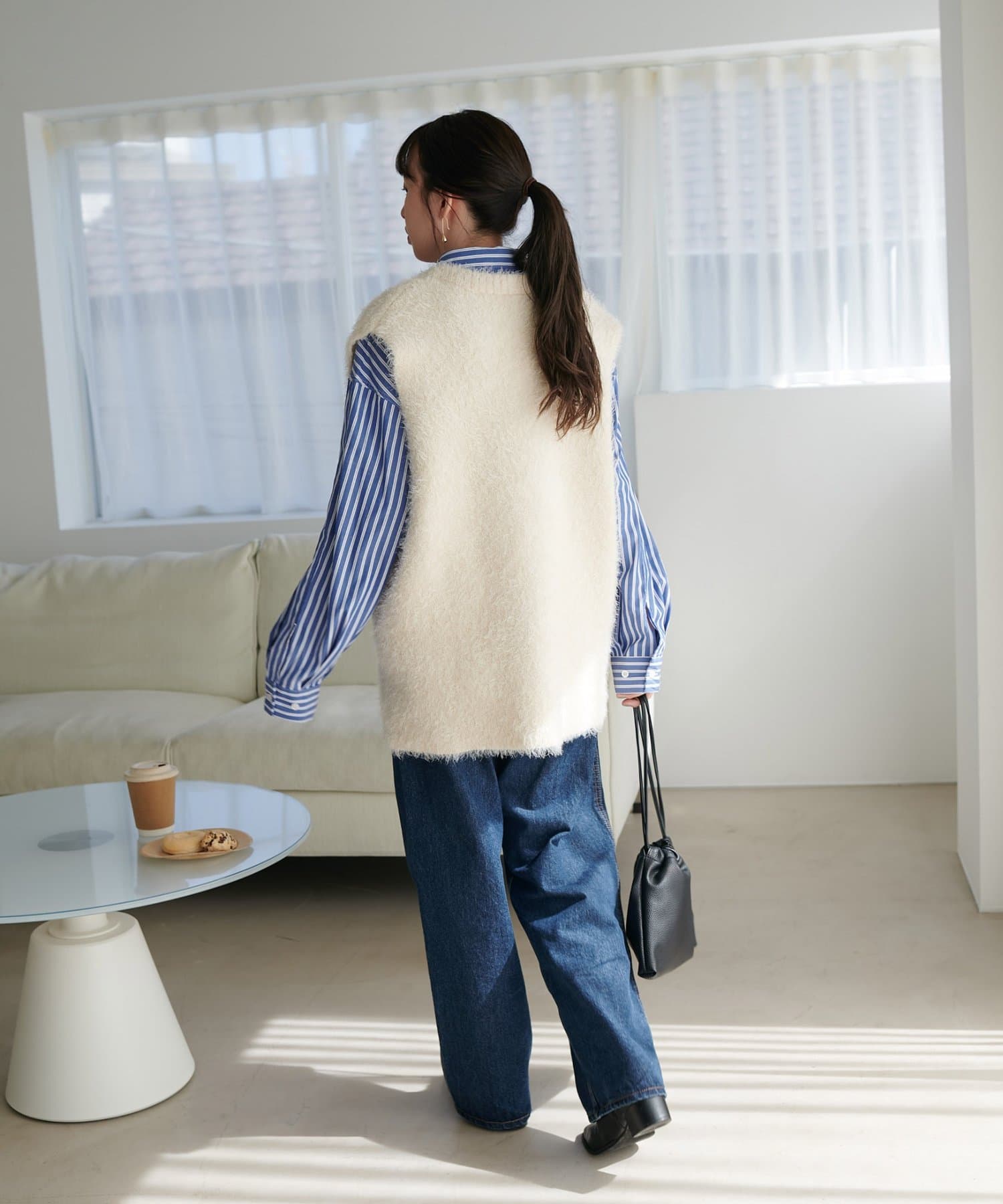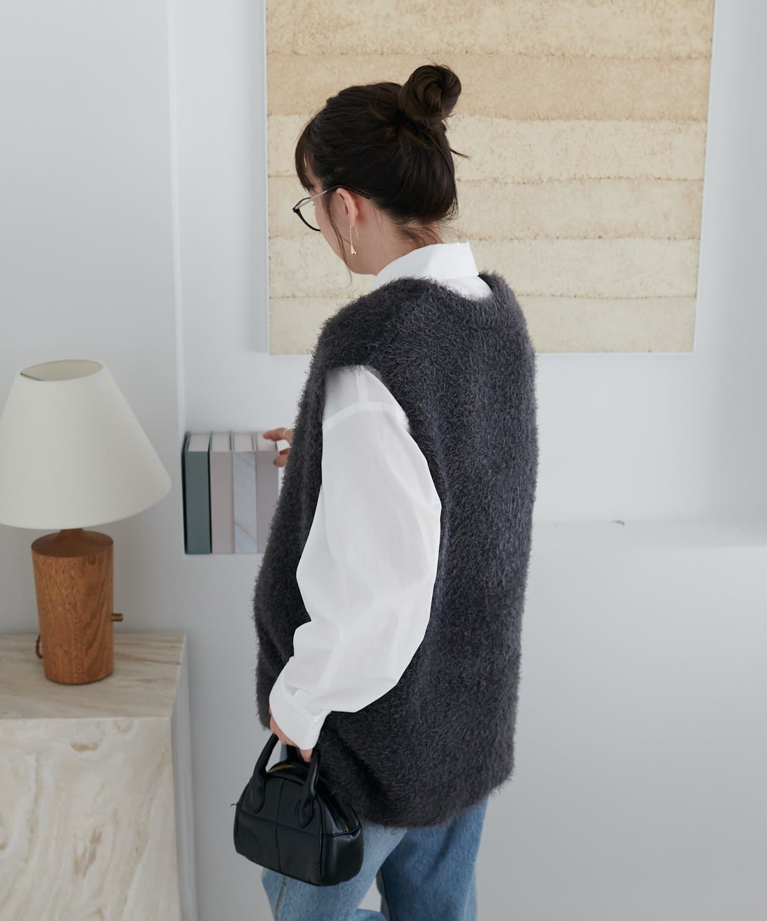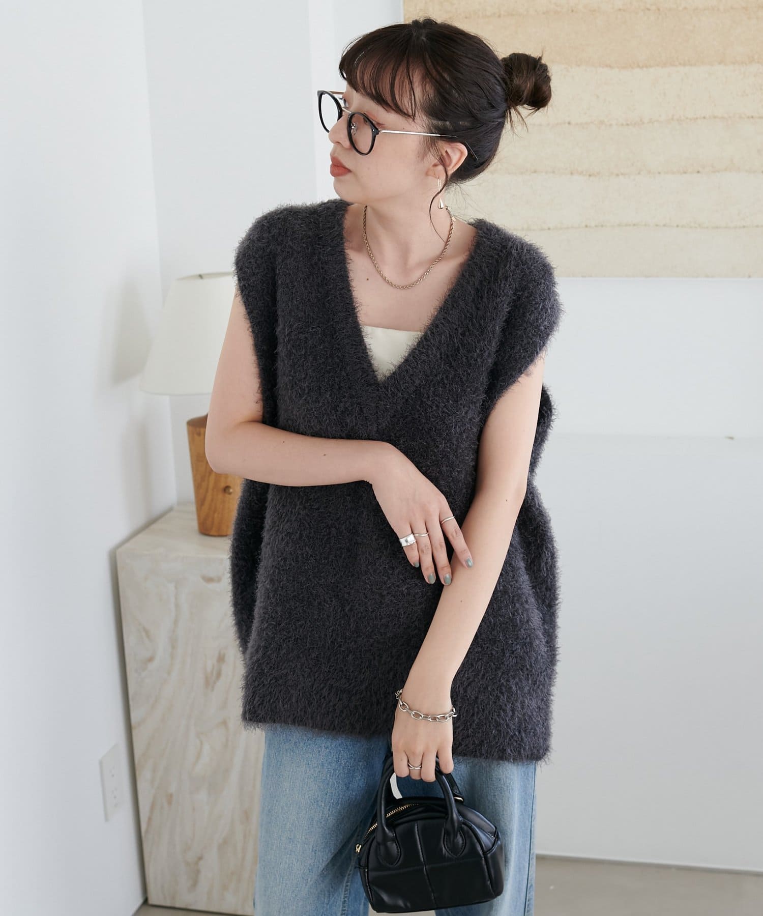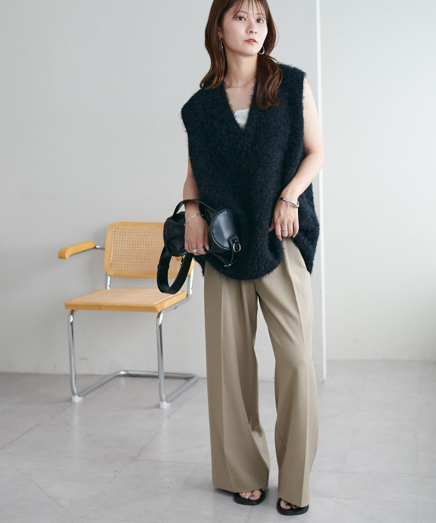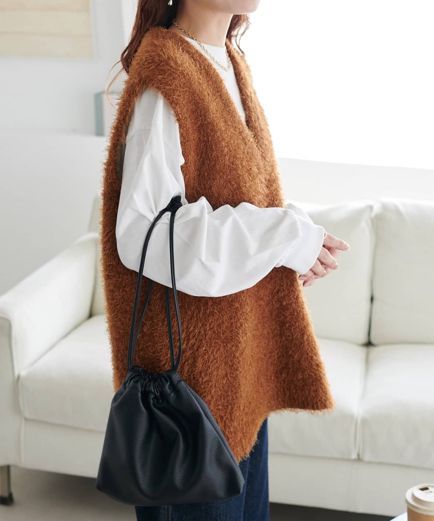 レイヤードコーデに重宝するベストをふわっとしたフェザーの生地で仕立てました。