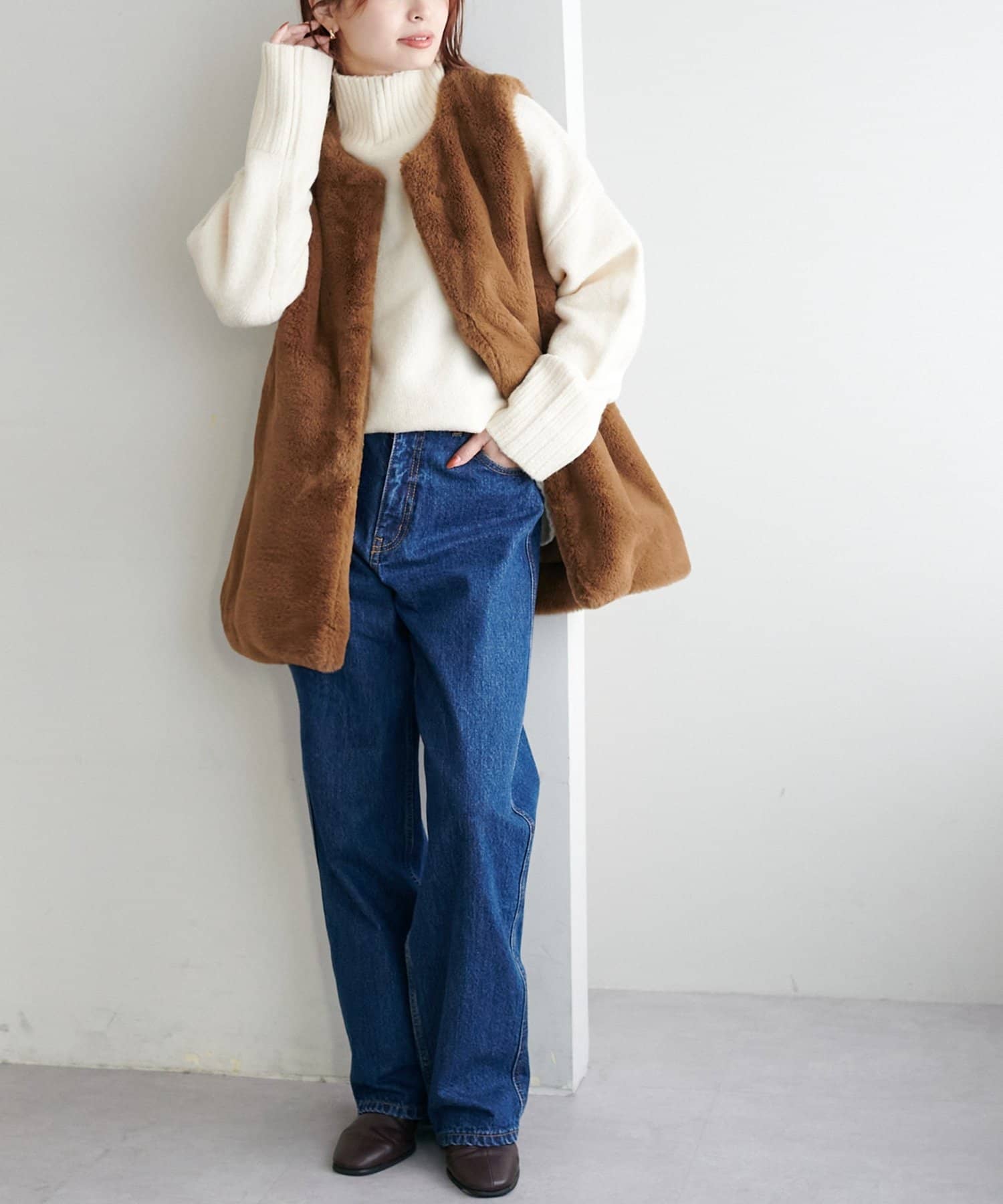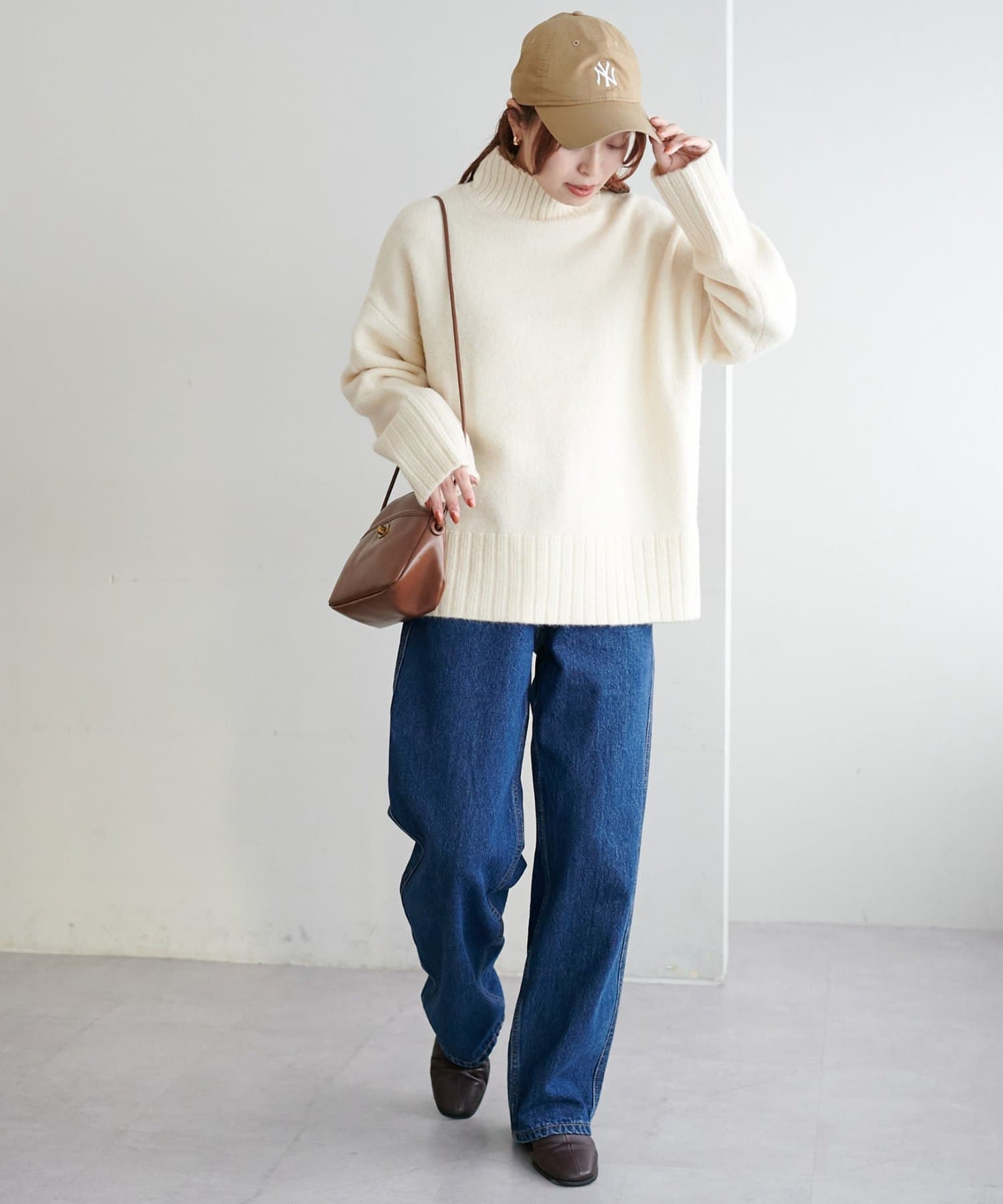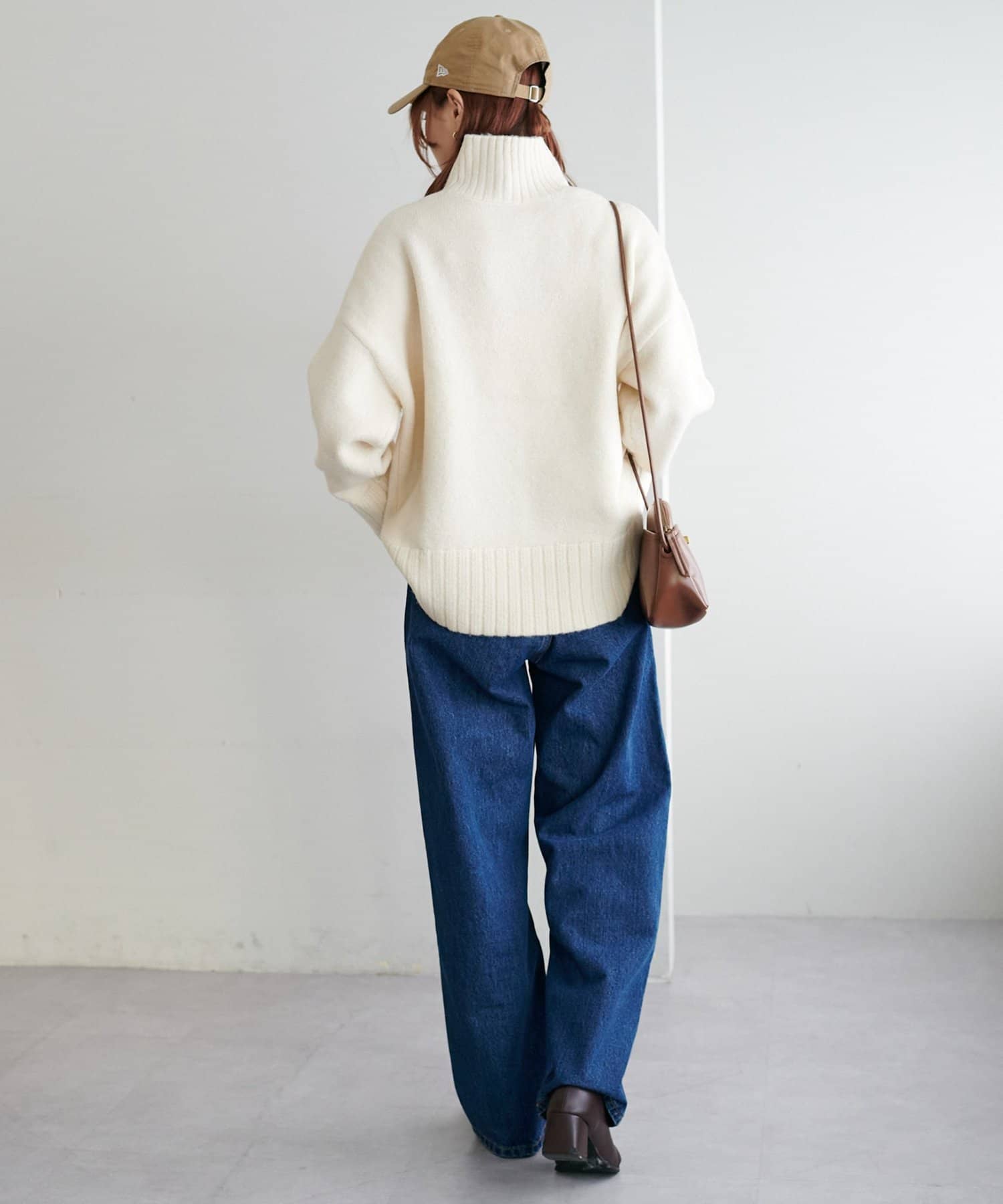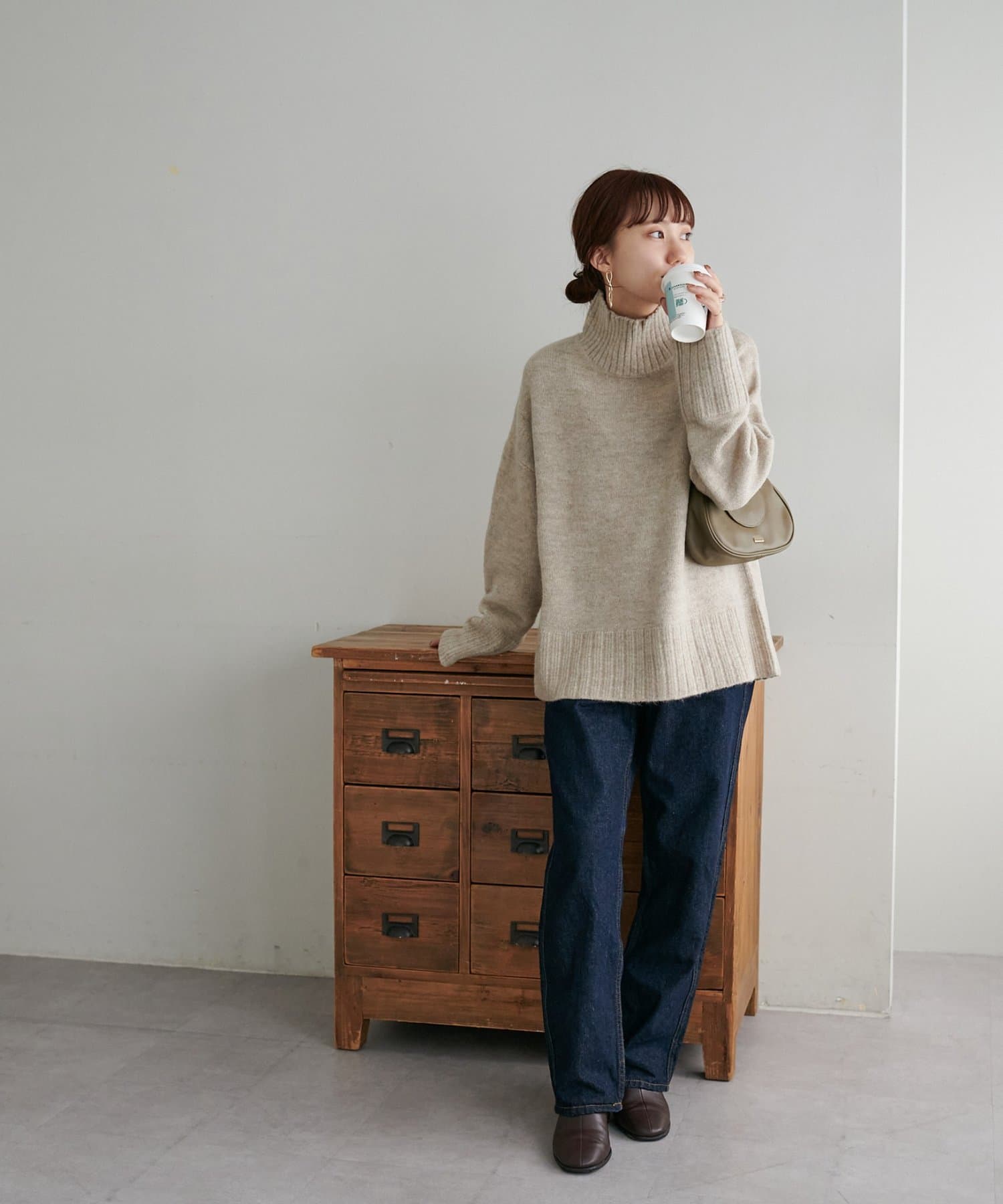 ややゆったりとしたシルエットのタートルニットは、抜け感のある大人カジュアルスタイルにぴったり◎