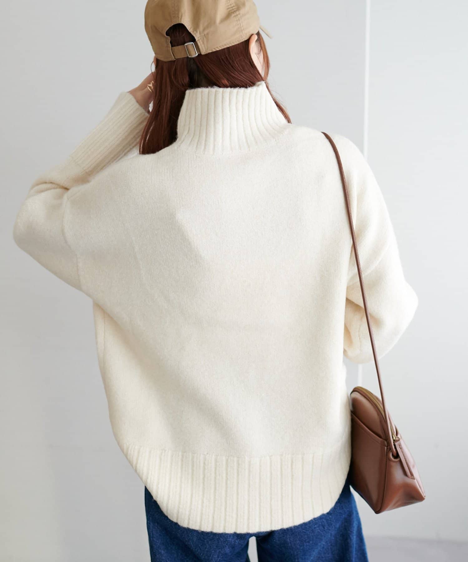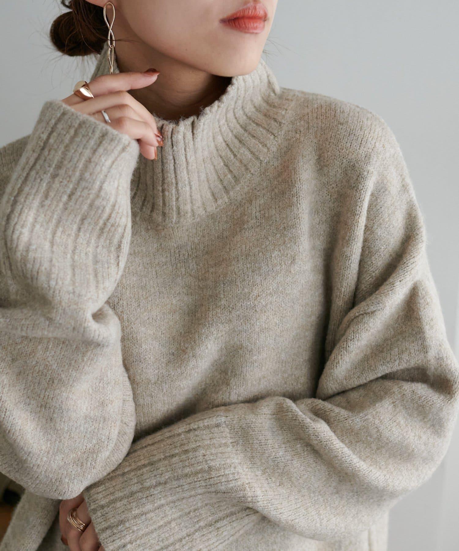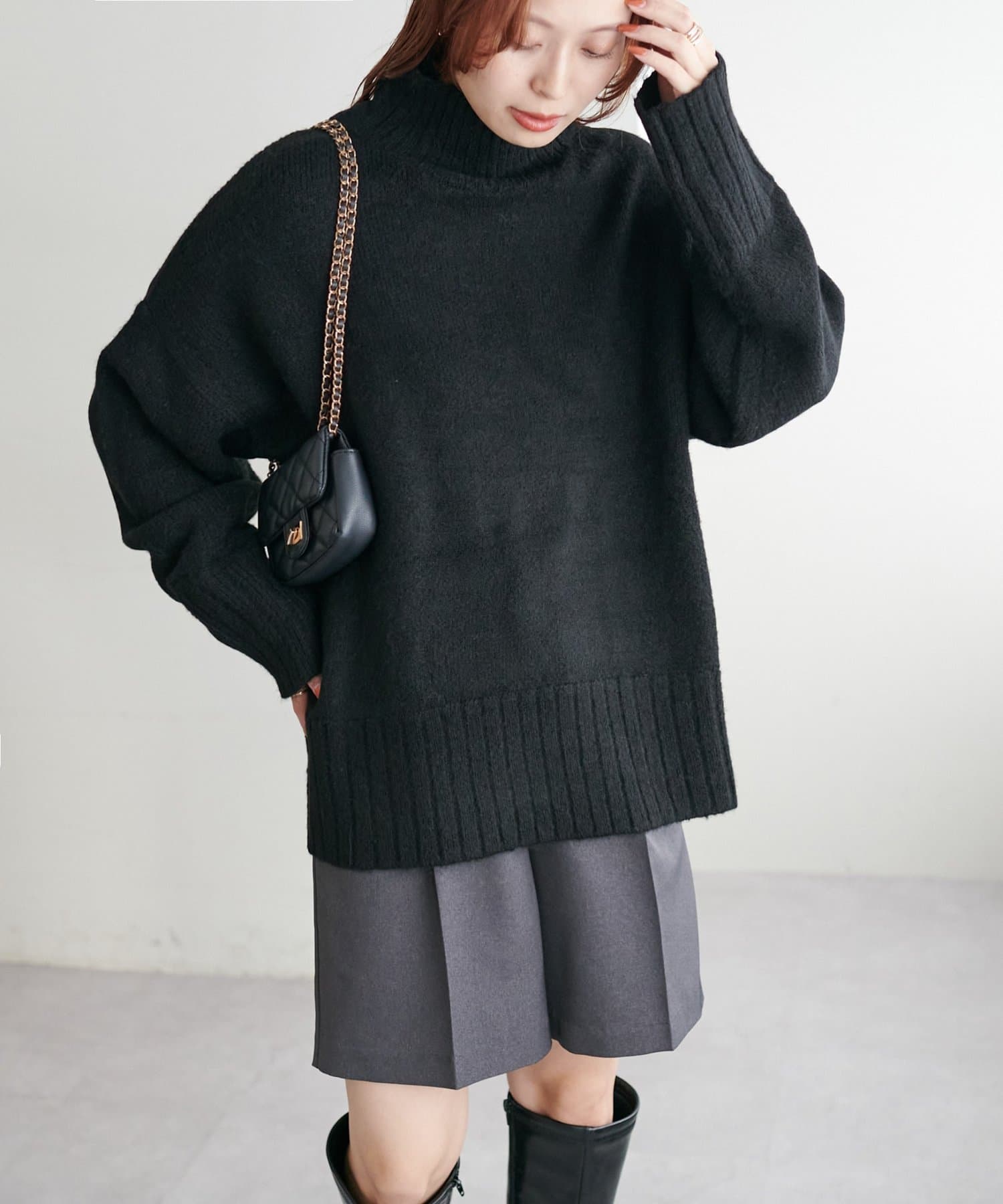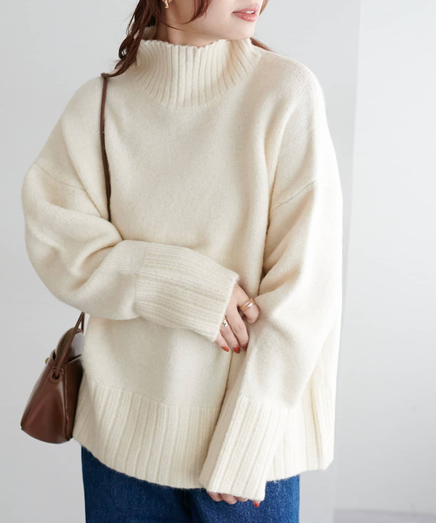 ゆったりとしたシルエットで華奢見えするハイネックニット。