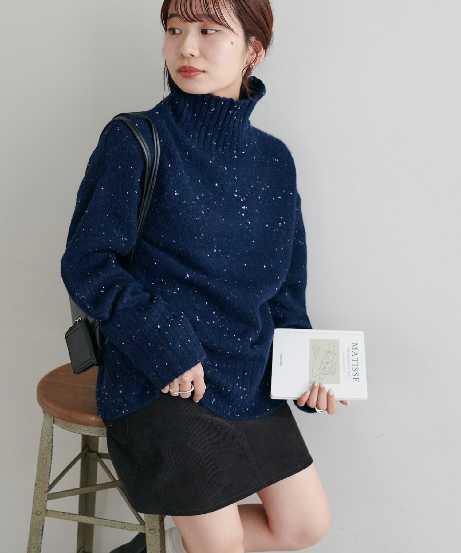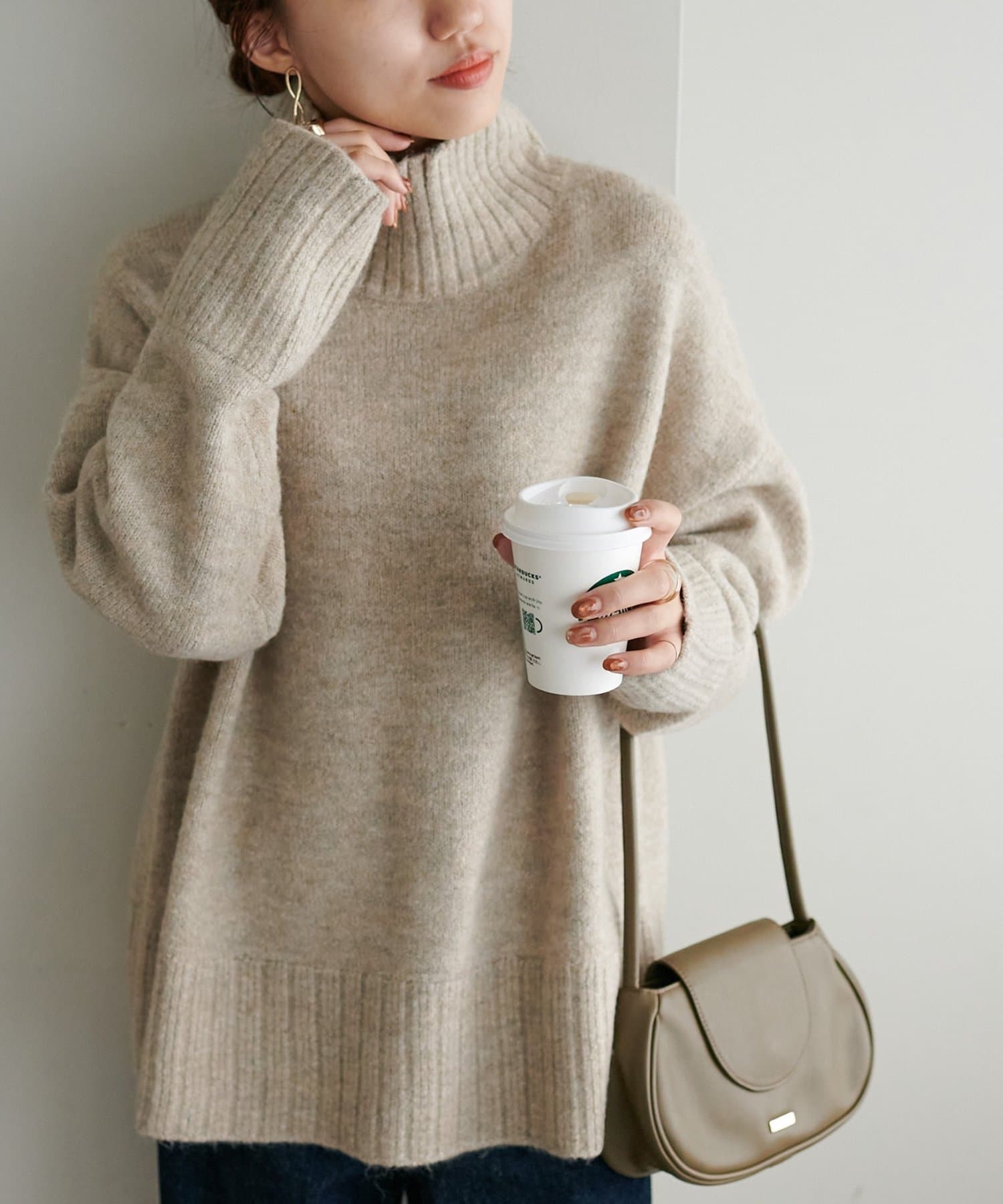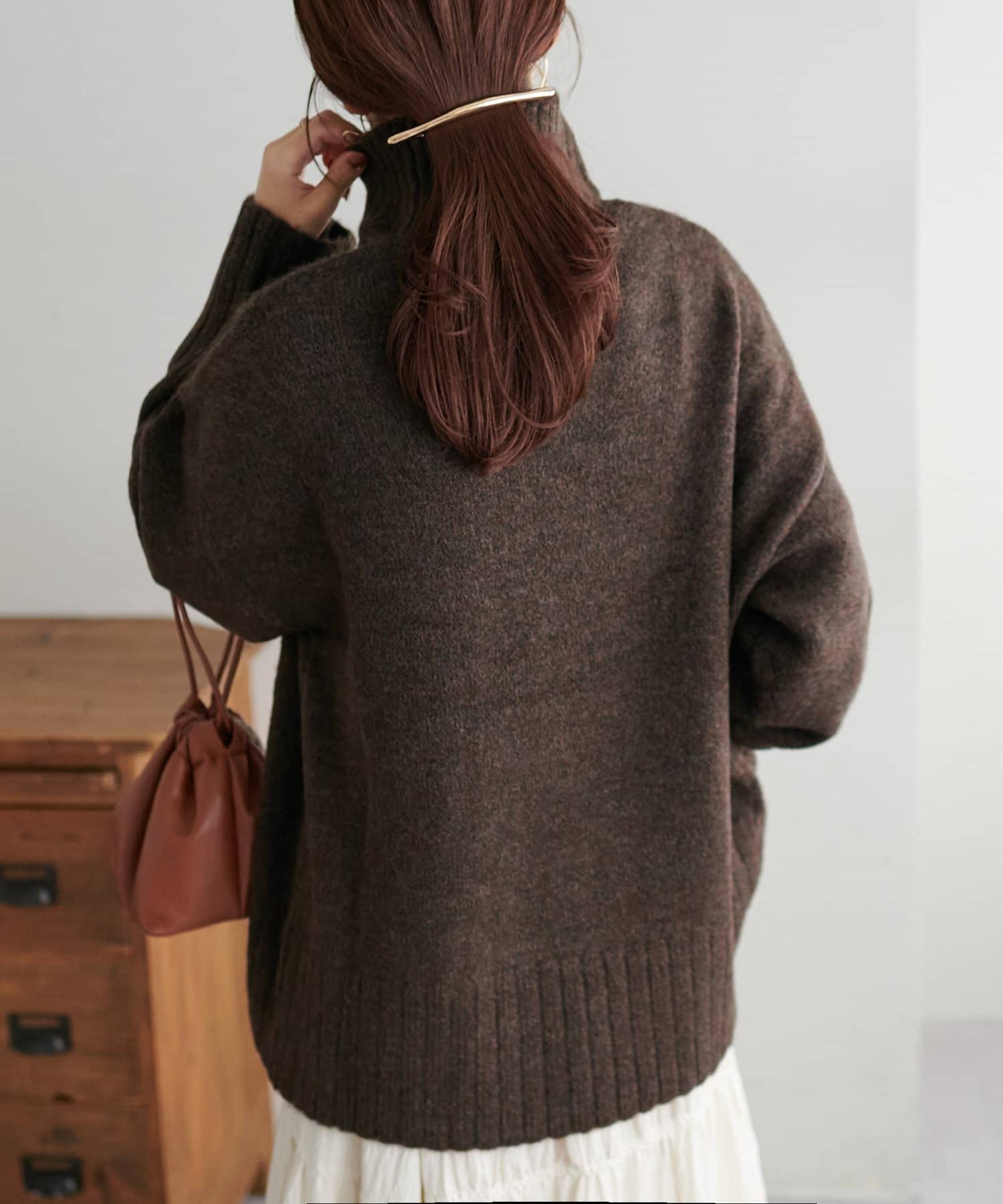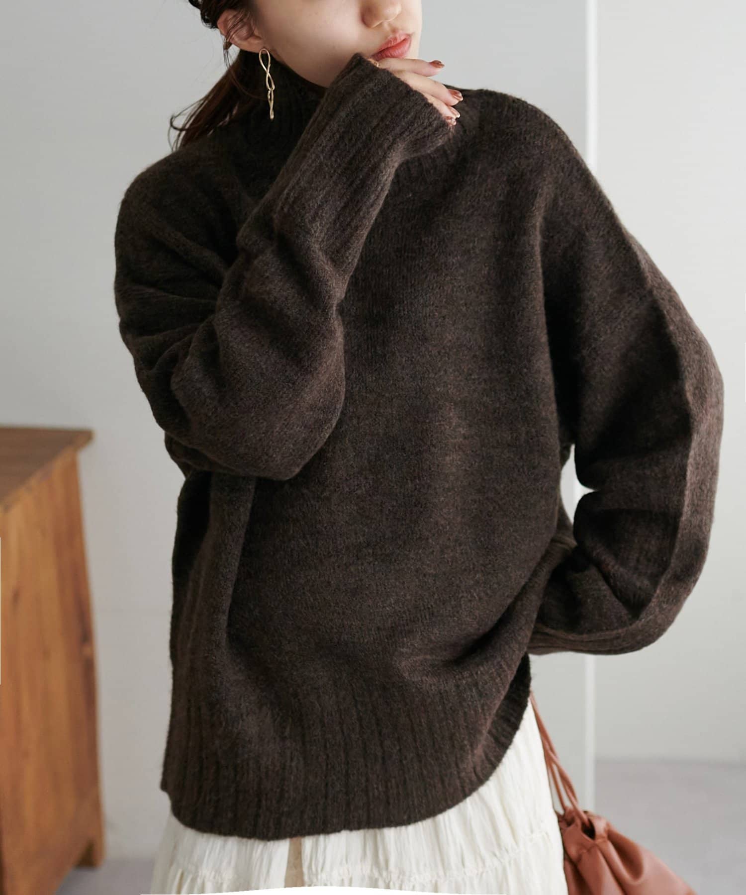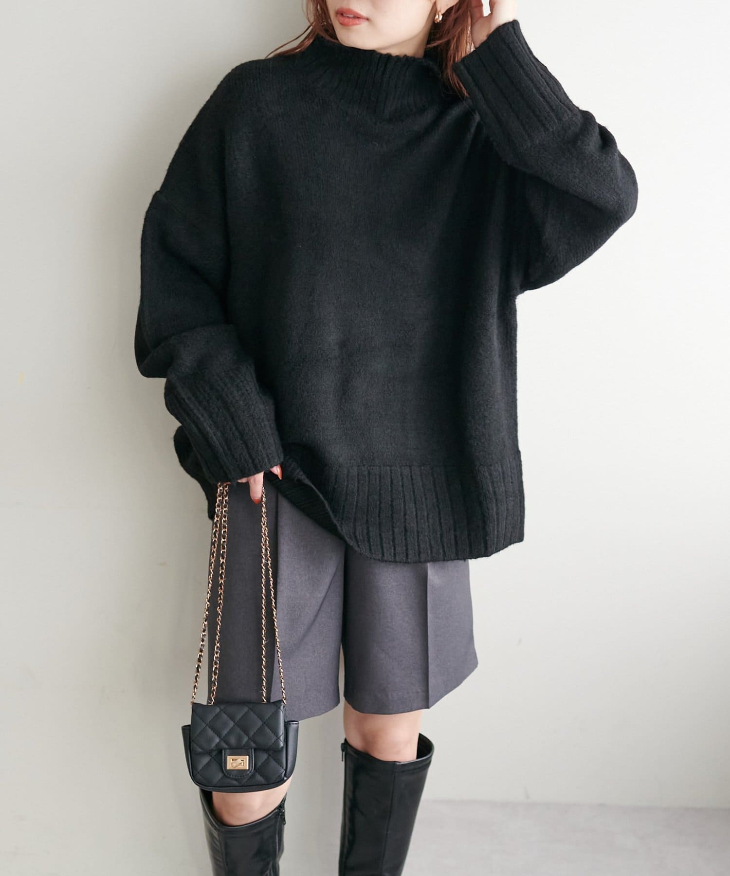 ゆったりとしたシルエットで華奢見えするハイネックニット。