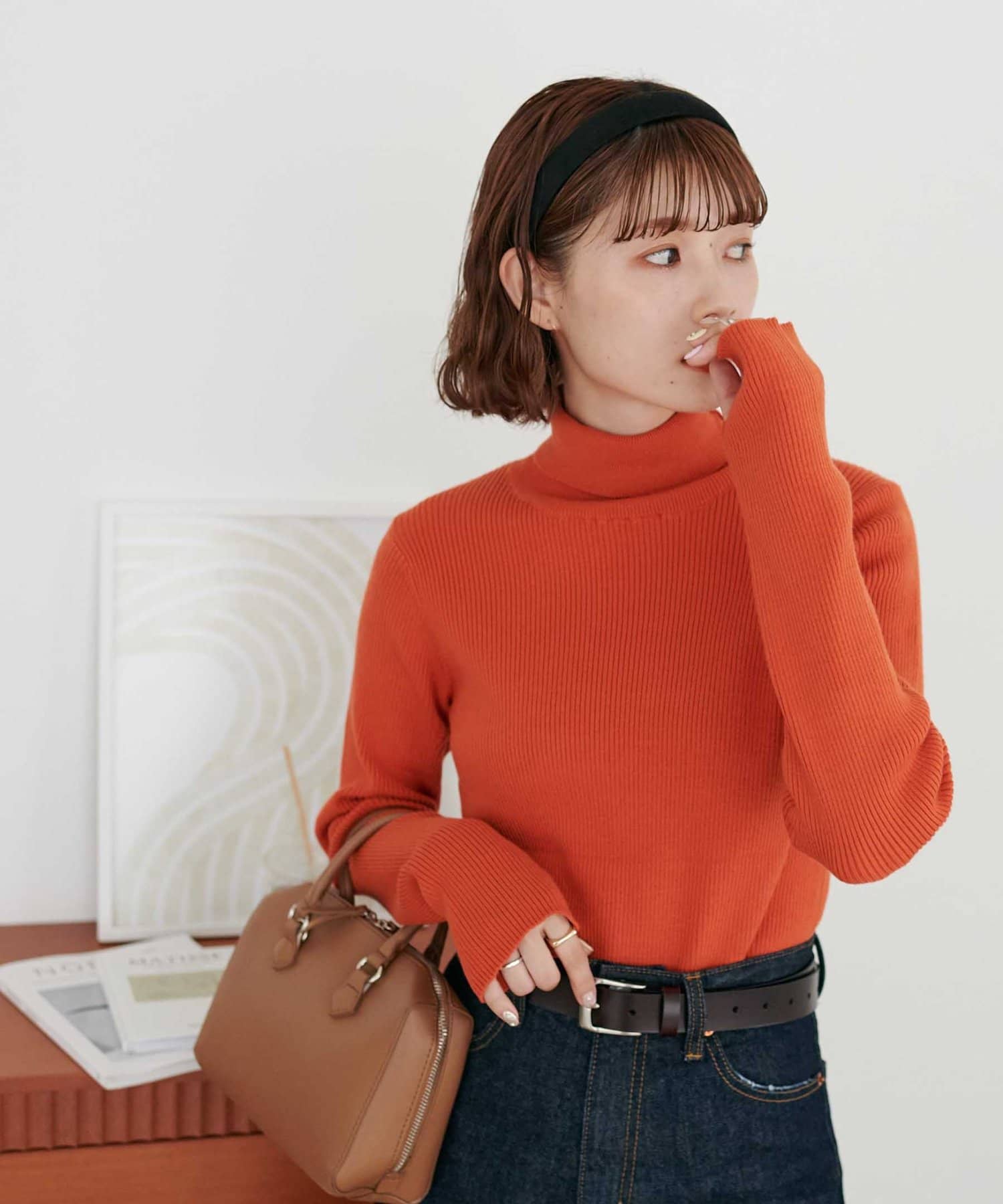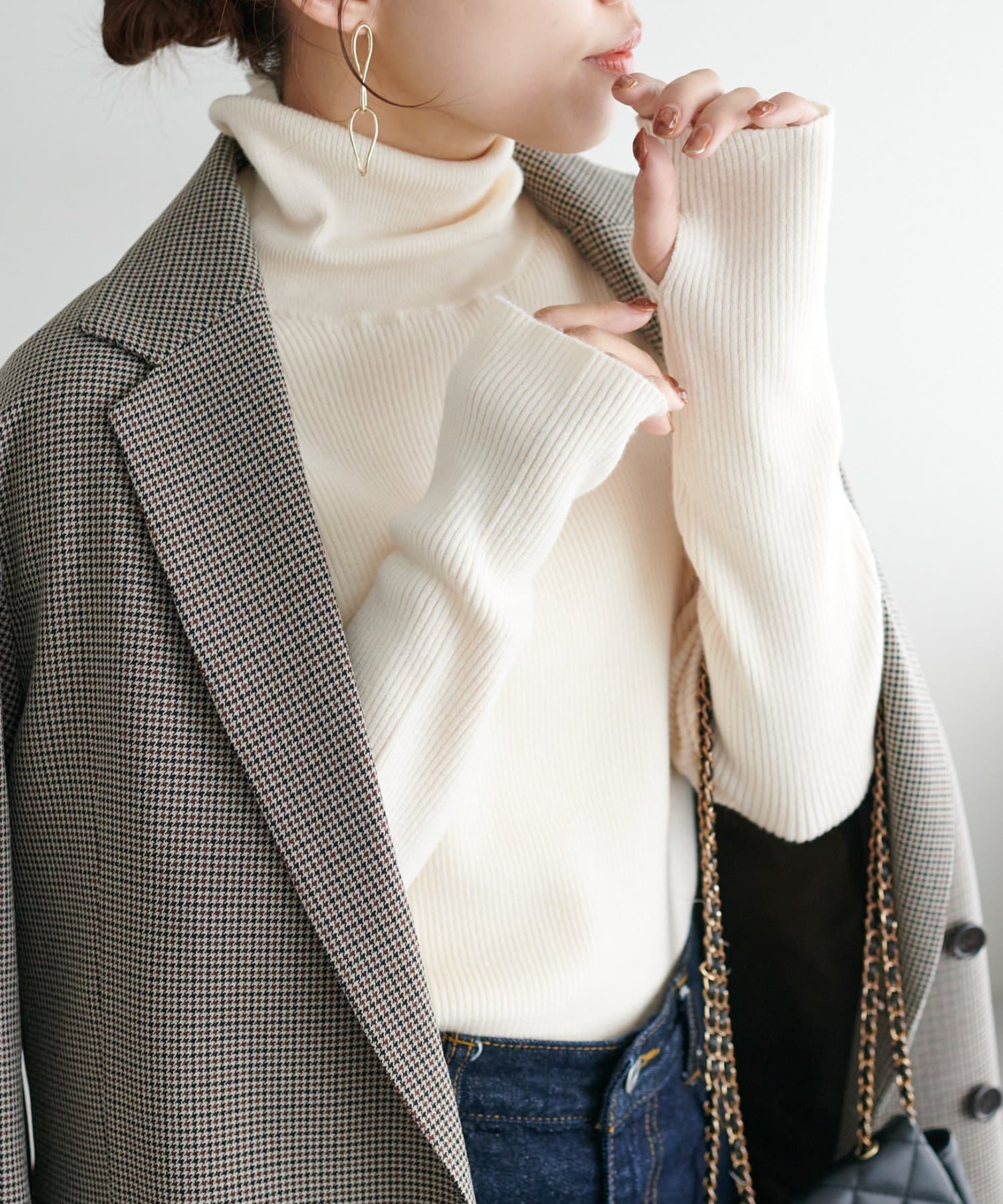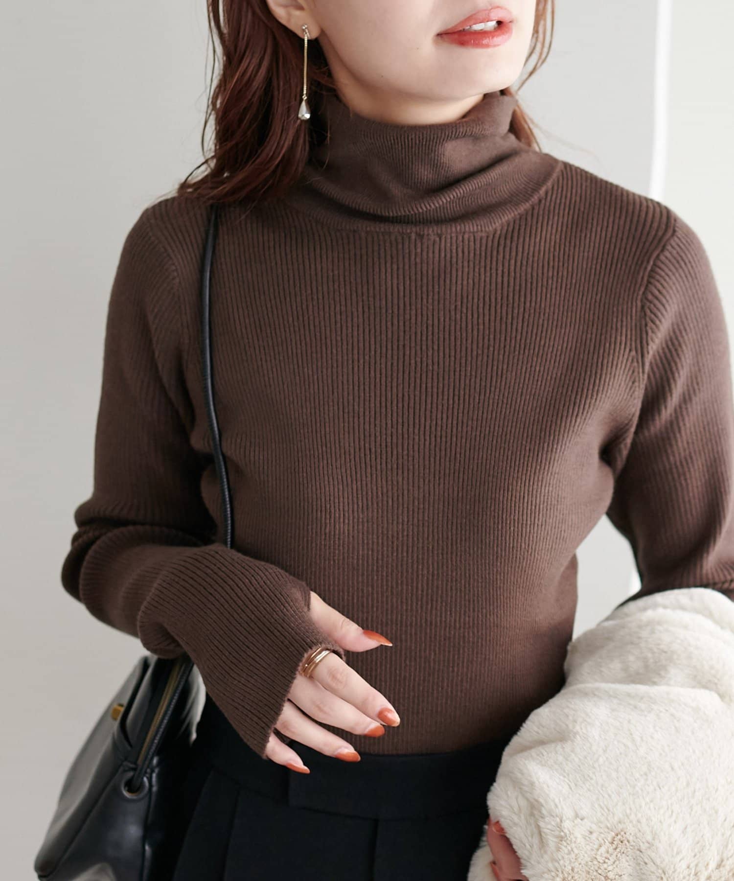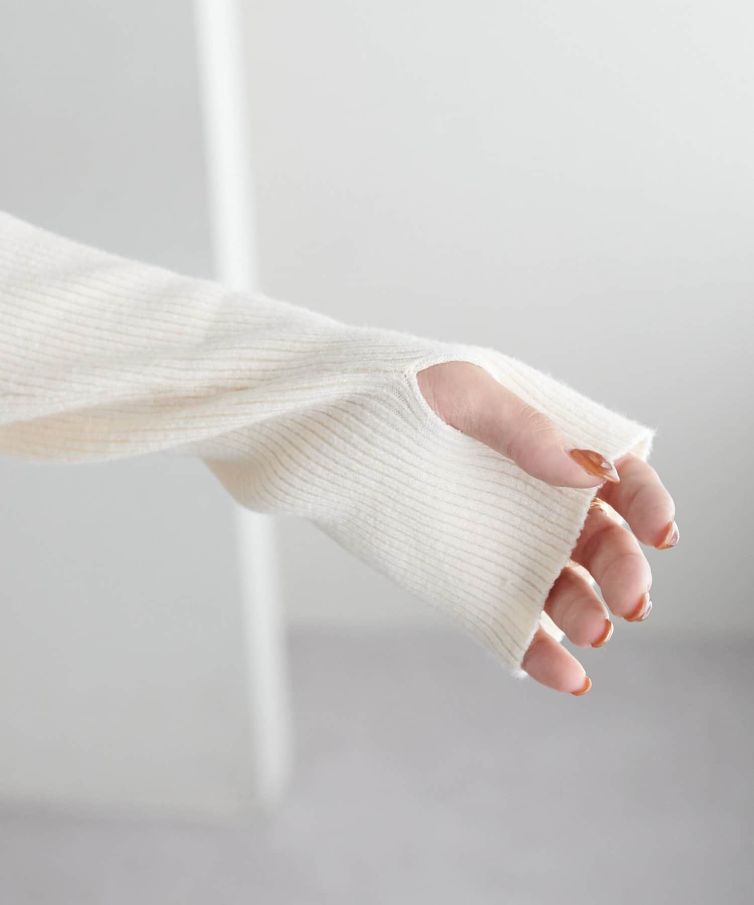 フィンガーホールデザインがアクセントになるリブタートルネック。