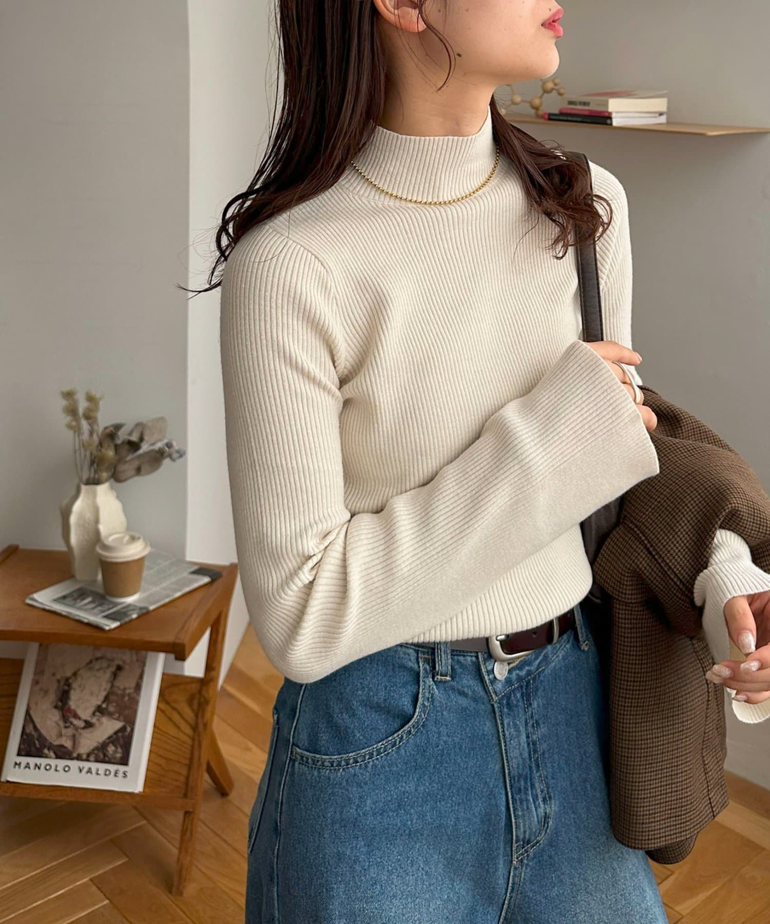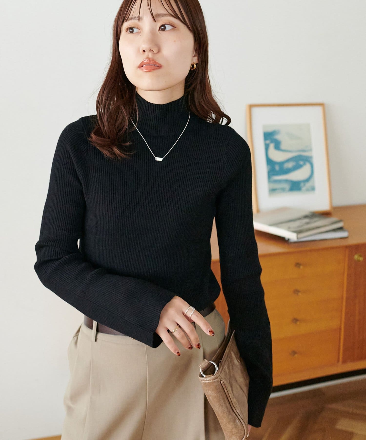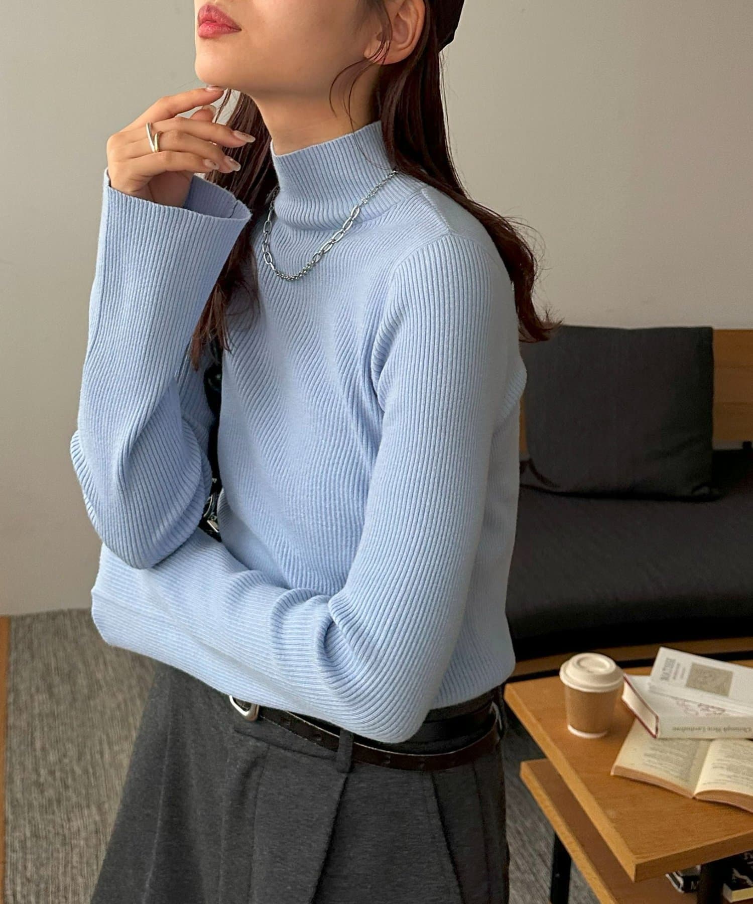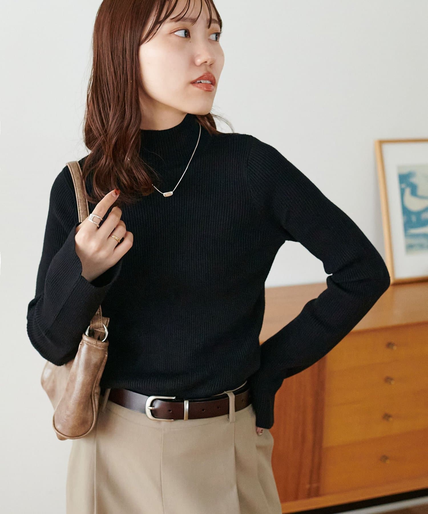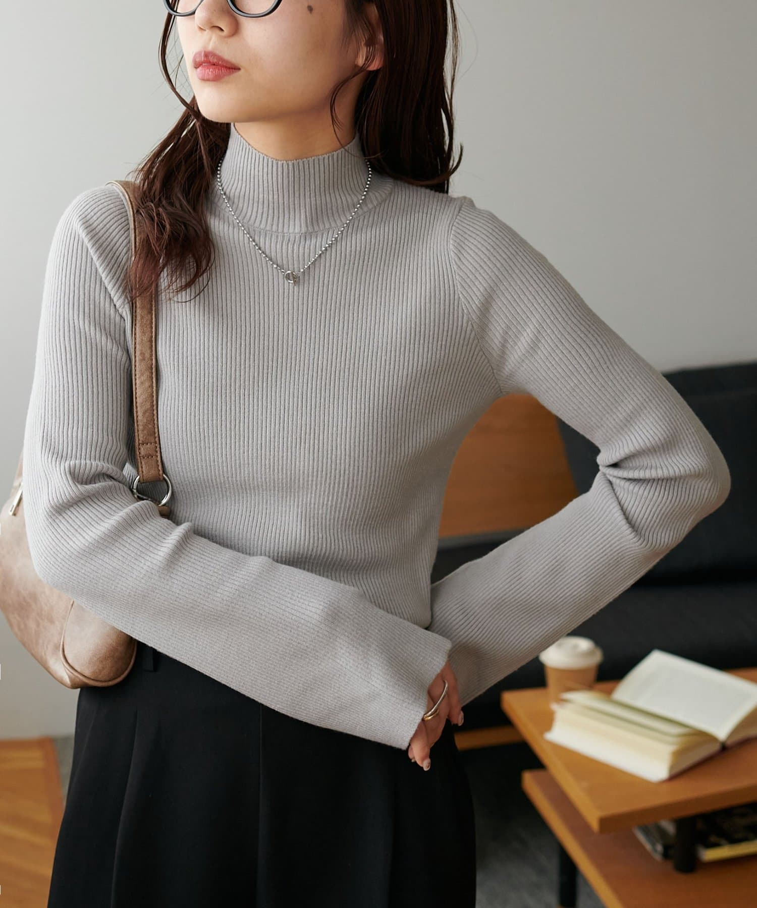程よく体にフィットするリブ素材で、女性らしいシルエットを引き立てるハイネックニット。