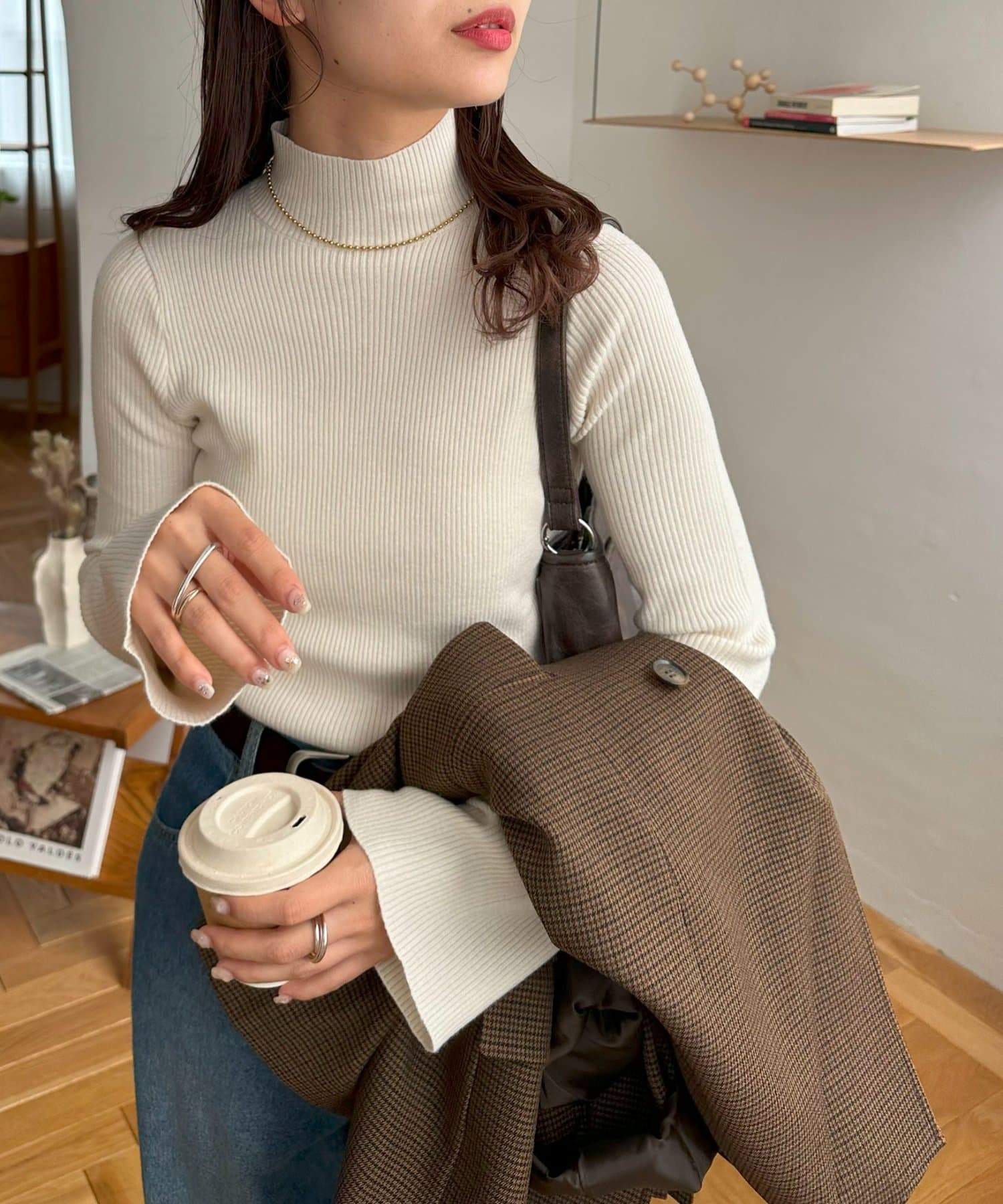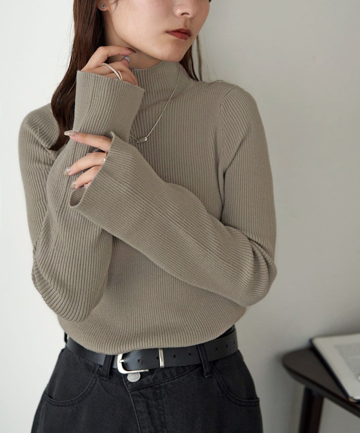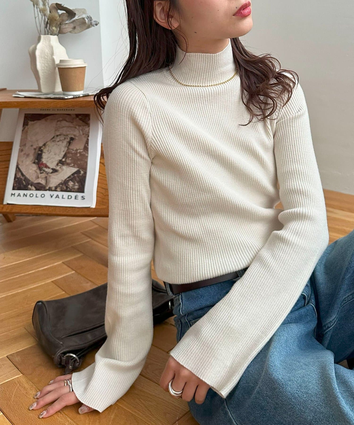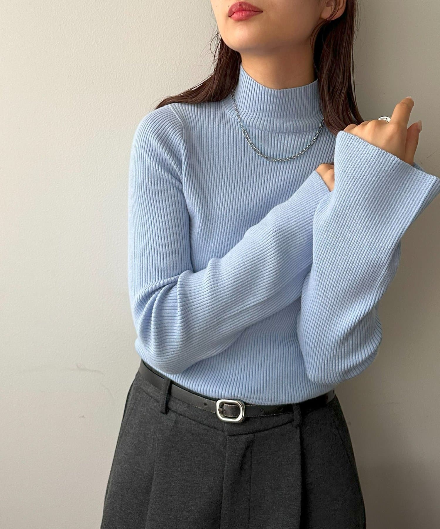 程よく体にフィットするリブ素材で、女性らしいシルエットを引き立てるハイネックニット。