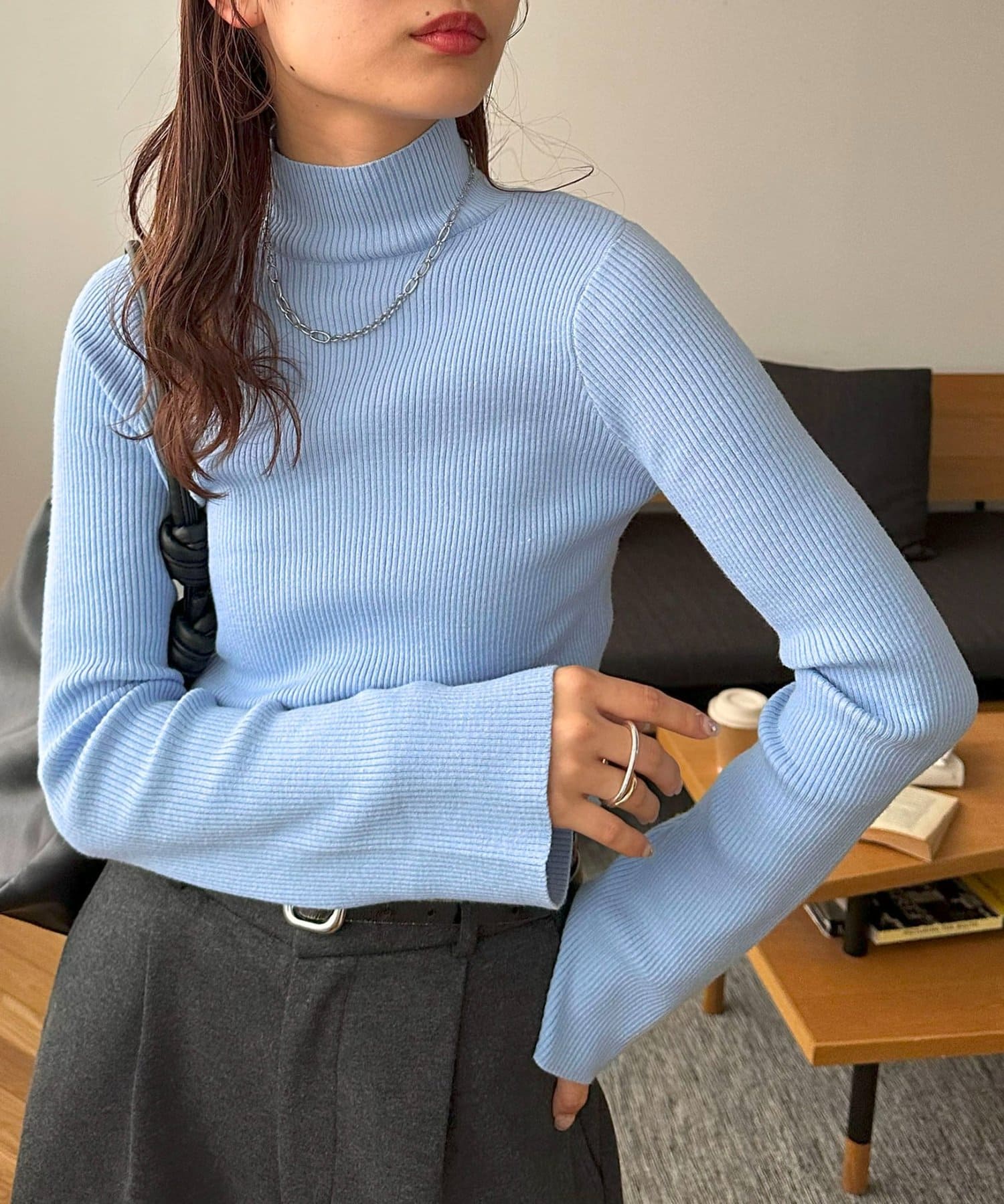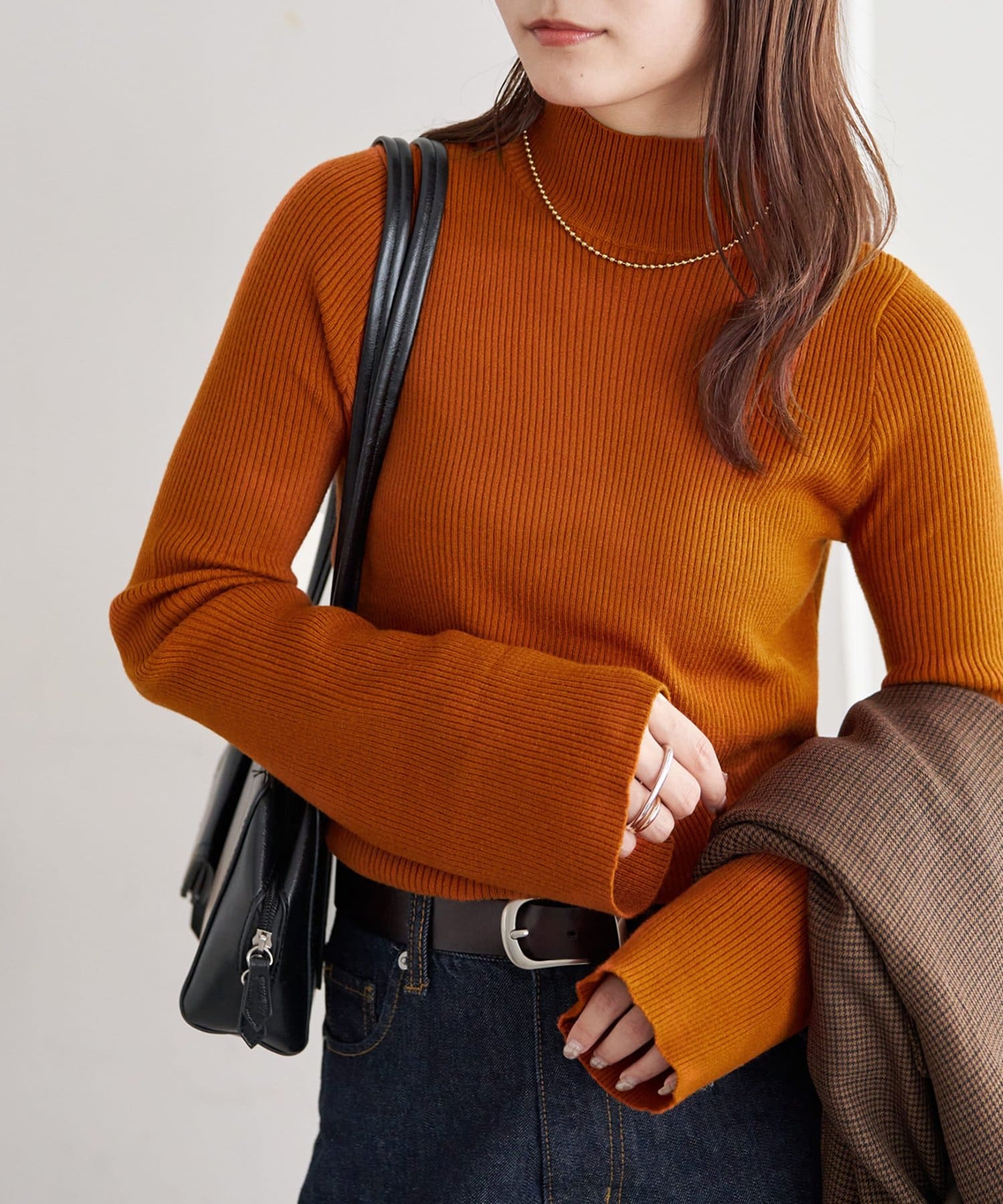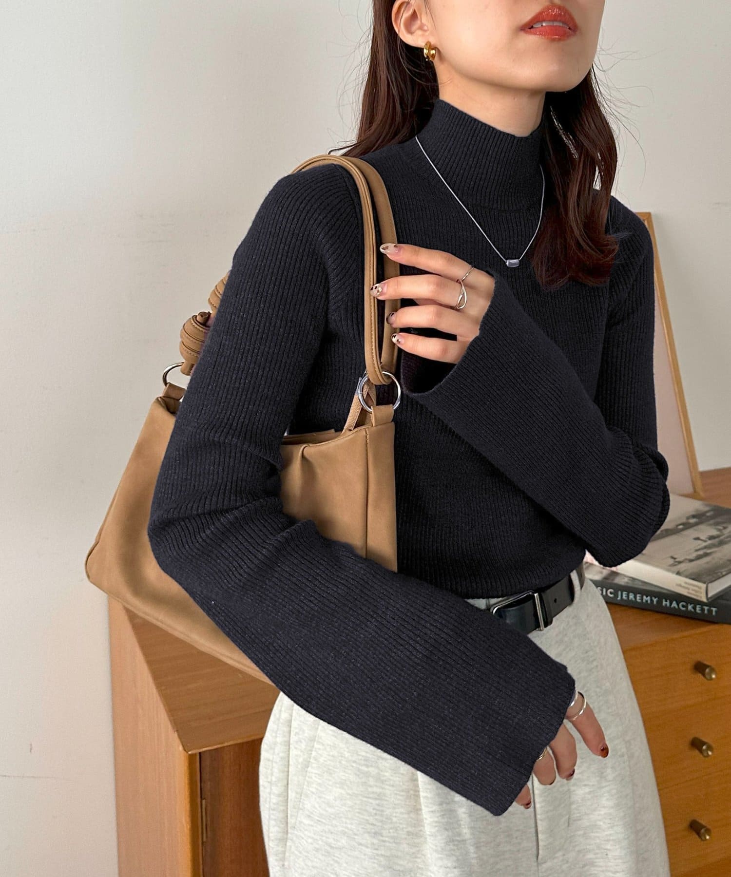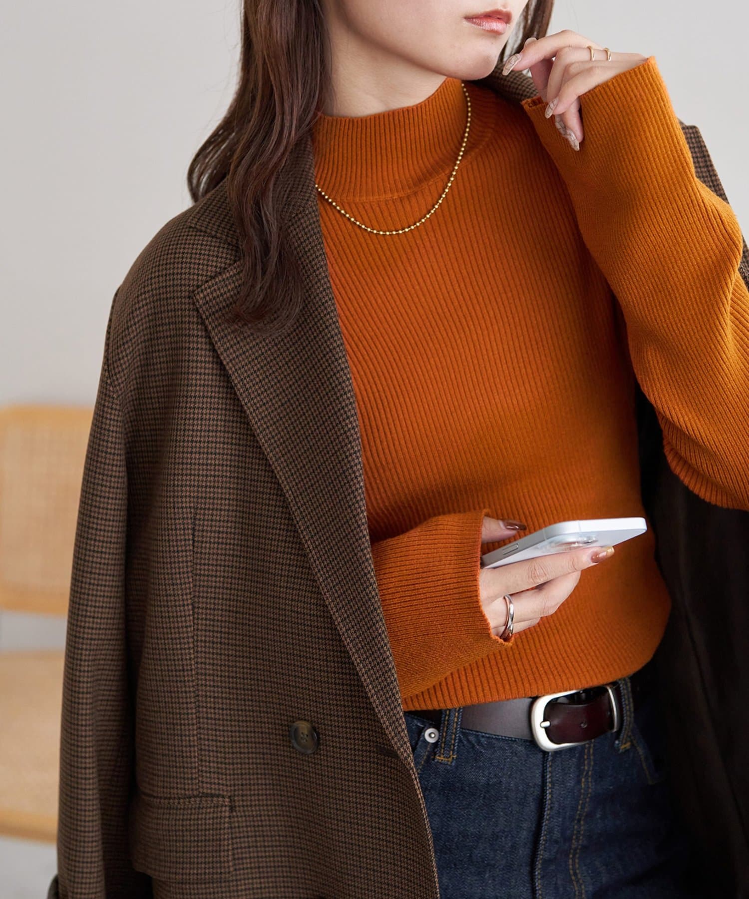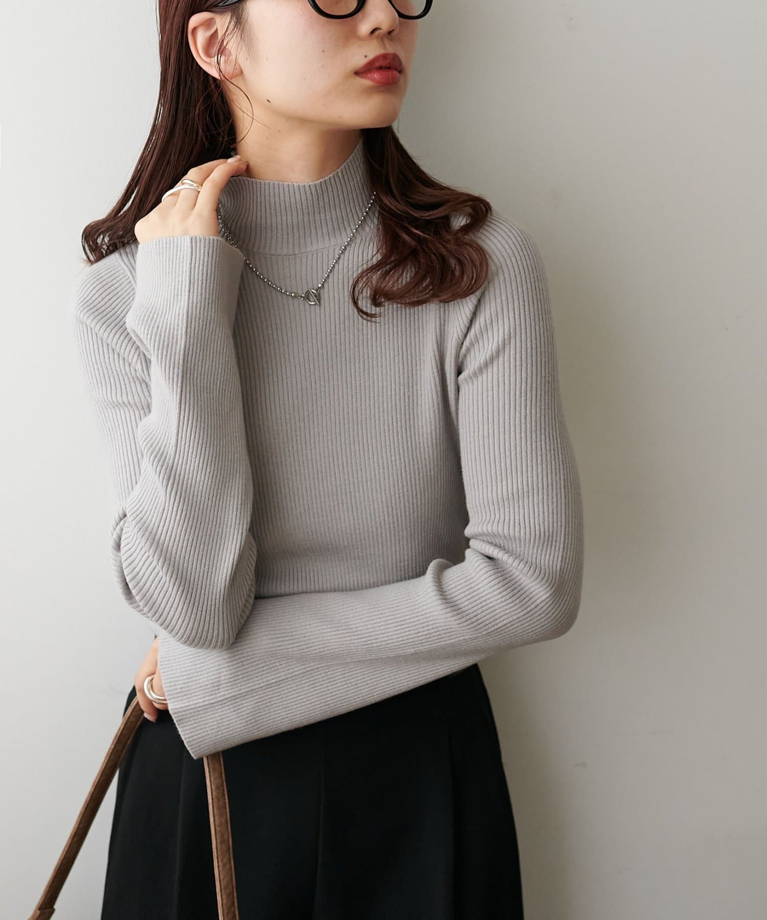 程よく体にフィットするリブ素材で、女性らしいシルエットを引き立てるハイネックニット。