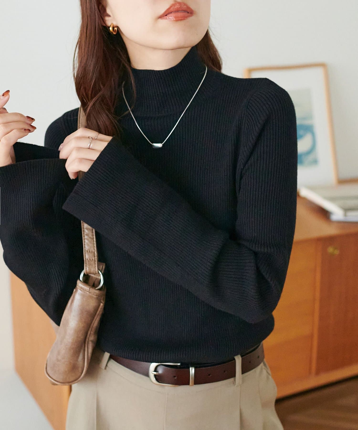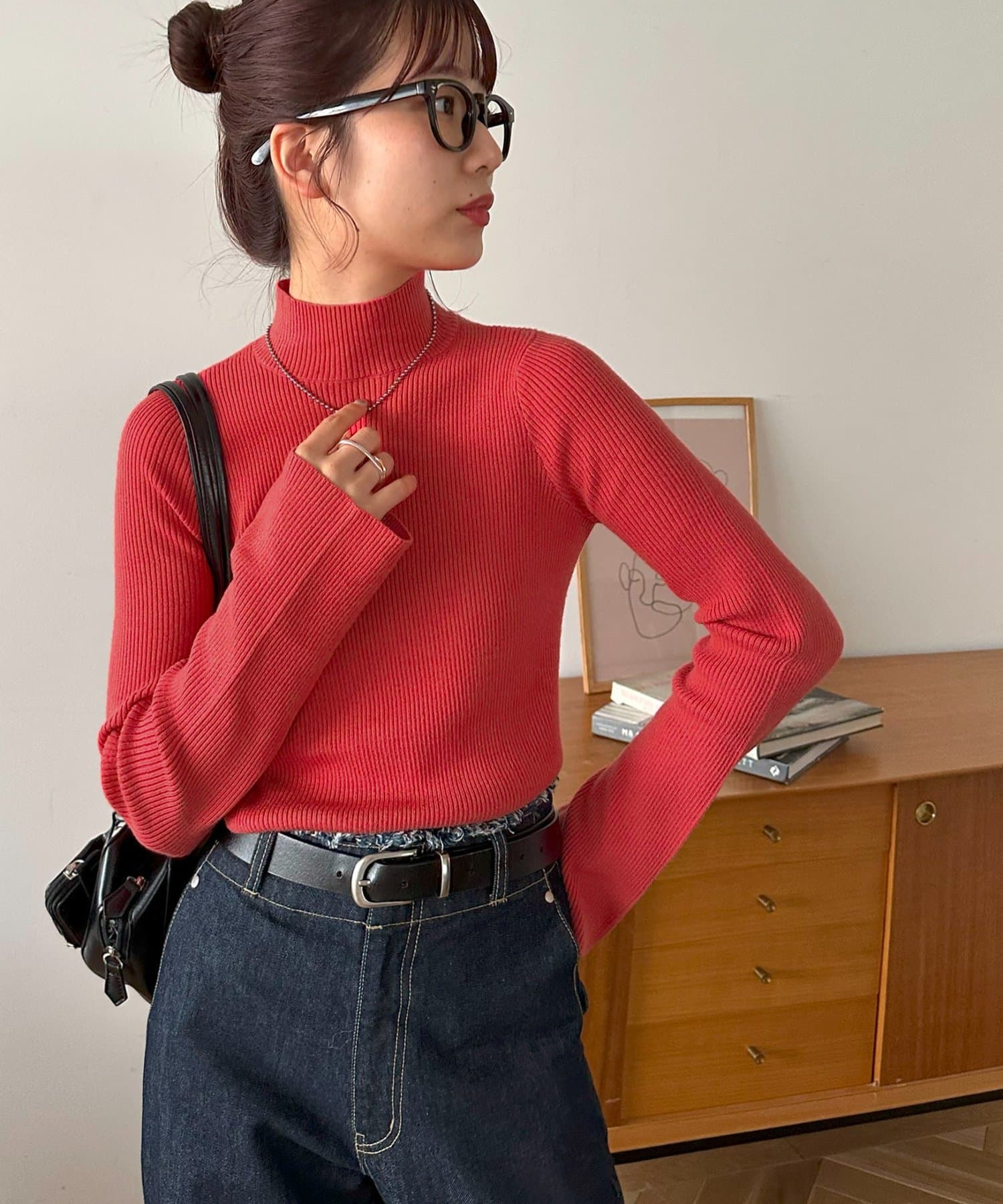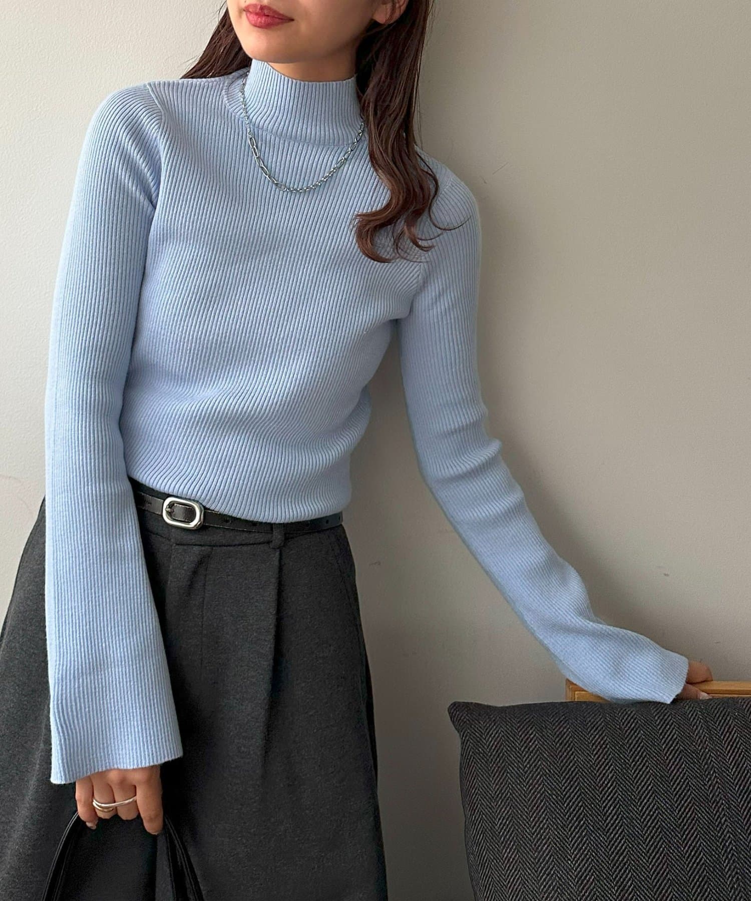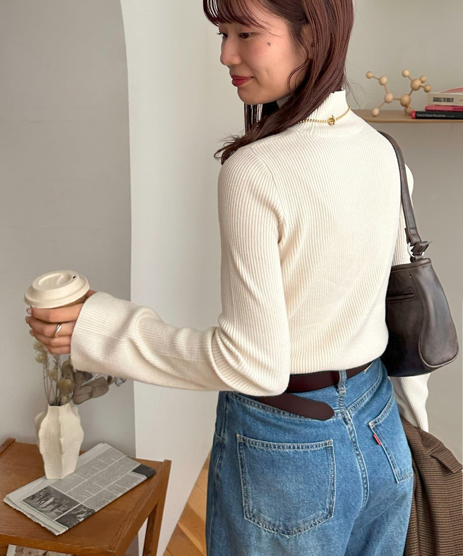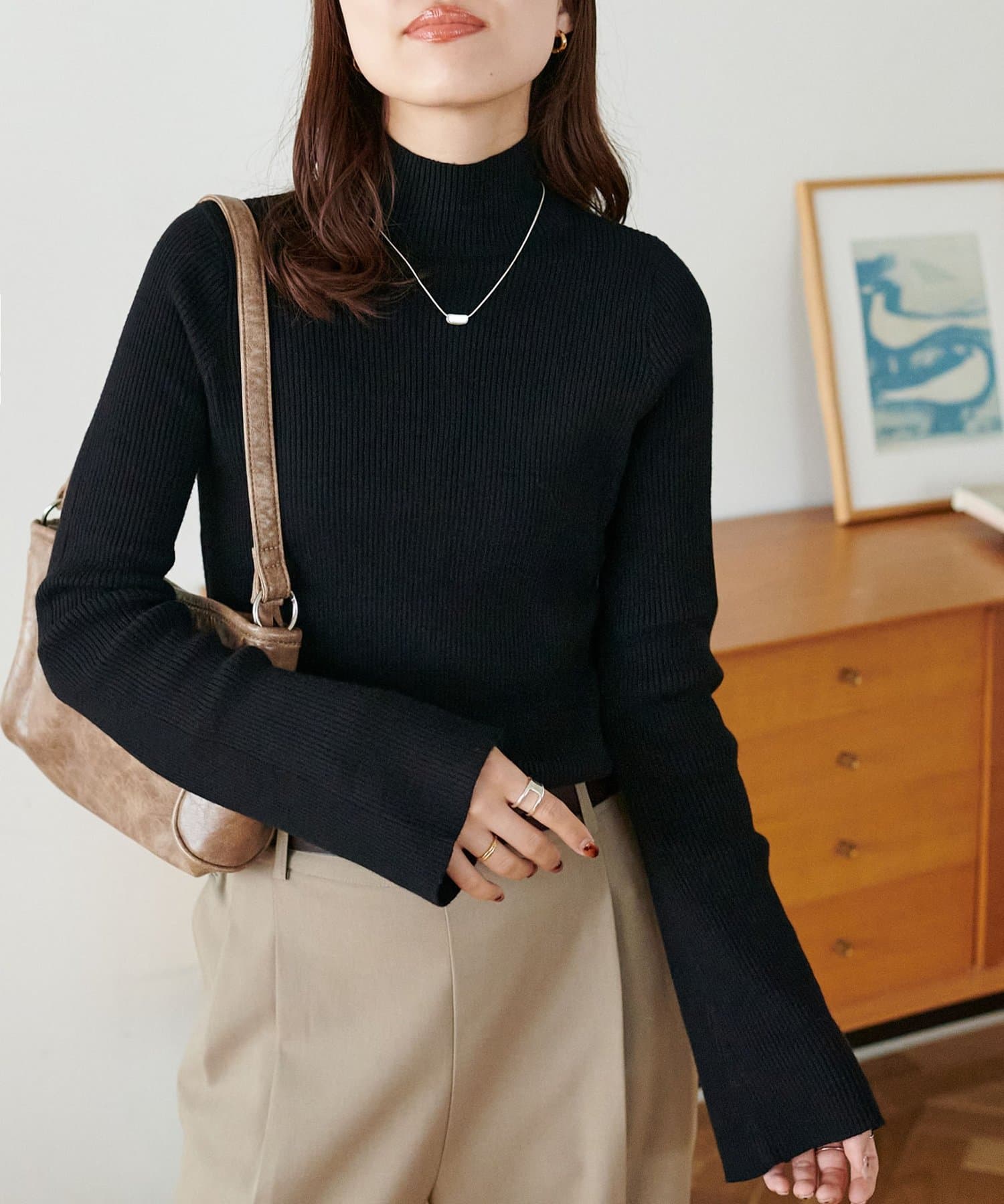 程よく体にフィットするリブ素材で、女性らしいシルエットを引き立てるハイネックニット。