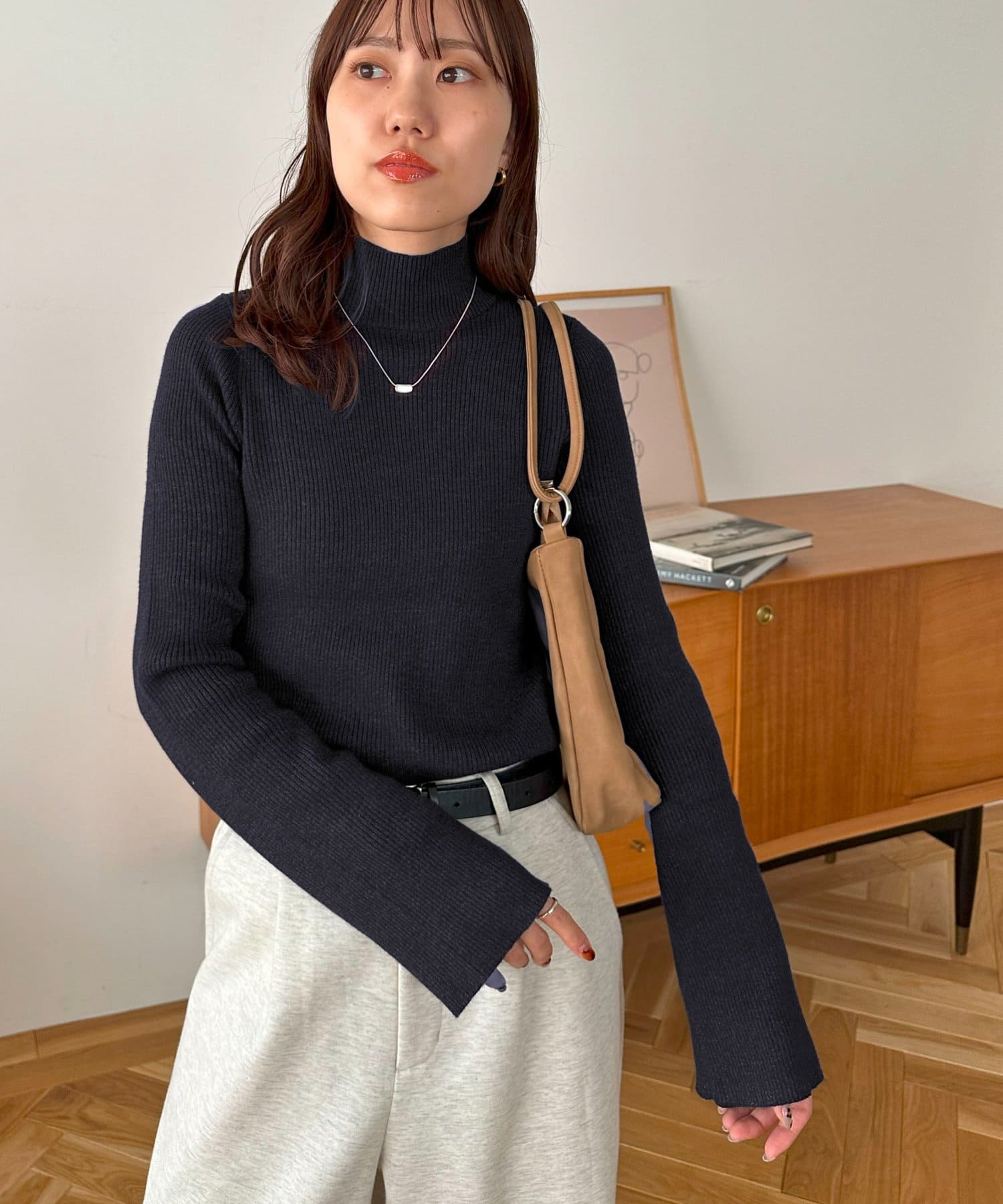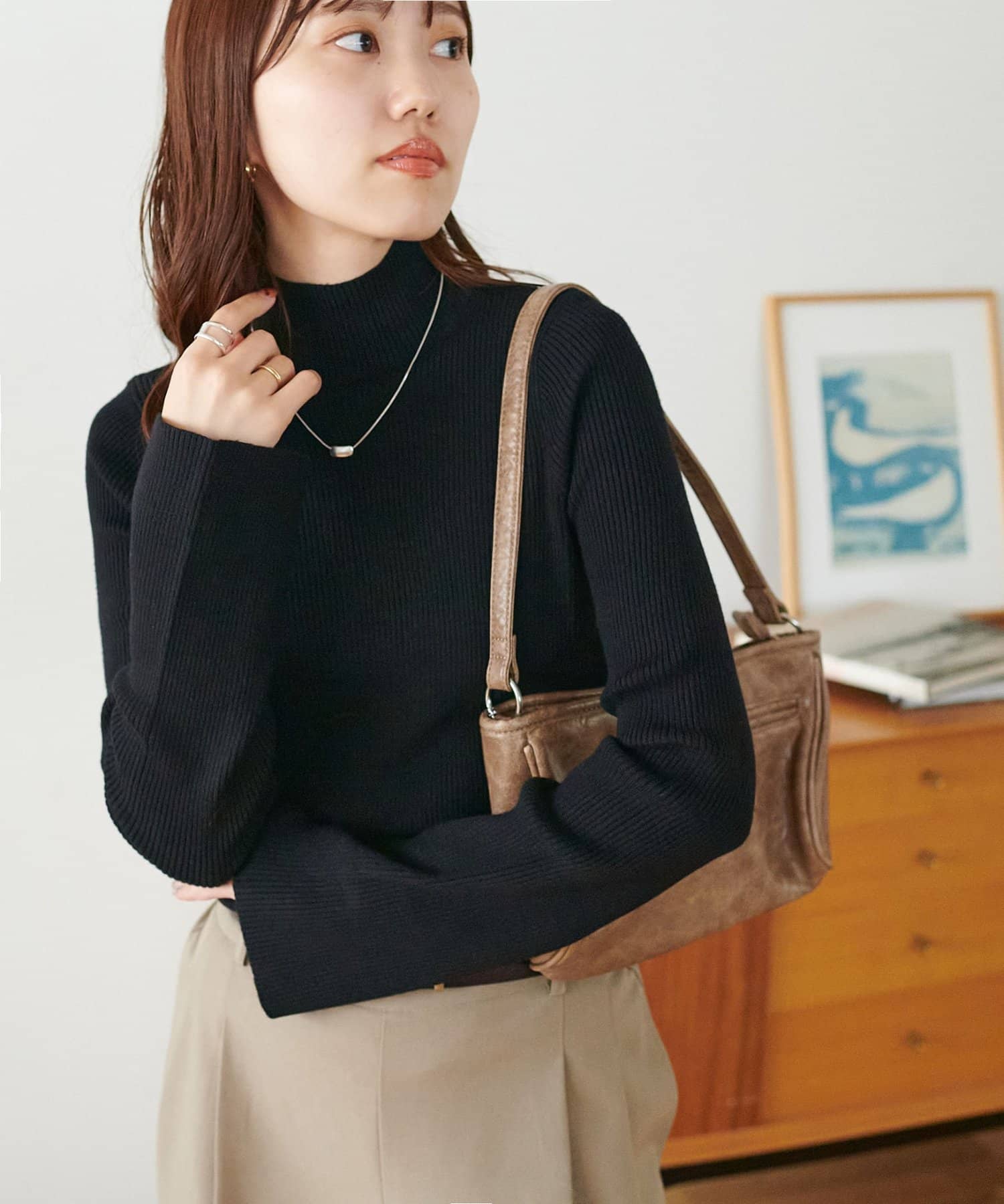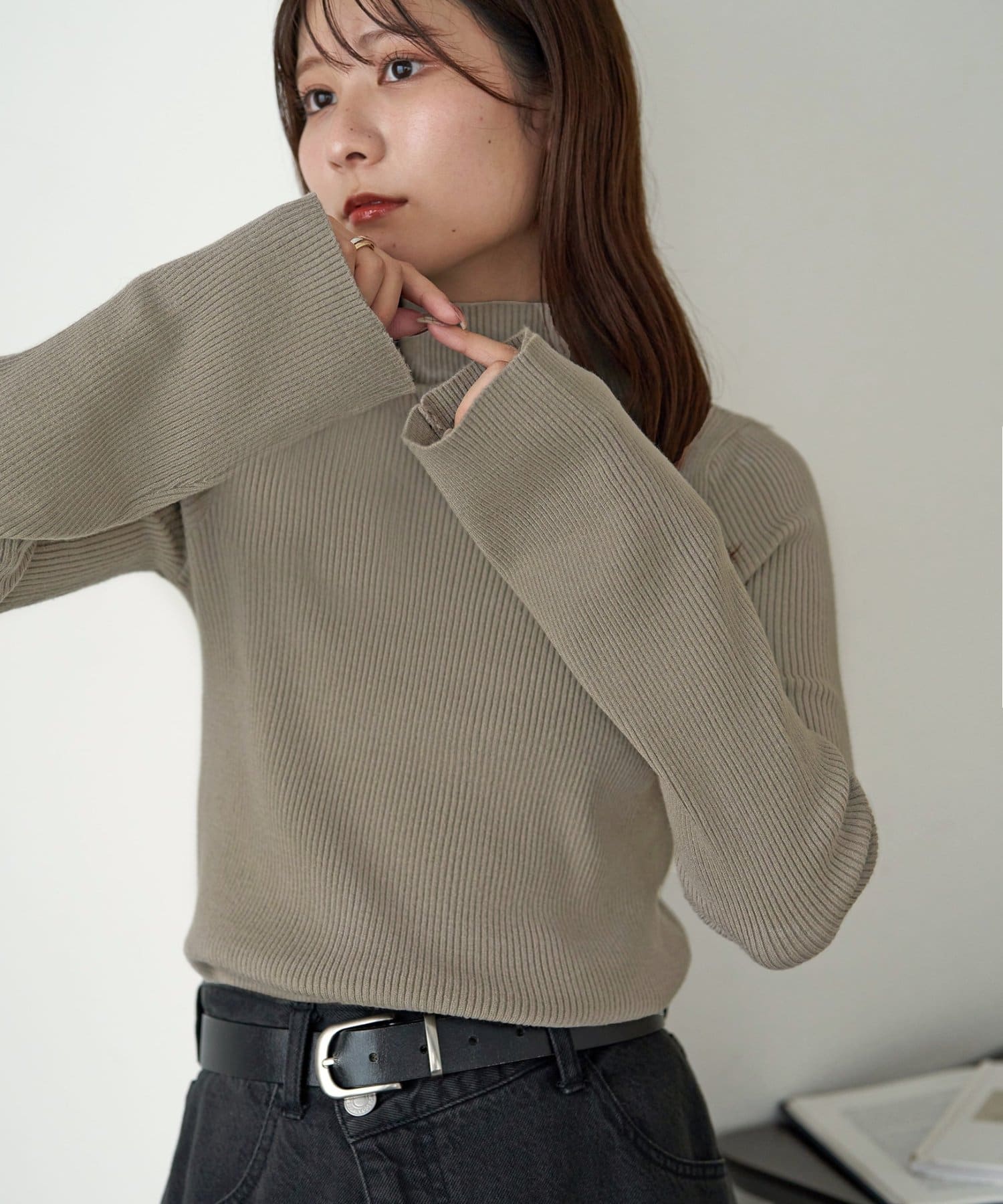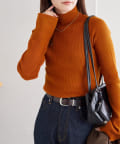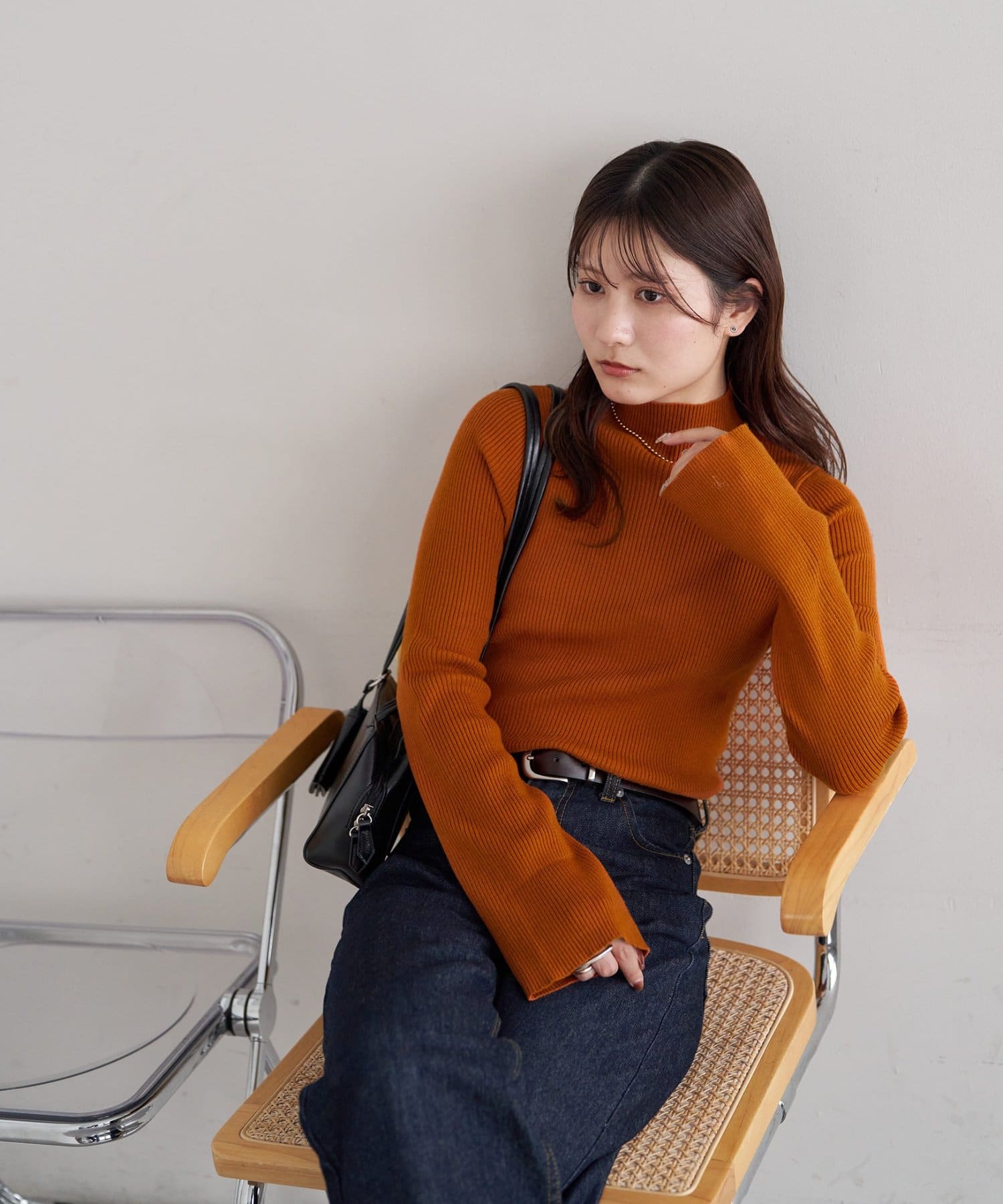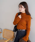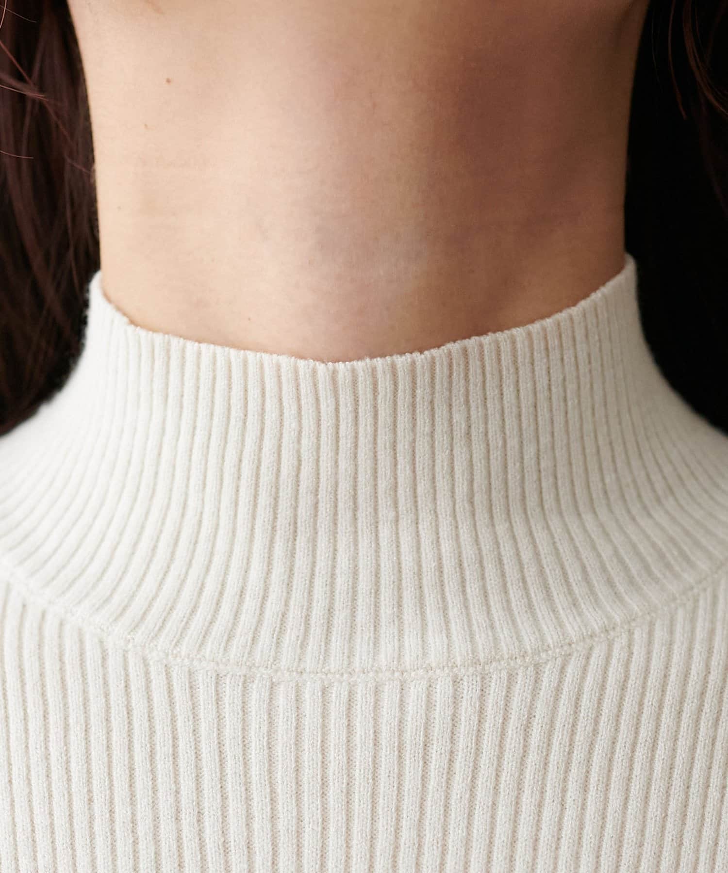 程よく体にフィットするリブ素材で、女性らしいシルエットを引き立てるハイネックニット。