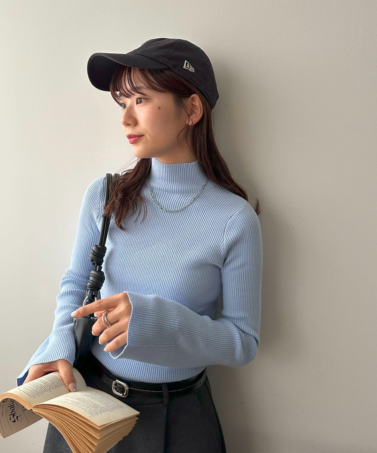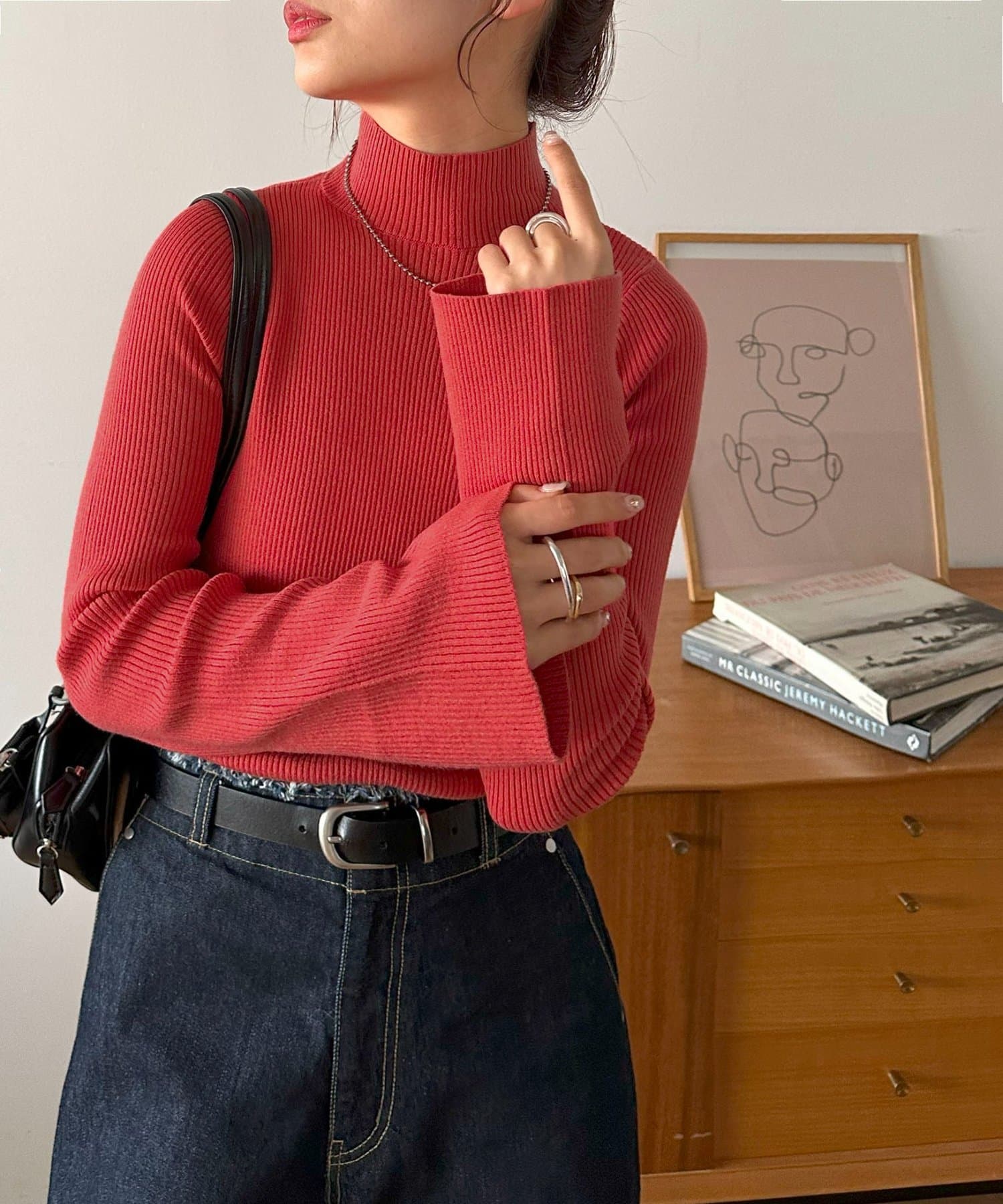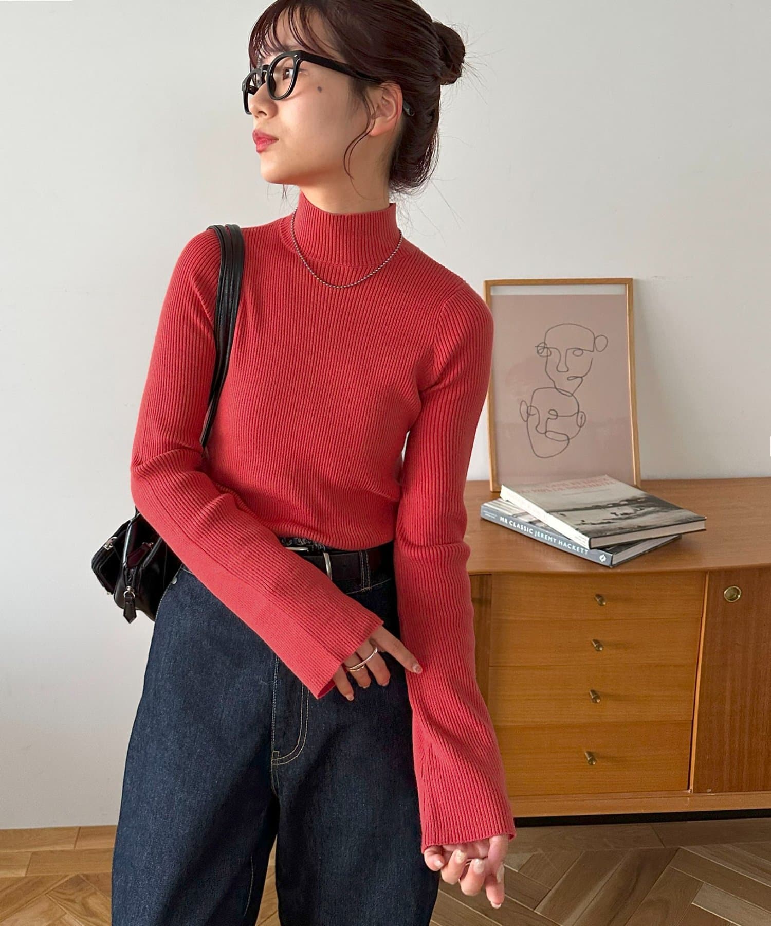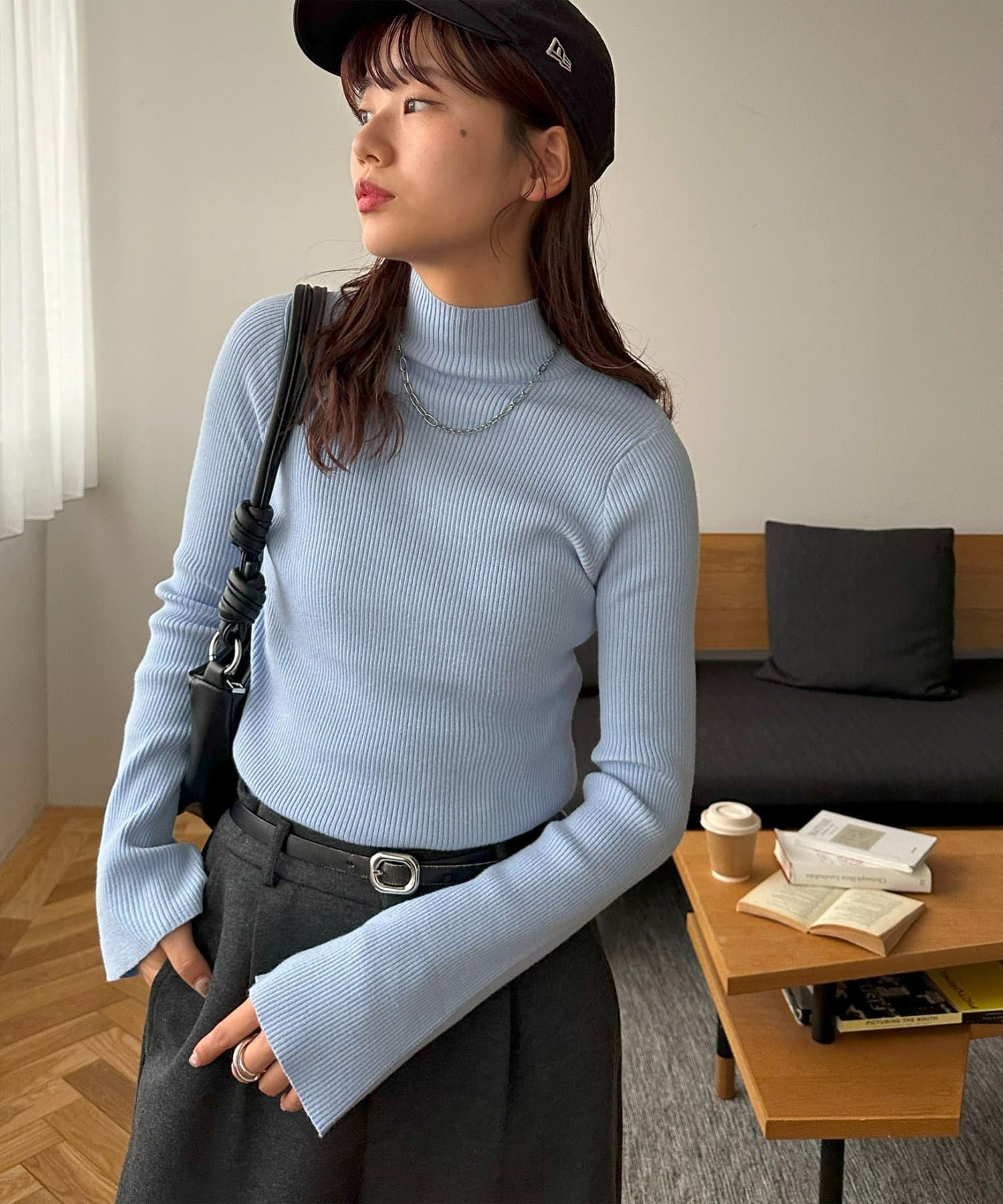 程よく体にフィットするリブ素材で、女性らしいシルエットを引き立てるハイネックニット。