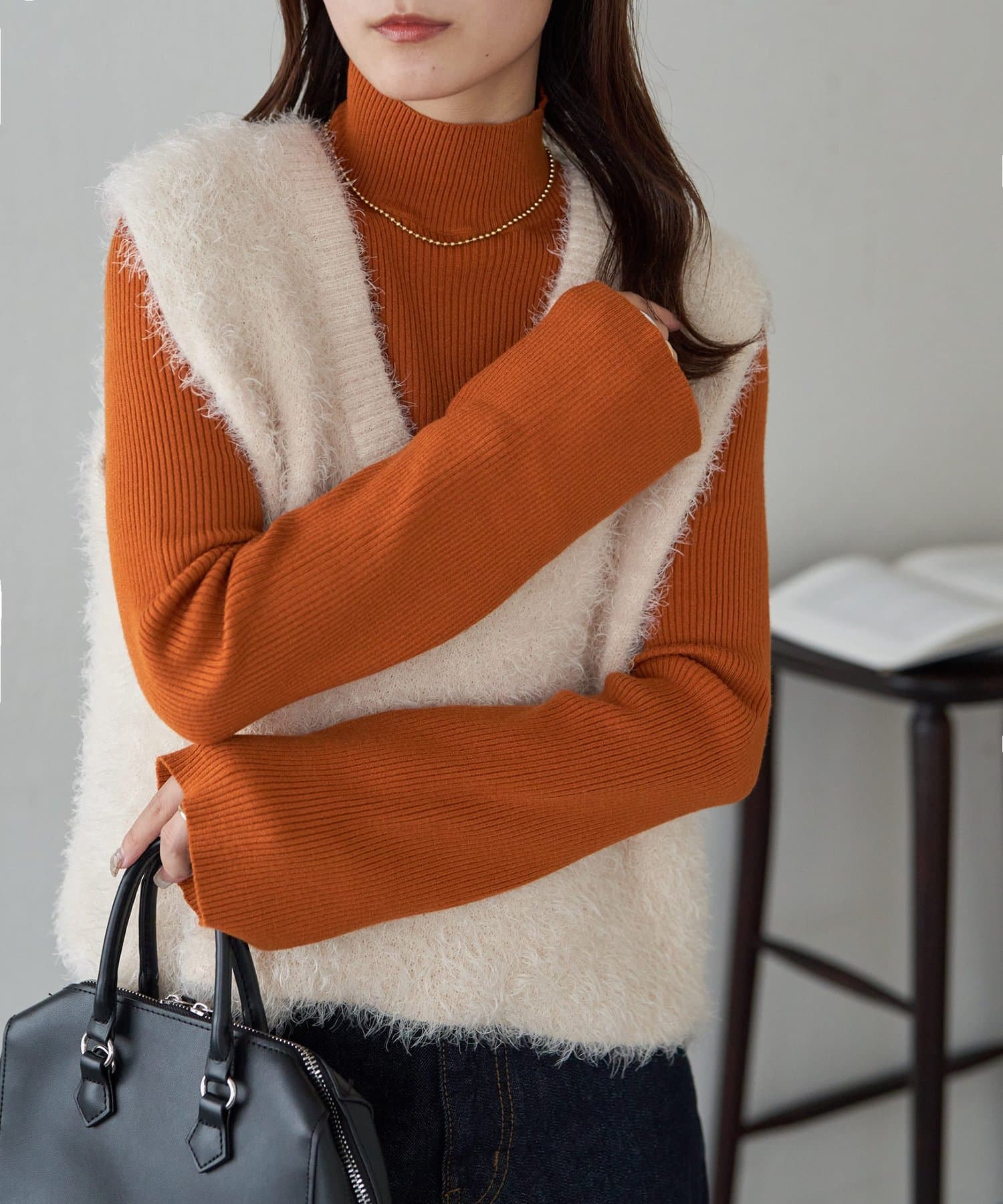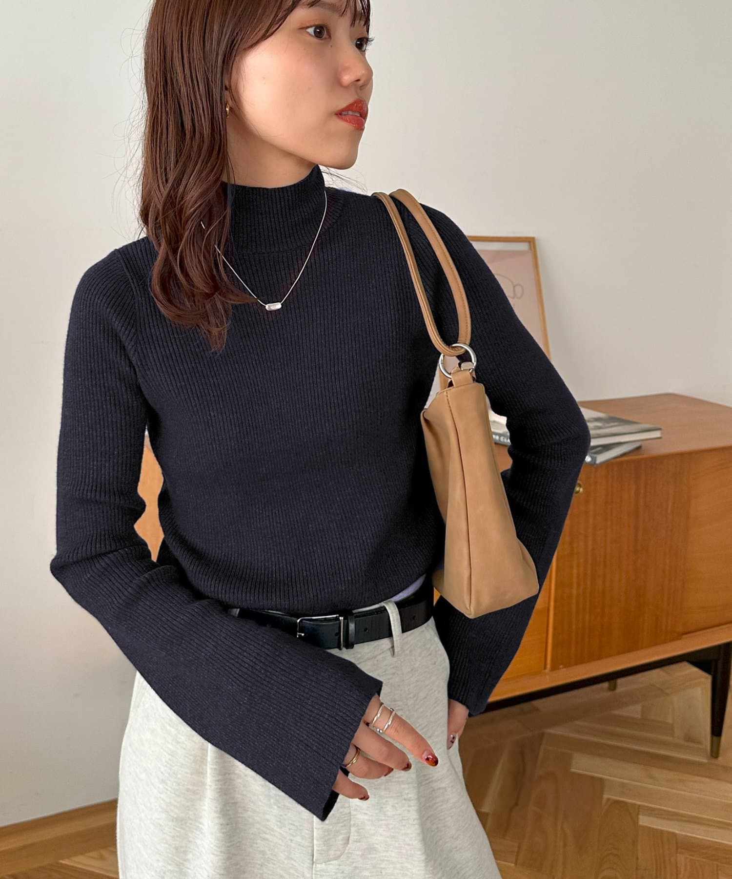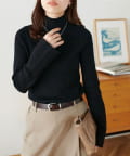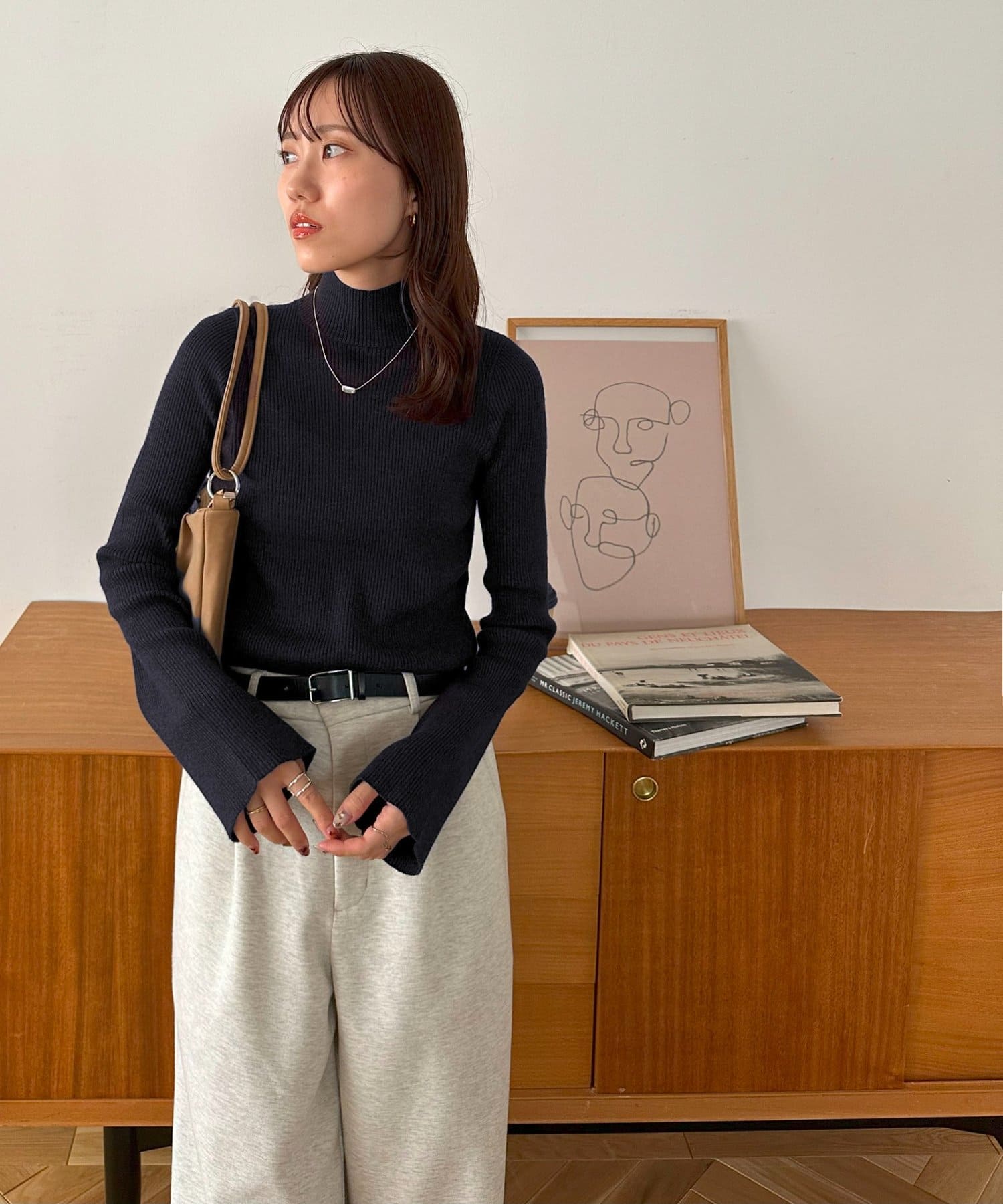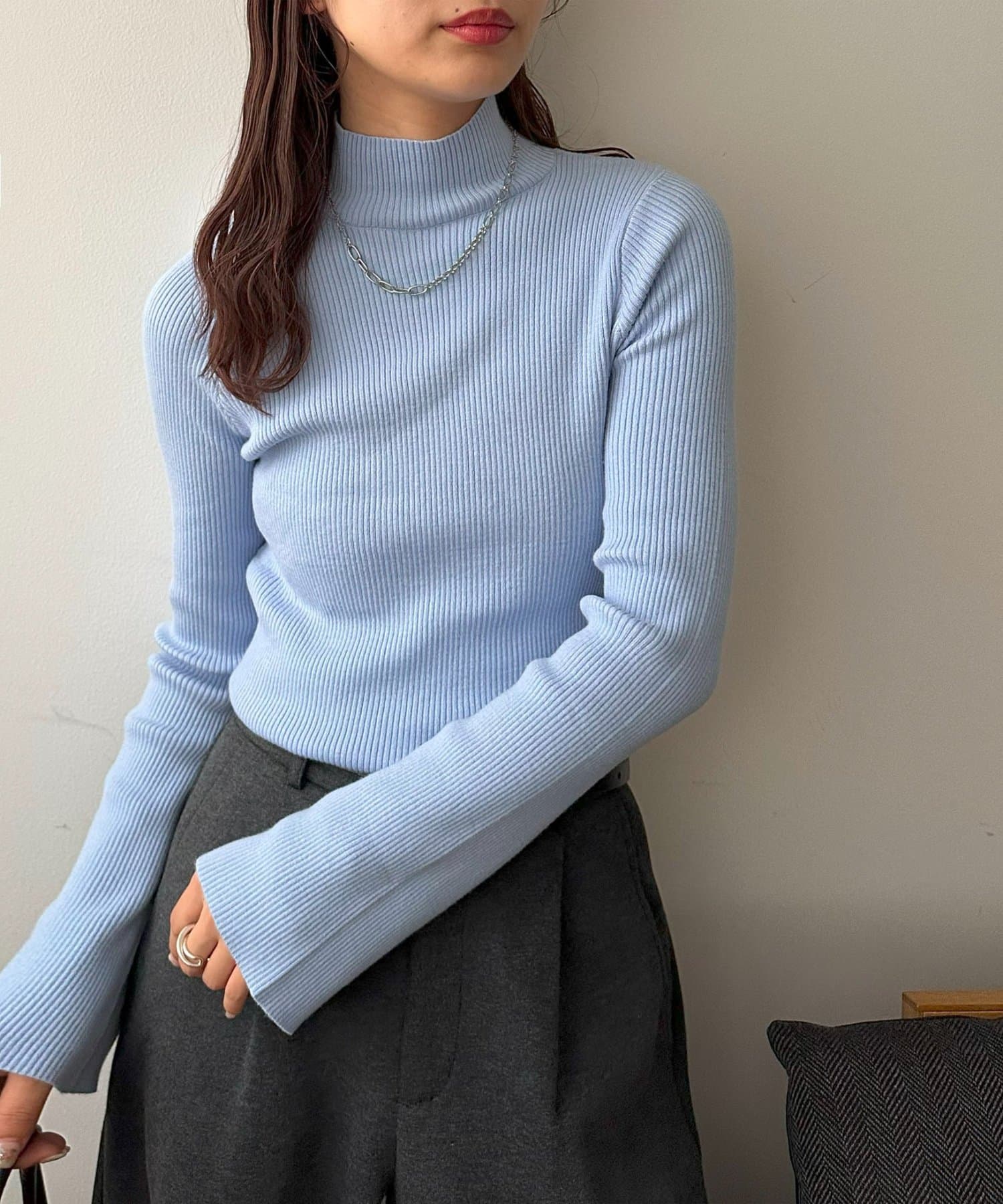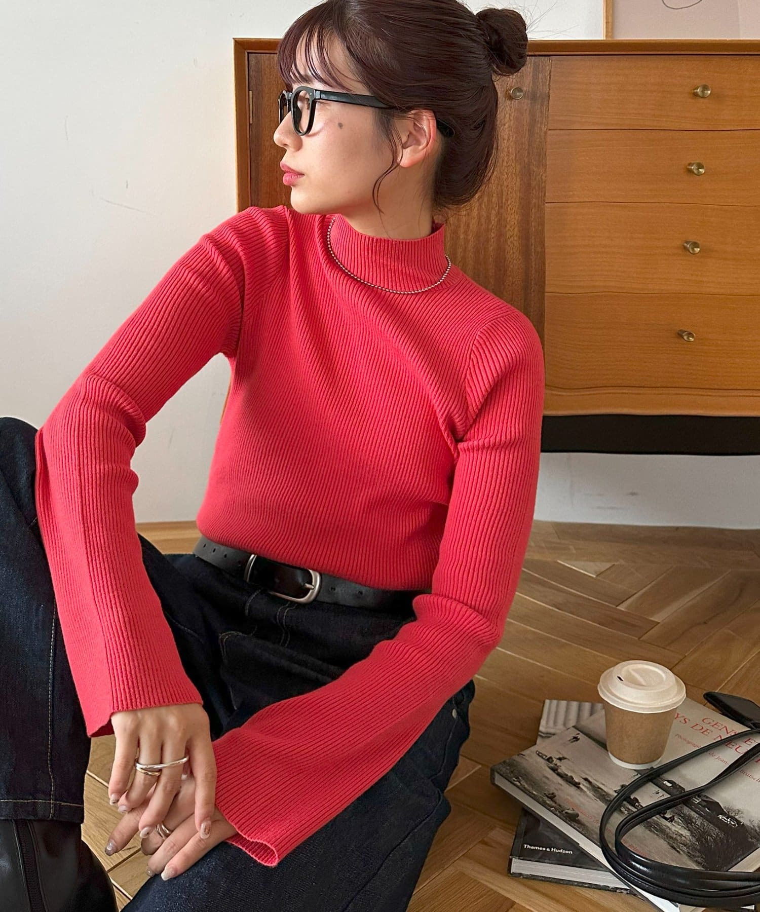 程よく体にフィットするリブ素材で、女性らしいシルエットを引き立てるハイネックニット。