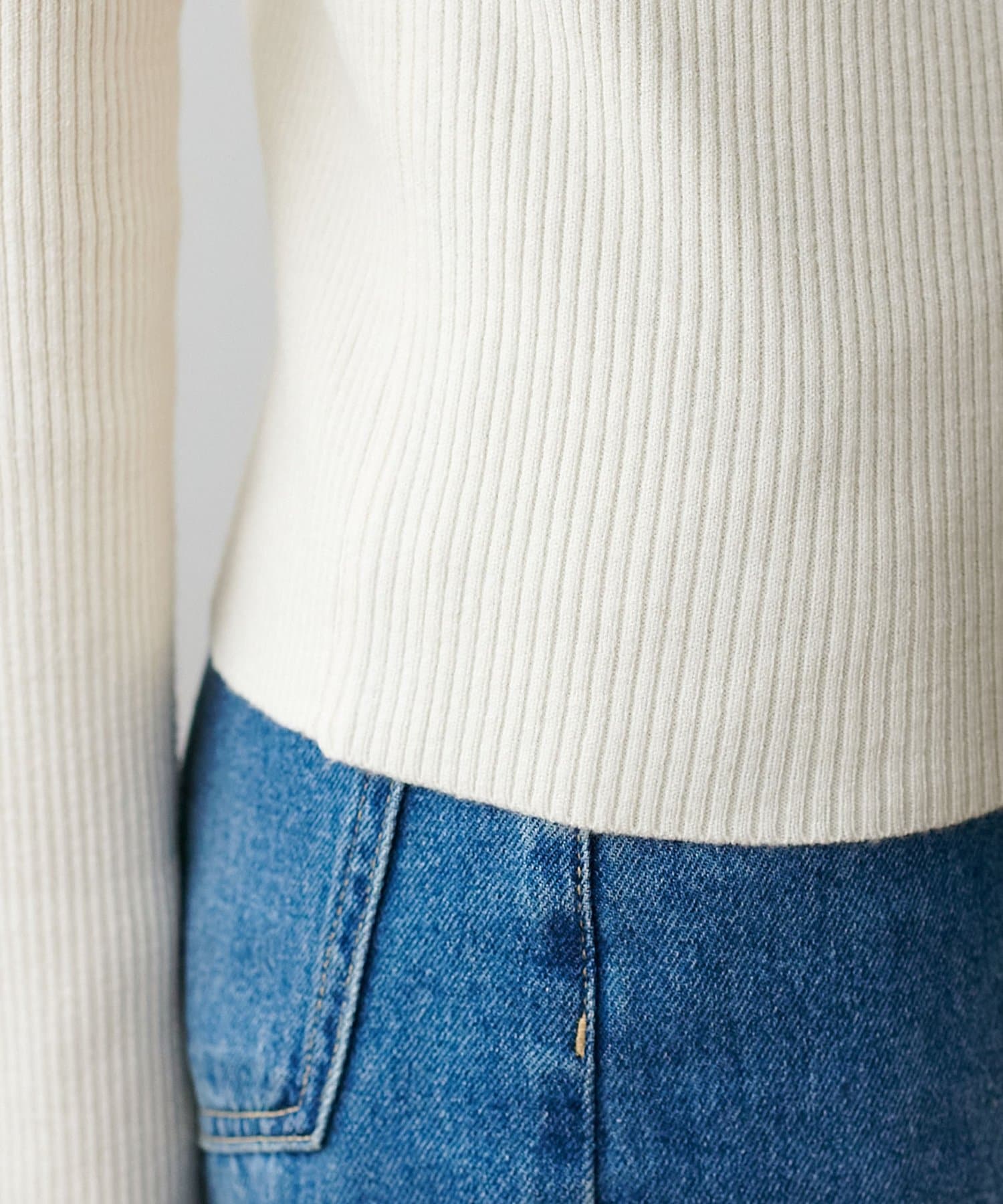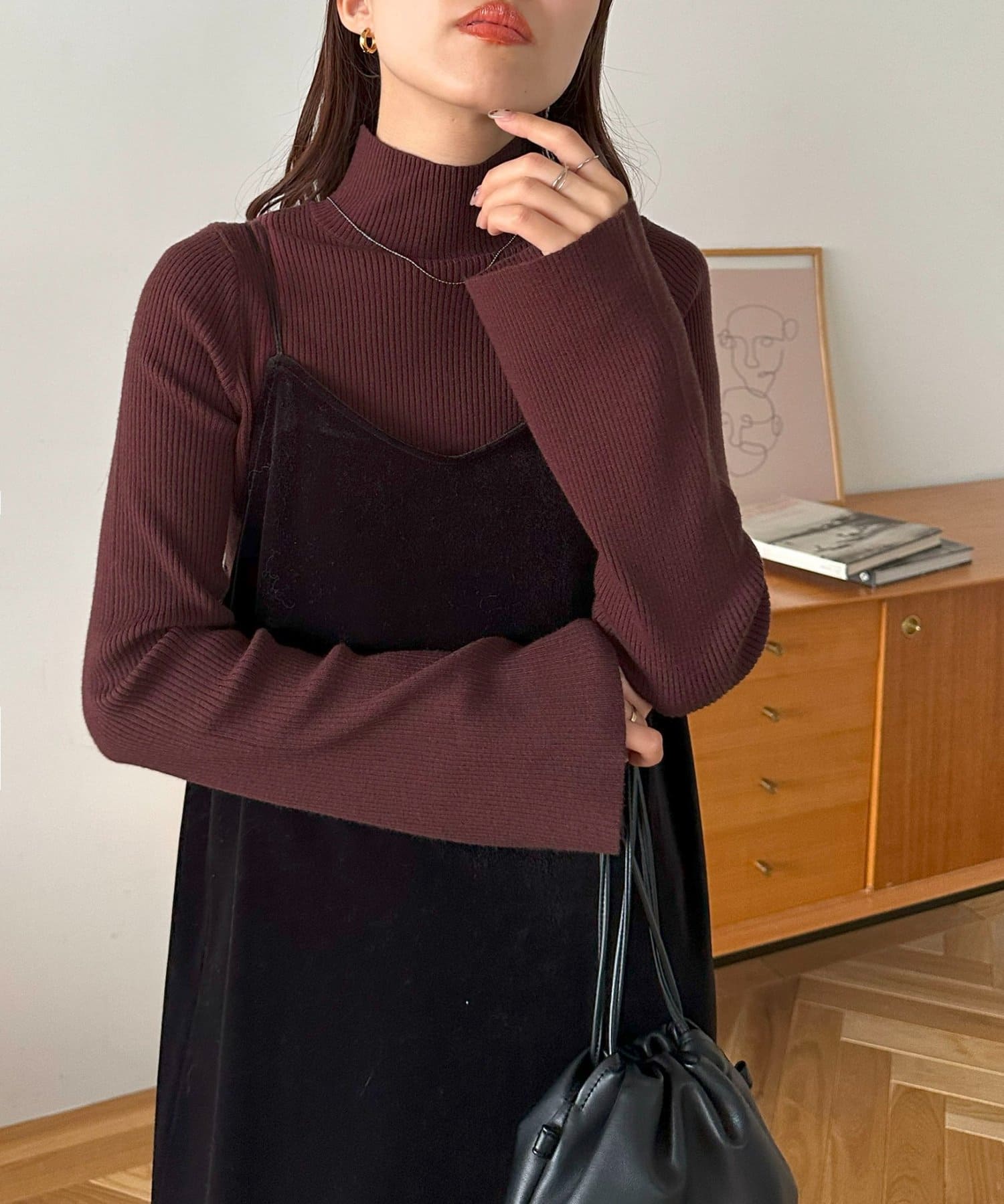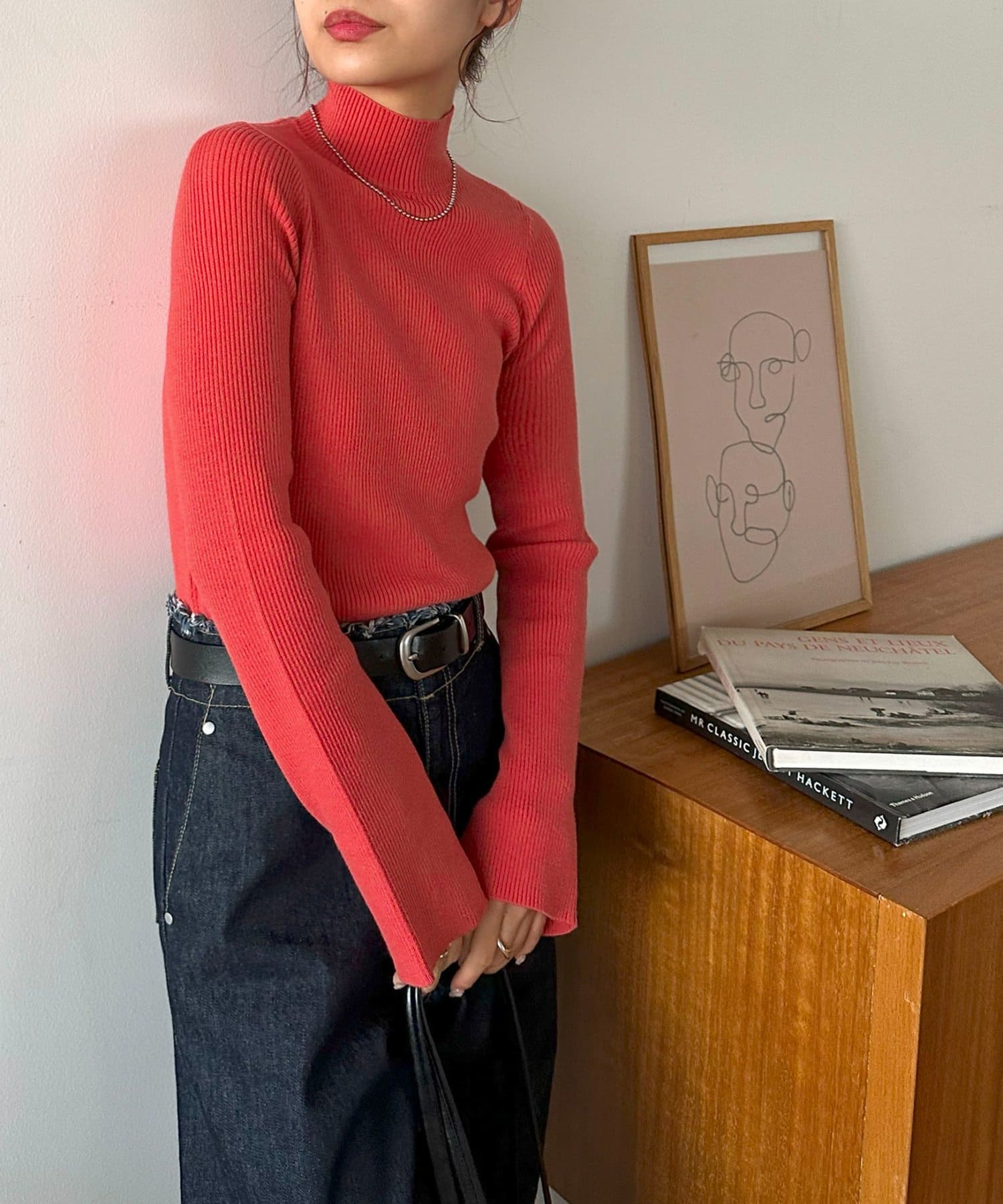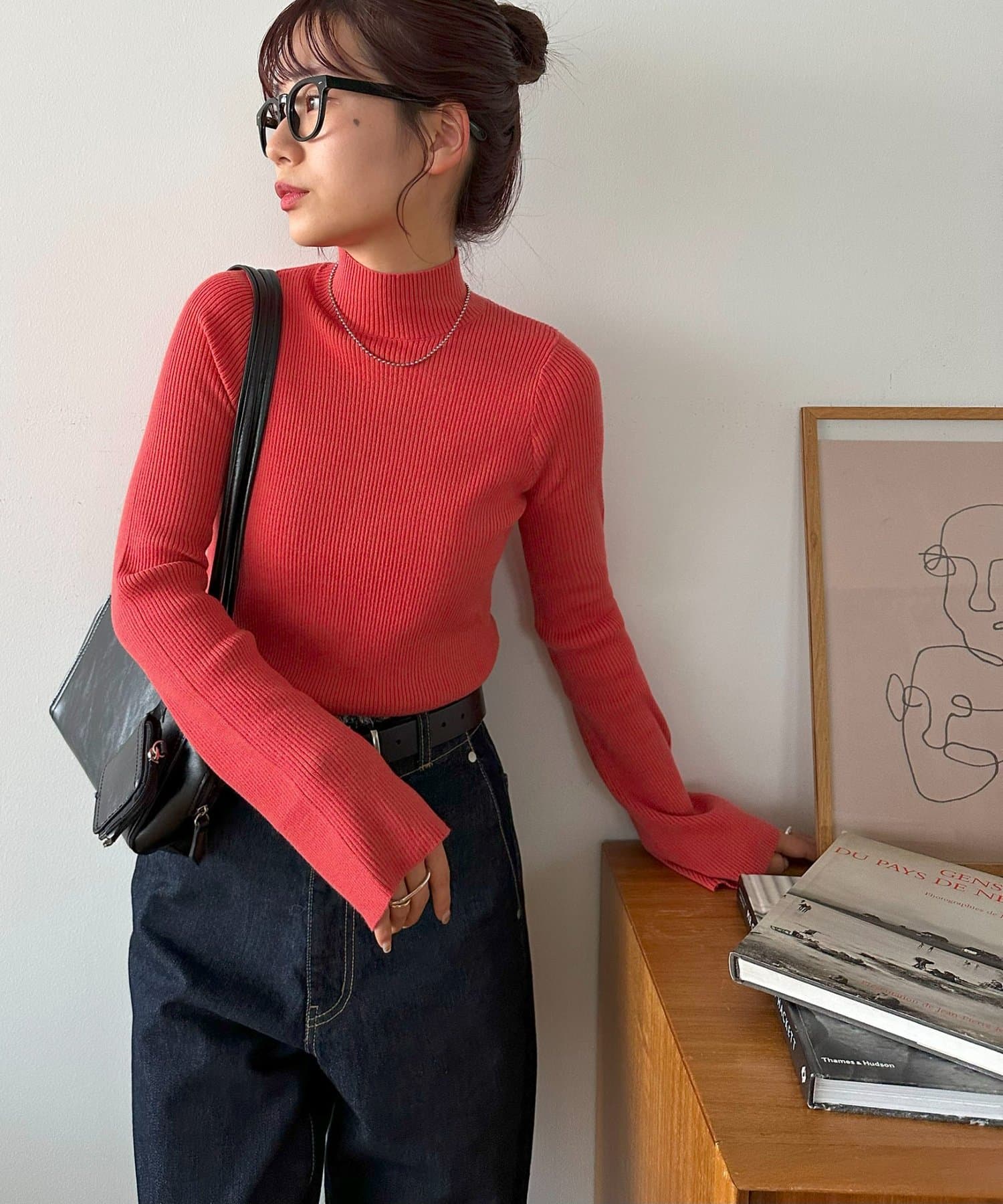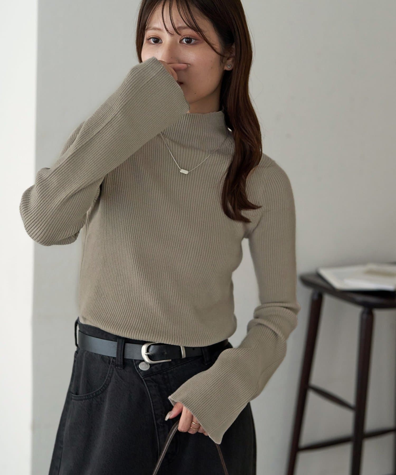 程よく体にフィットするリブ素材で、女性らしいシルエットを引き立てるハイネックニット。