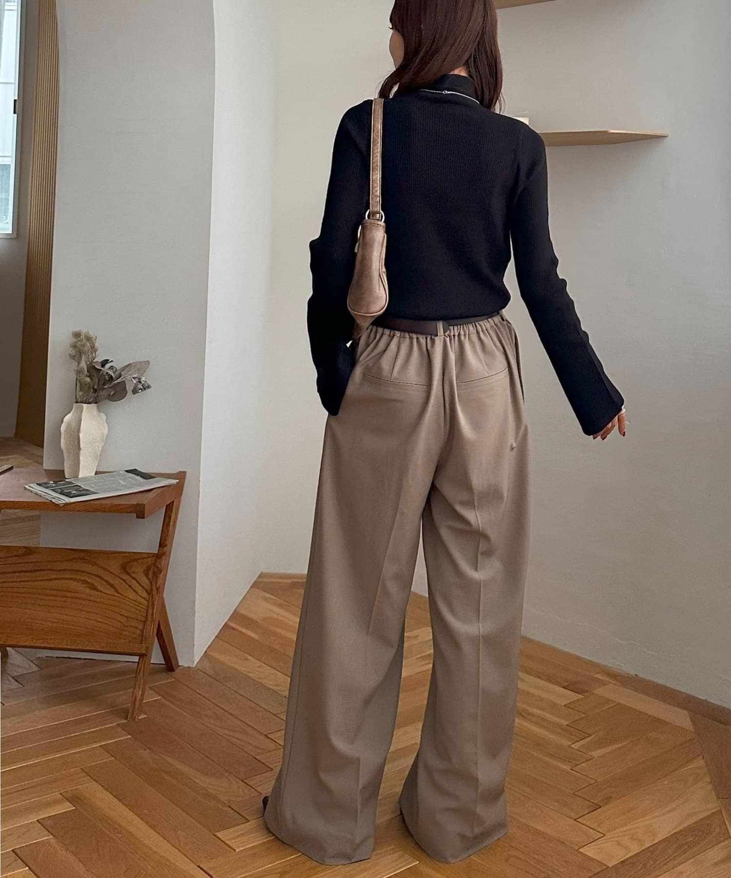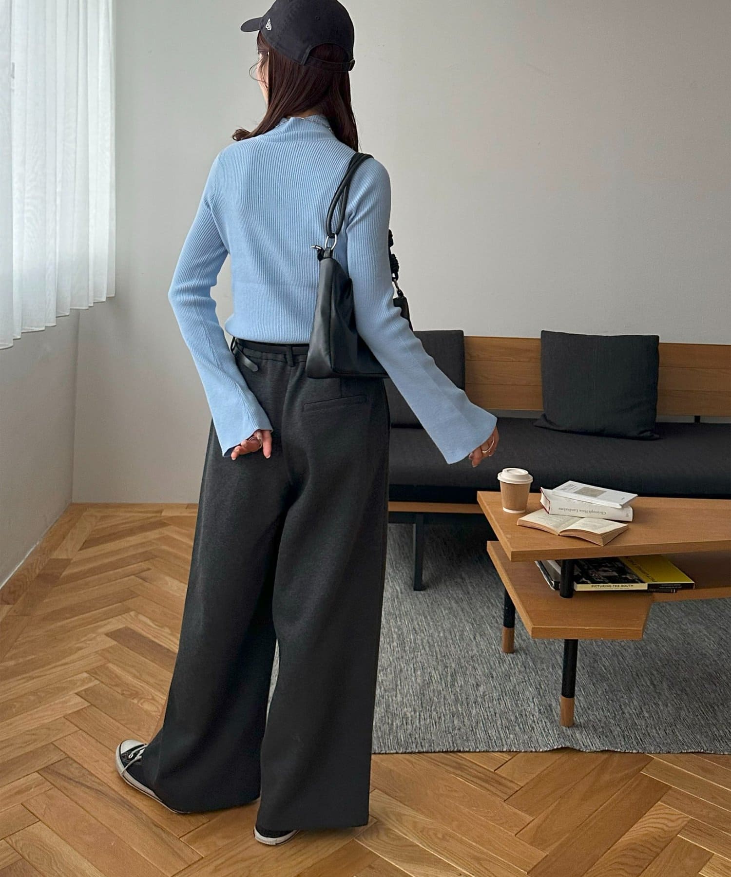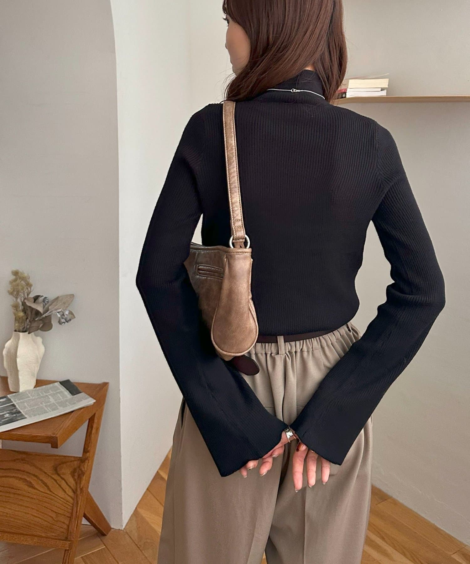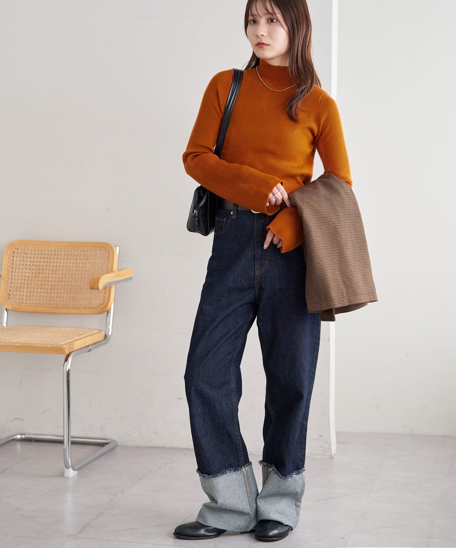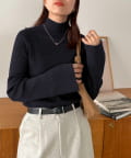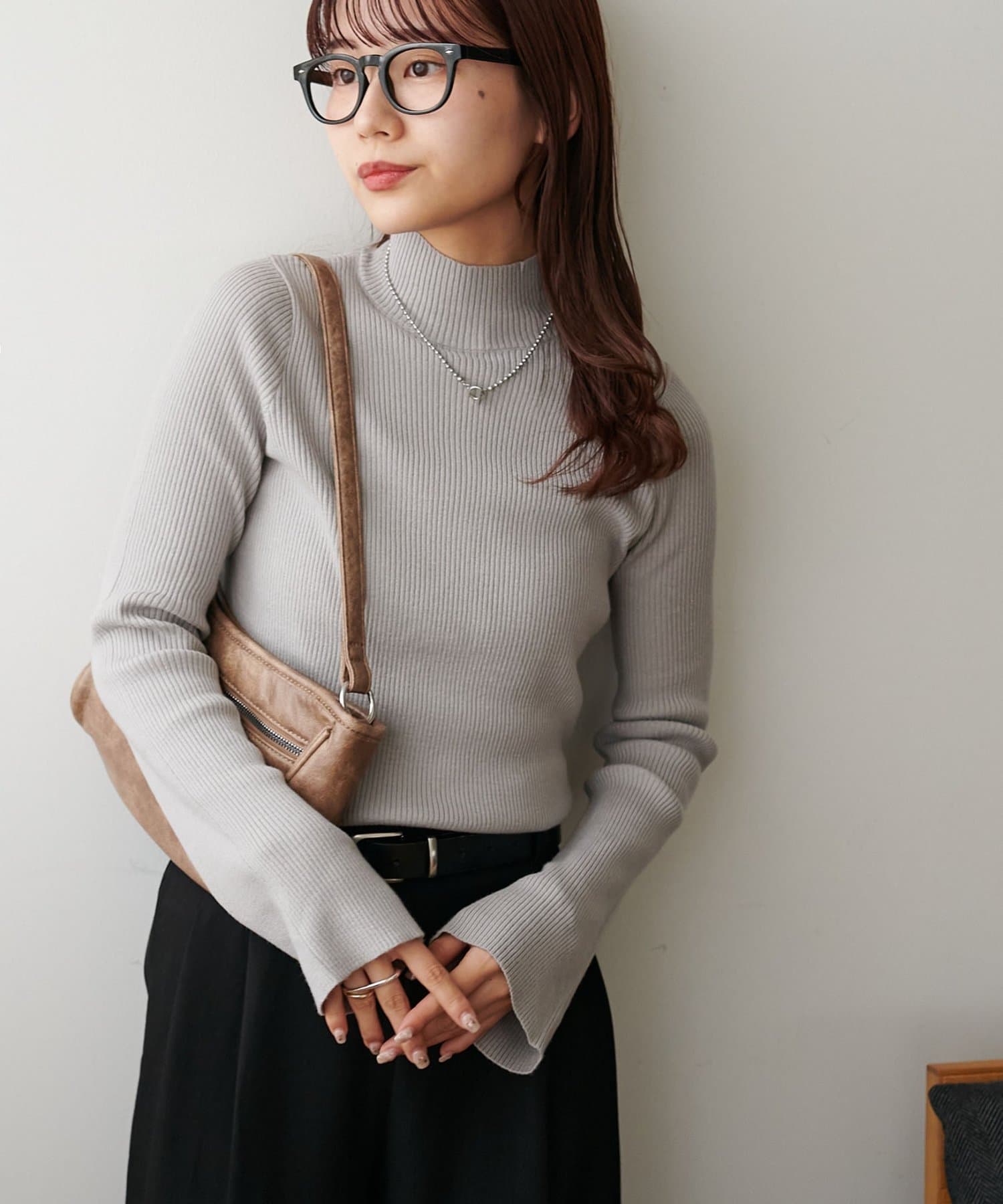 程よく体にフィットするリブ素材で、女性らしいシルエットを引き立てるハイネックニット。