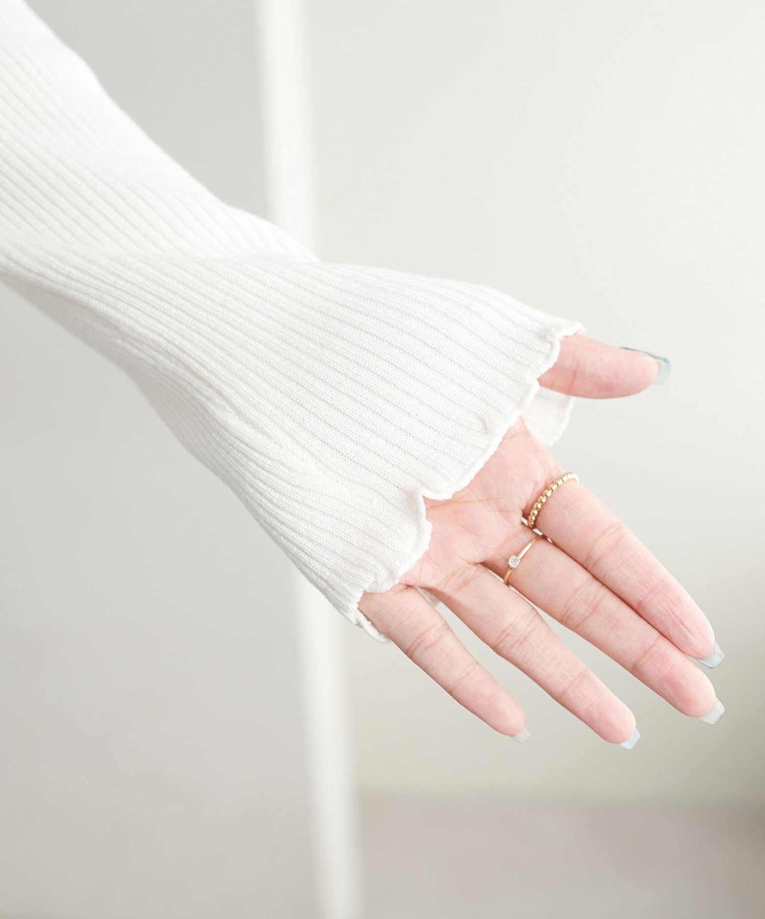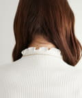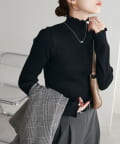 メロー仕立ての襟元と袖口がポイントのリブトップス。