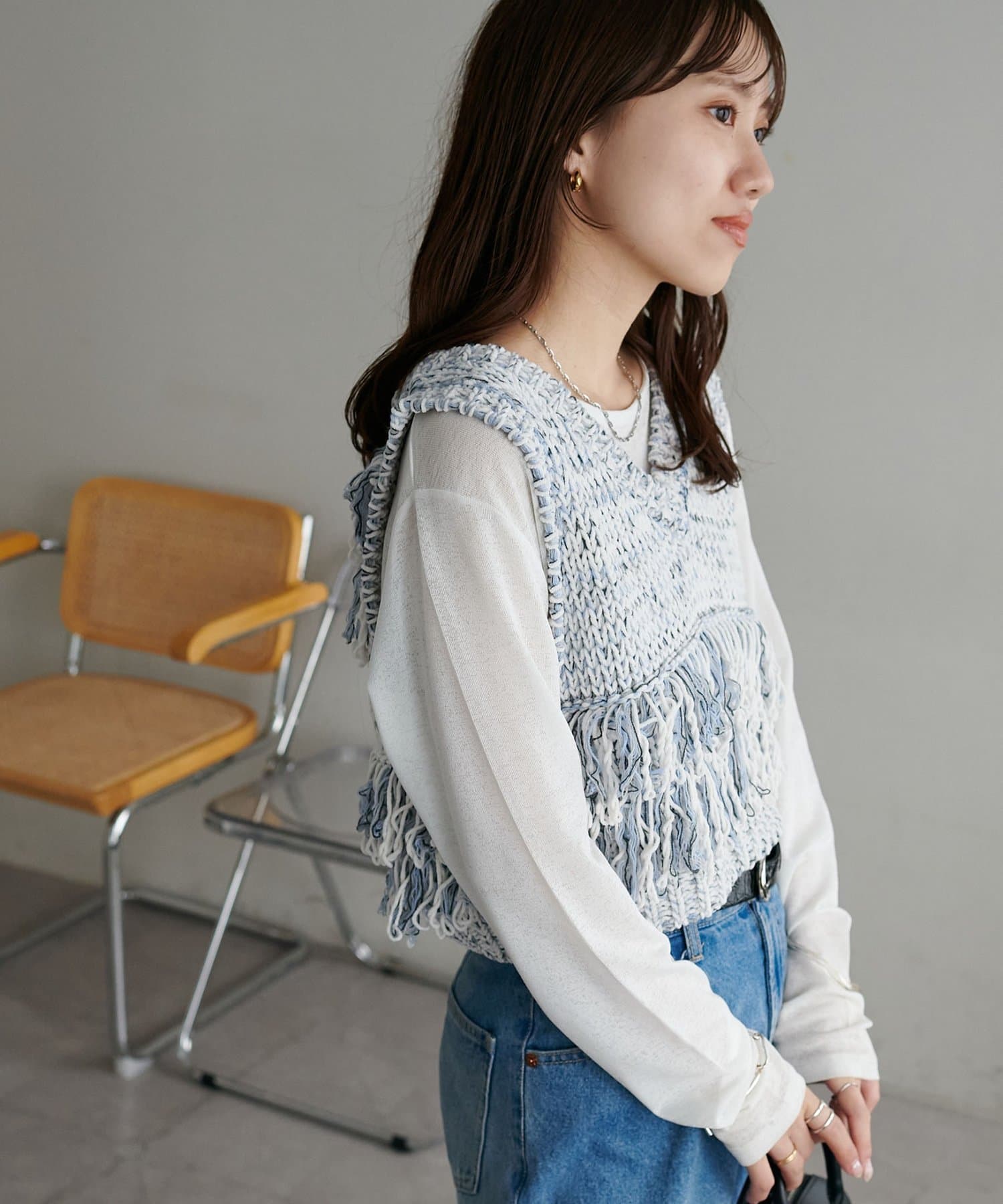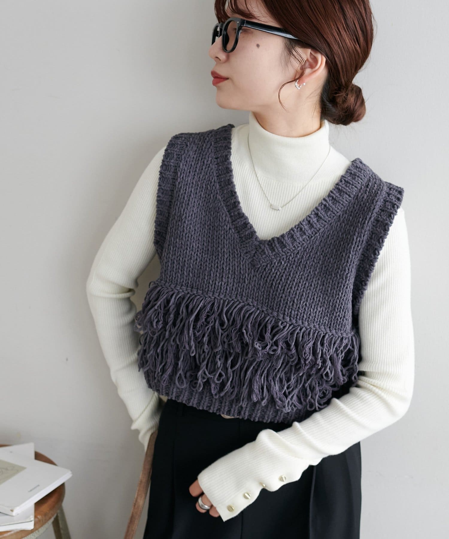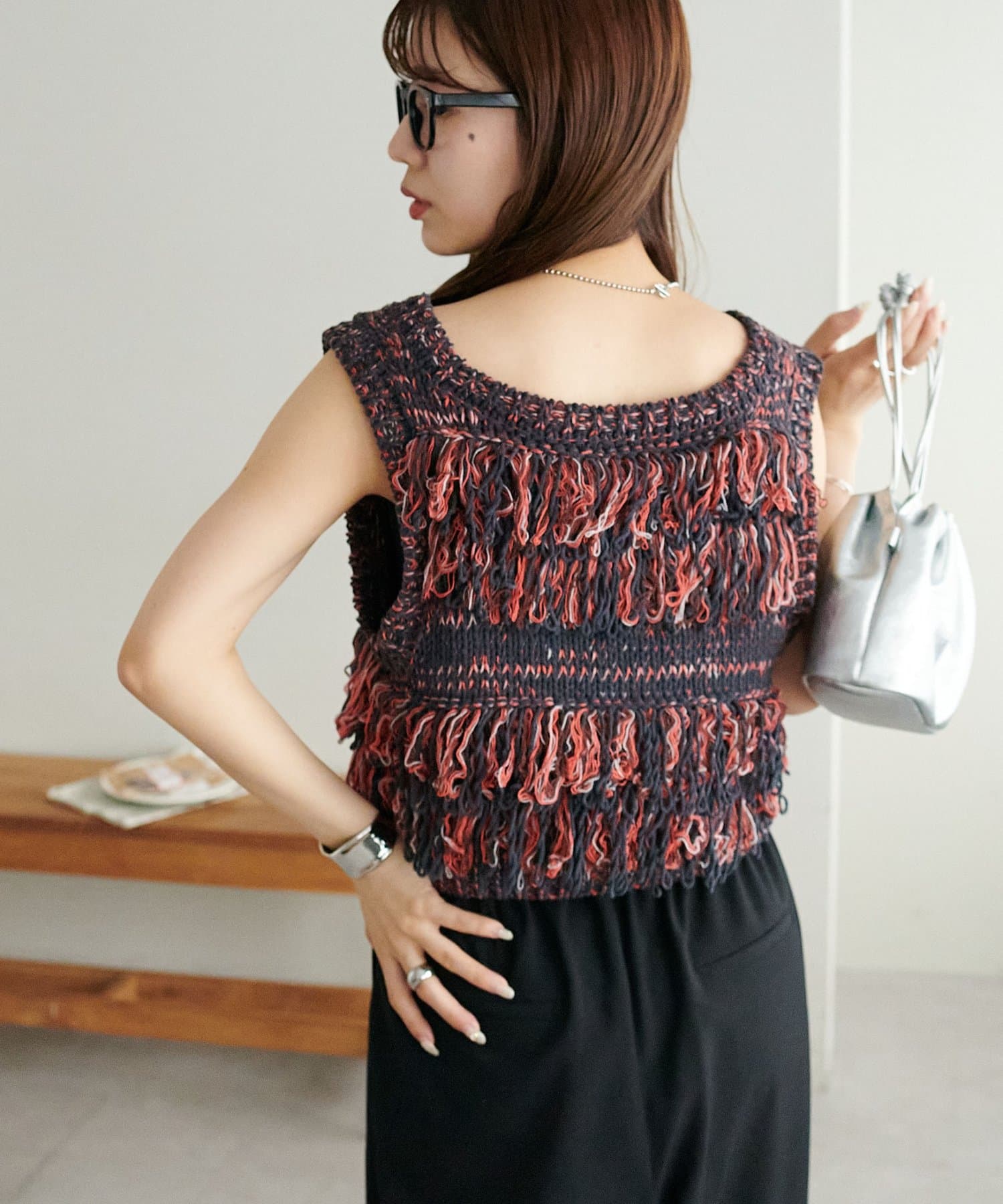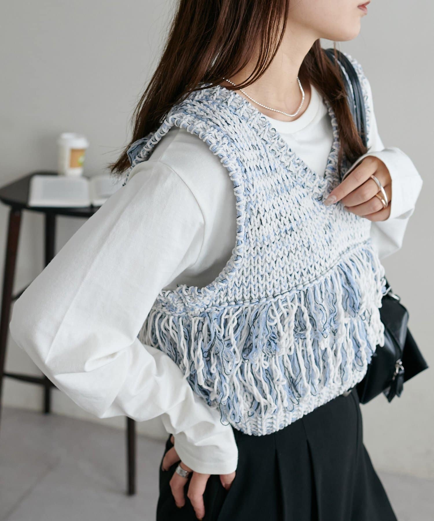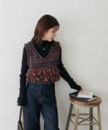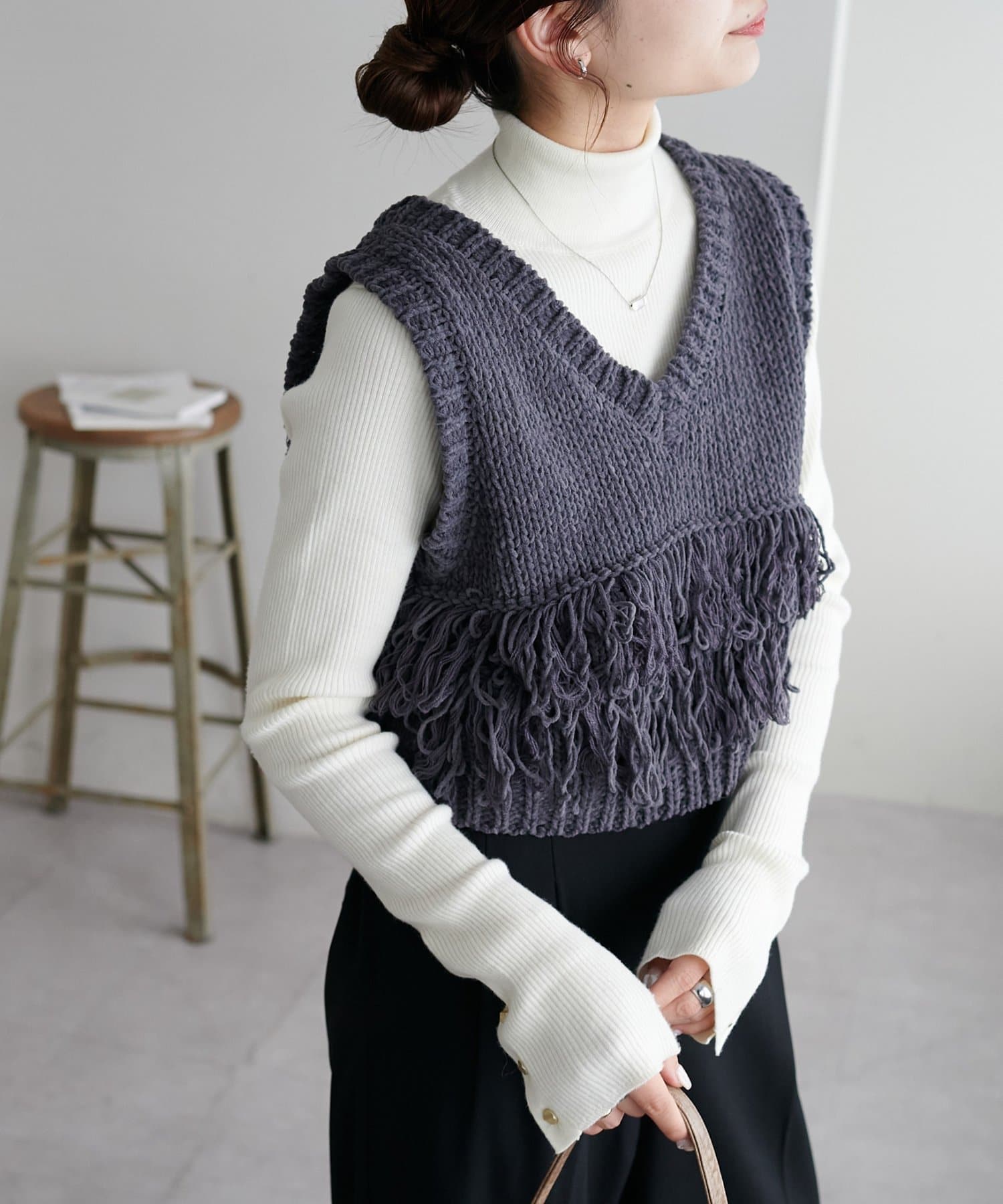 立体感のあるフリンジが目をひくVネックベスト。