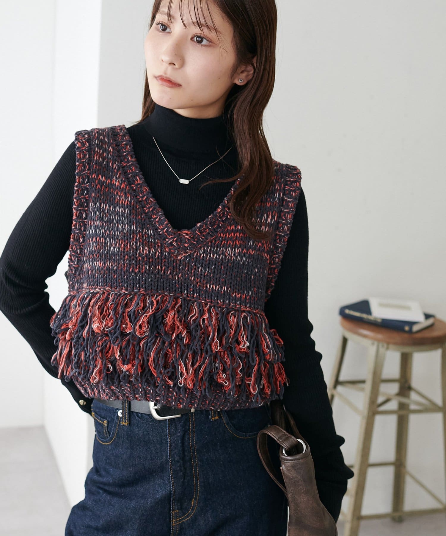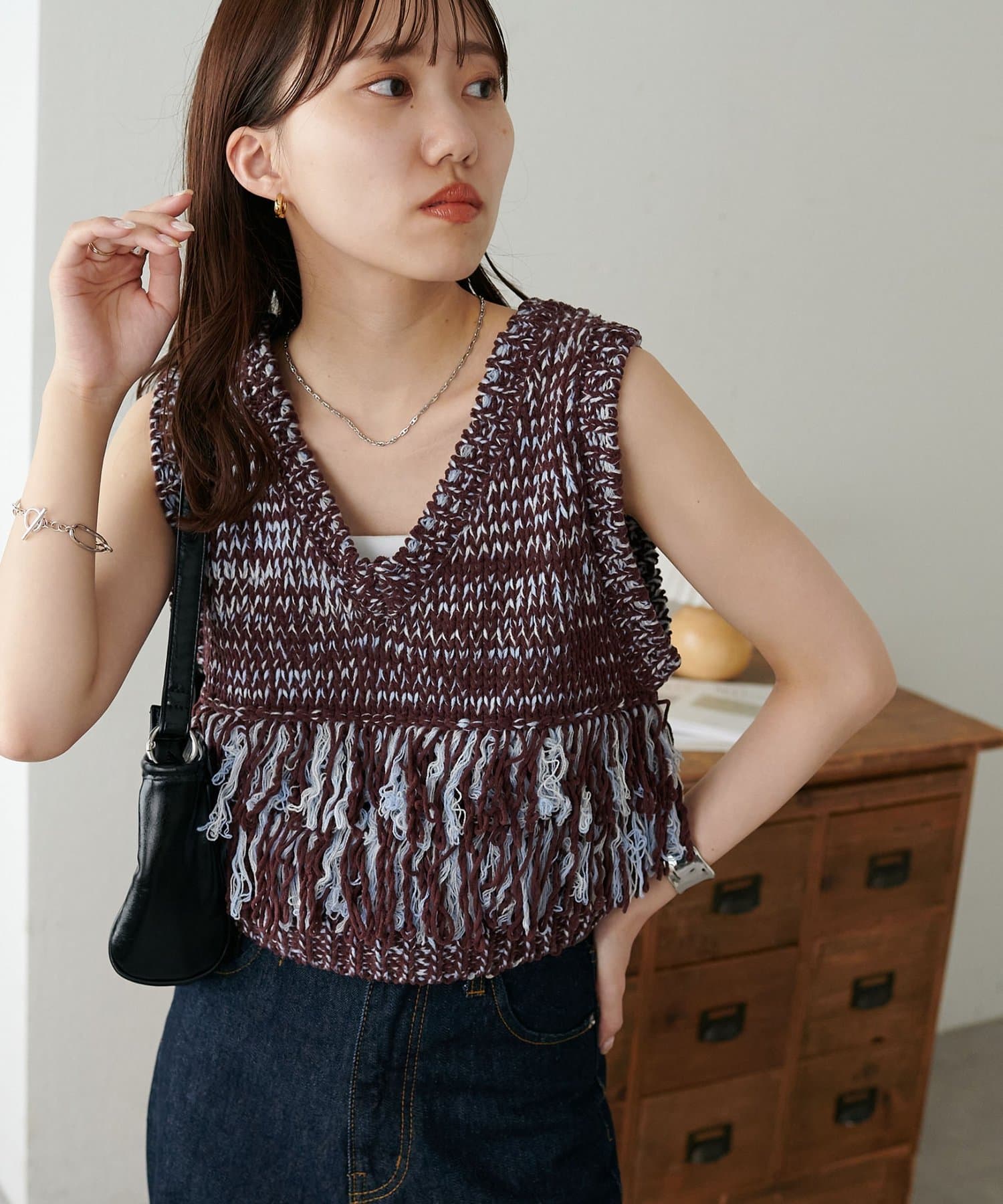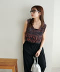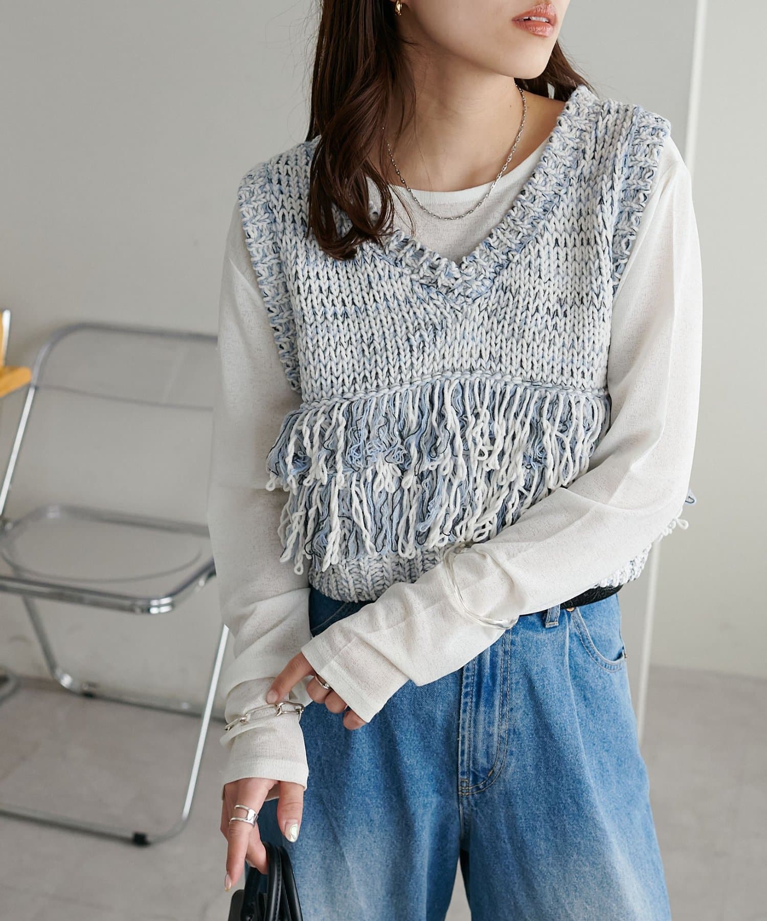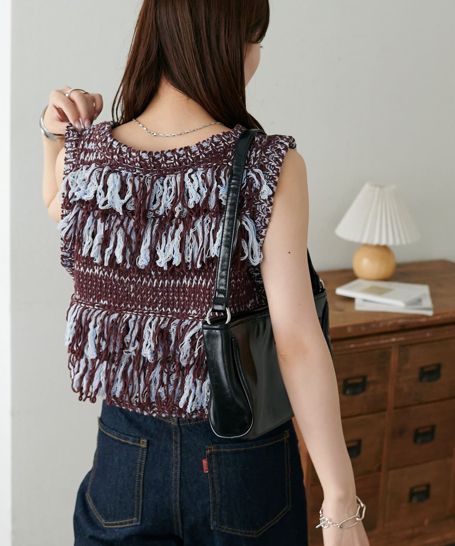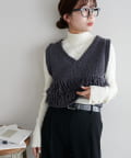 立体感のあるフリンジが目をひくVネックベスト。