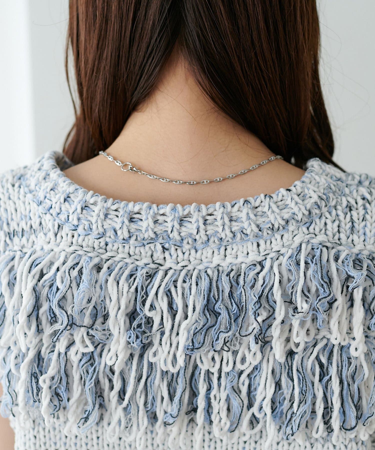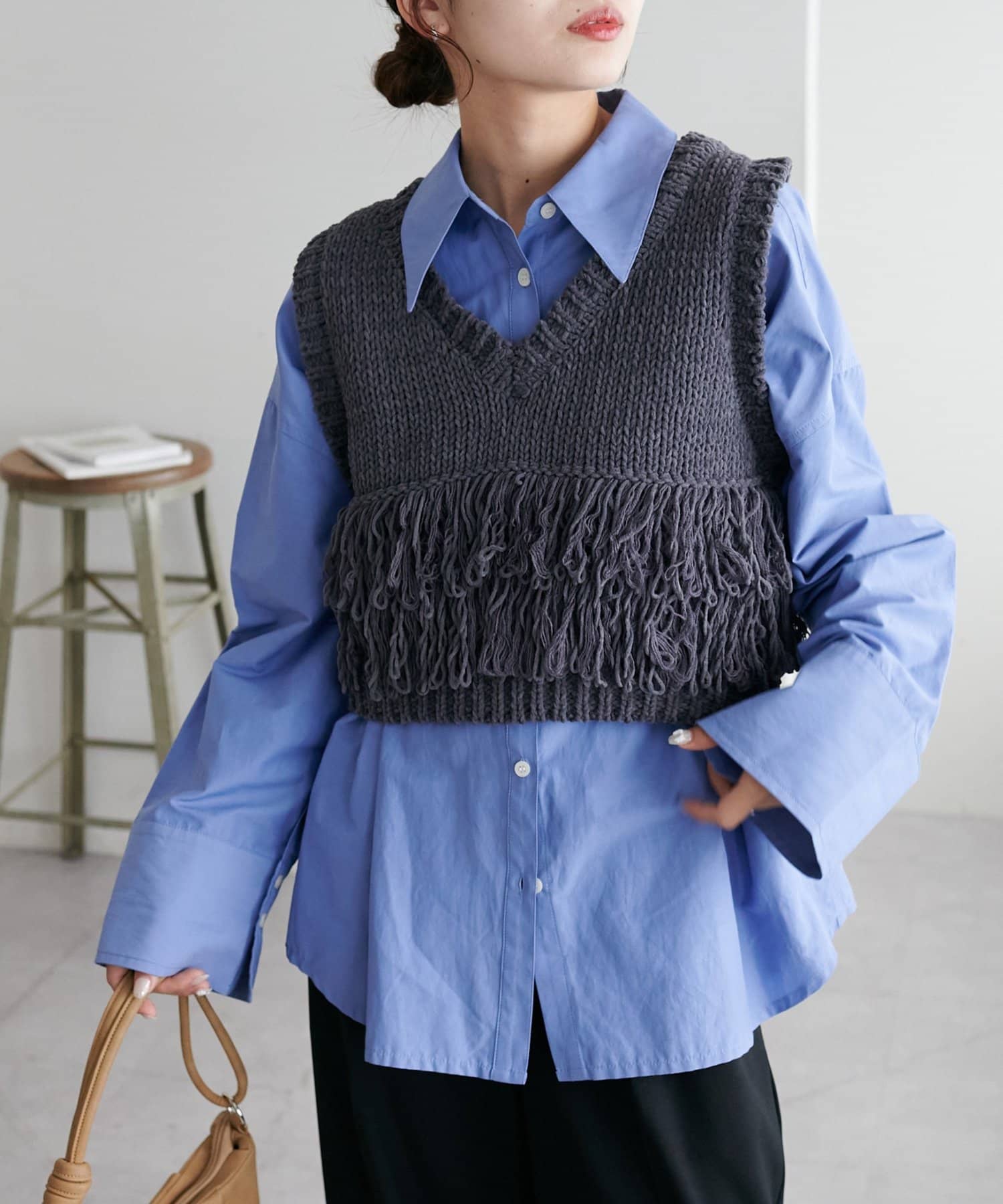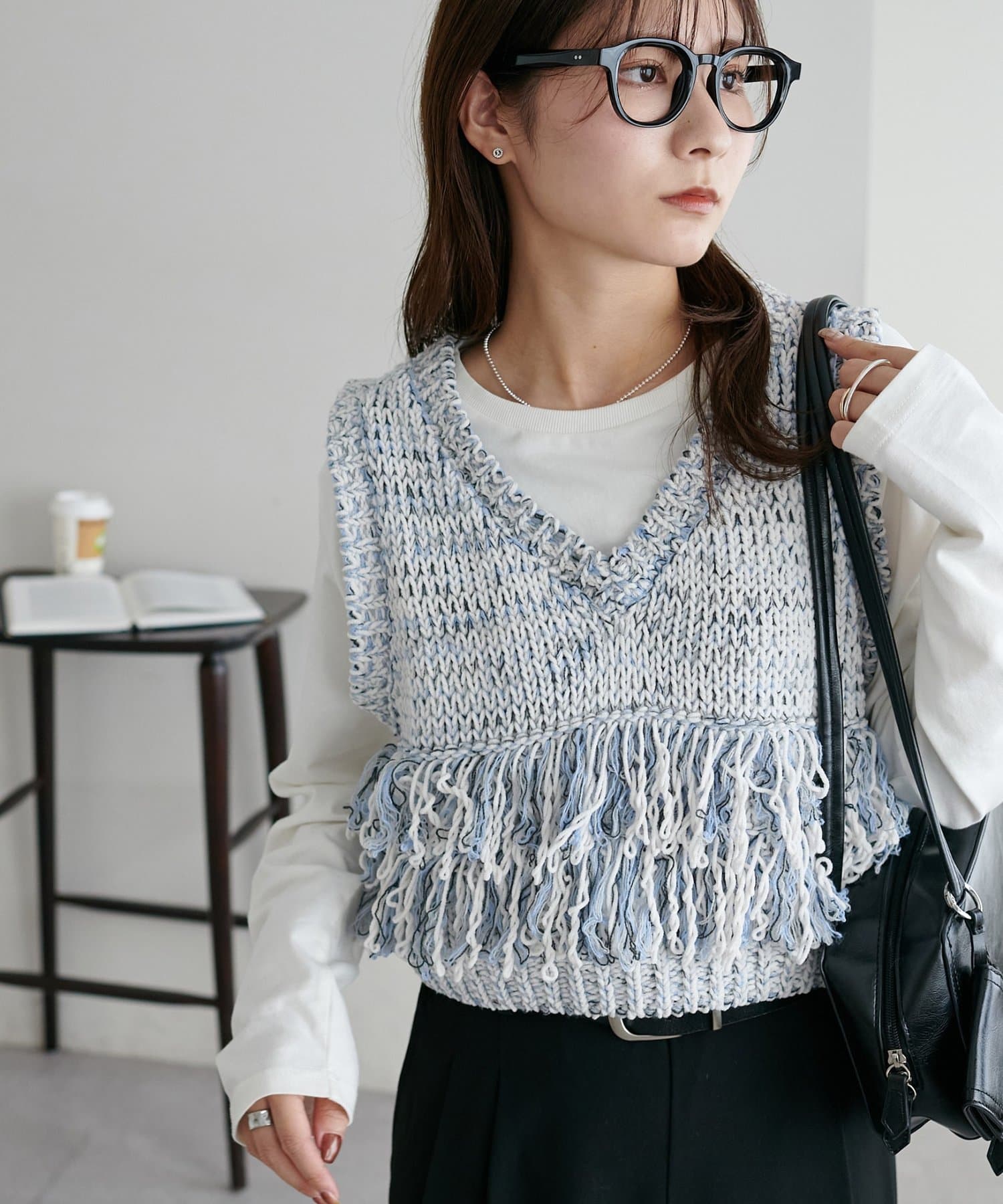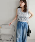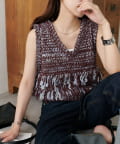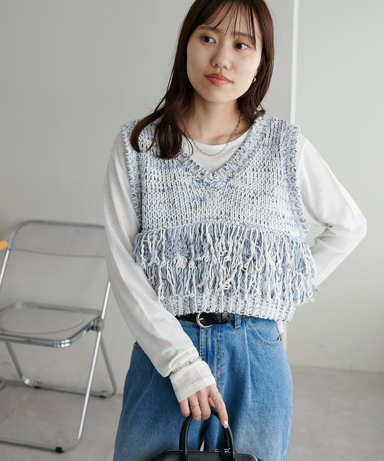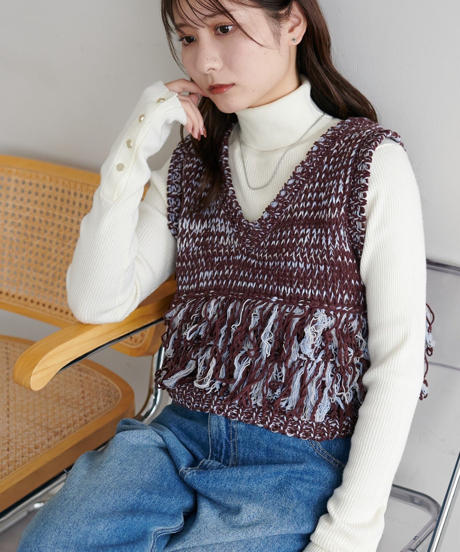 立体感のあるフリンジが目をひくVネックベスト。