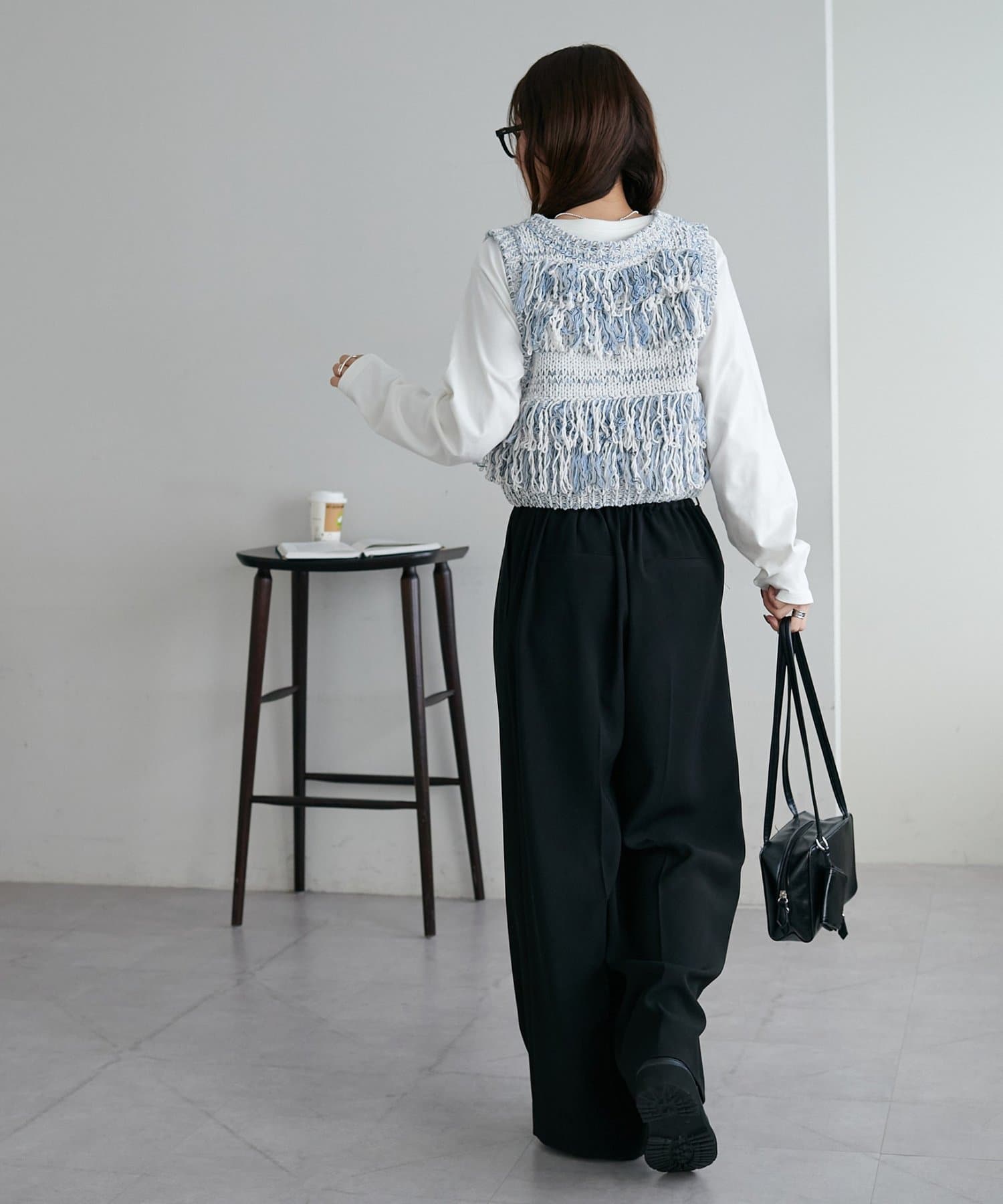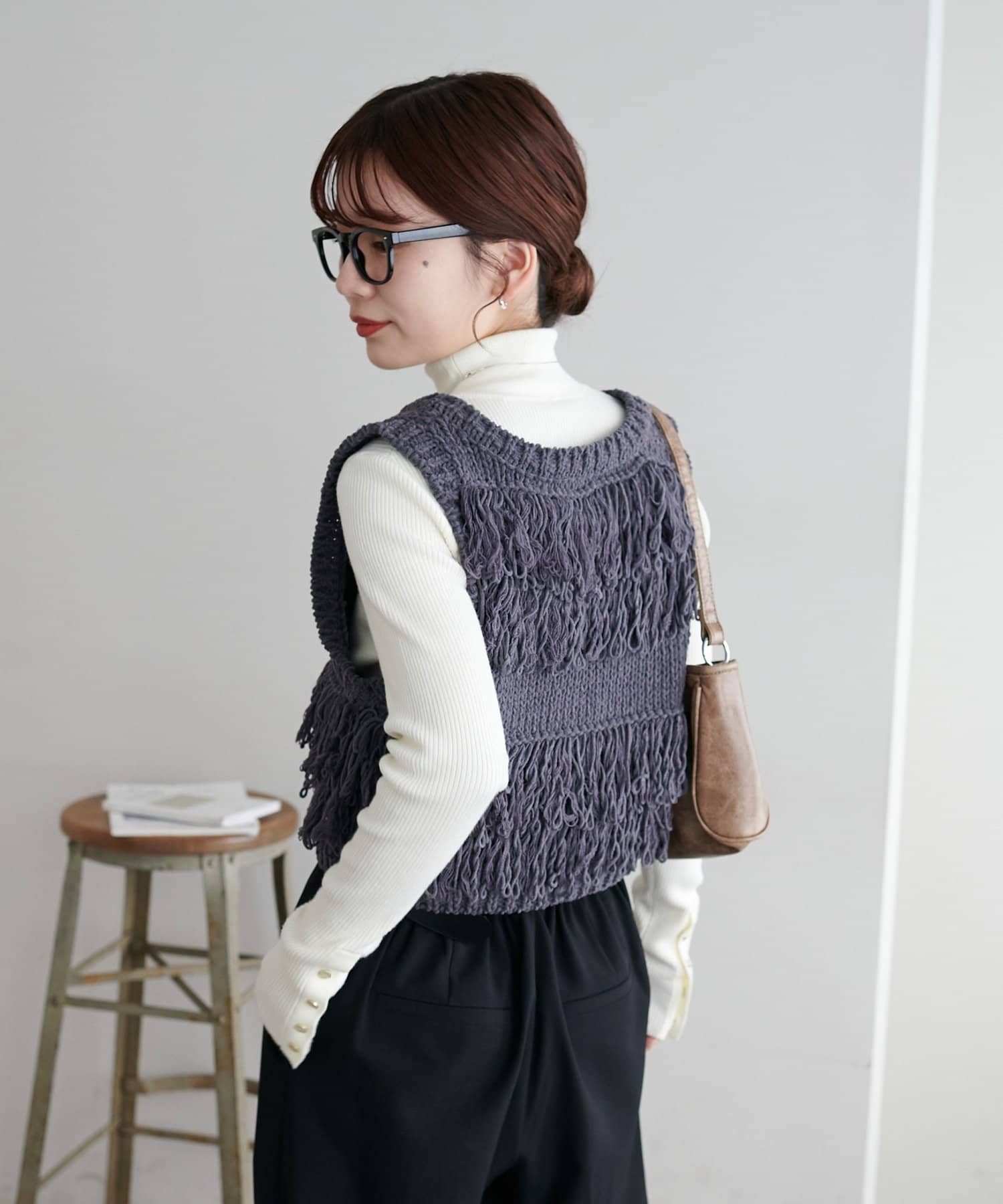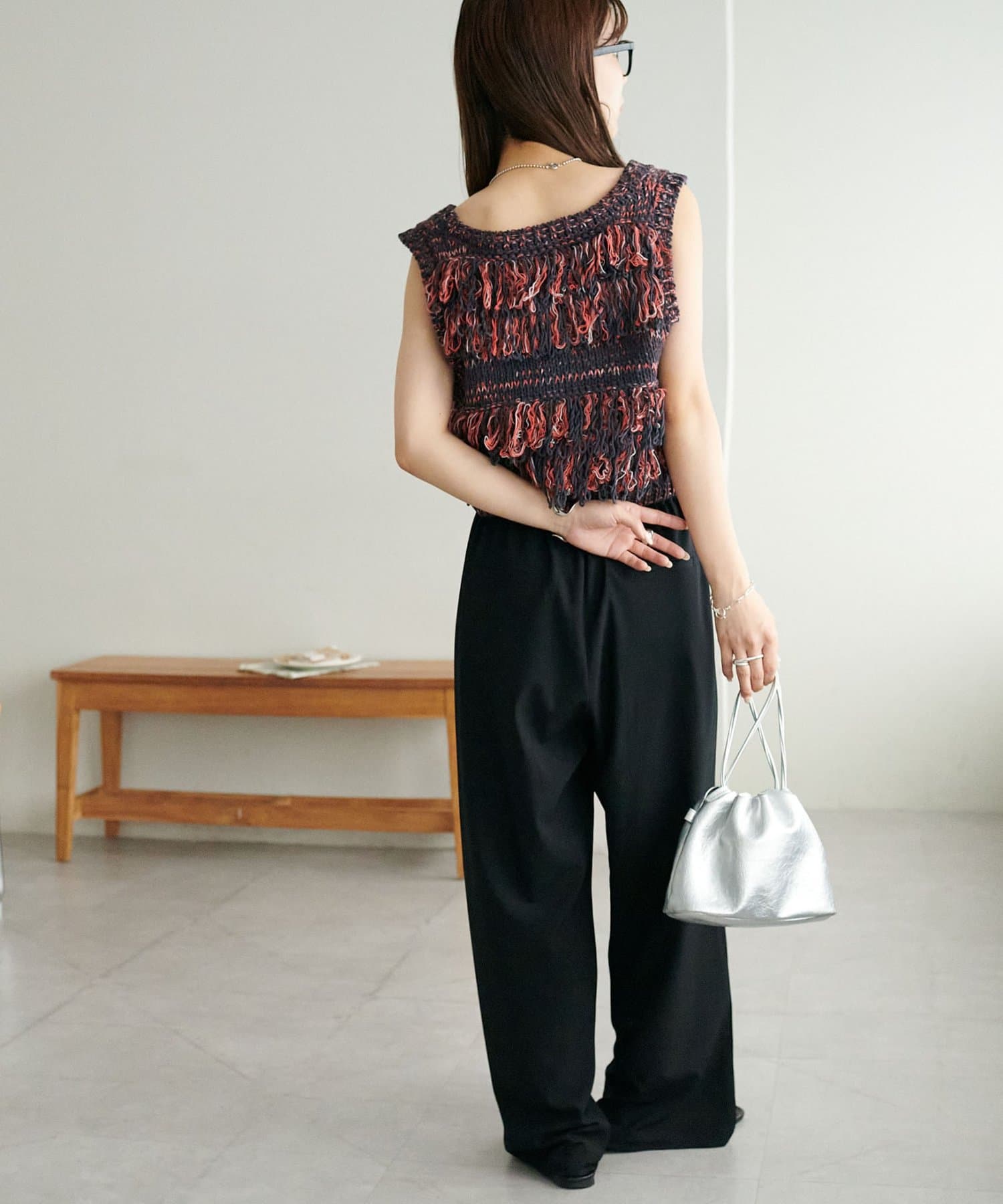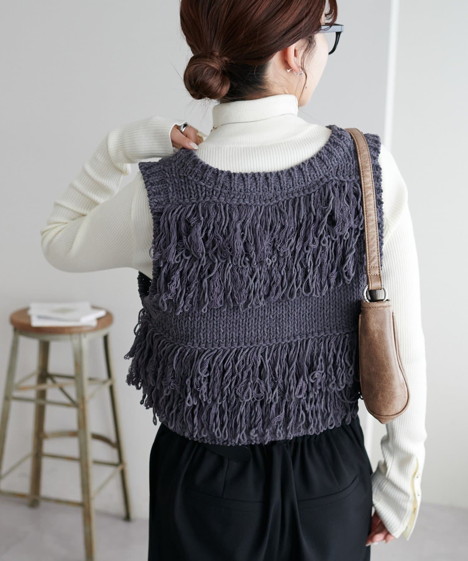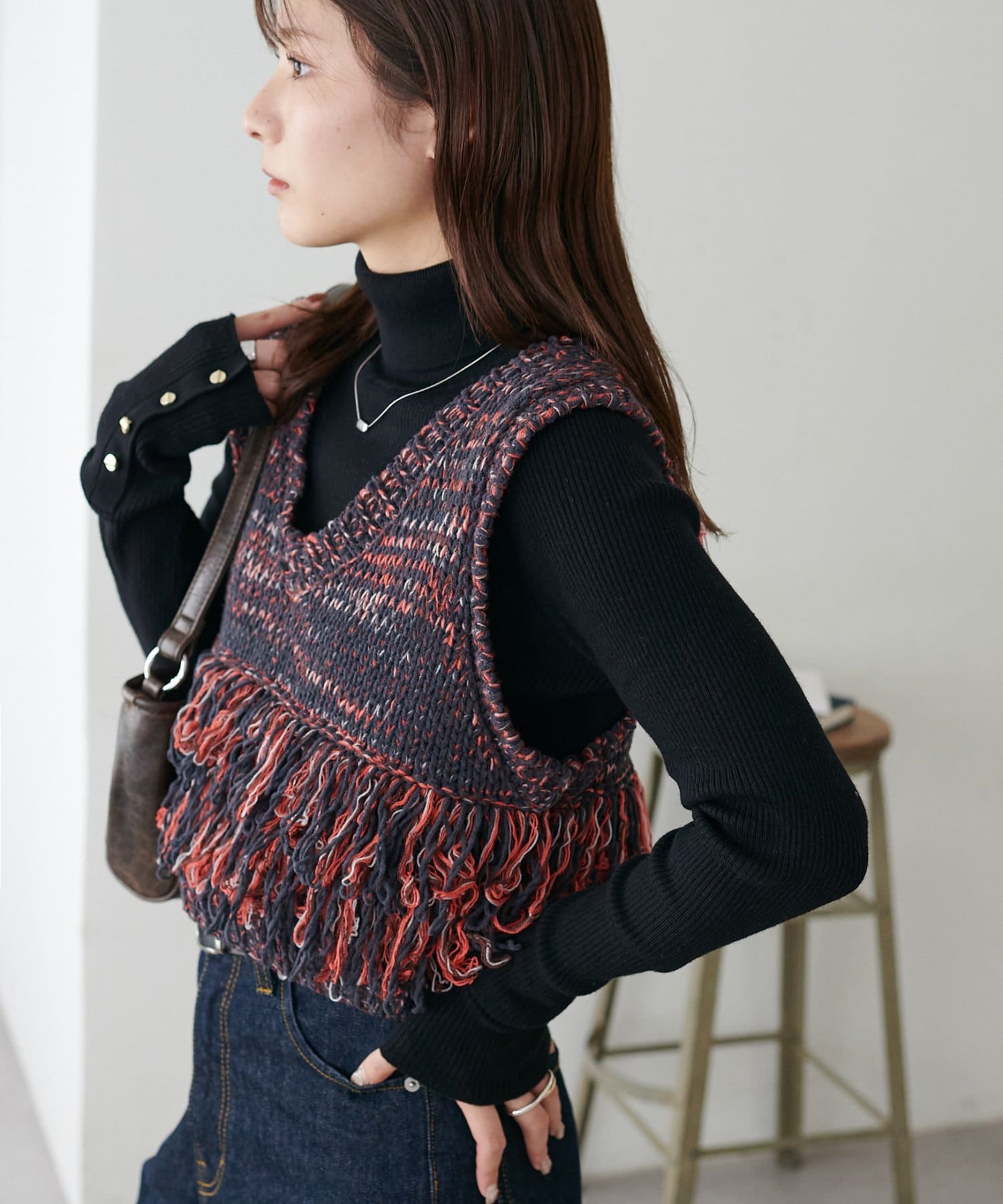 裾のフリンジが揺れて動きが出るので、シンプルなコーデも華やかに仕上がるのが◎