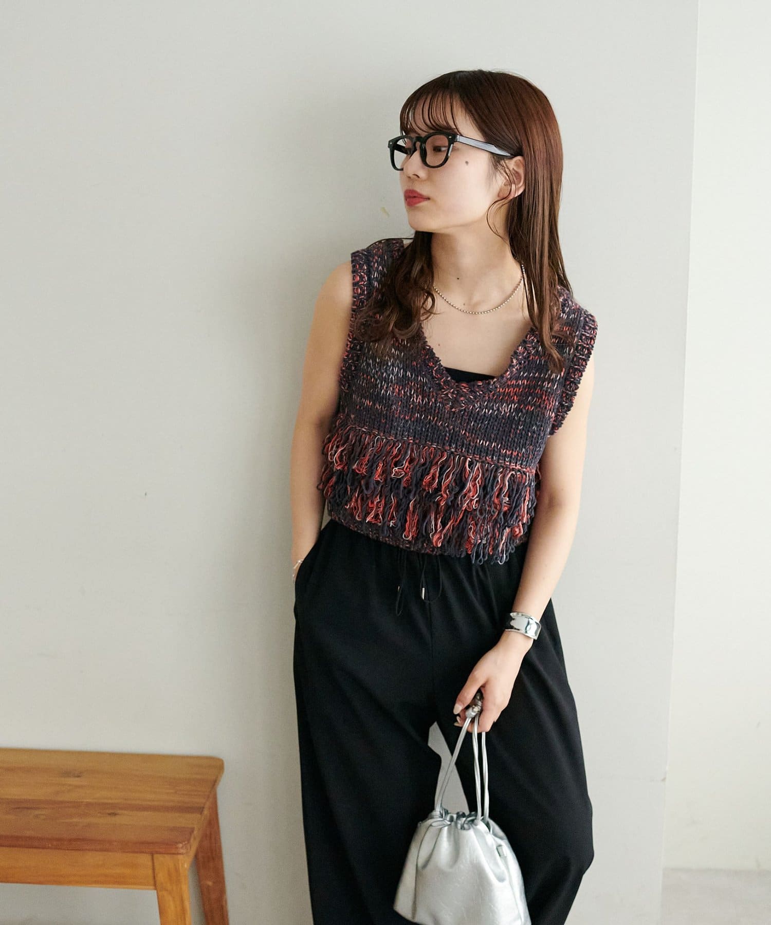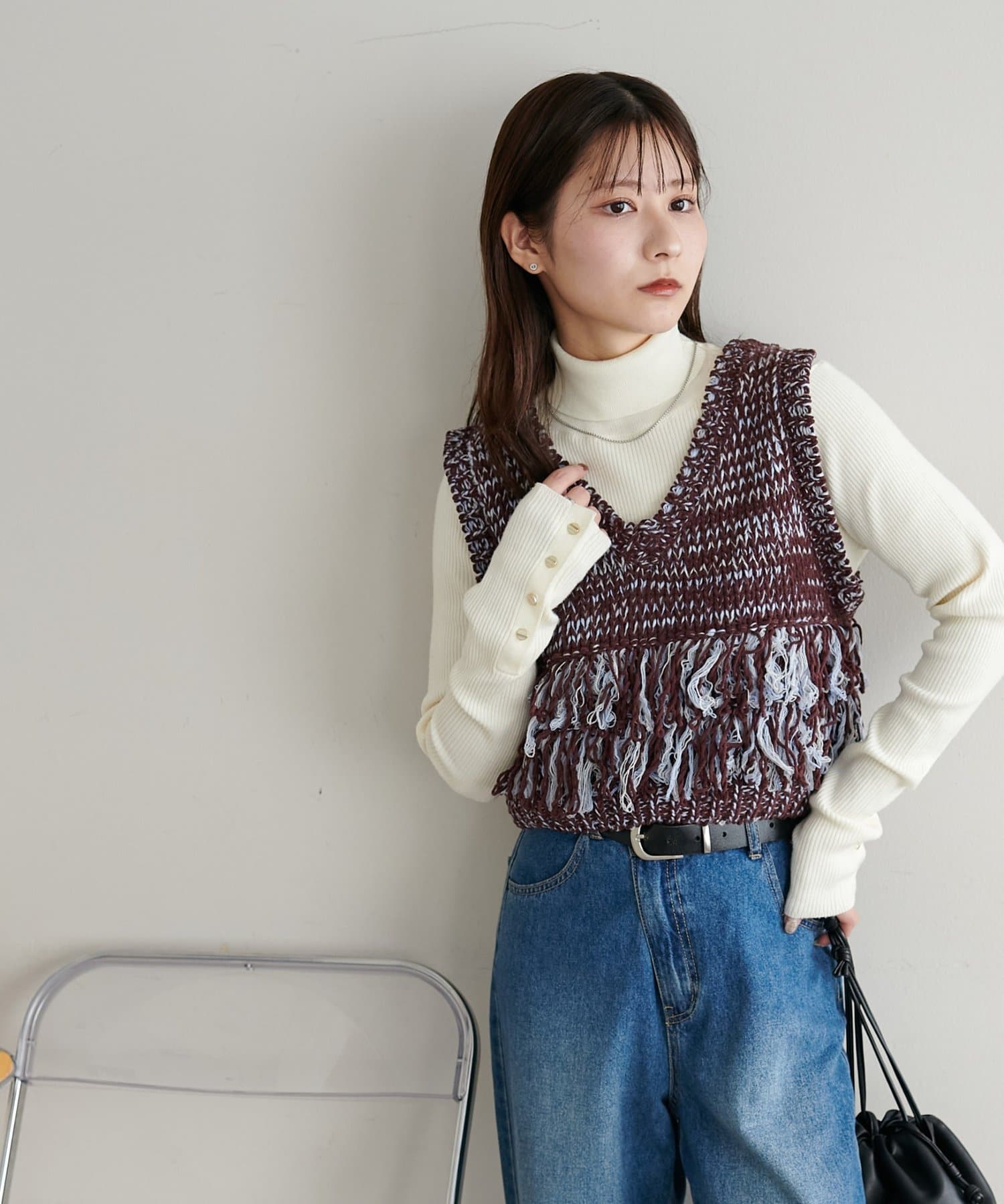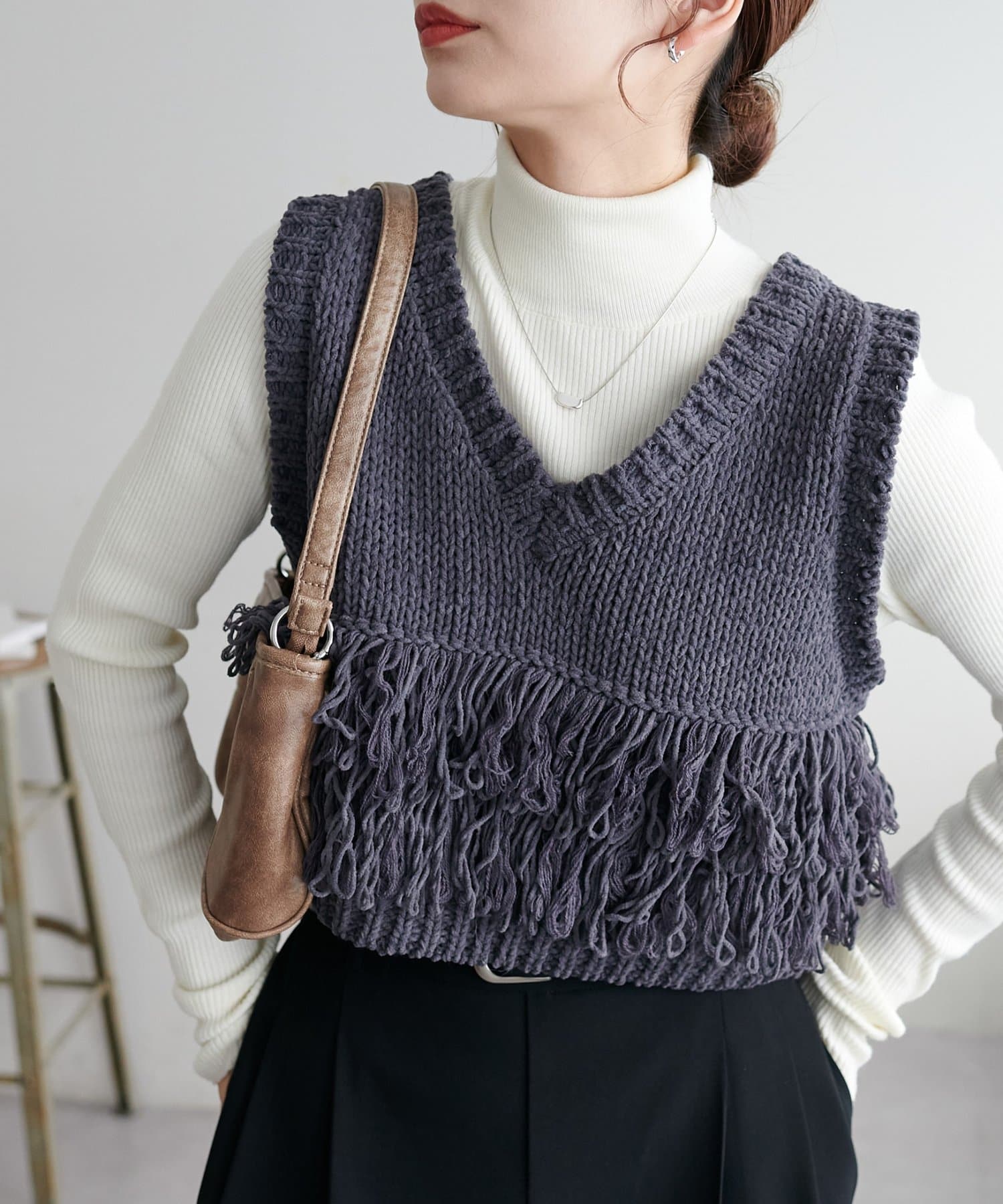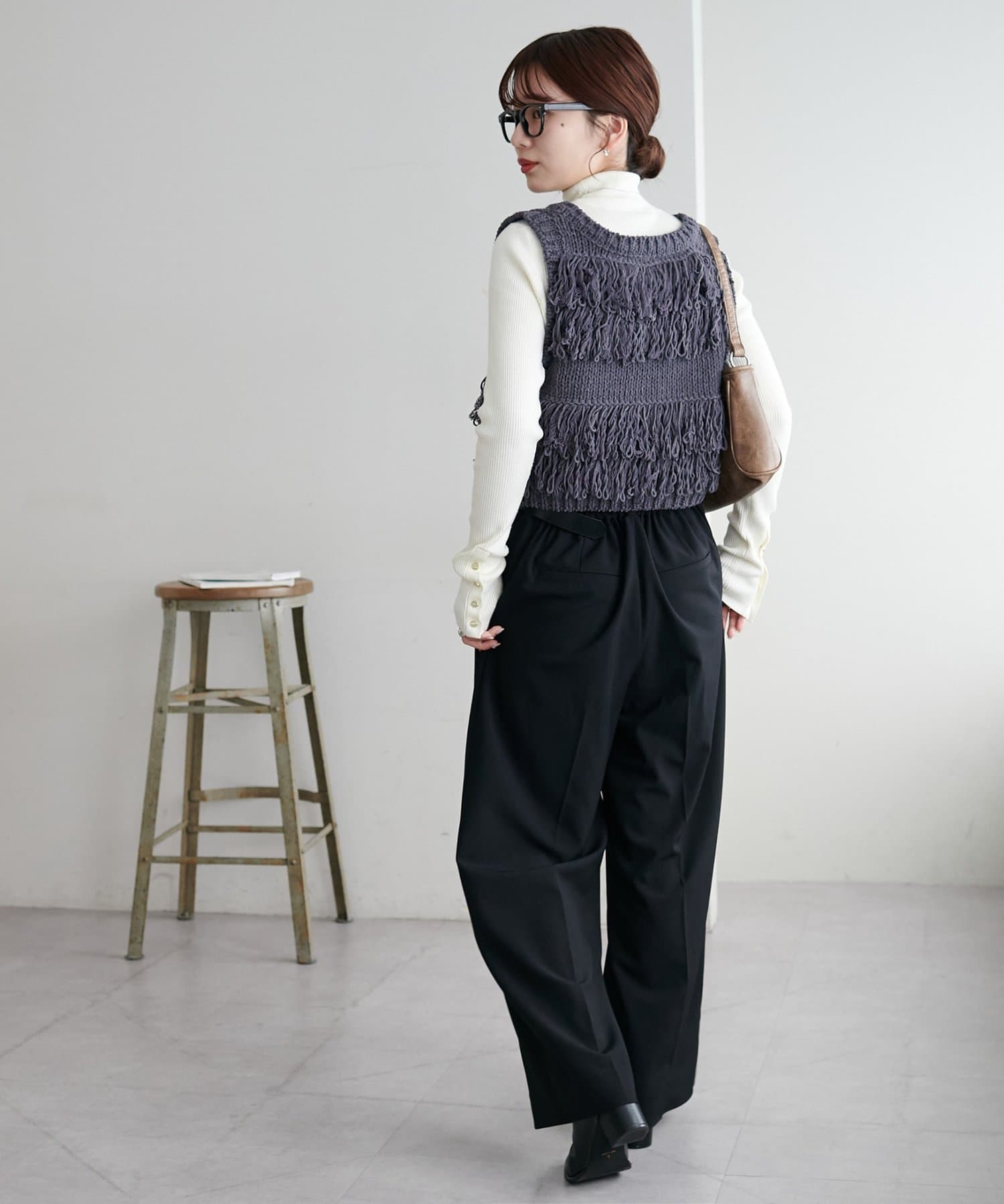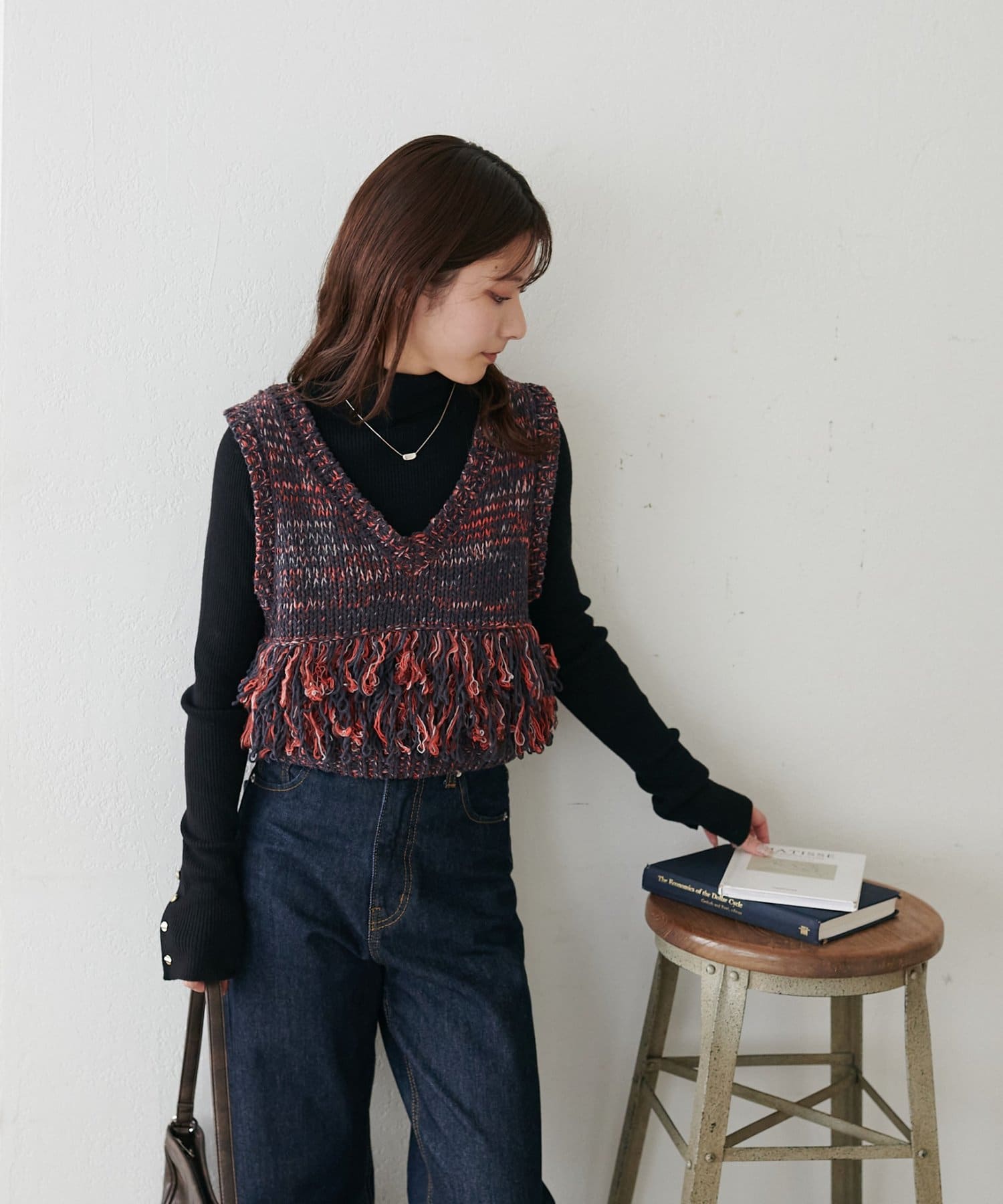 裾のフリンジが揺れて動きが出るので、シンプルなコーデも華やかに仕上がるのが◎