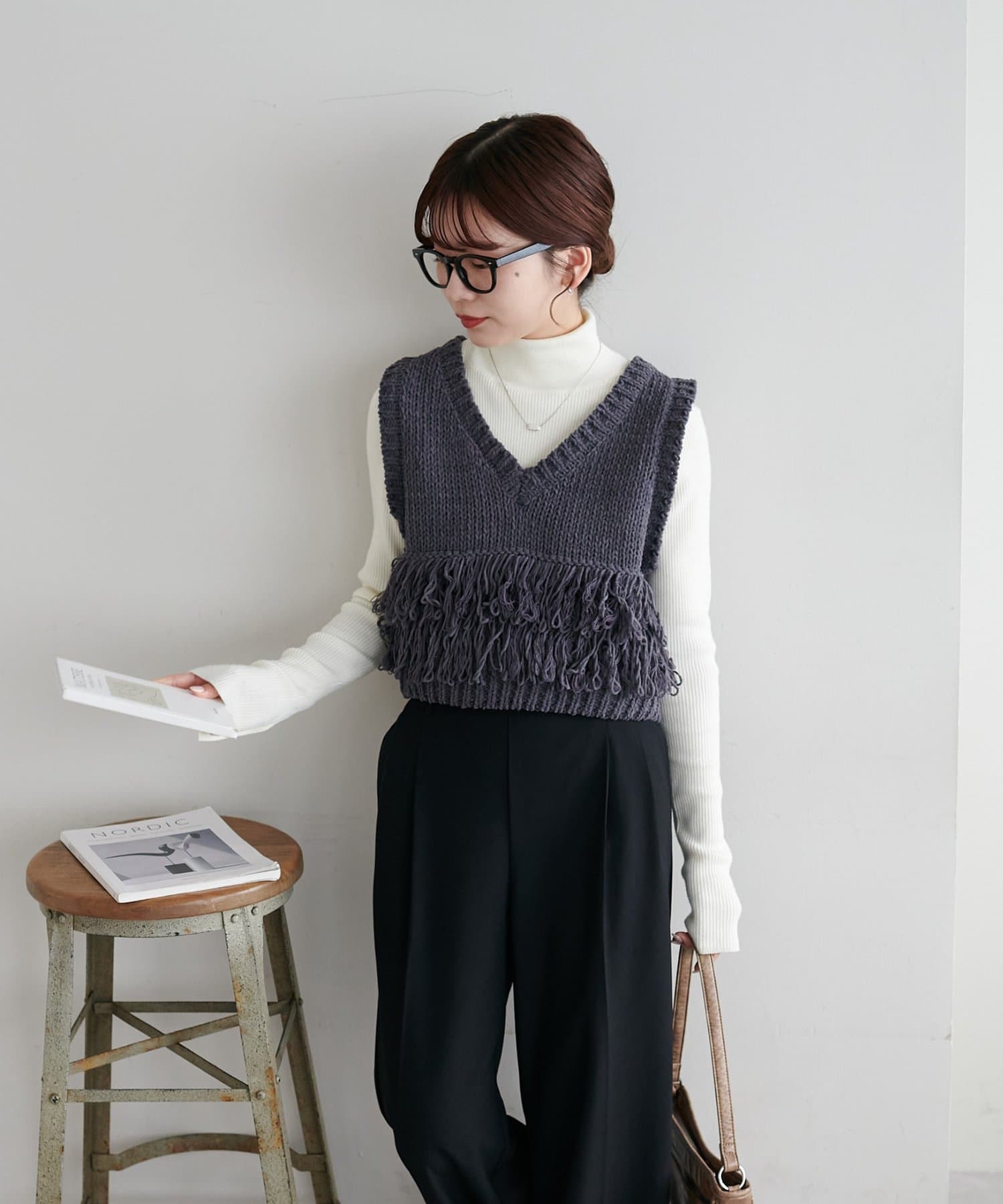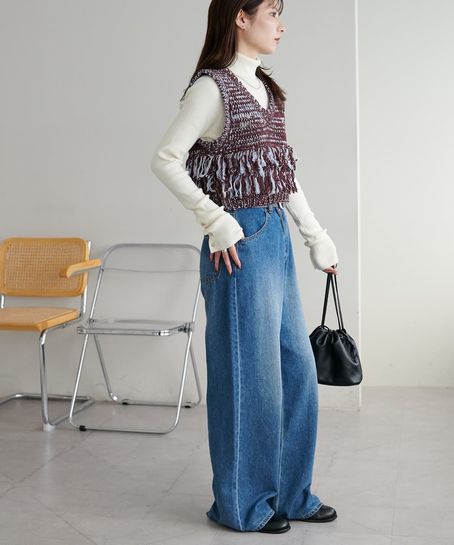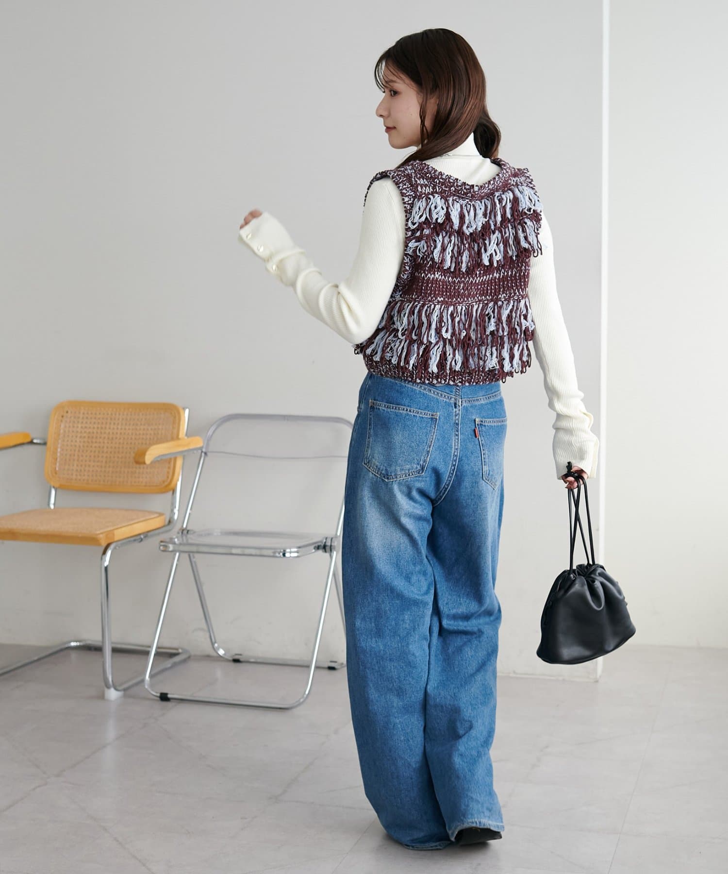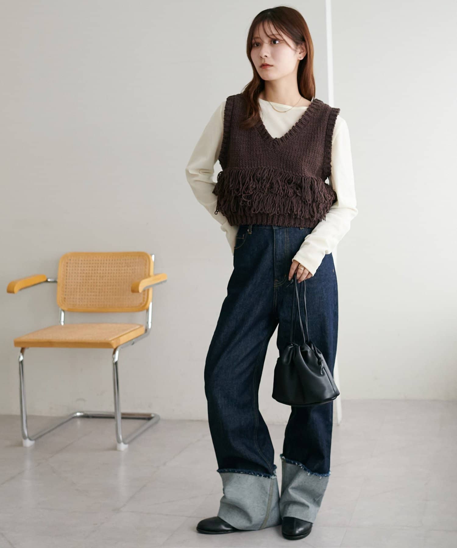 裾のフリンジが揺れて動きが出るので、シンプルなコーデも華やかに仕上がるのが◎