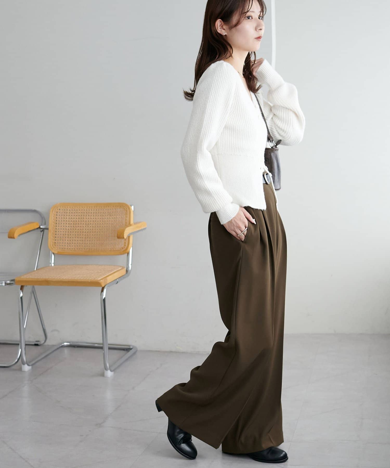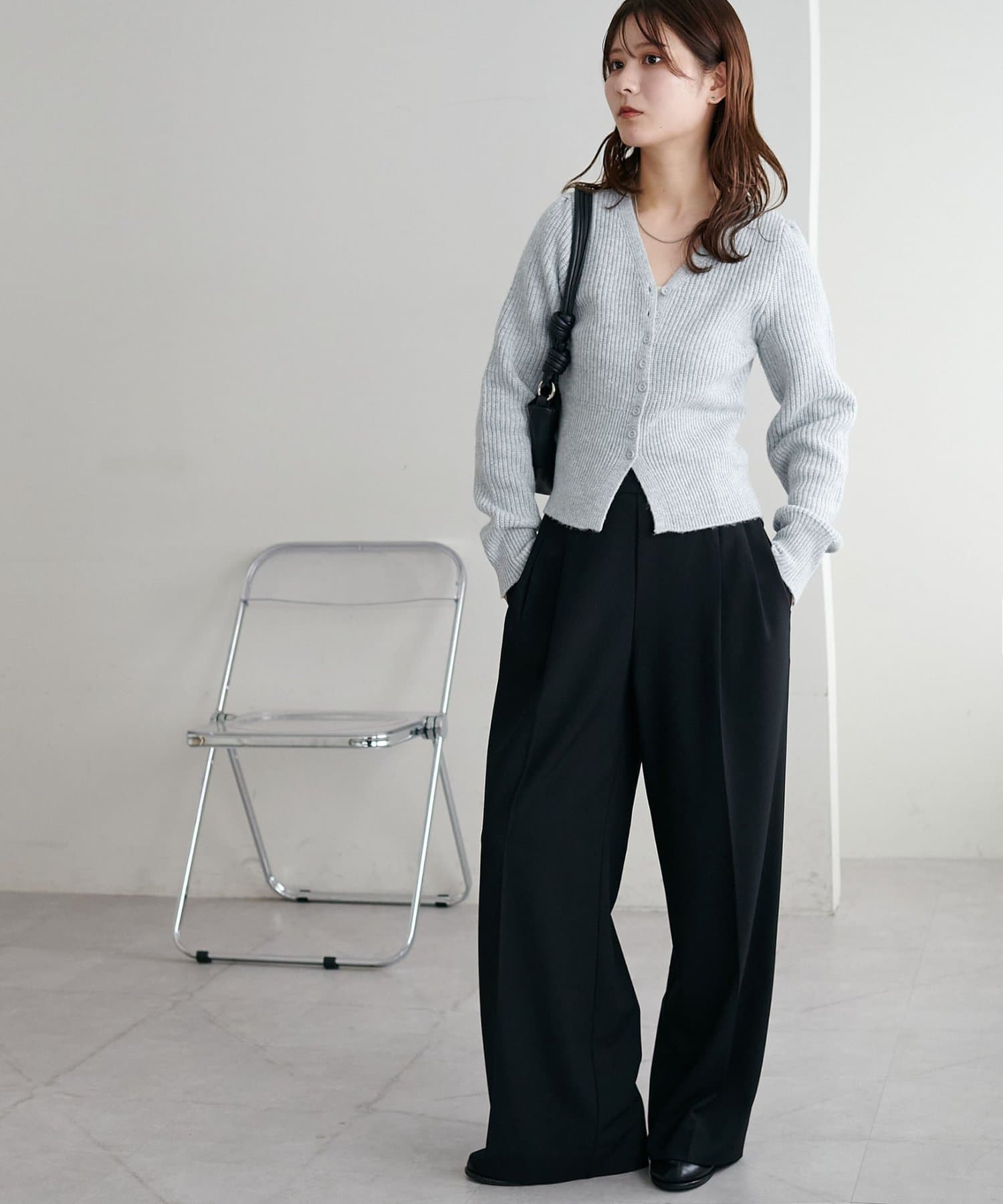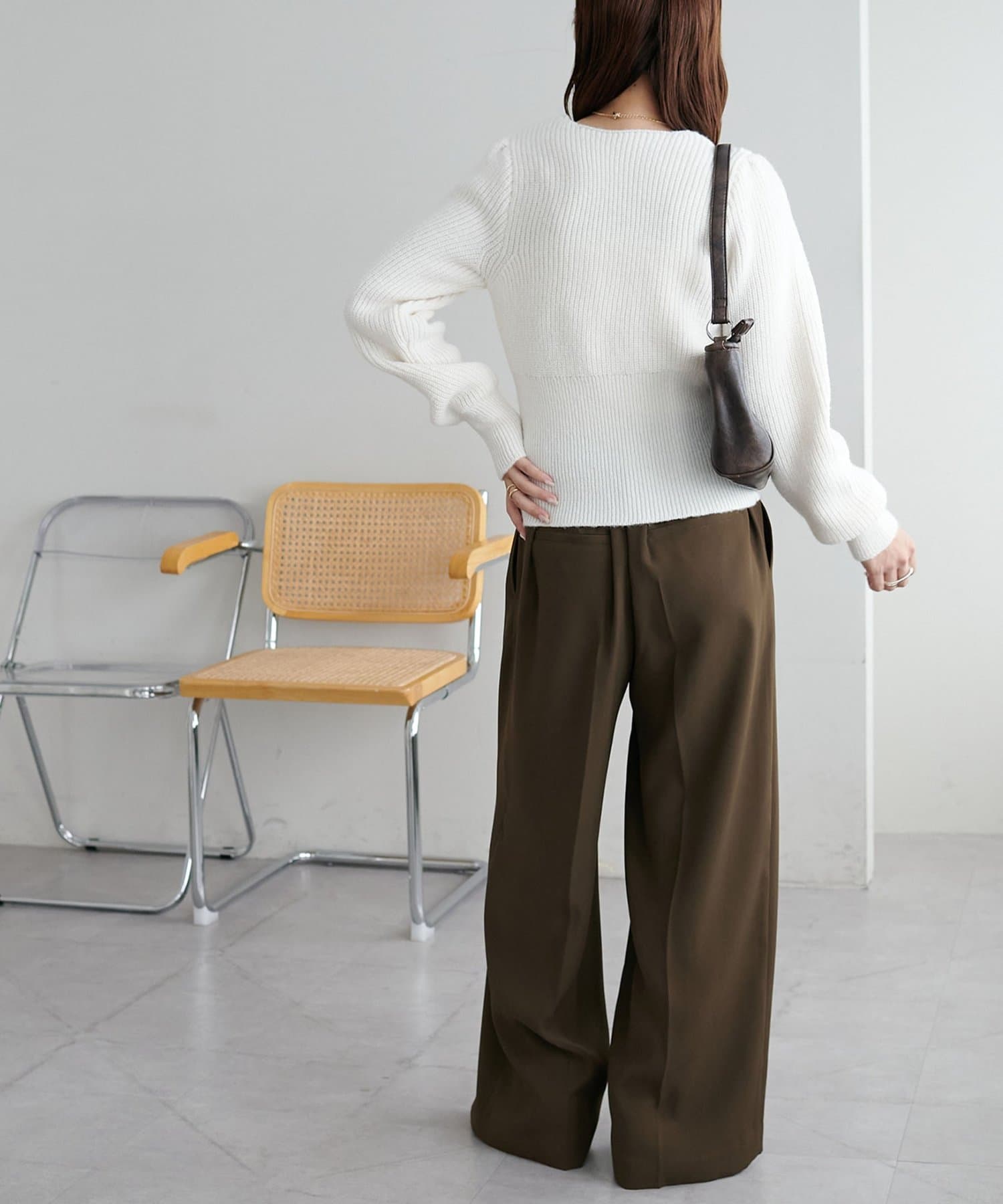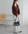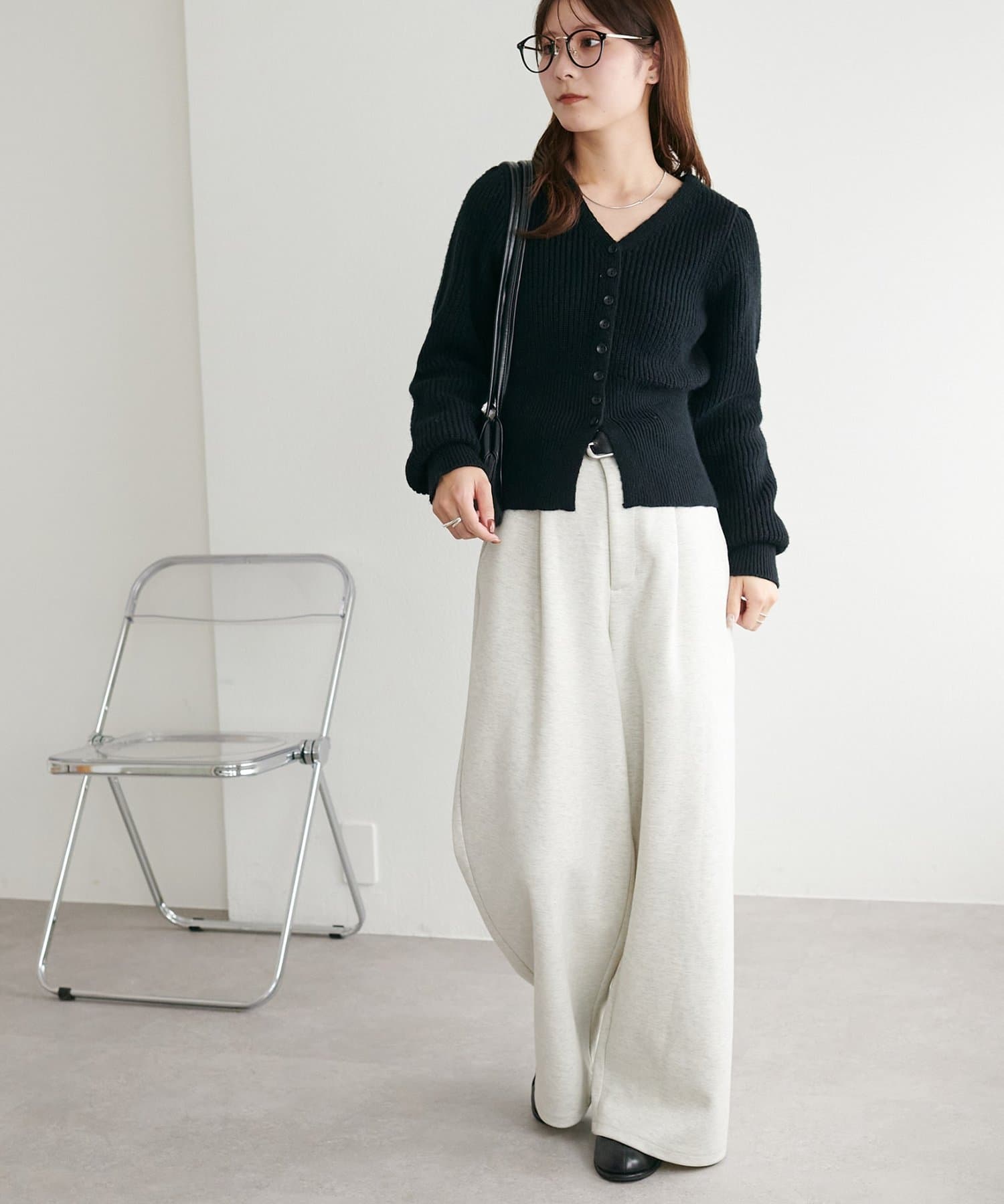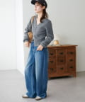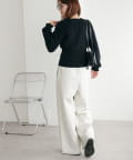コンパクトな丈感なので、ワイドパンツやボリュームスカートなど、ボトムにボリュームを持たせたシルエットとも好バランス◎
