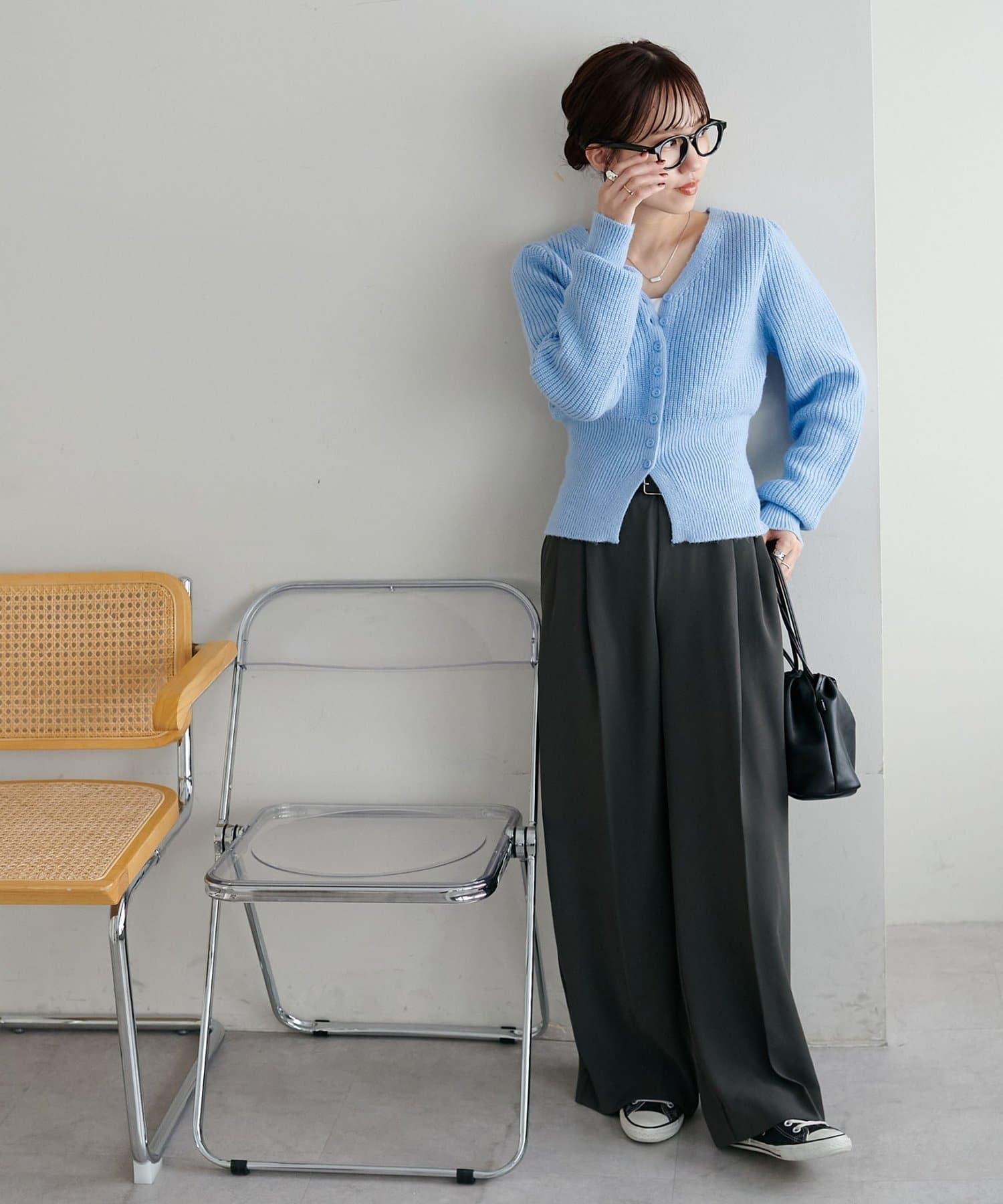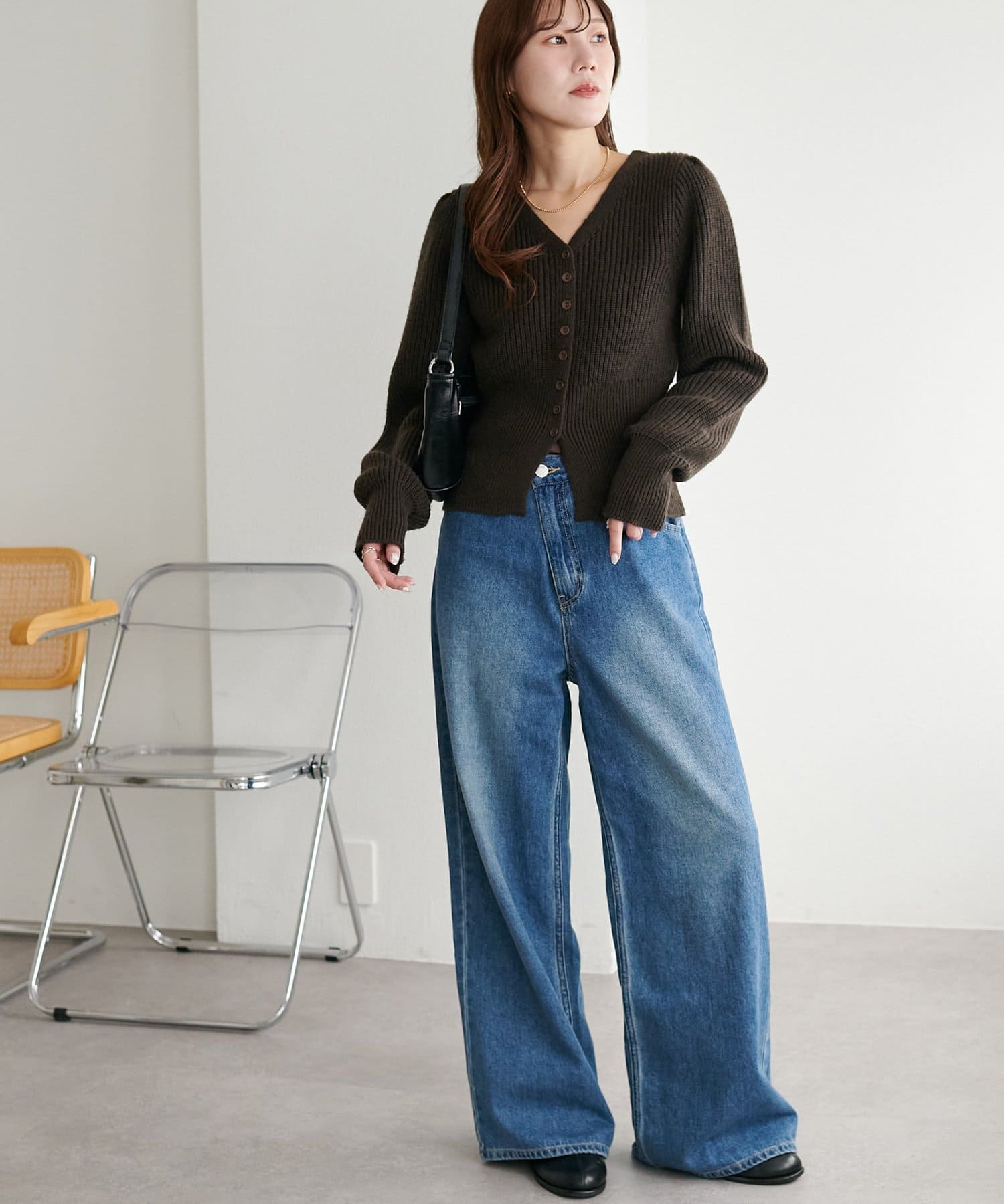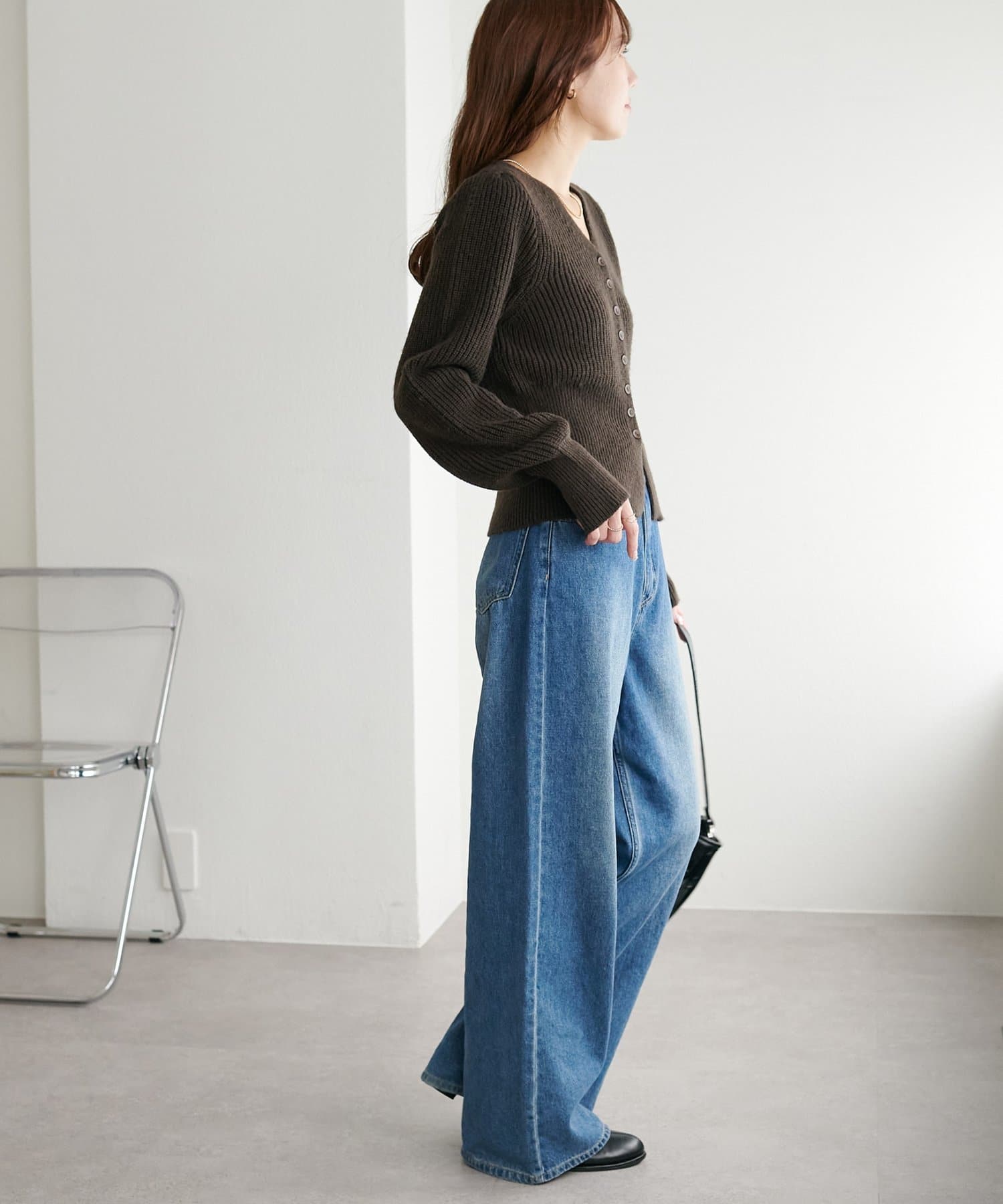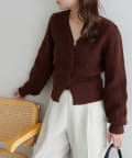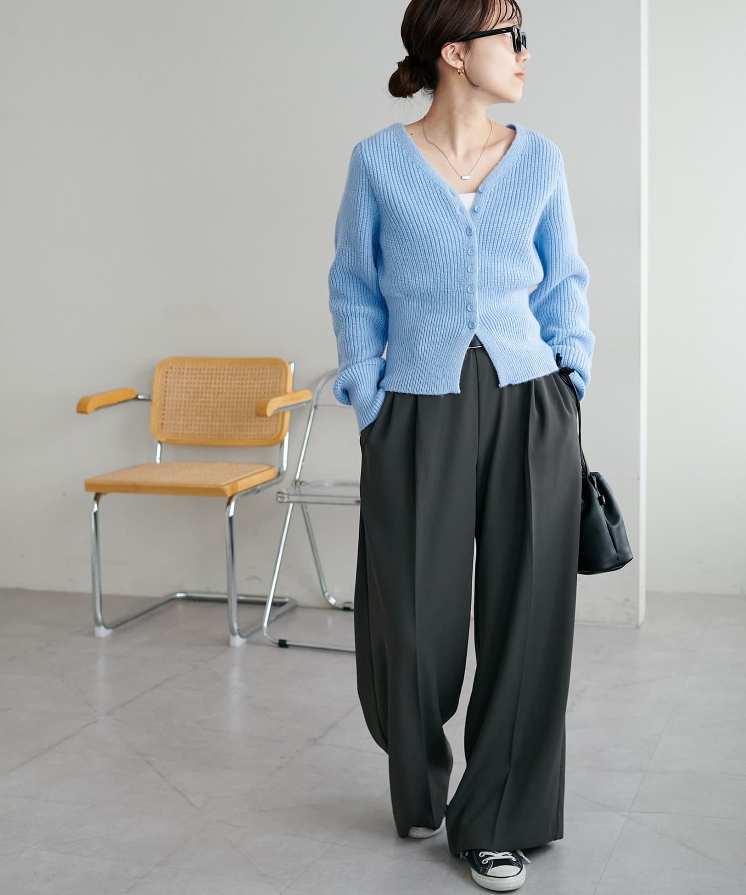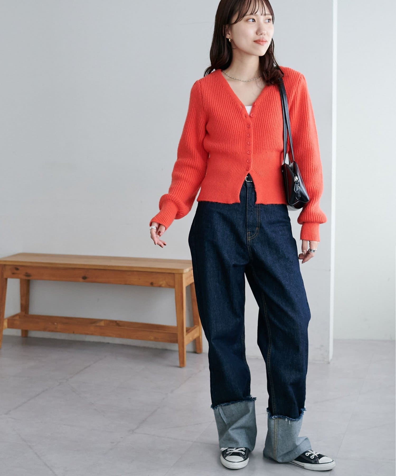 コンパクトな丈感なので、ワイドパンツやボリュームスカートなど、ボトムにボリュームを持たせたシルエットとも好バランス◎
