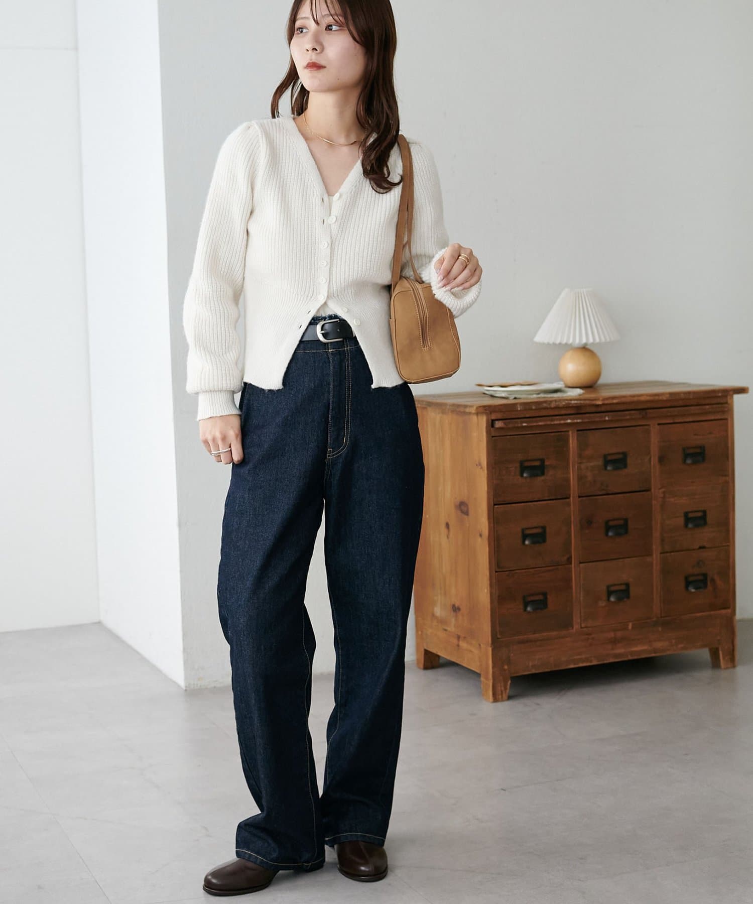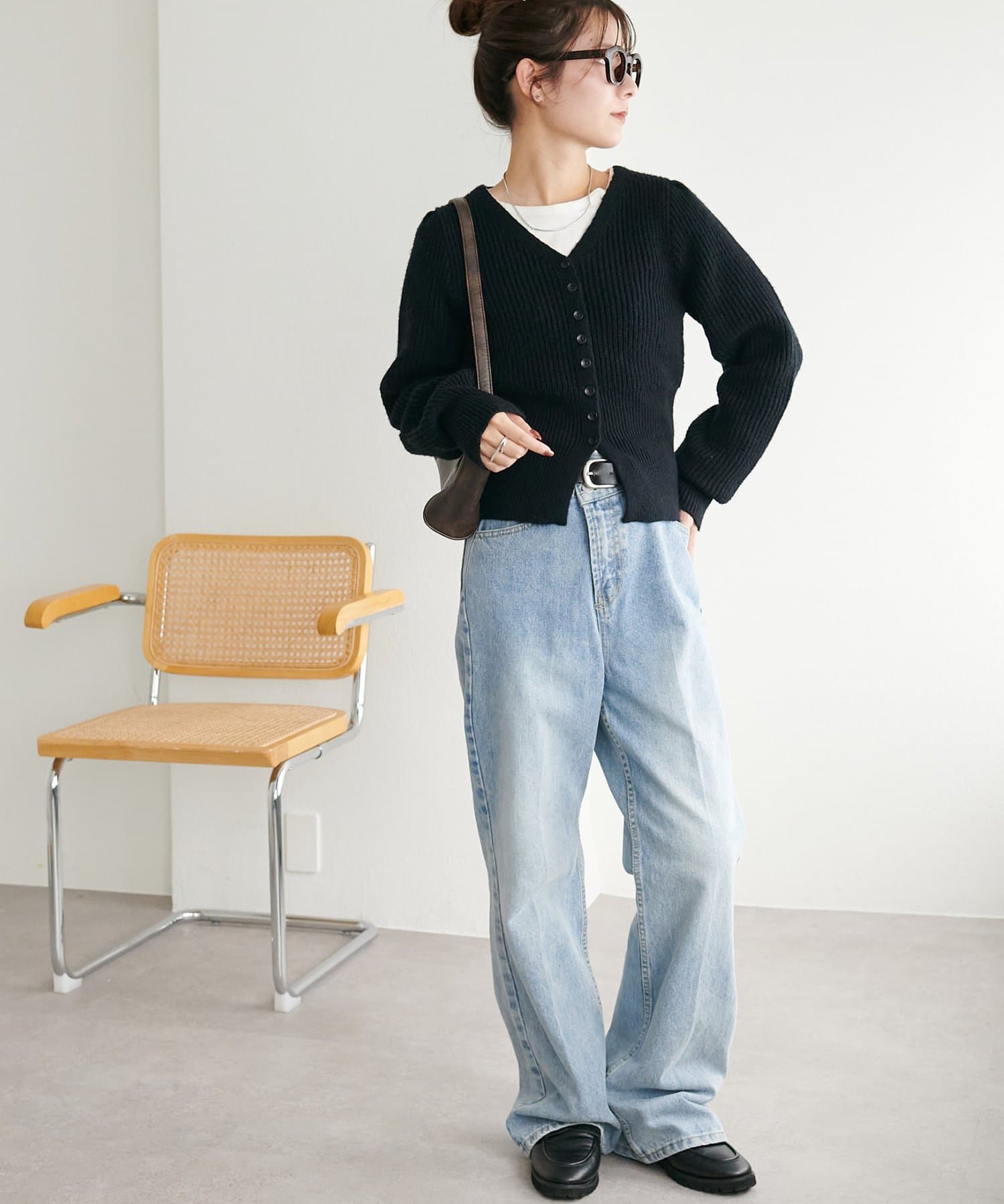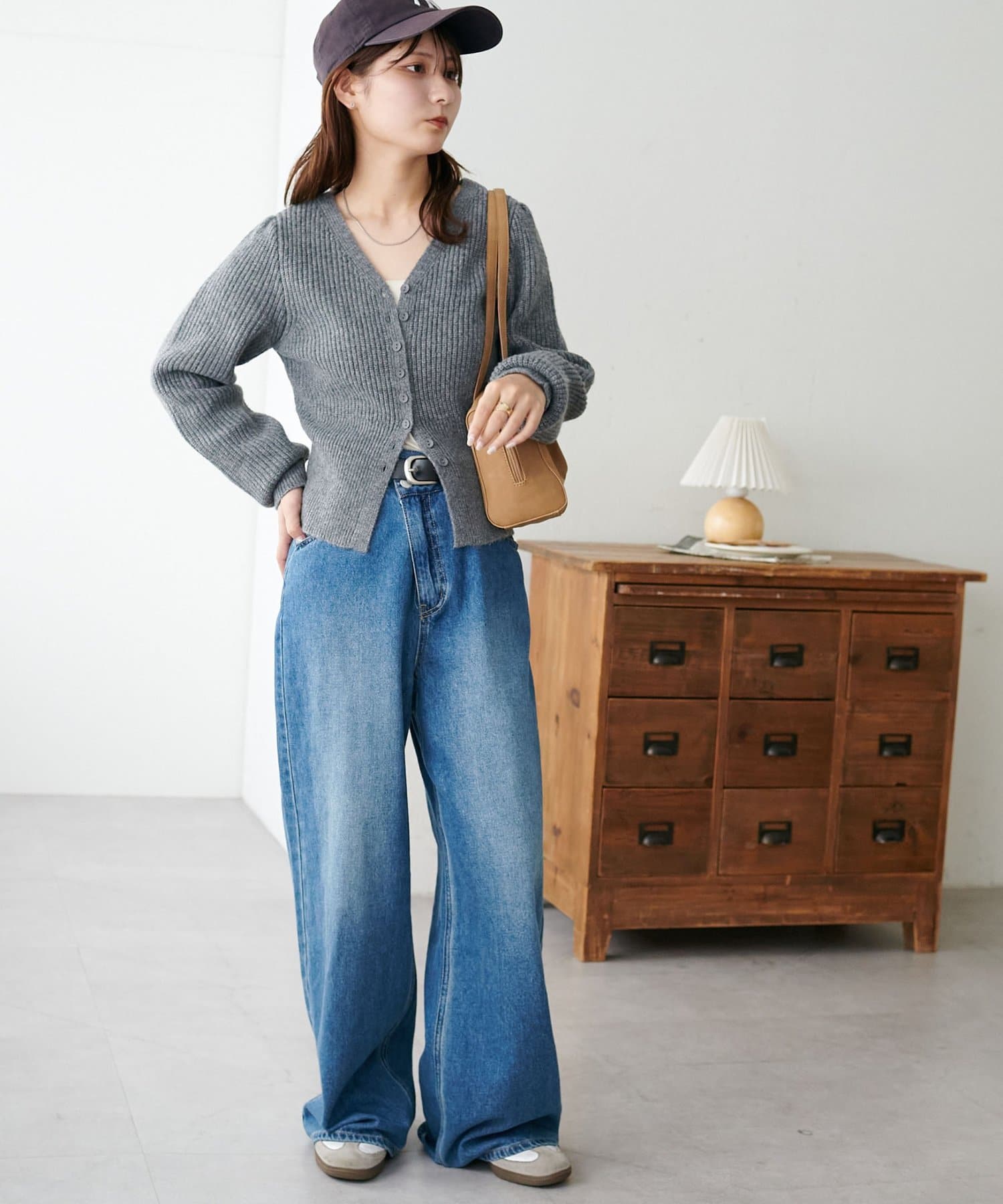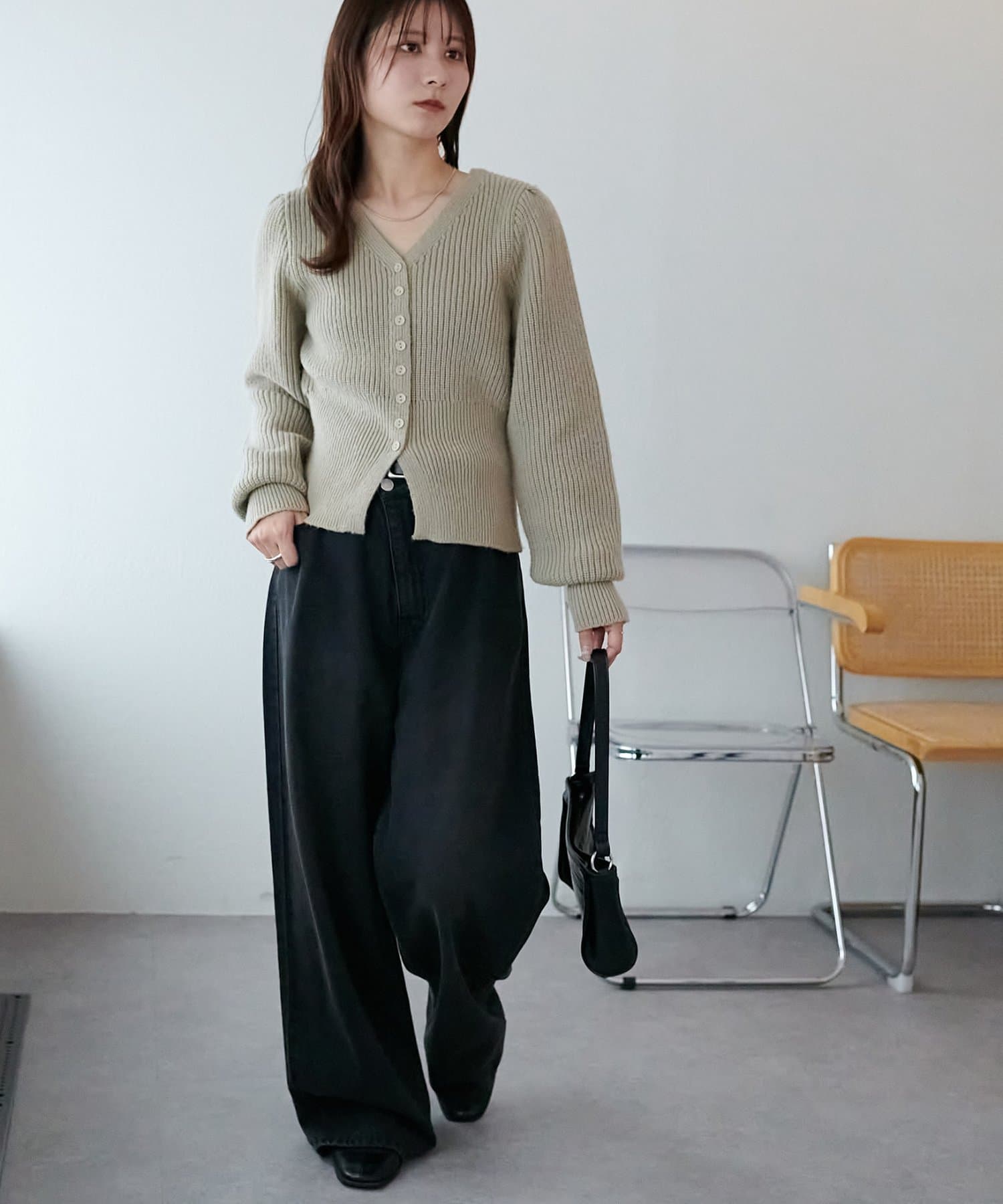 コンパクトな丈感なので、ワイドパンツやボリュームスカートなど、ボトムにボリュームを持たせたシルエットとも好バランス◎