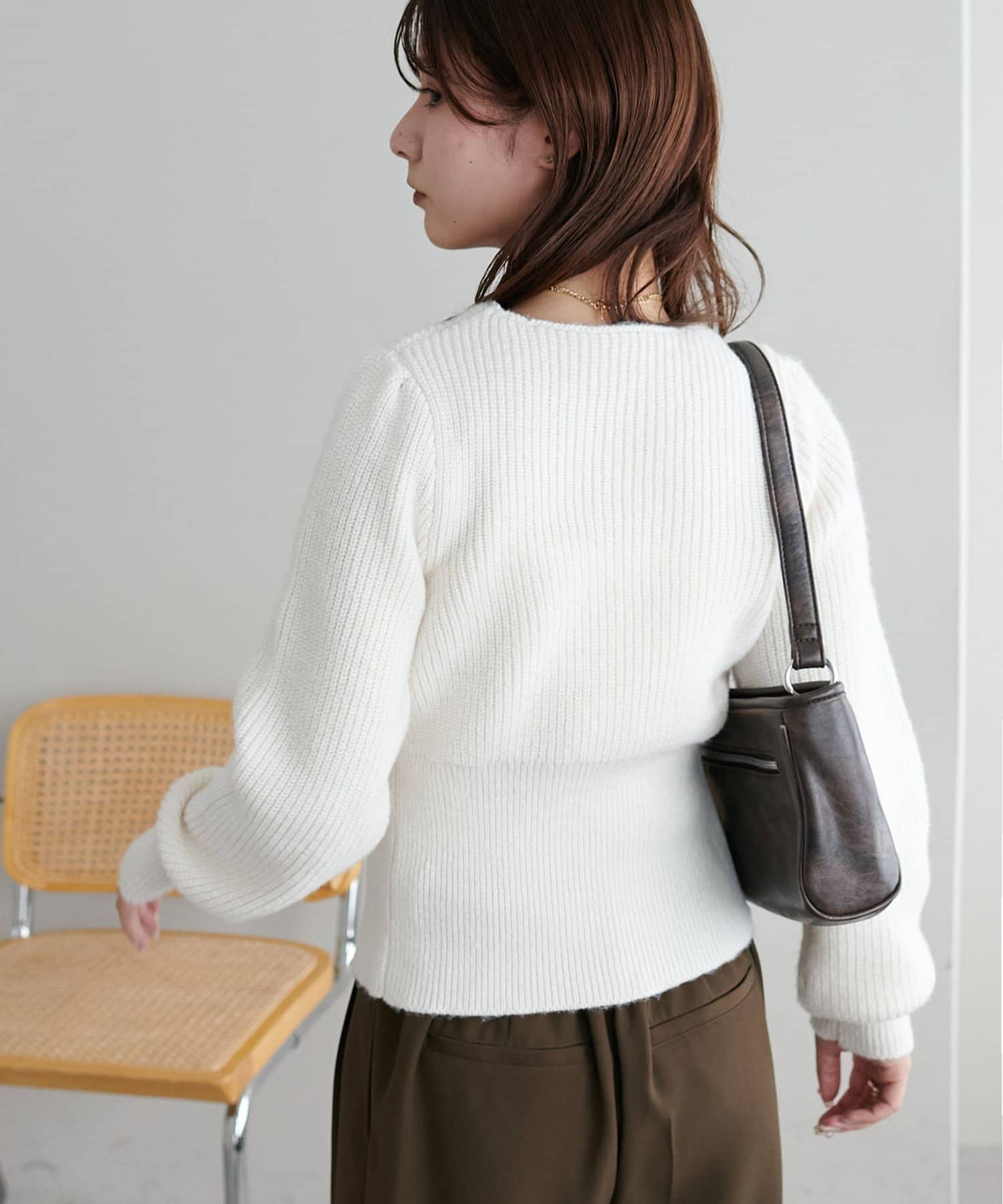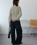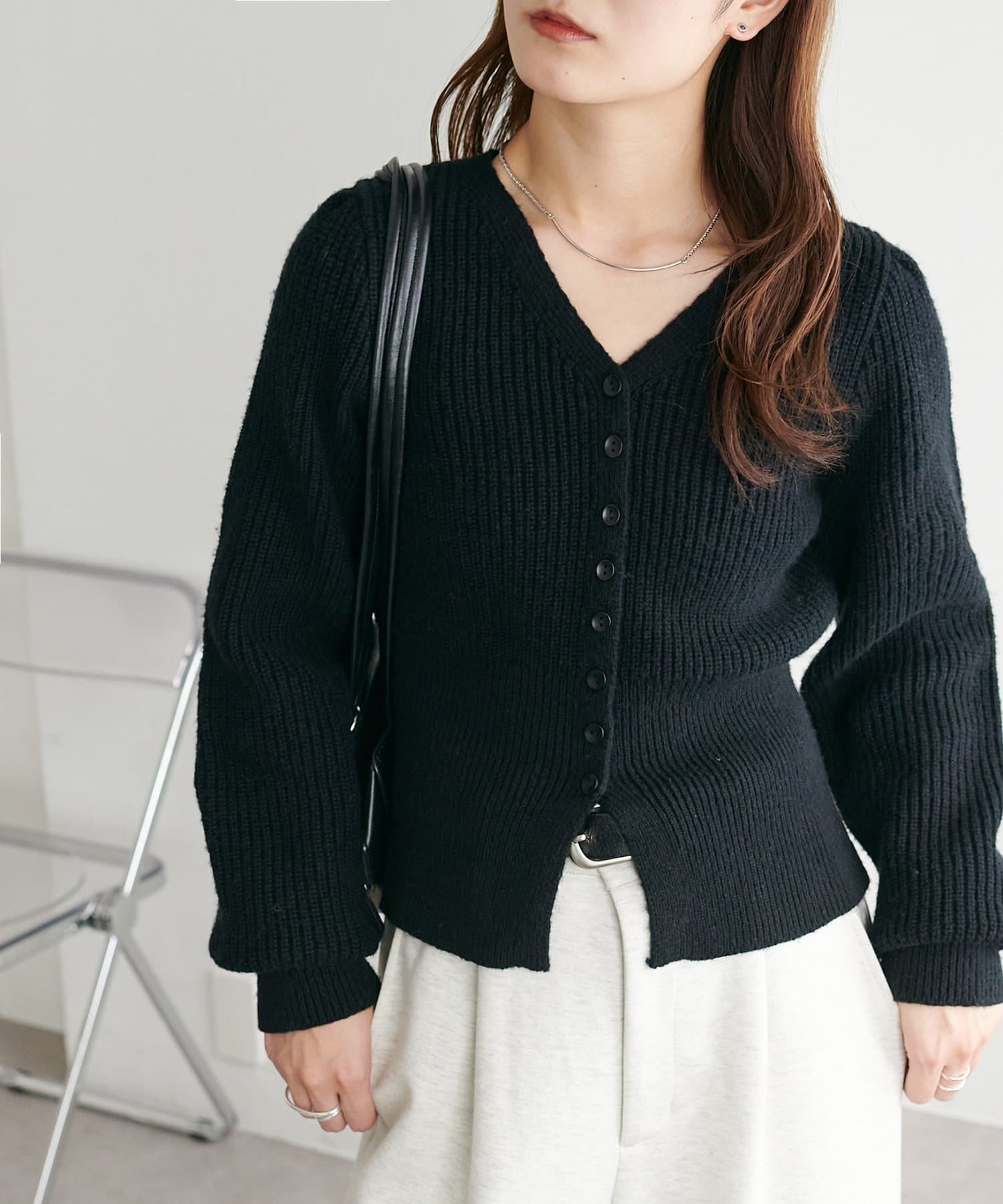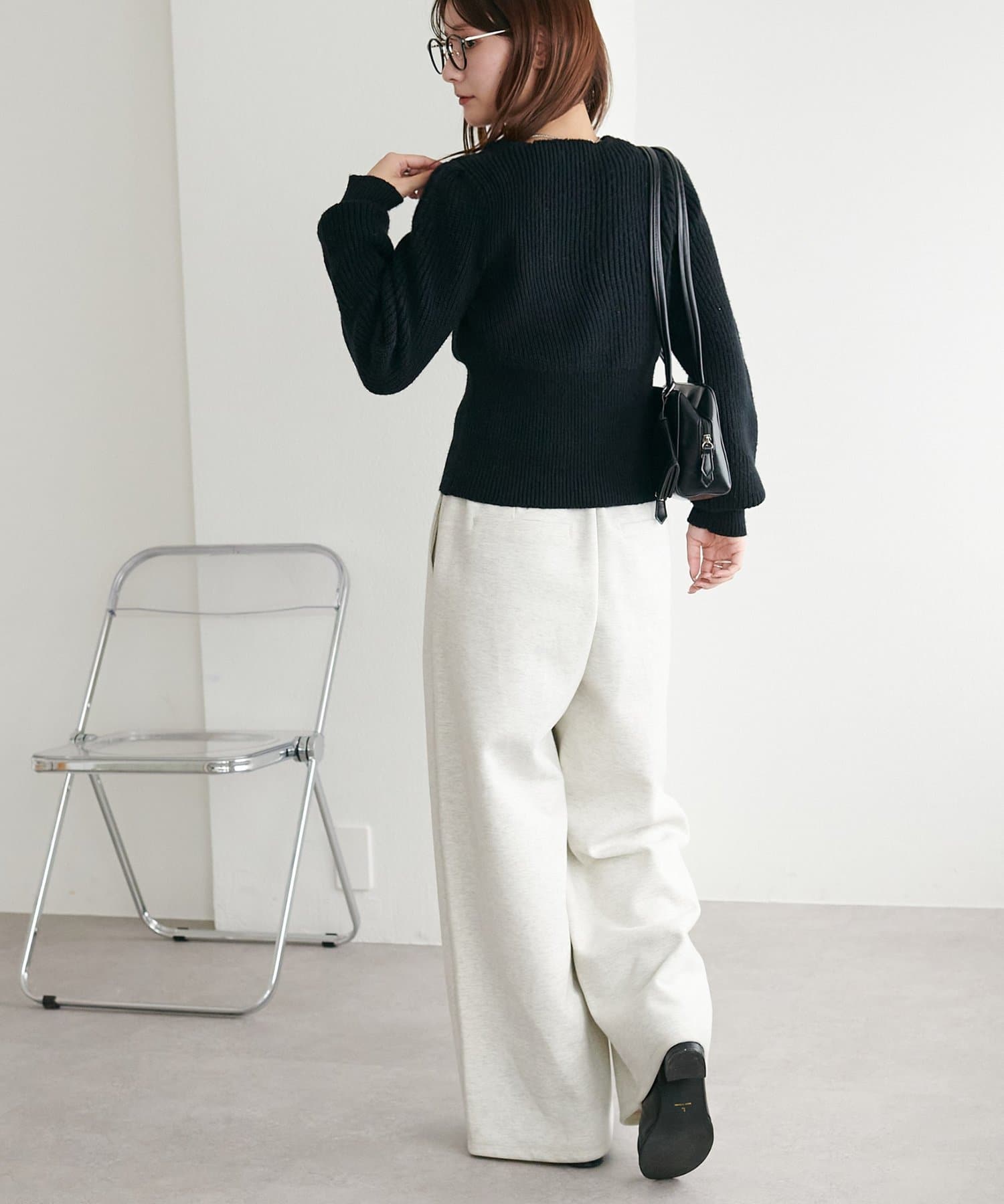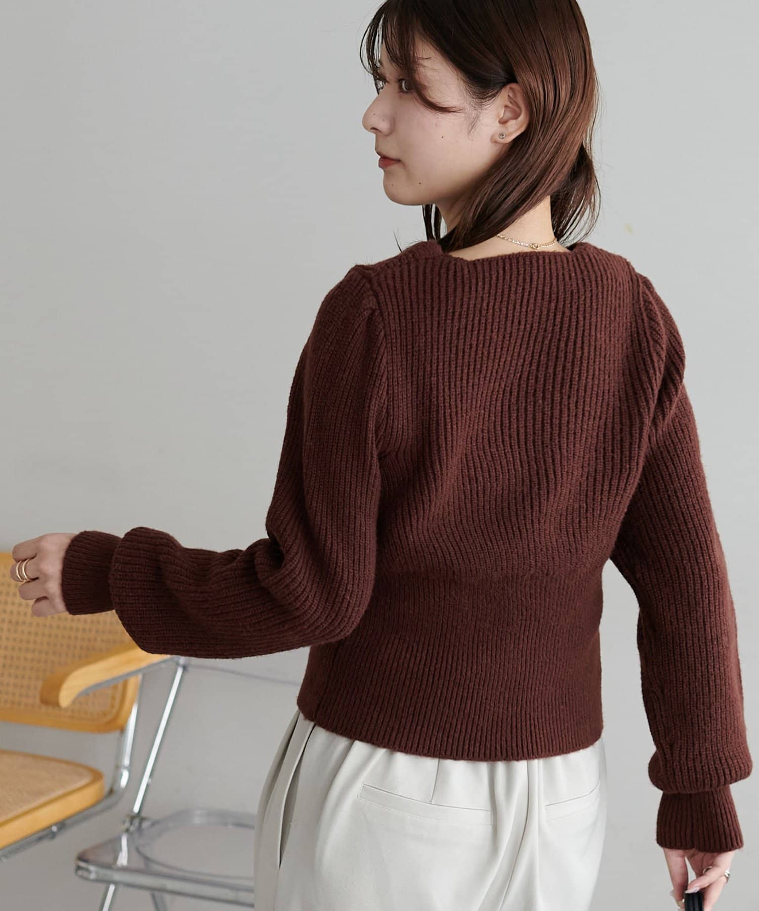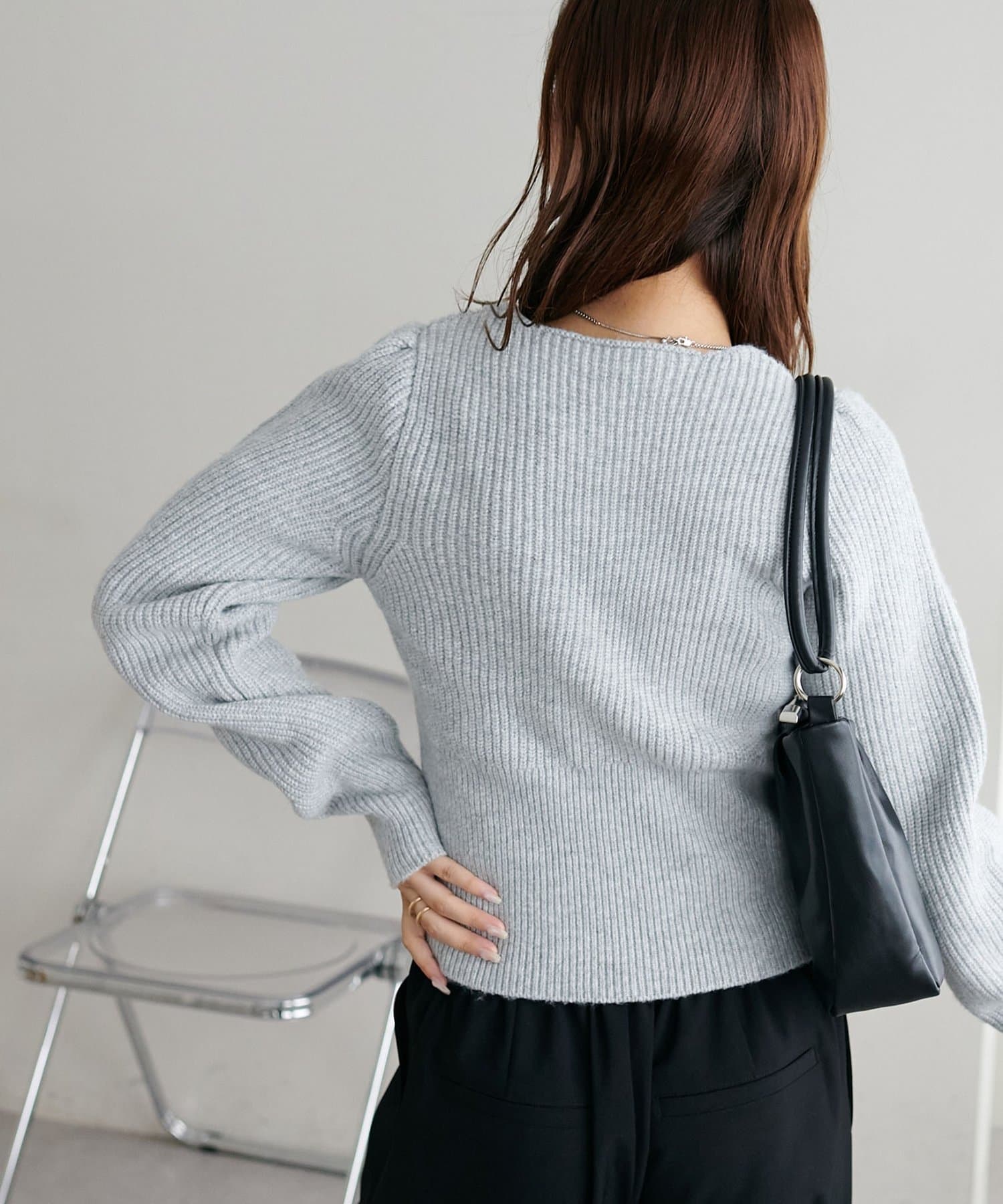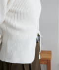 コンパクトなシルエットながらも、リブ編み特有の伸縮性があり、体のラインを拾いすぎず程よくフィット。