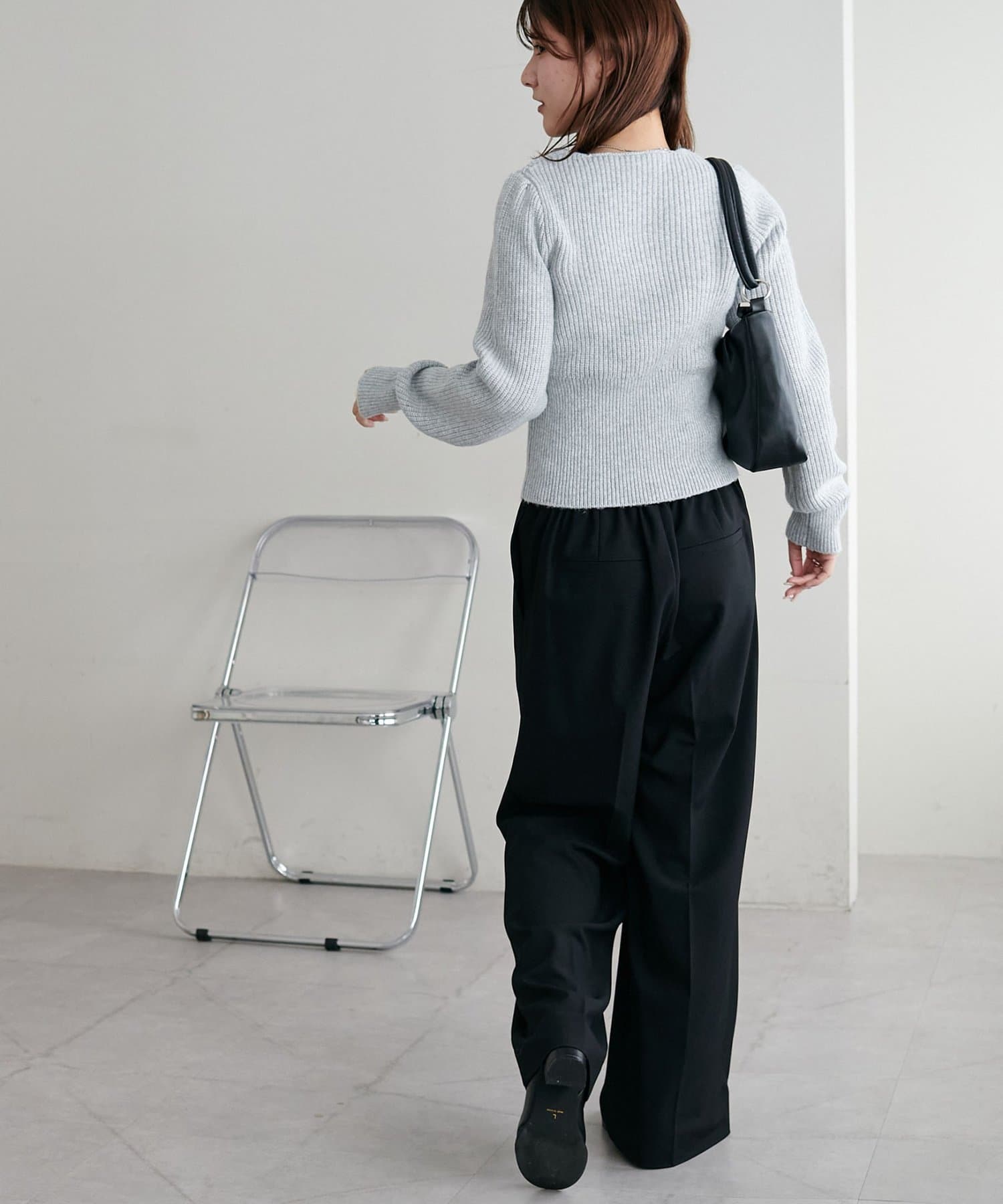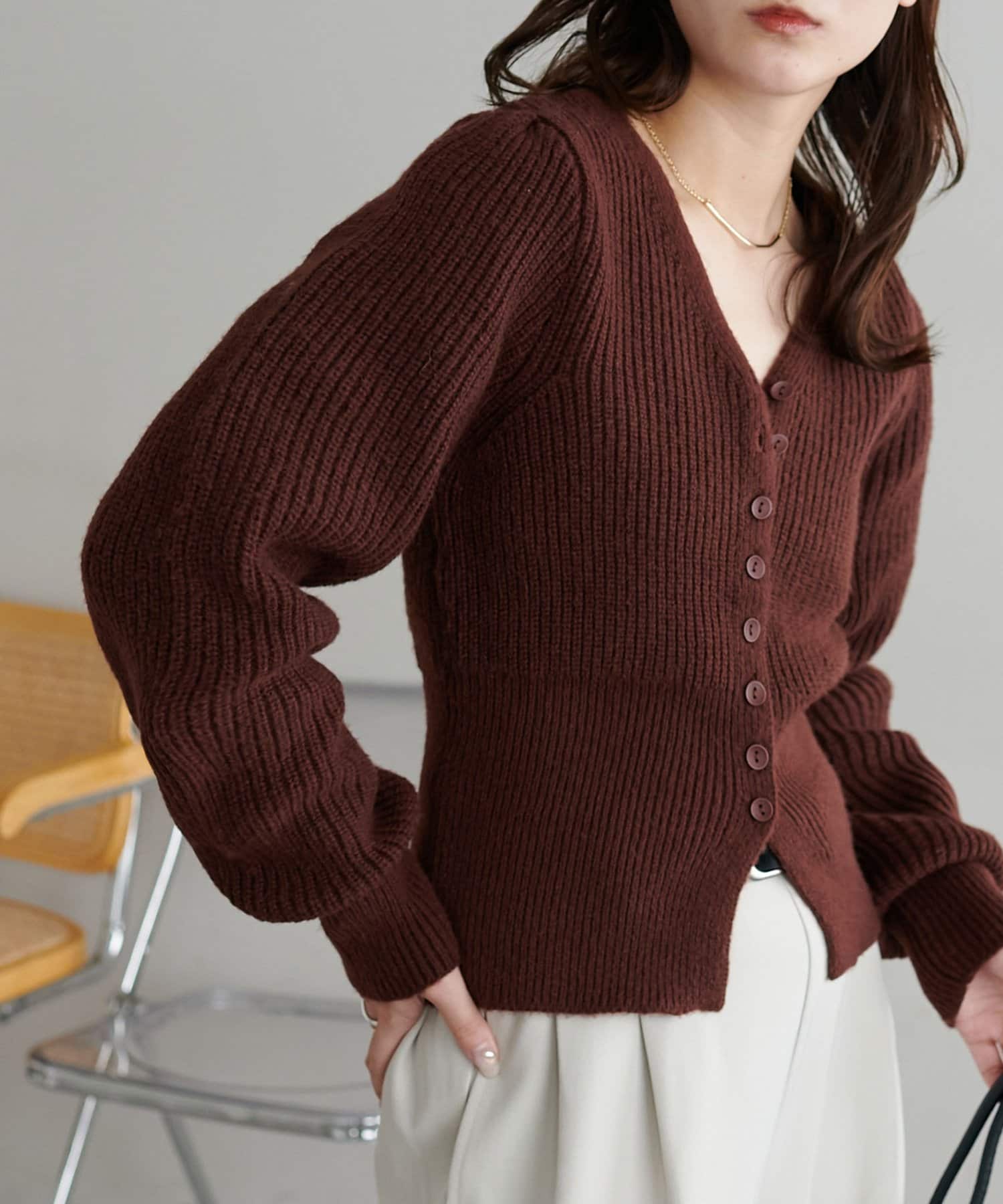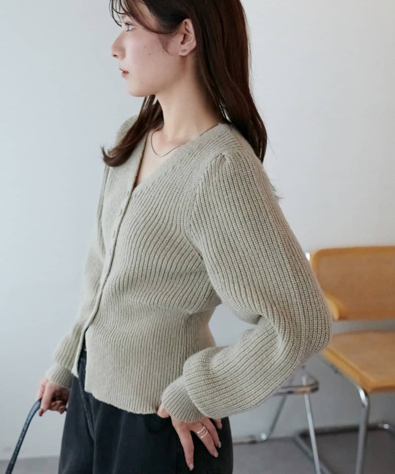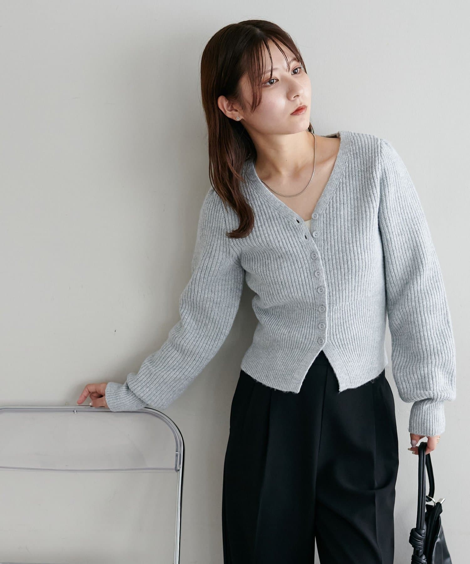 コンパクトなシルエットながらも、リブ編み特有の伸縮性があり、体のラインを拾いすぎず程よくフィット。