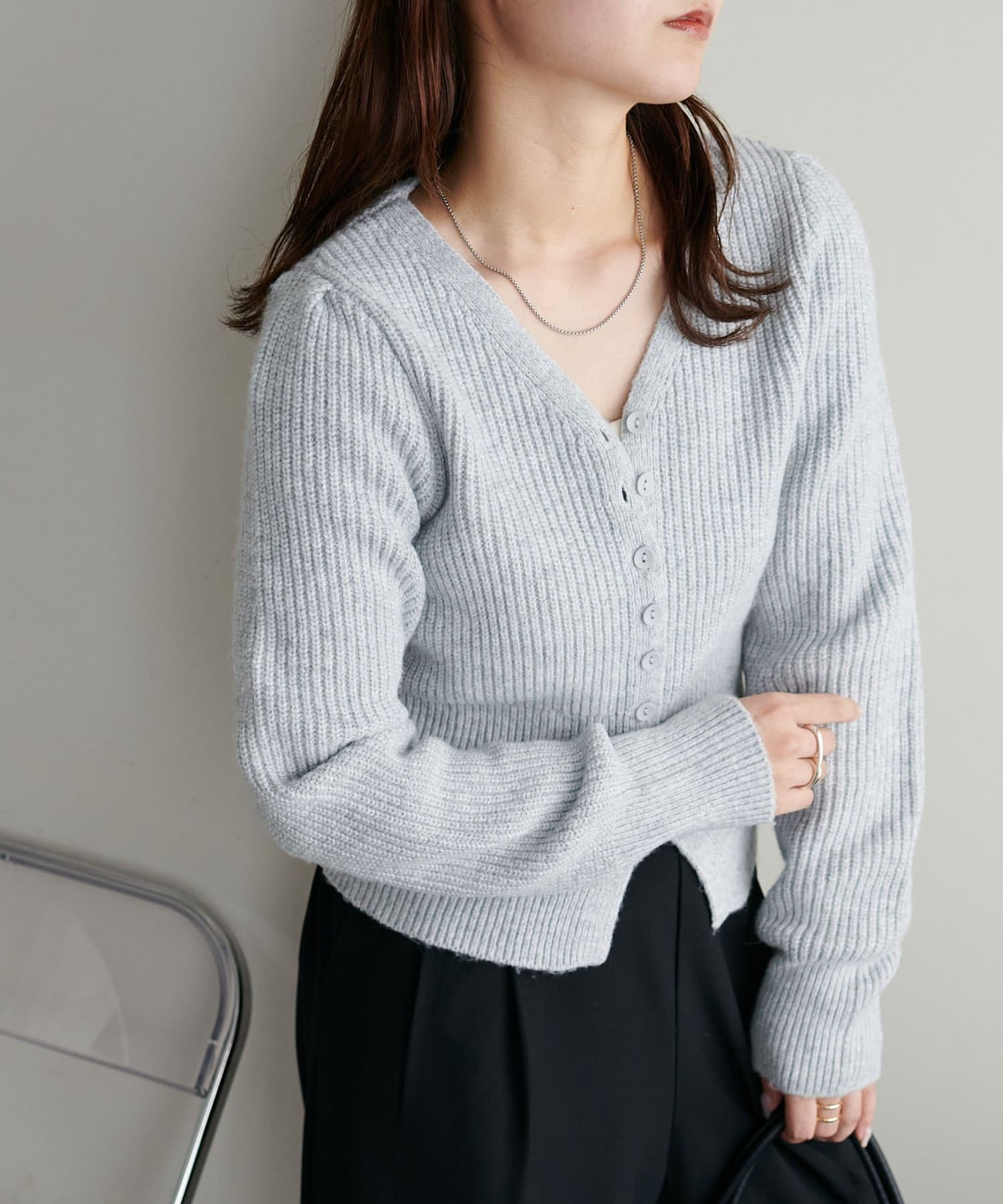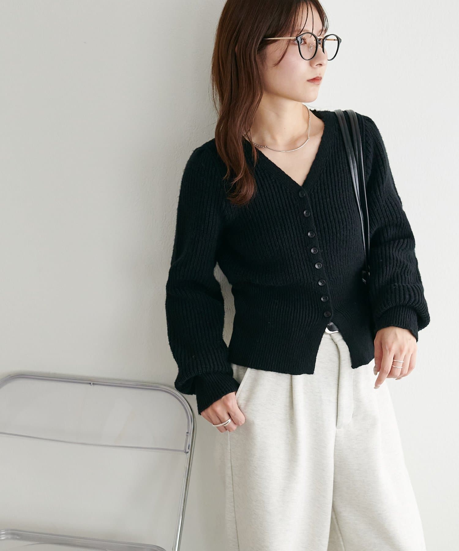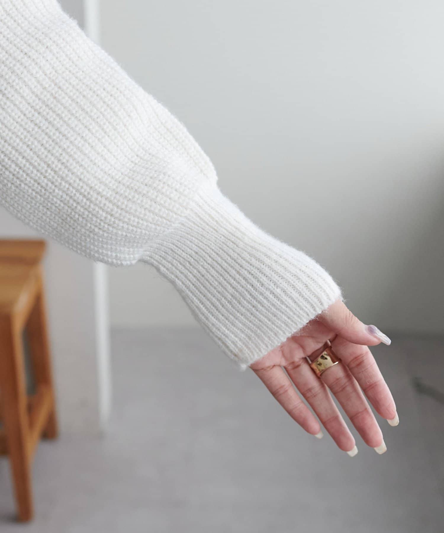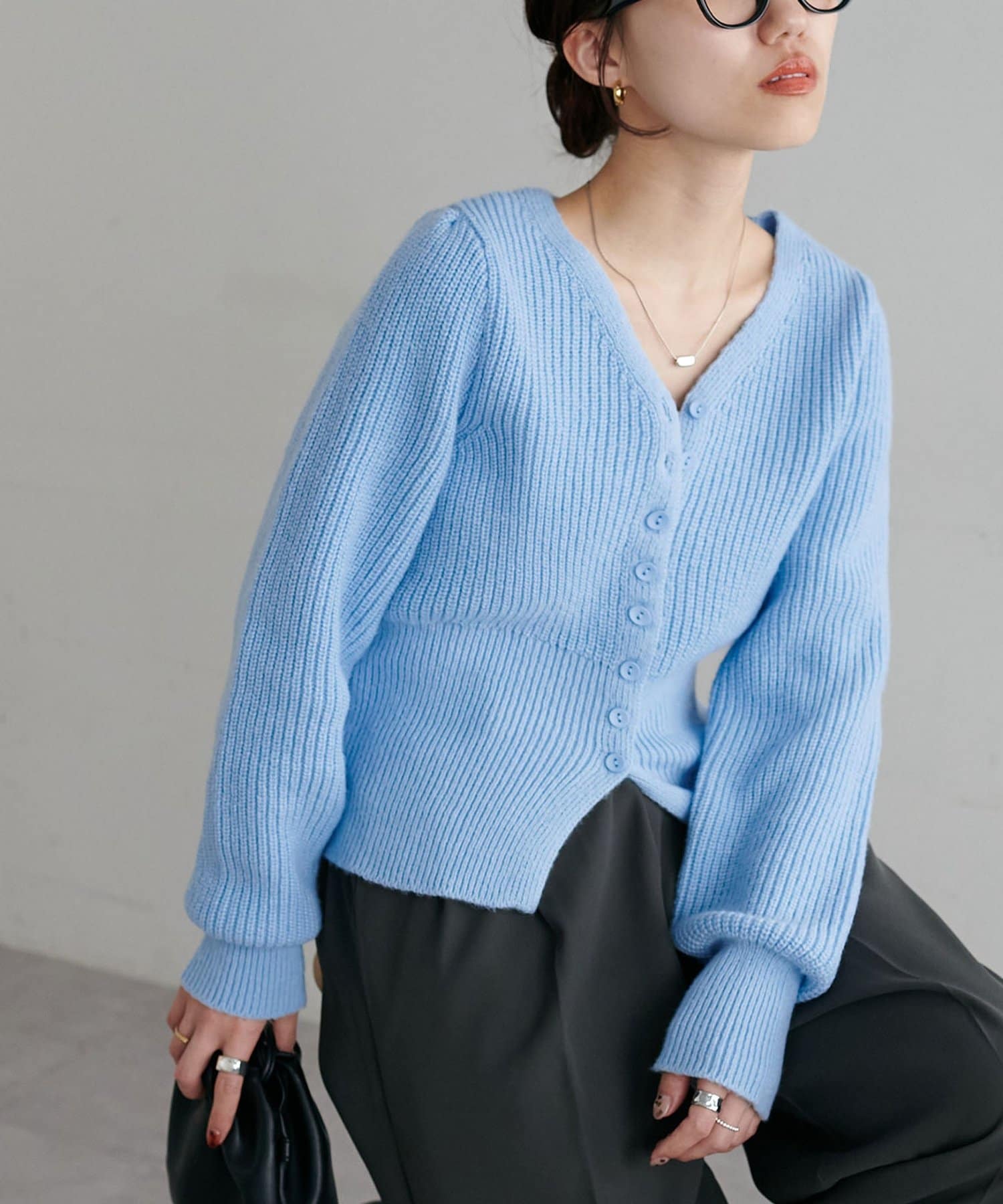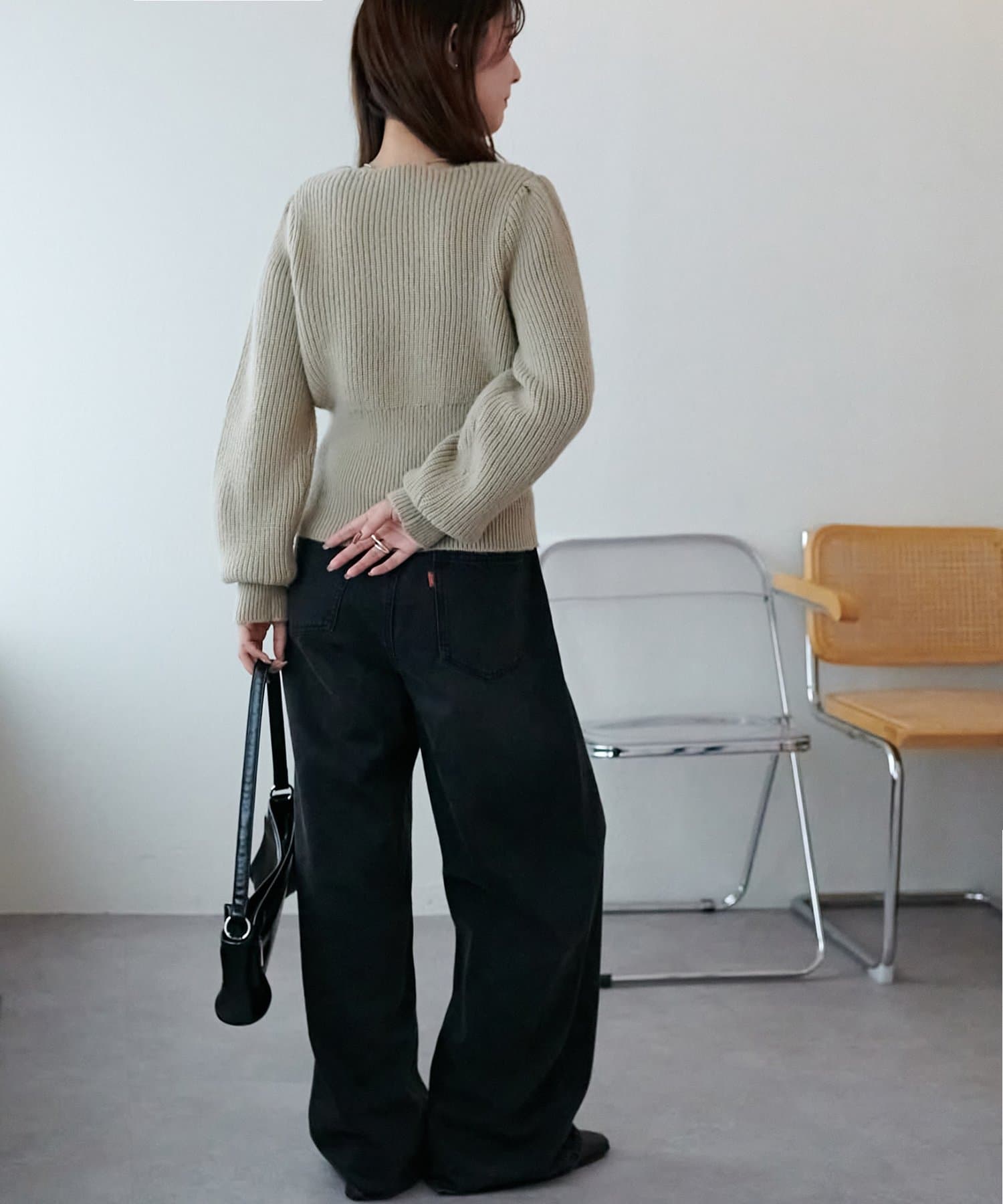 コンパクトなシルエットながらも、リブ編み特有の伸縮性があり、体のラインを拾いすぎず程よくフィット。