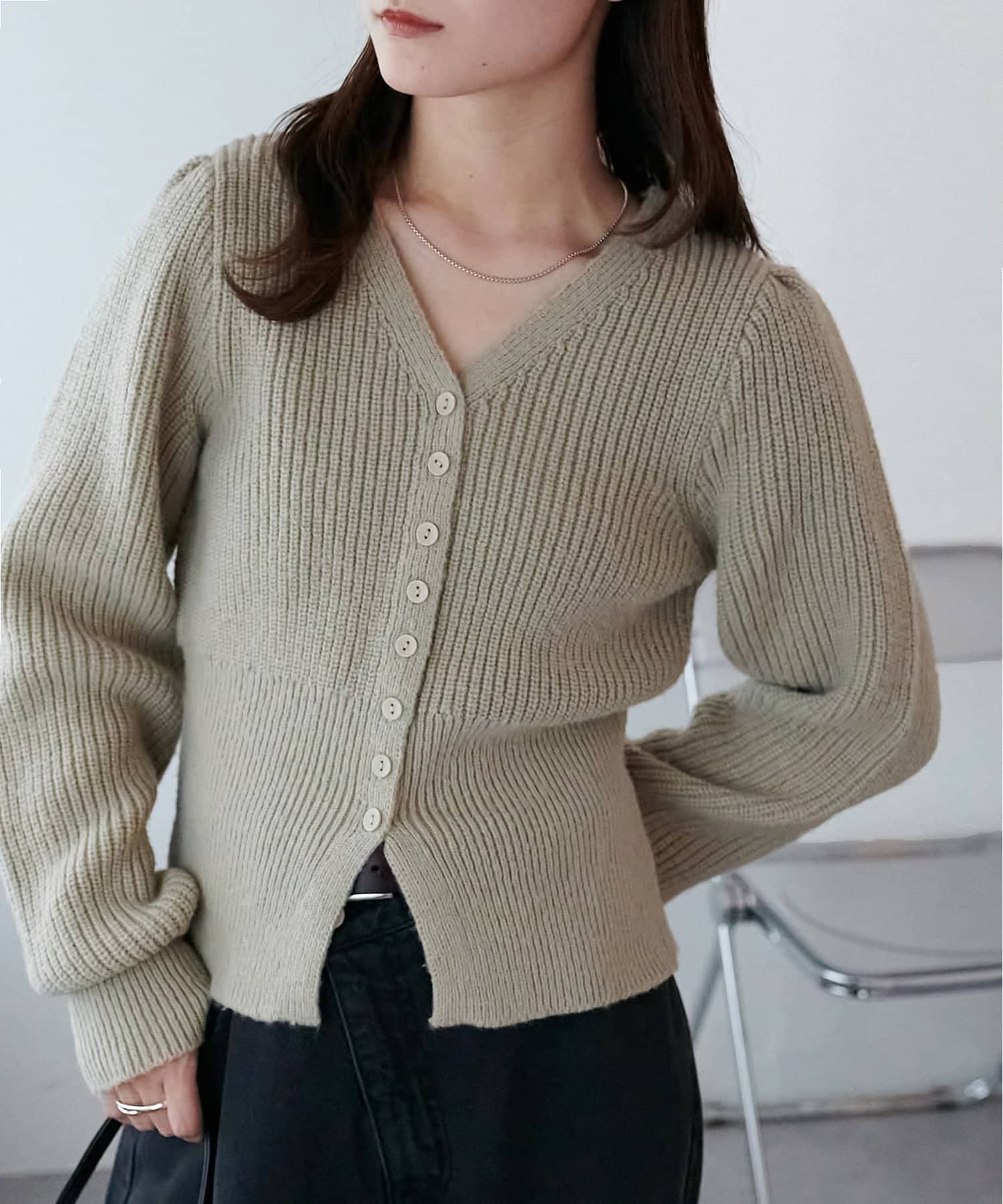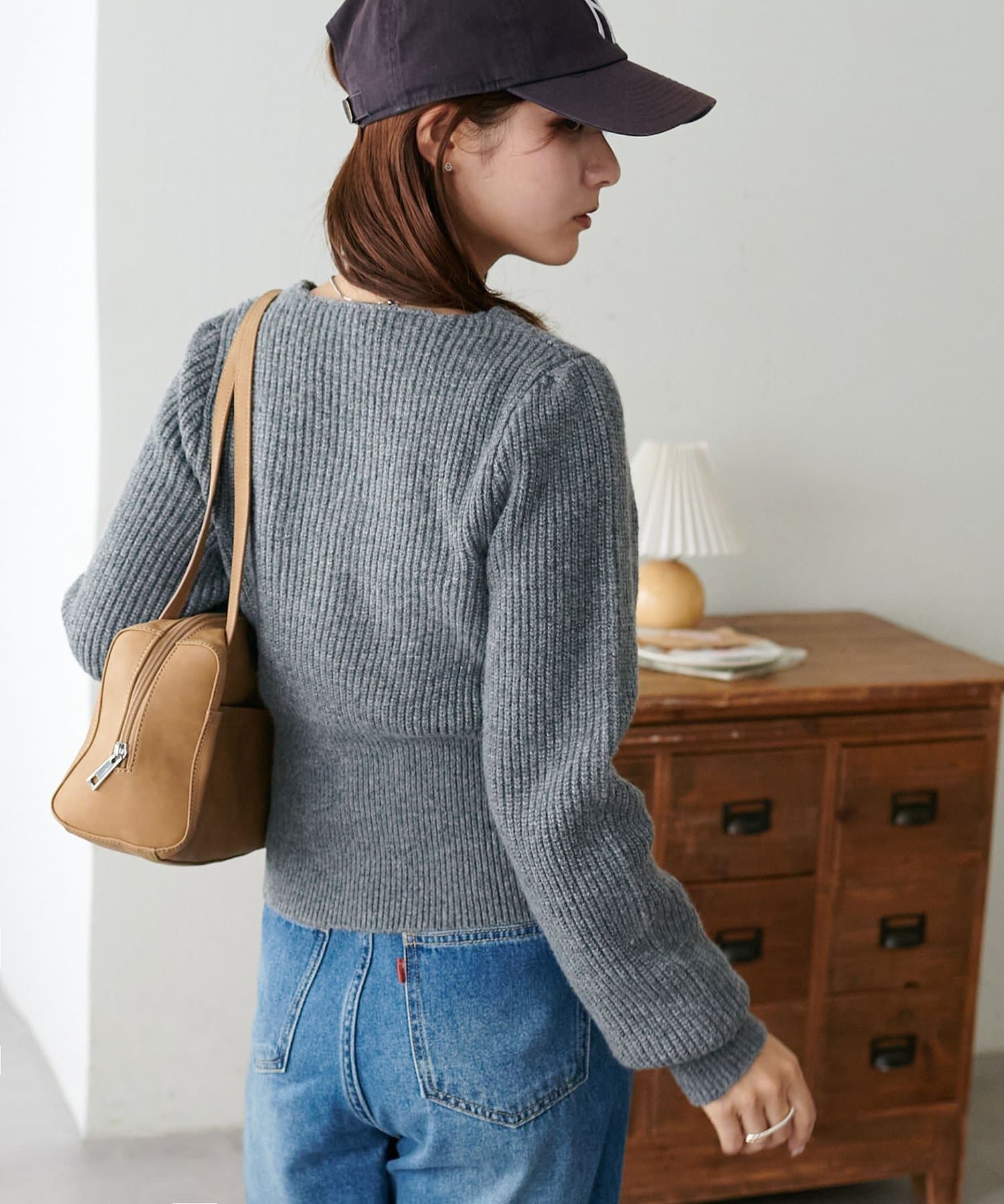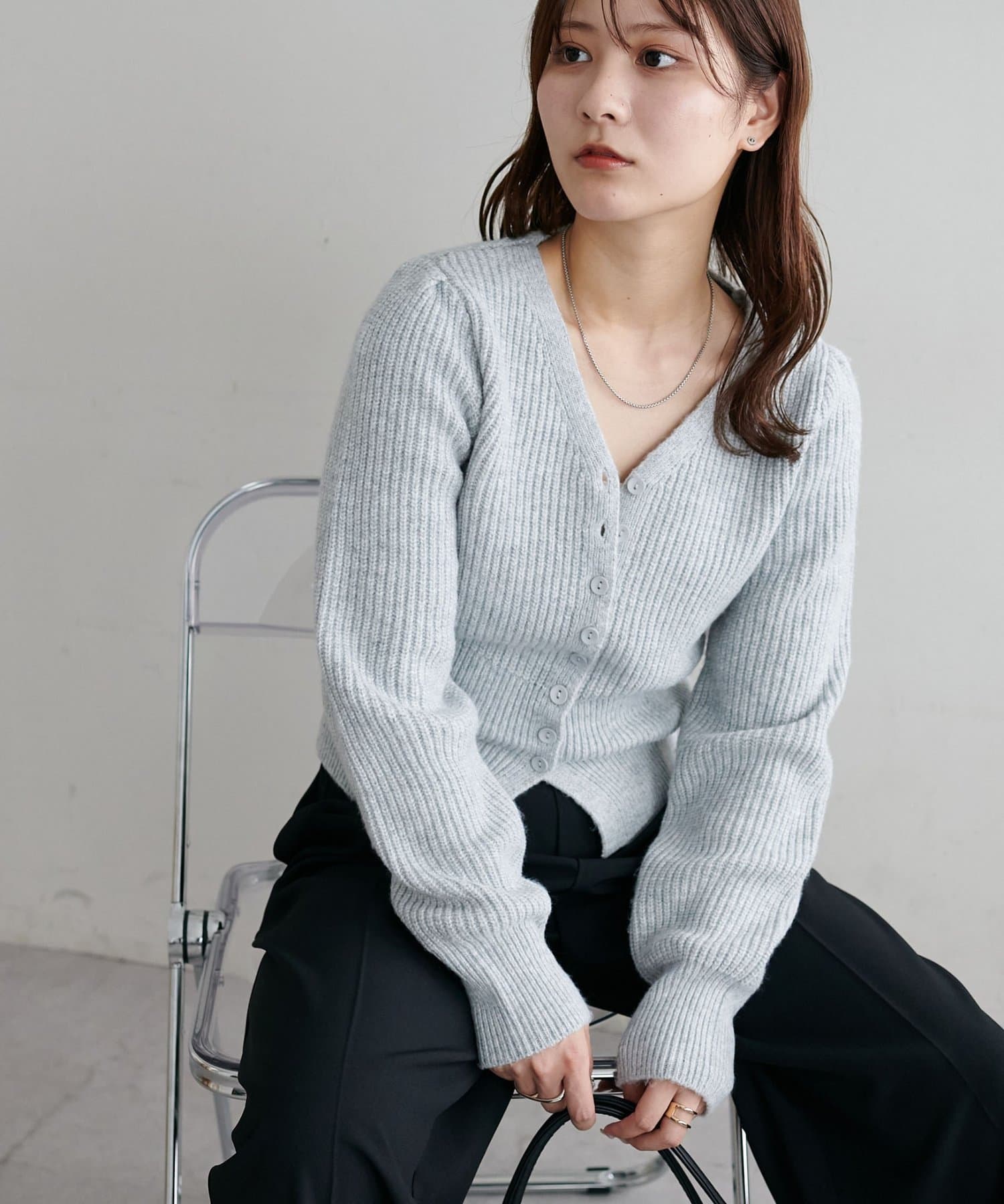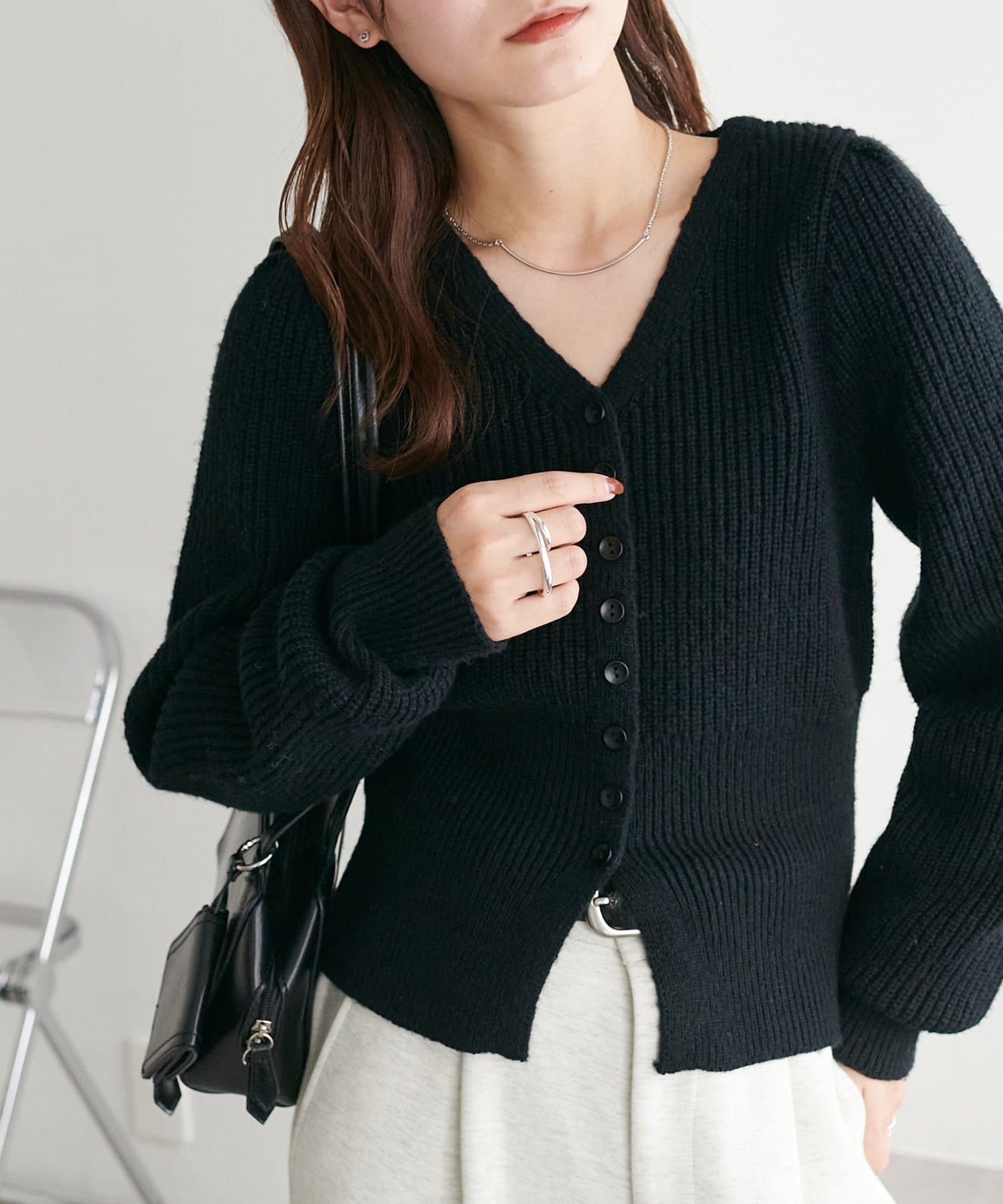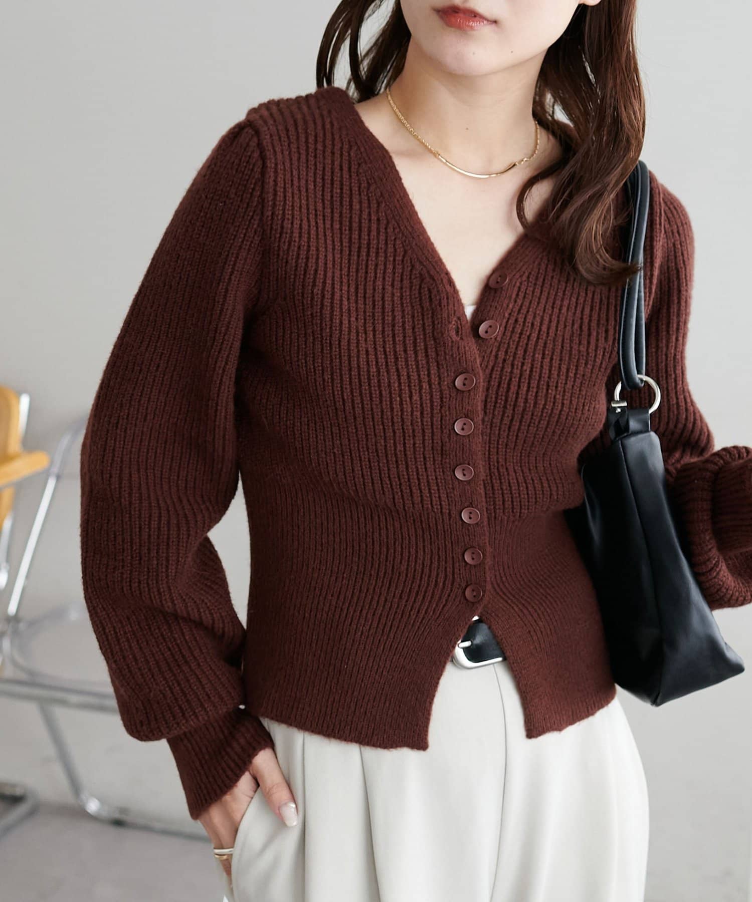 コンパクトなシルエットながらも、リブ編み特有の伸縮性があり、体のラインを拾いすぎず程よくフィット。