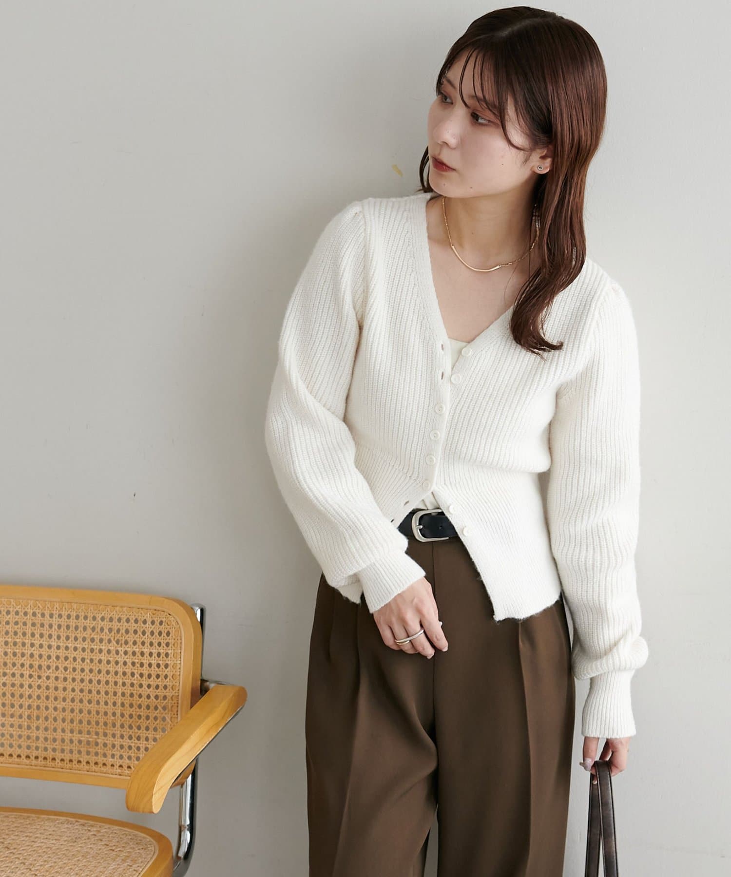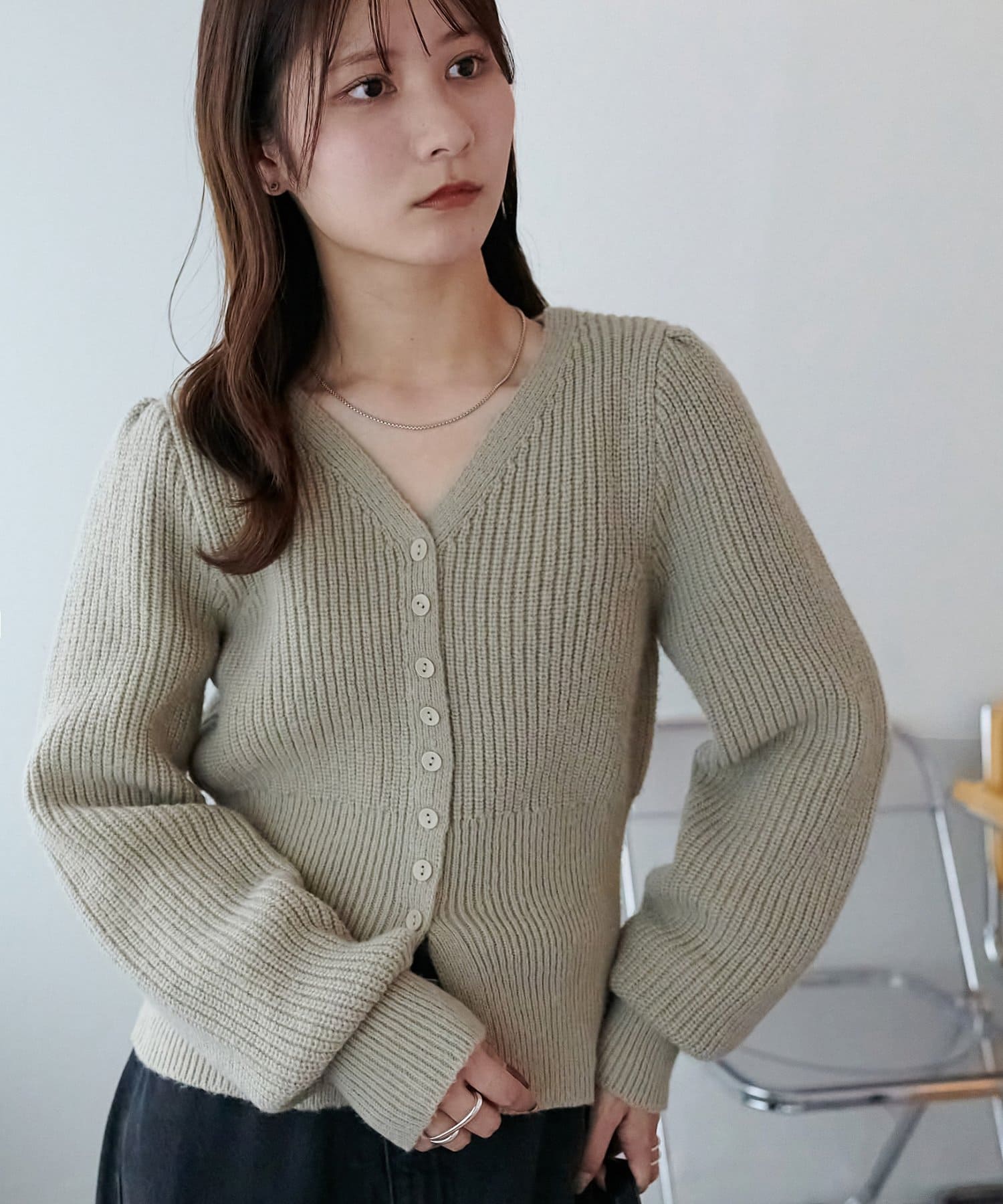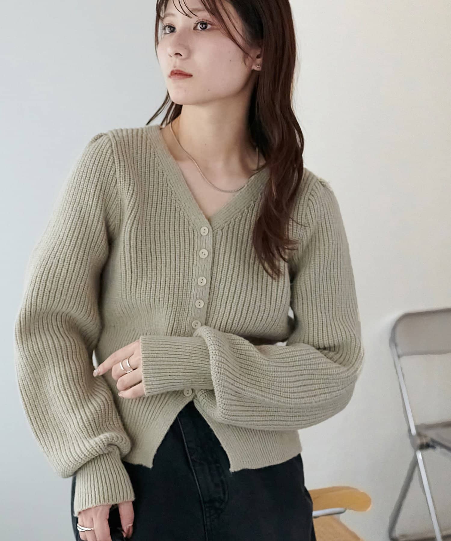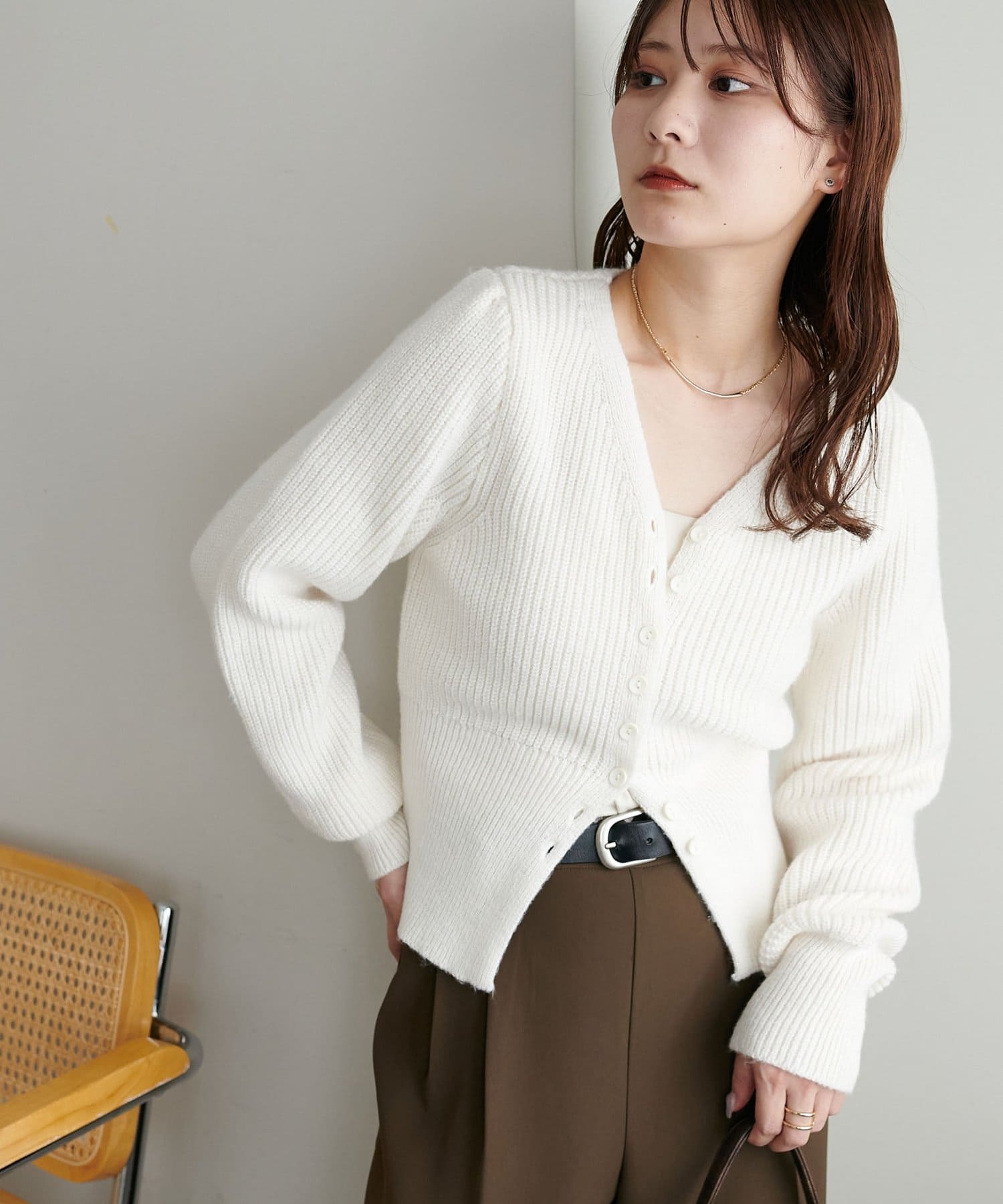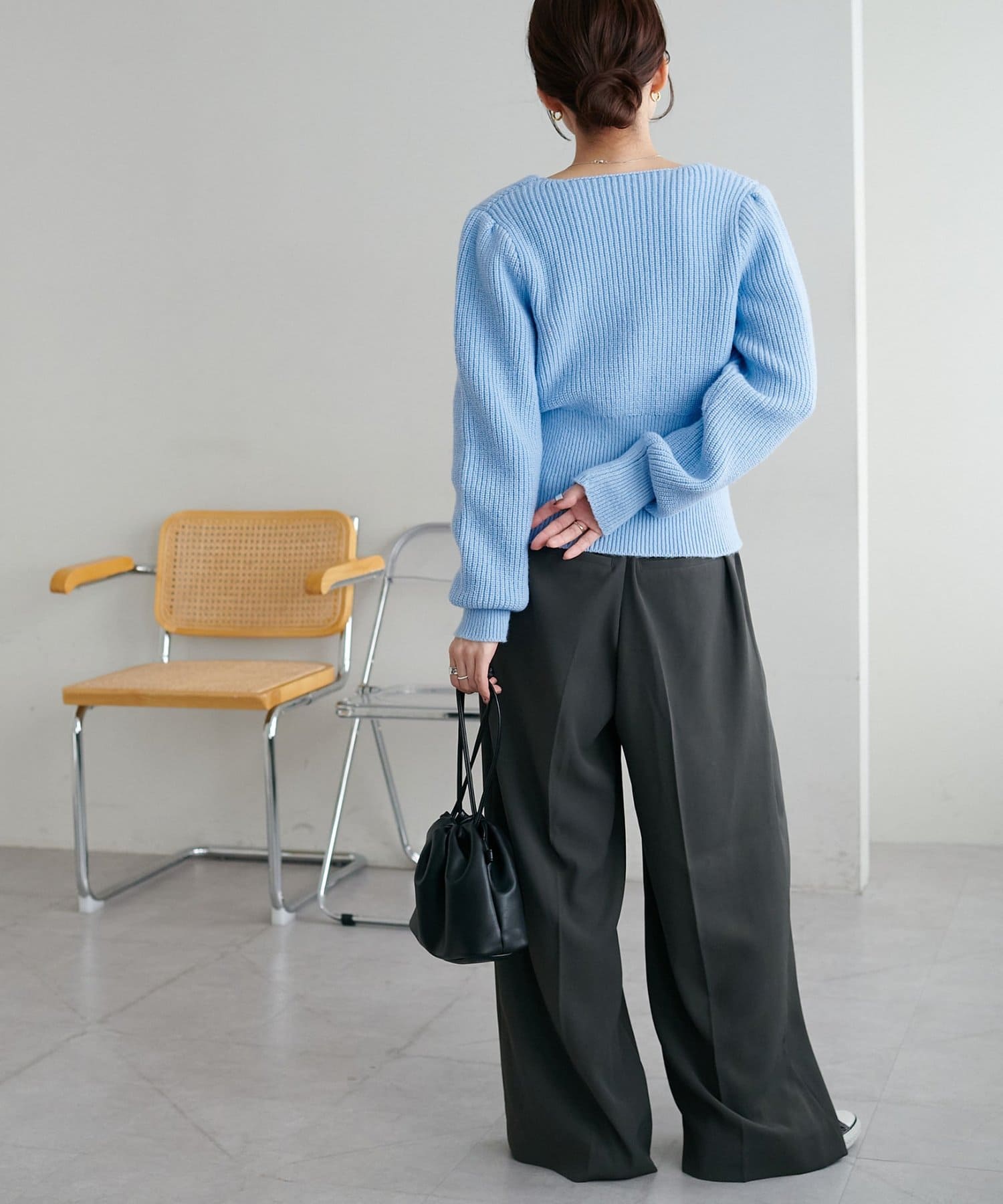 コンパクトなシルエットながらも、リブ編み特有の伸縮性があり、体のラインを拾いすぎず程よくフィット。
