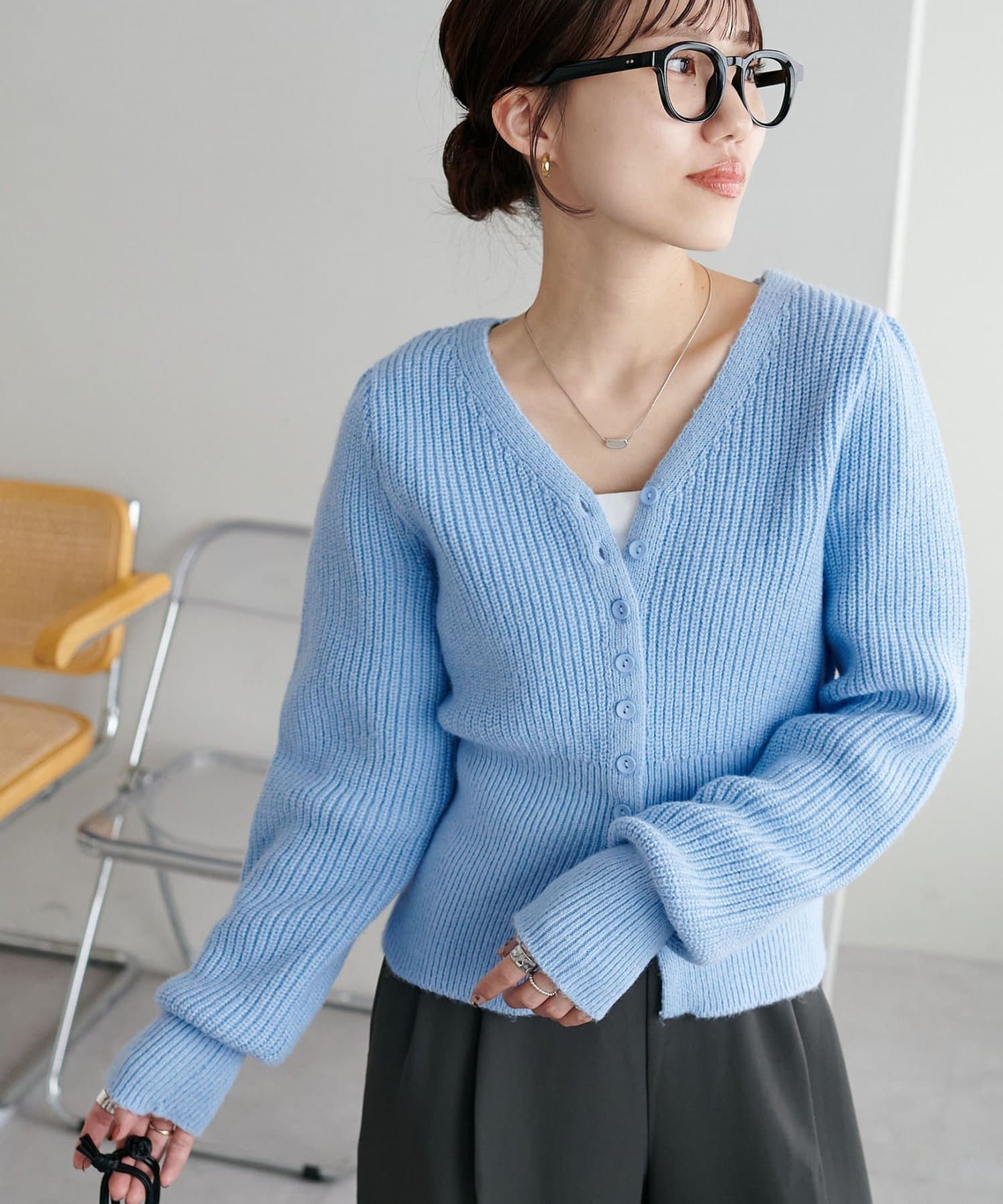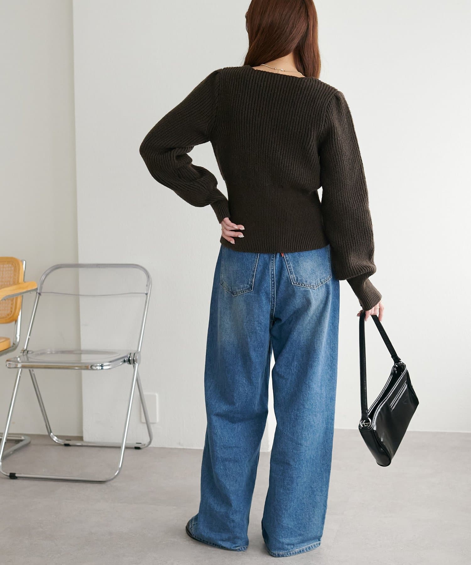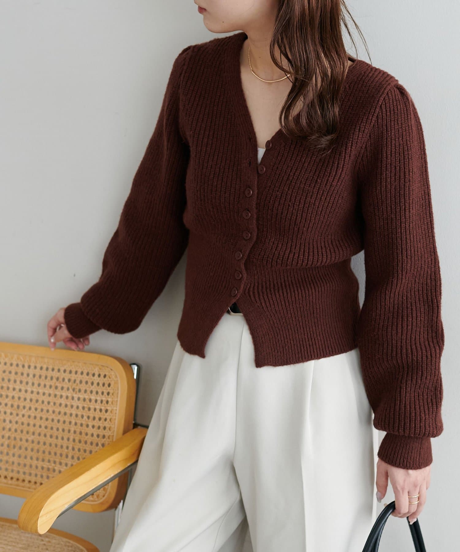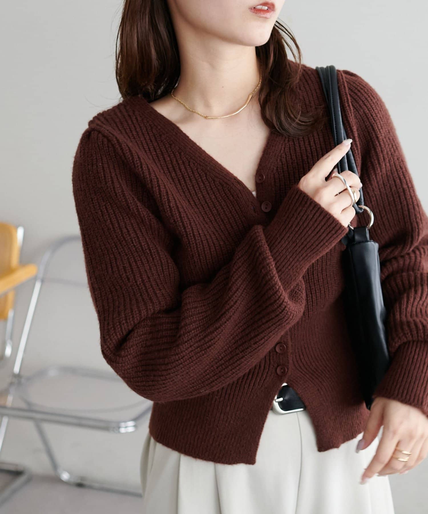 コンパクトなシルエットながらも、リブ編み特有の伸縮性があり、体のラインを拾いすぎず程よくフィット。