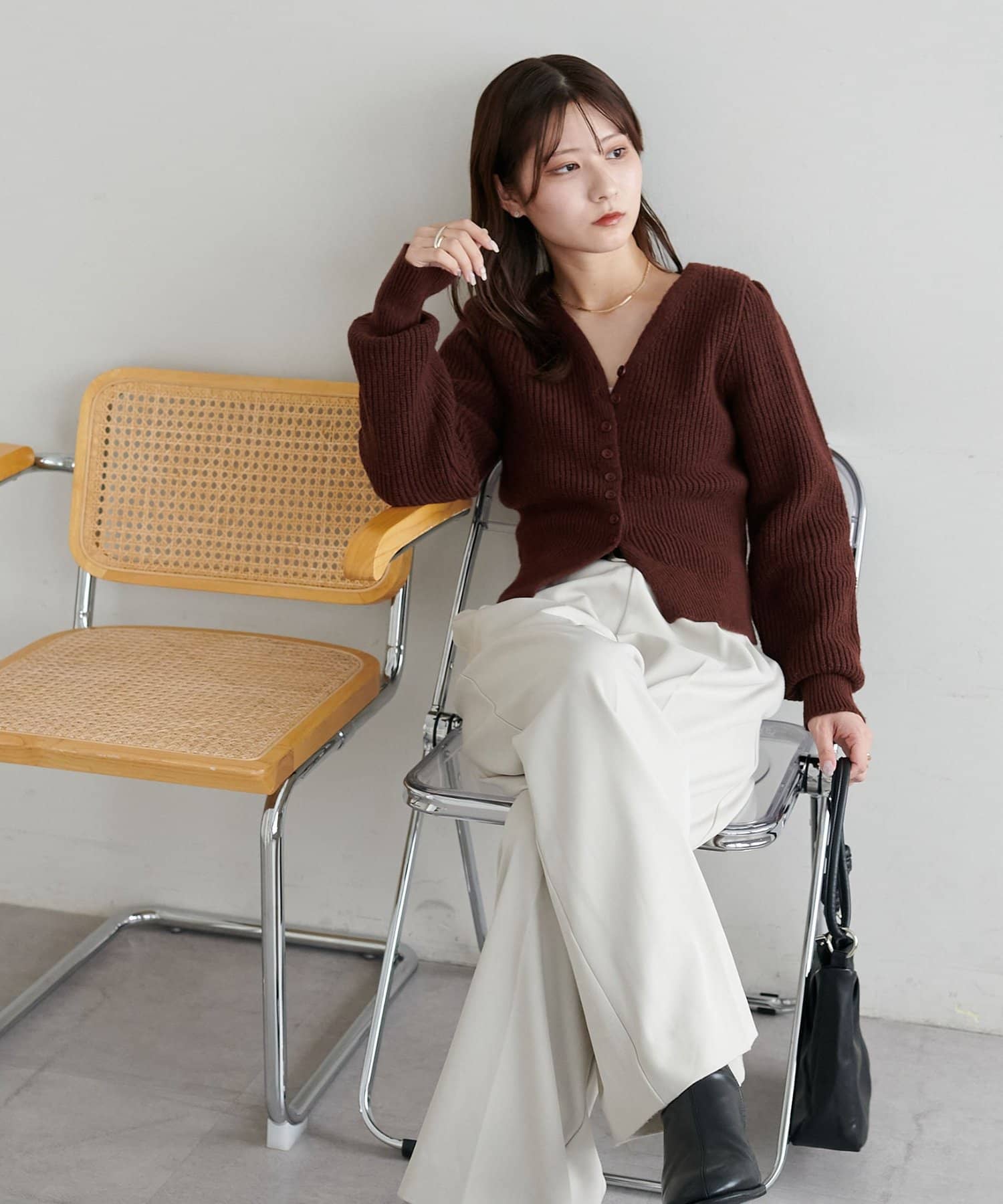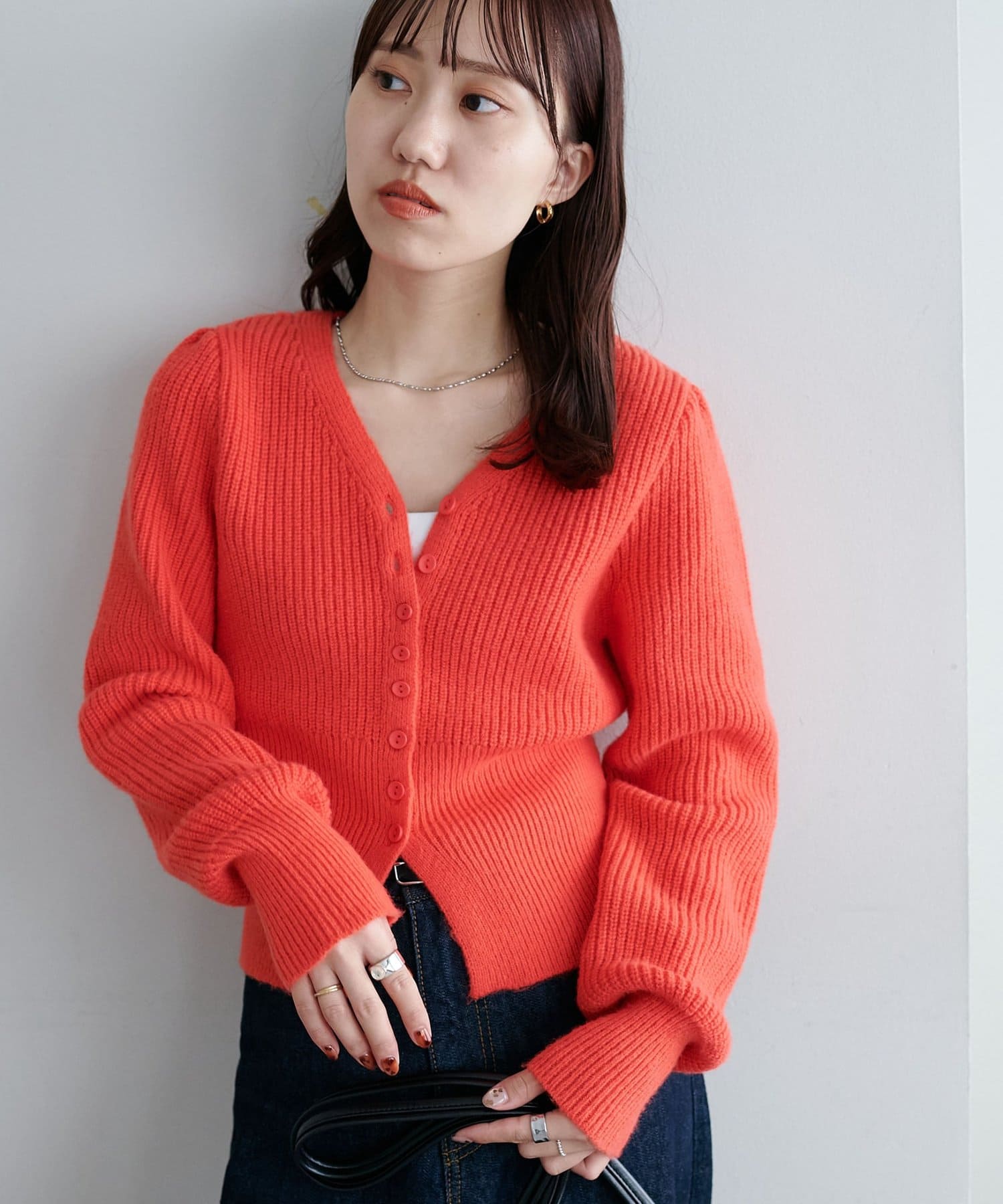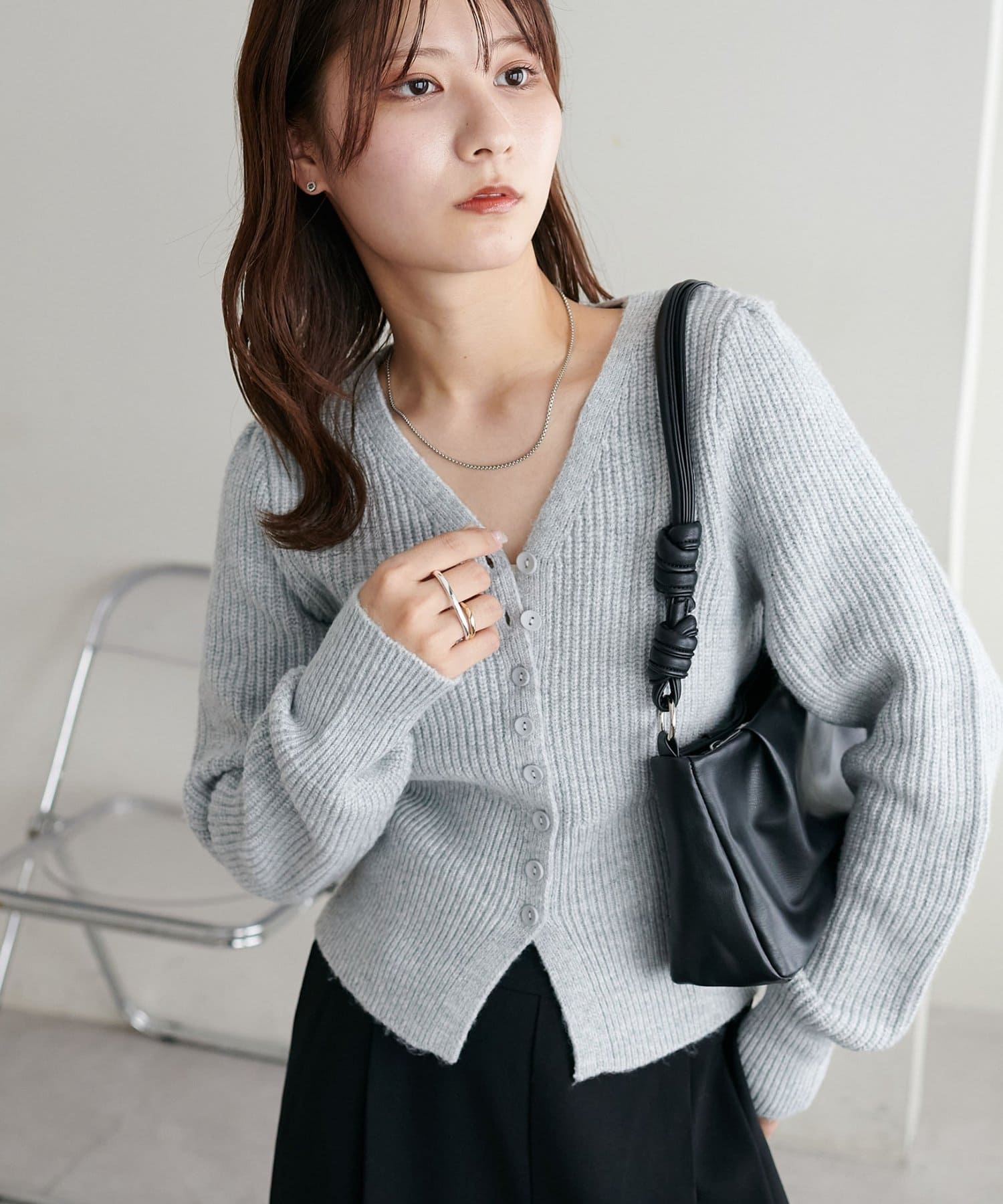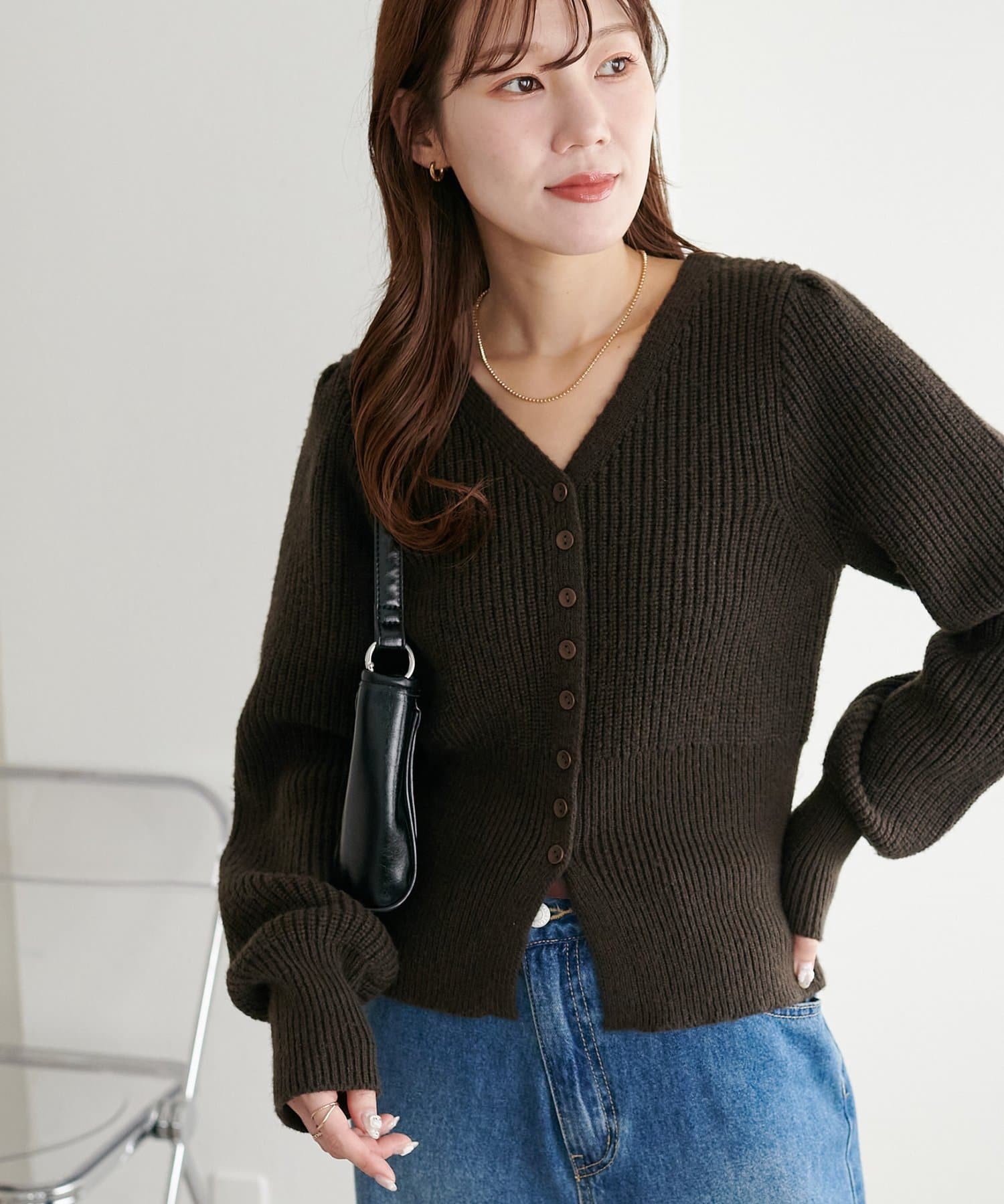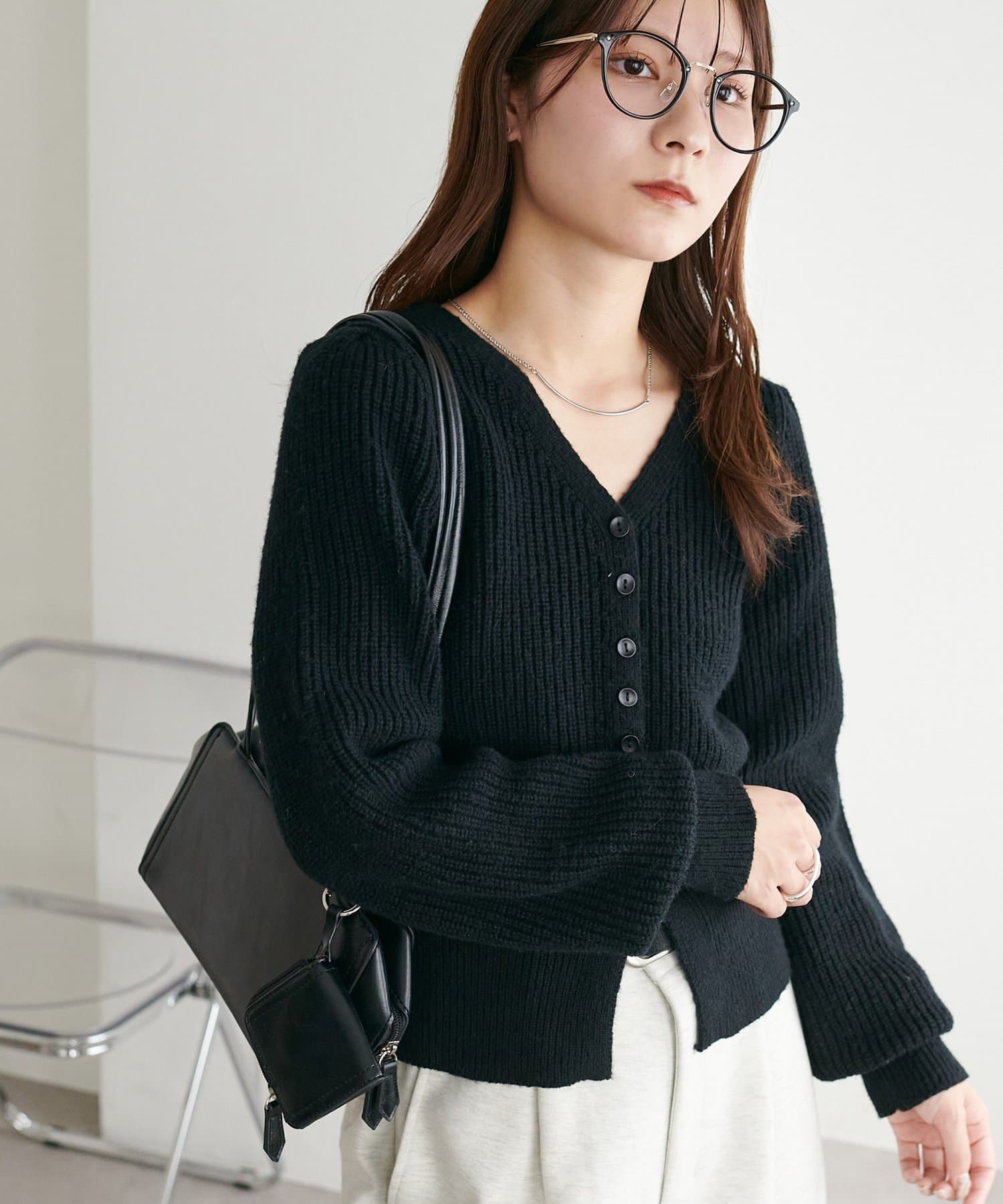 コンパクトなシルエットながらも、リブ編み特有の伸縮性があり、体のラインを拾いすぎず程よくフィット。