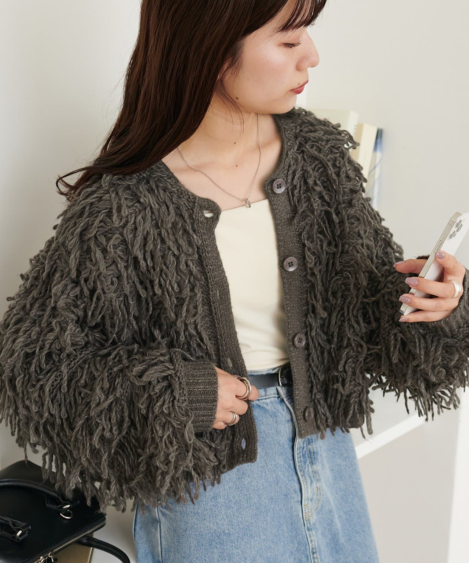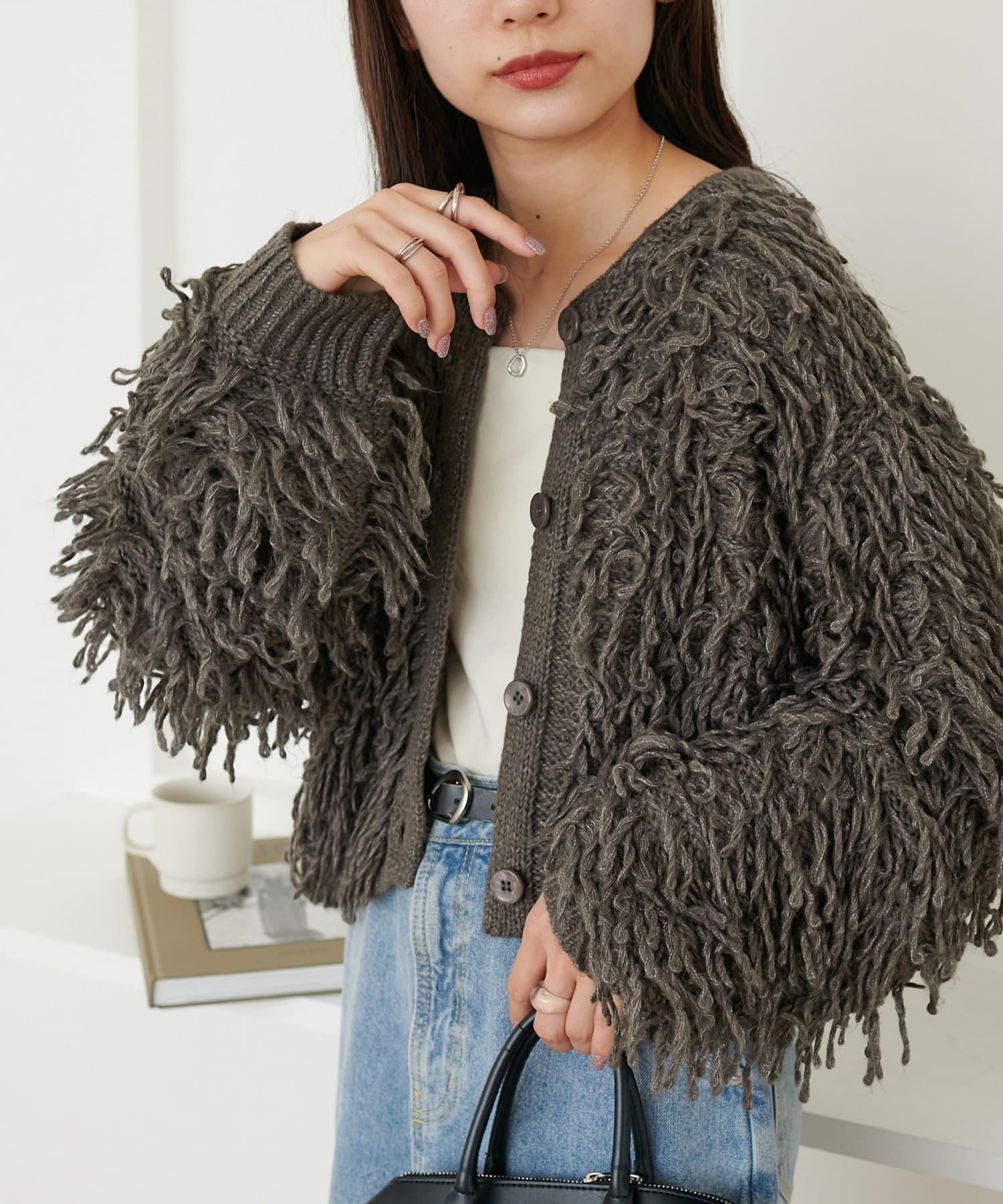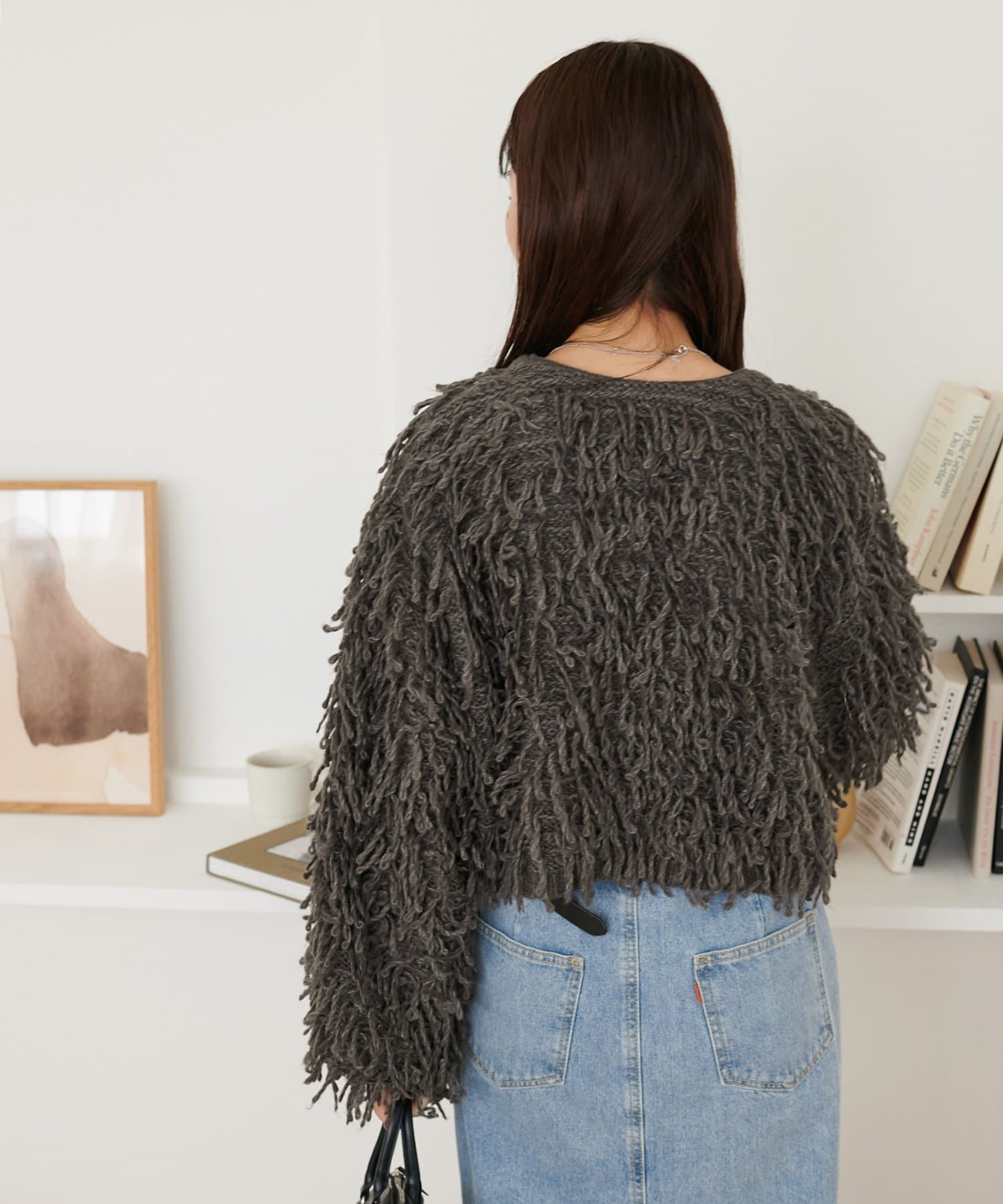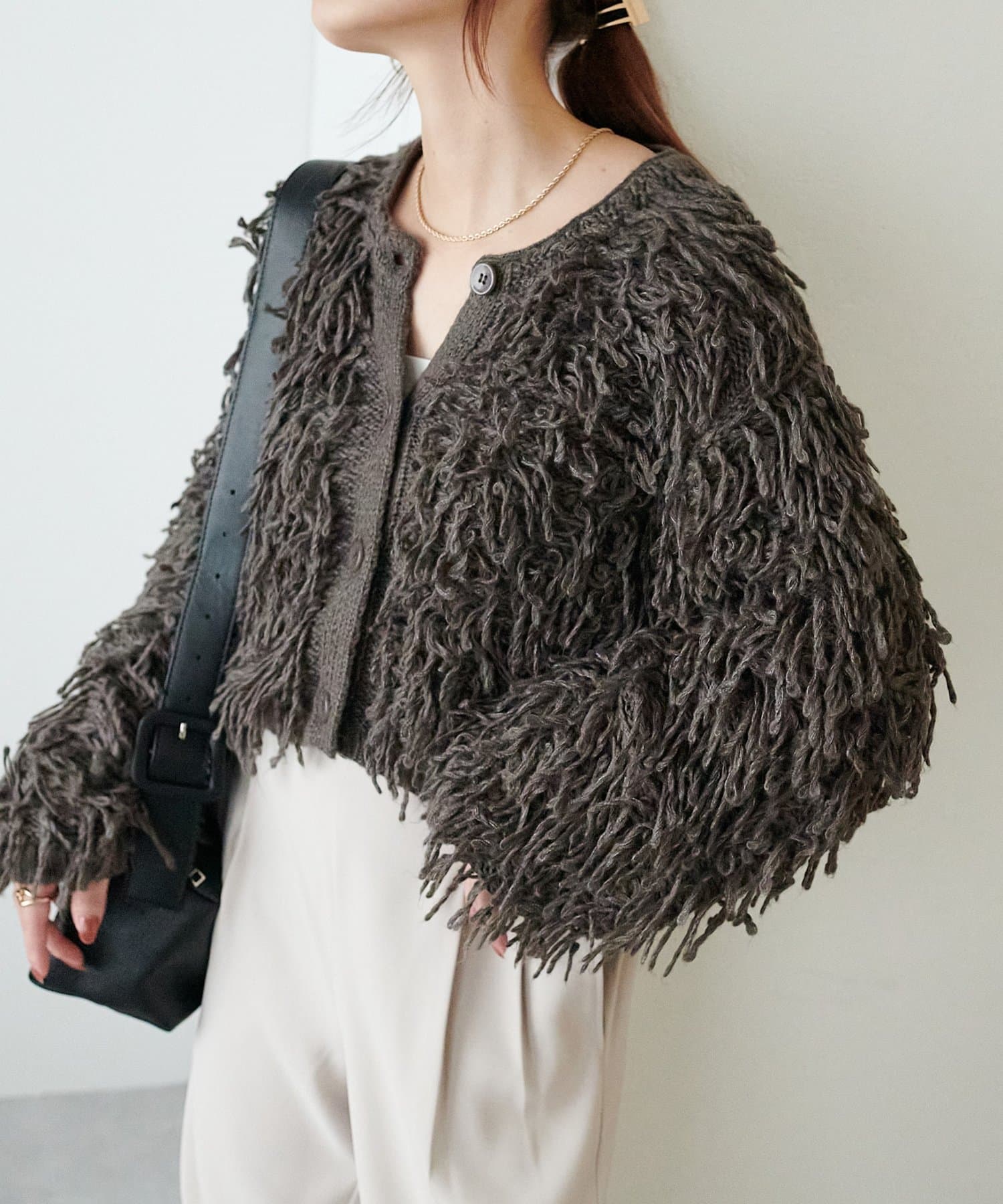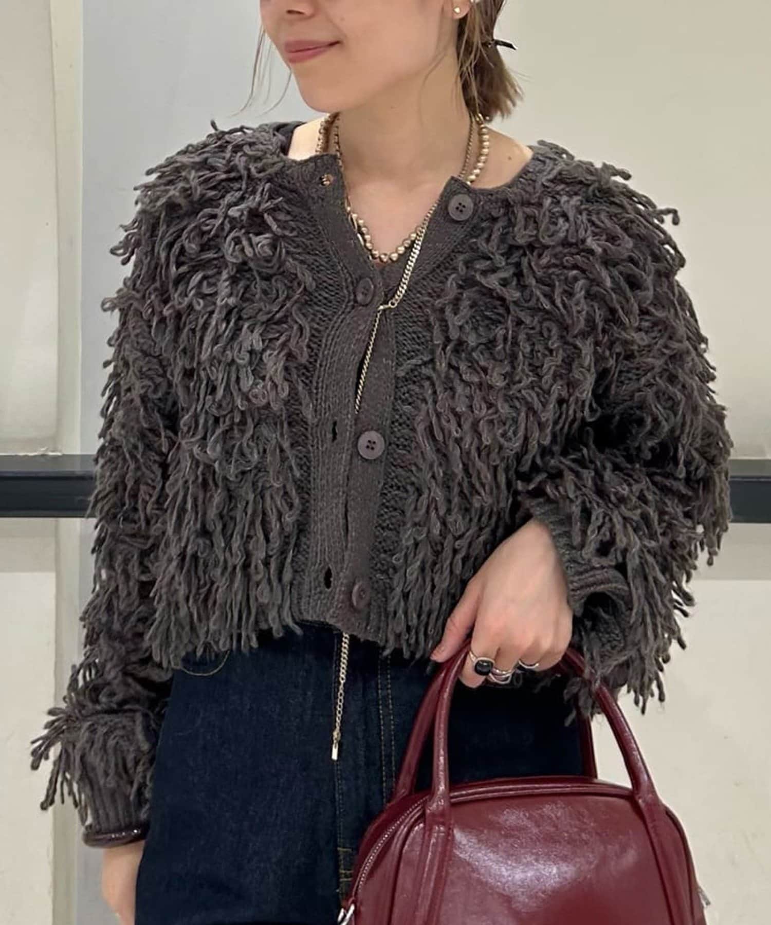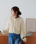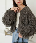目を惹くボリュームのあるフリンジ素材が魅力。ボリューム感がありながらも、ショート丈なのでスッキリ見えします。前後2WAY仕様で、カーディガンとしても着用できるので様々な着こなしを楽しめます♩
