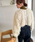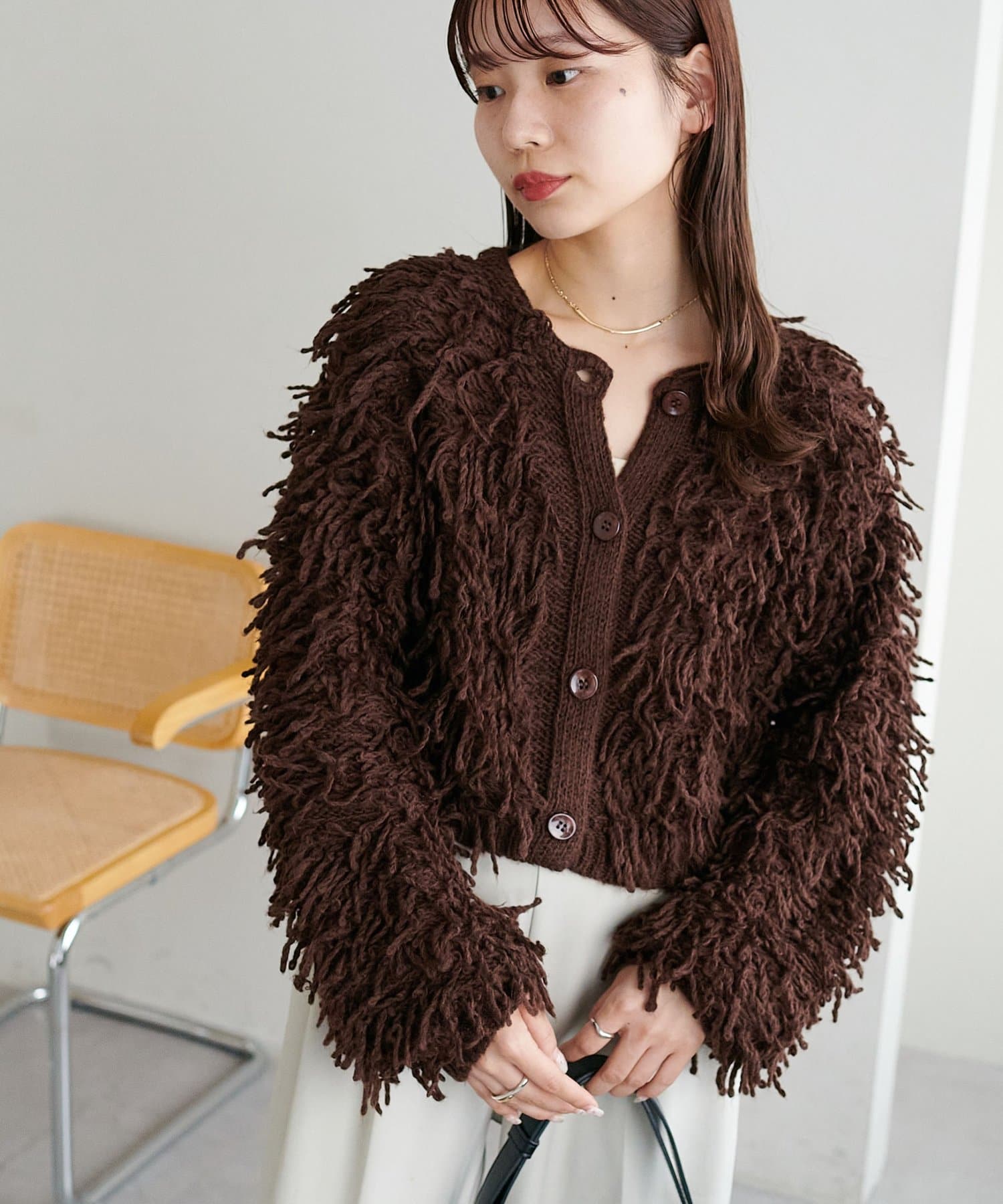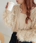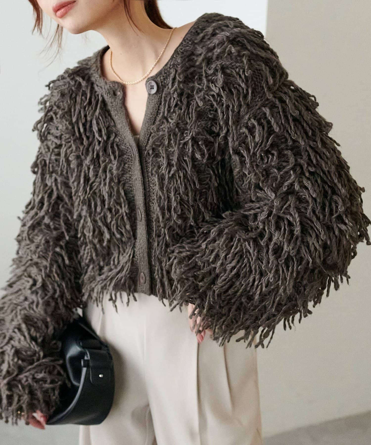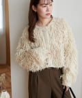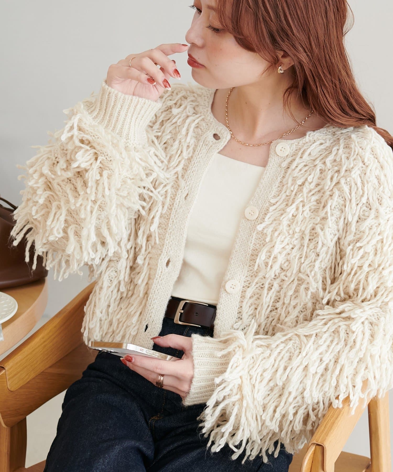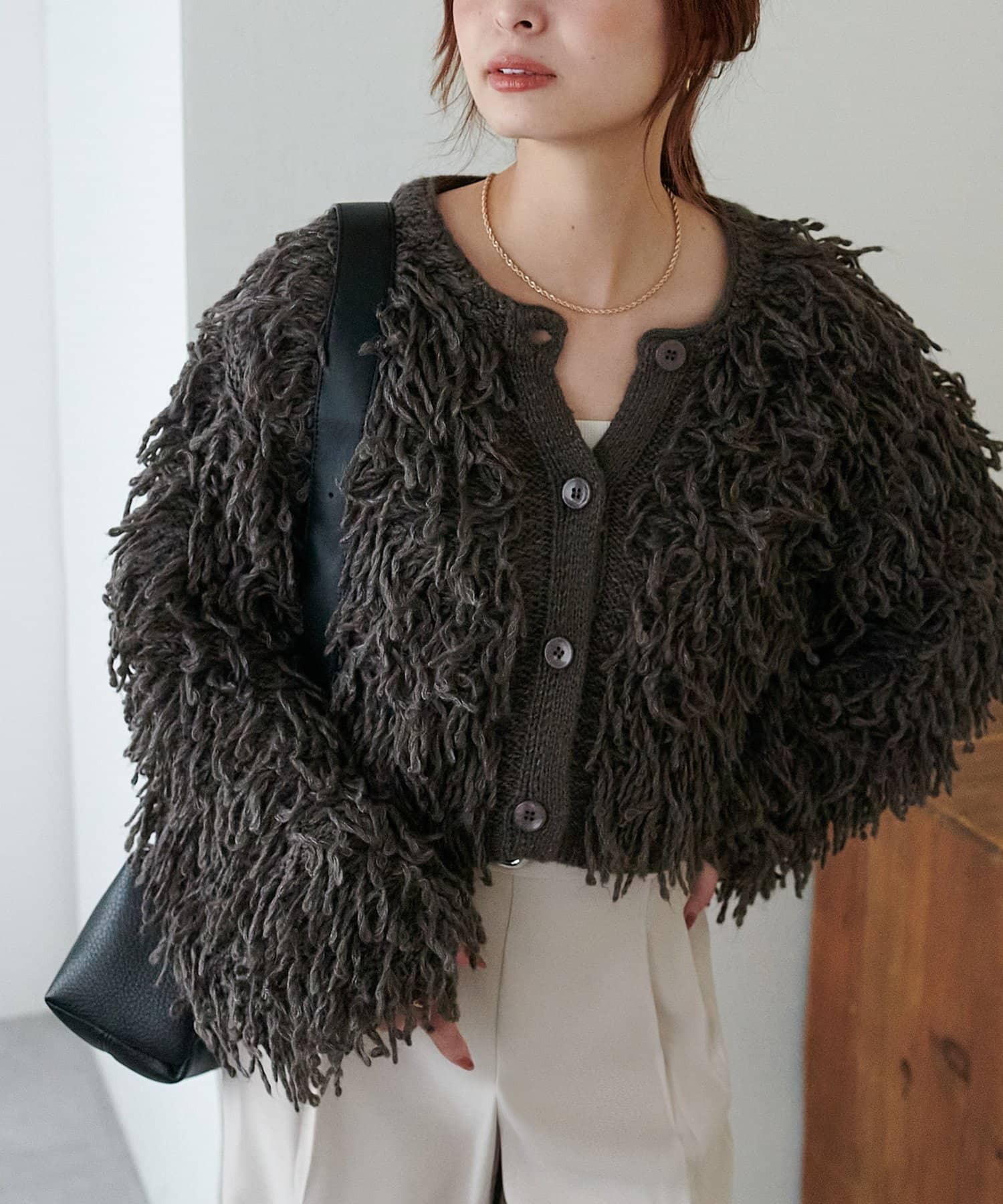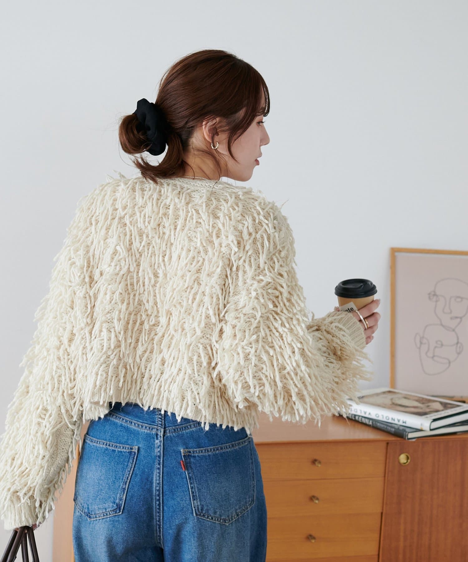 目を惹くボリュームのあるフリンジ素材が魅力。ボリューム感がありながらも、ショート丈なのでスッキリ見えします。前後2WAY仕様で、カーディガンとしても着用できるので様々な着こなしを楽しめます♩