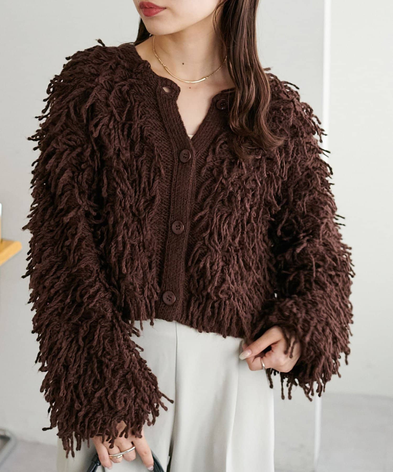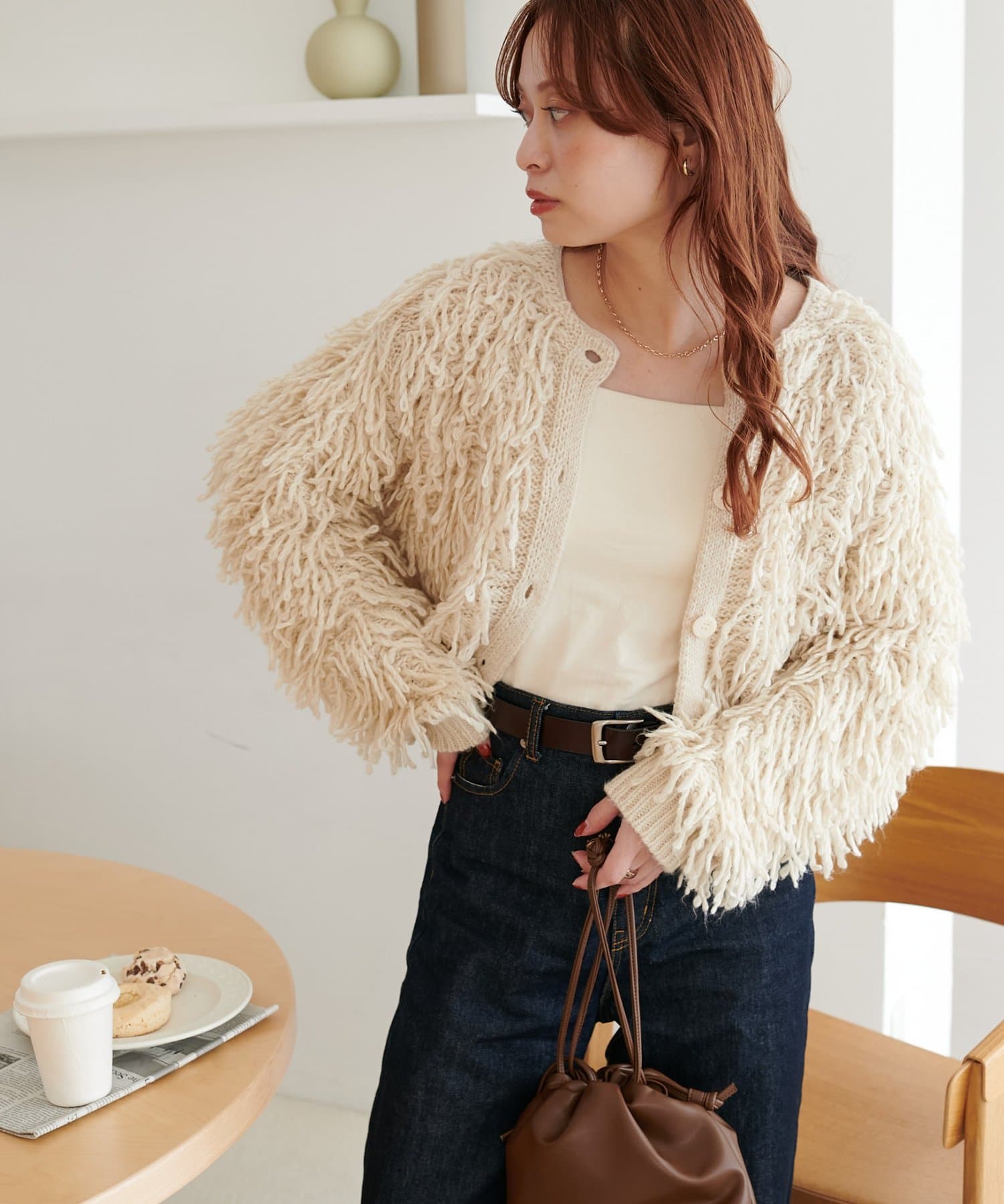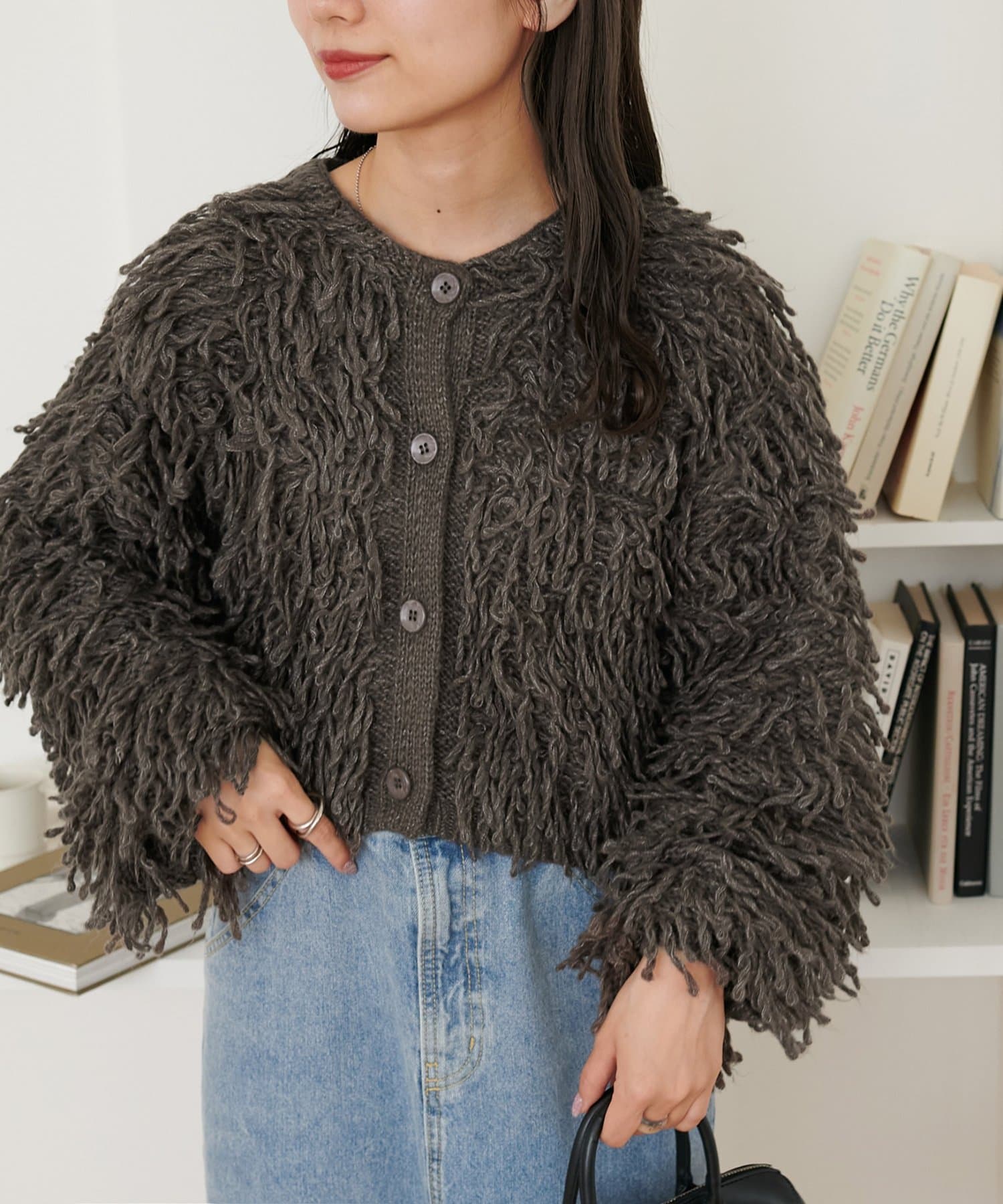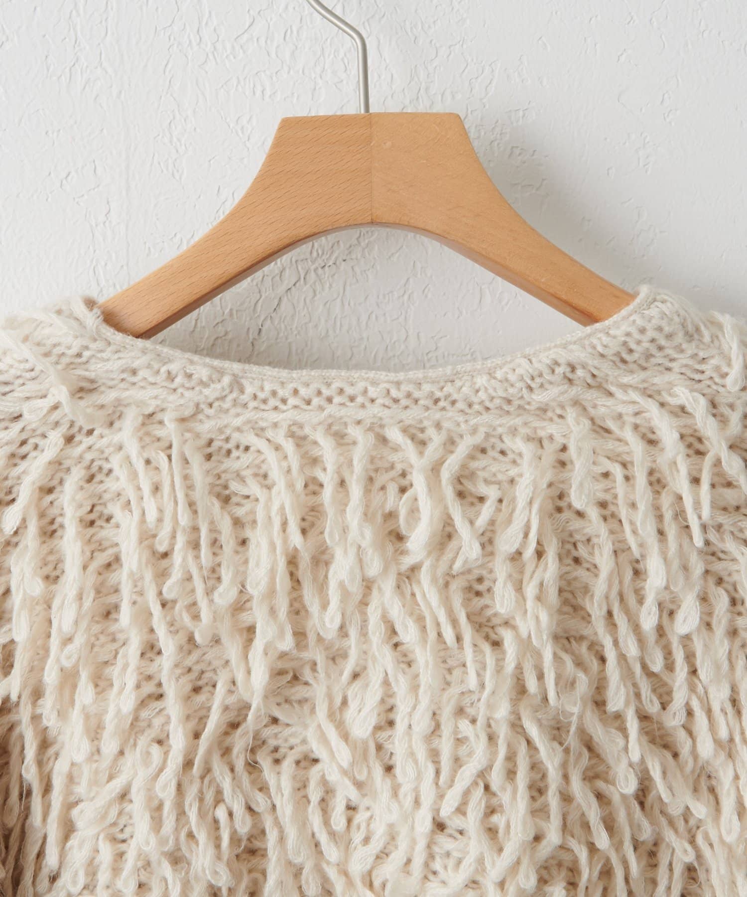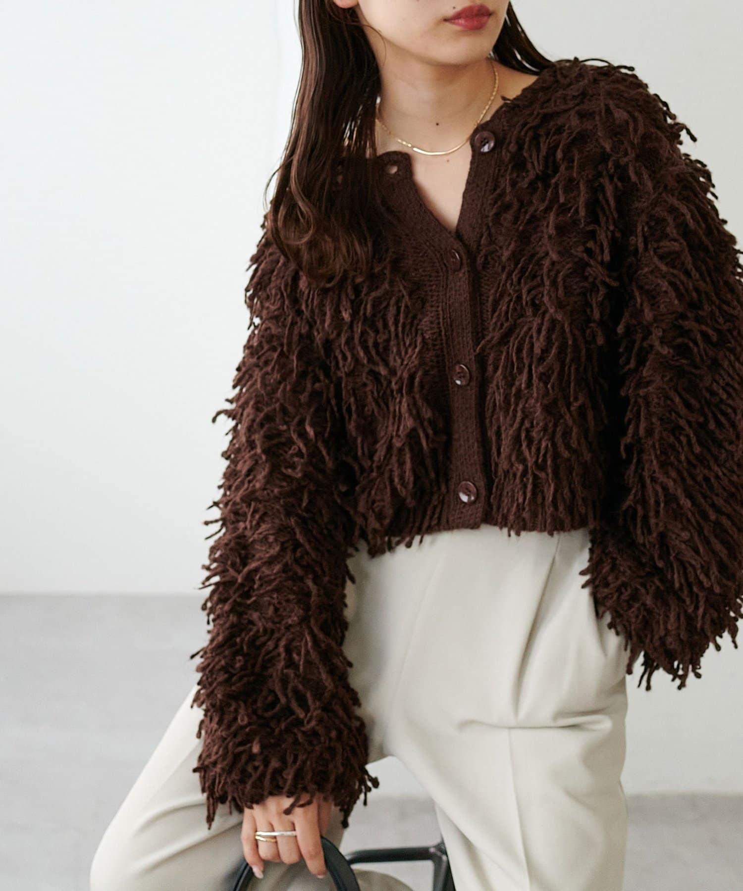 目を惹くボリュームのあるフリンジ素材が魅力。ボリューム感がありながらも、ショート丈なのでスッキリ見えします。前後2WAY仕様で、カーディガンとしても着用できるので様々な着こなしを楽しめます♩