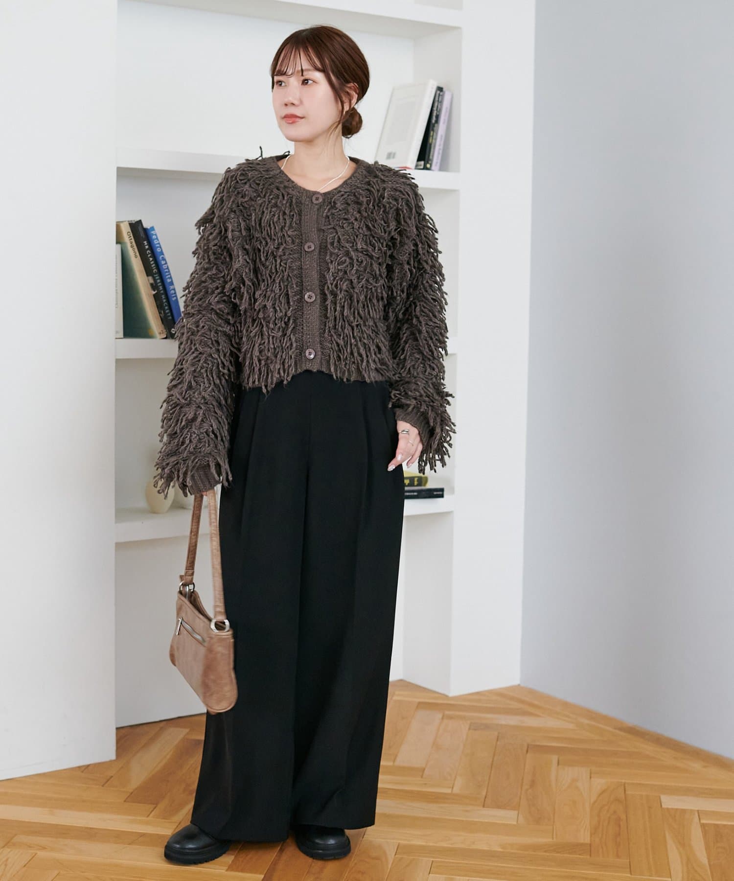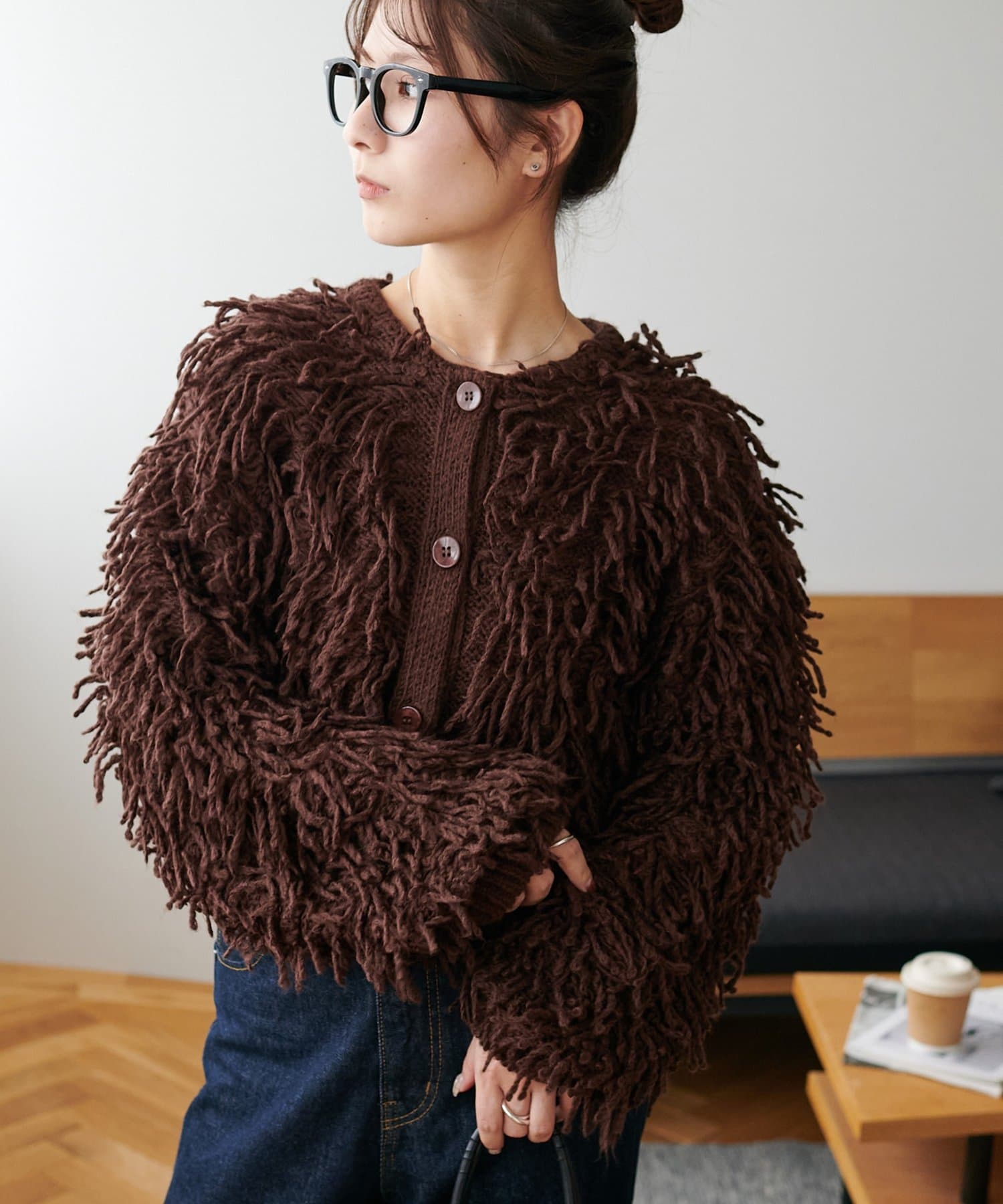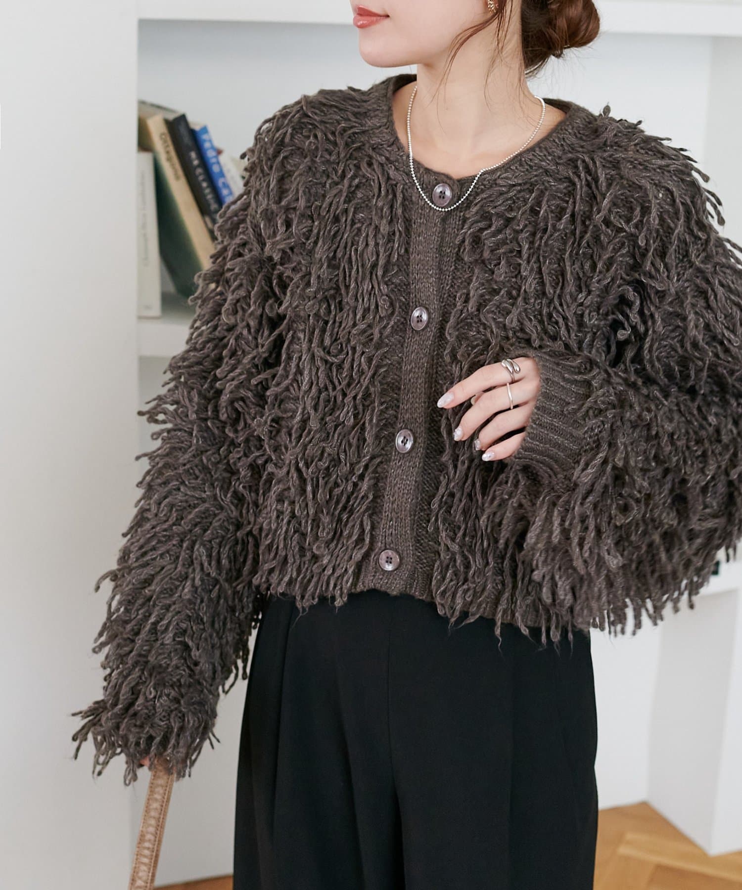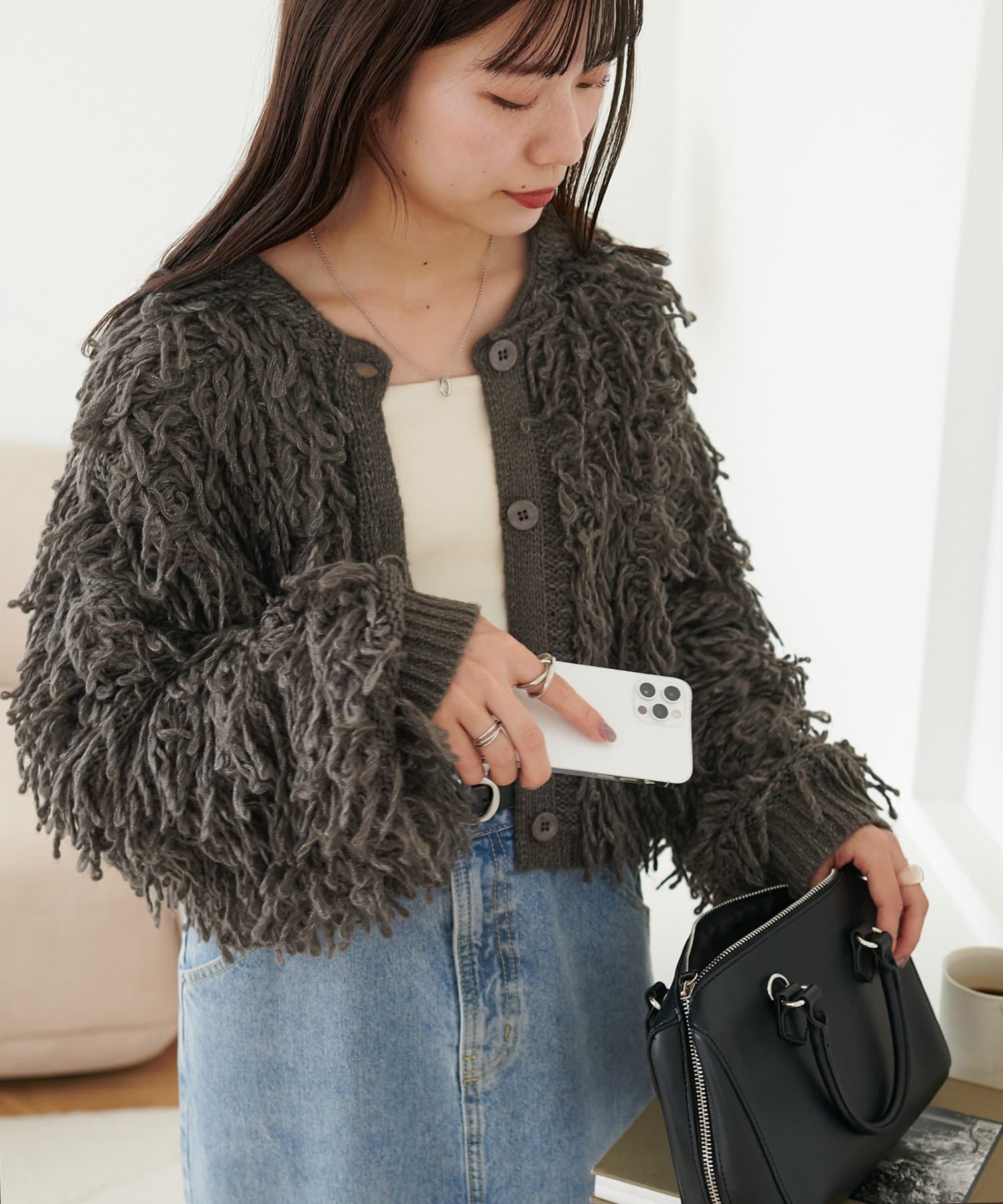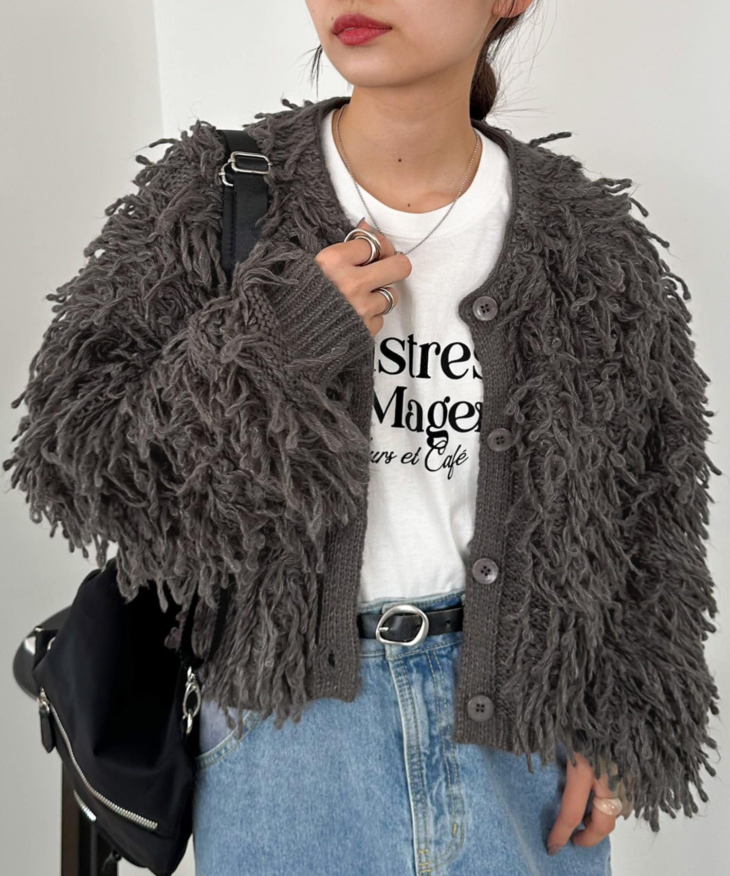 目を惹くボリュームのあるフリンジ素材が魅力。ボリューム感がありながらも、ショート丈なのでスッキリ見えします。前後2WAY仕様で、カーディガンとしても着用できるので様々な着こなしを楽しめます♩