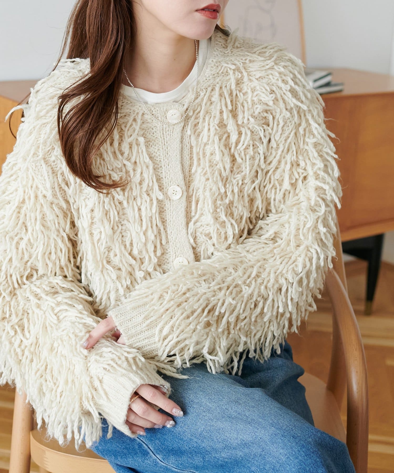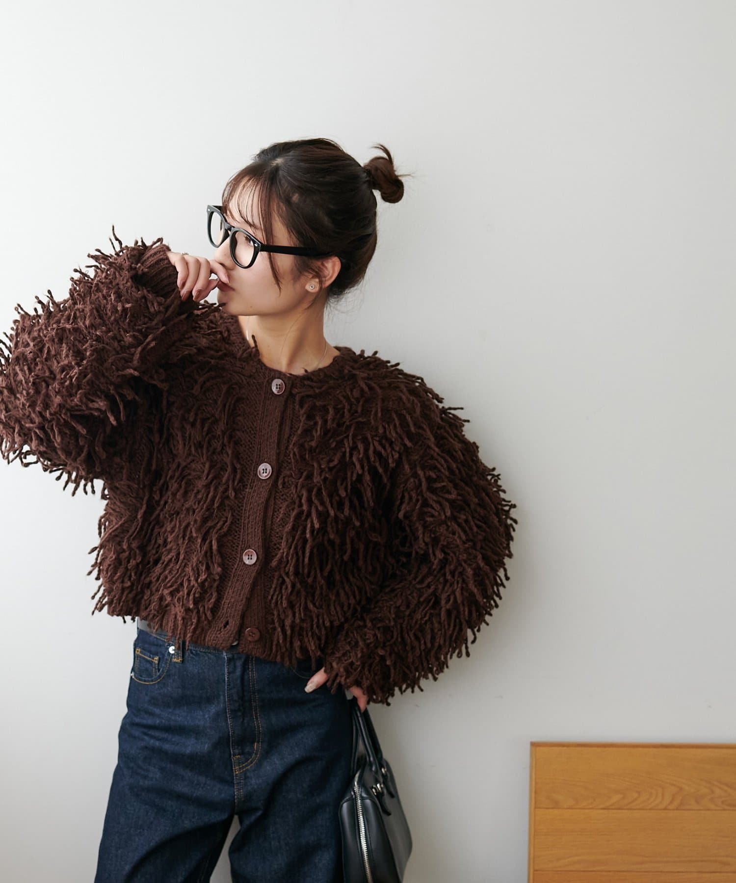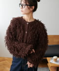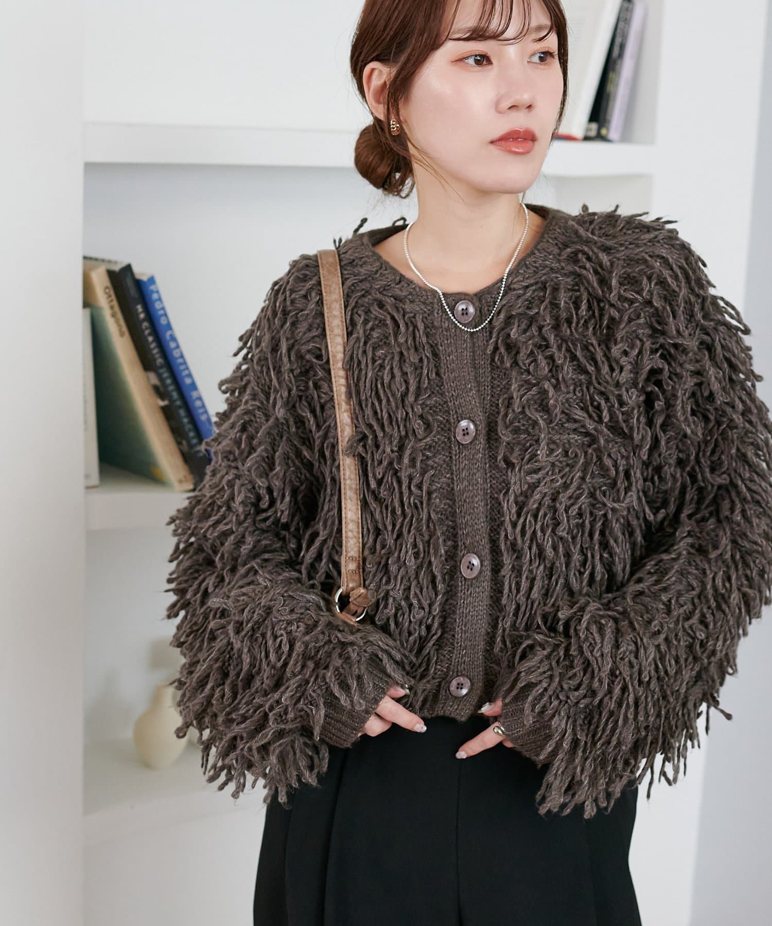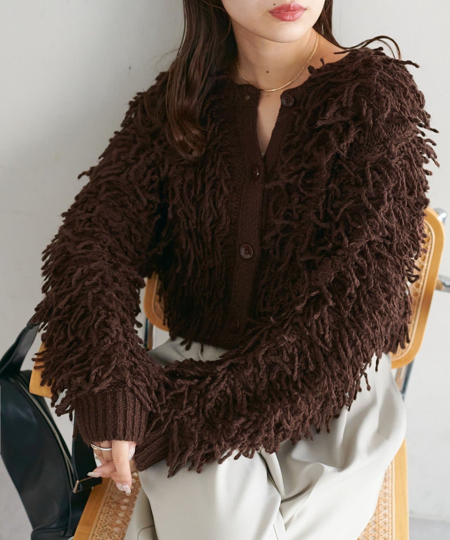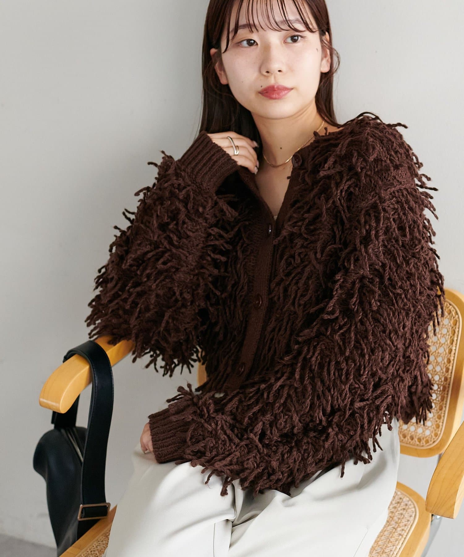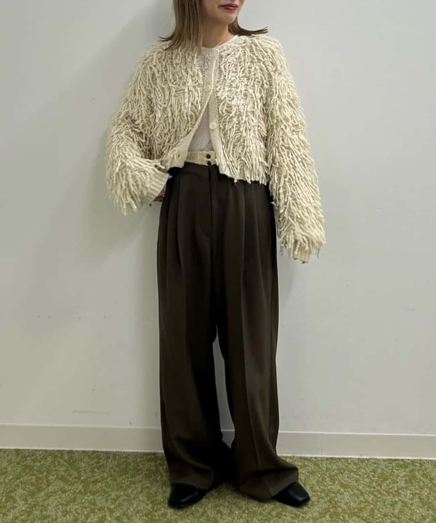 目を惹くボリュームのあるフリンジ素材が魅力。ボリューム感がありながらも、ショート丈なのでスッキリ見えします。前後2WAY仕様で、カーディガンとしても着用できるので様々な着こなしを楽しめます♩
