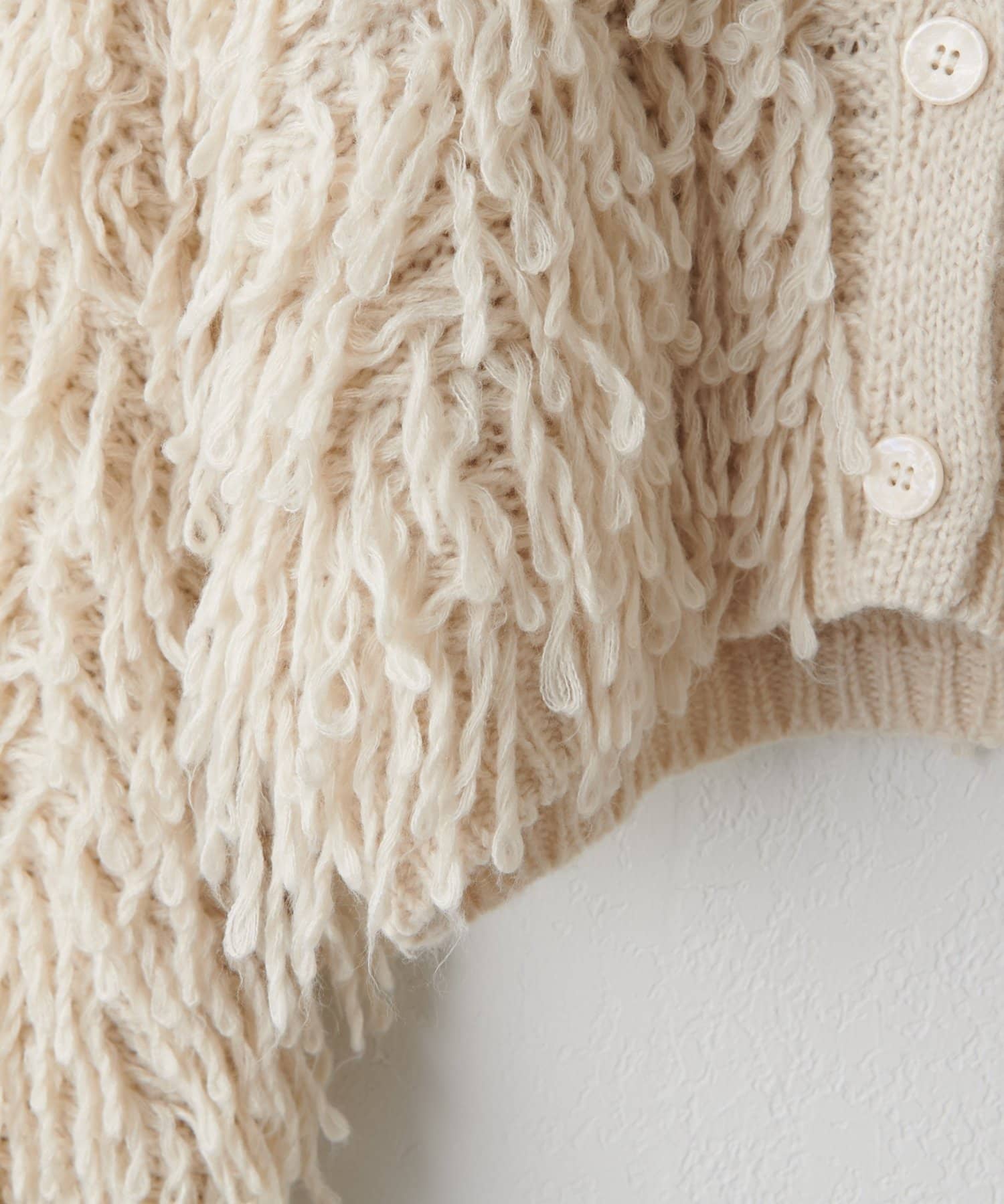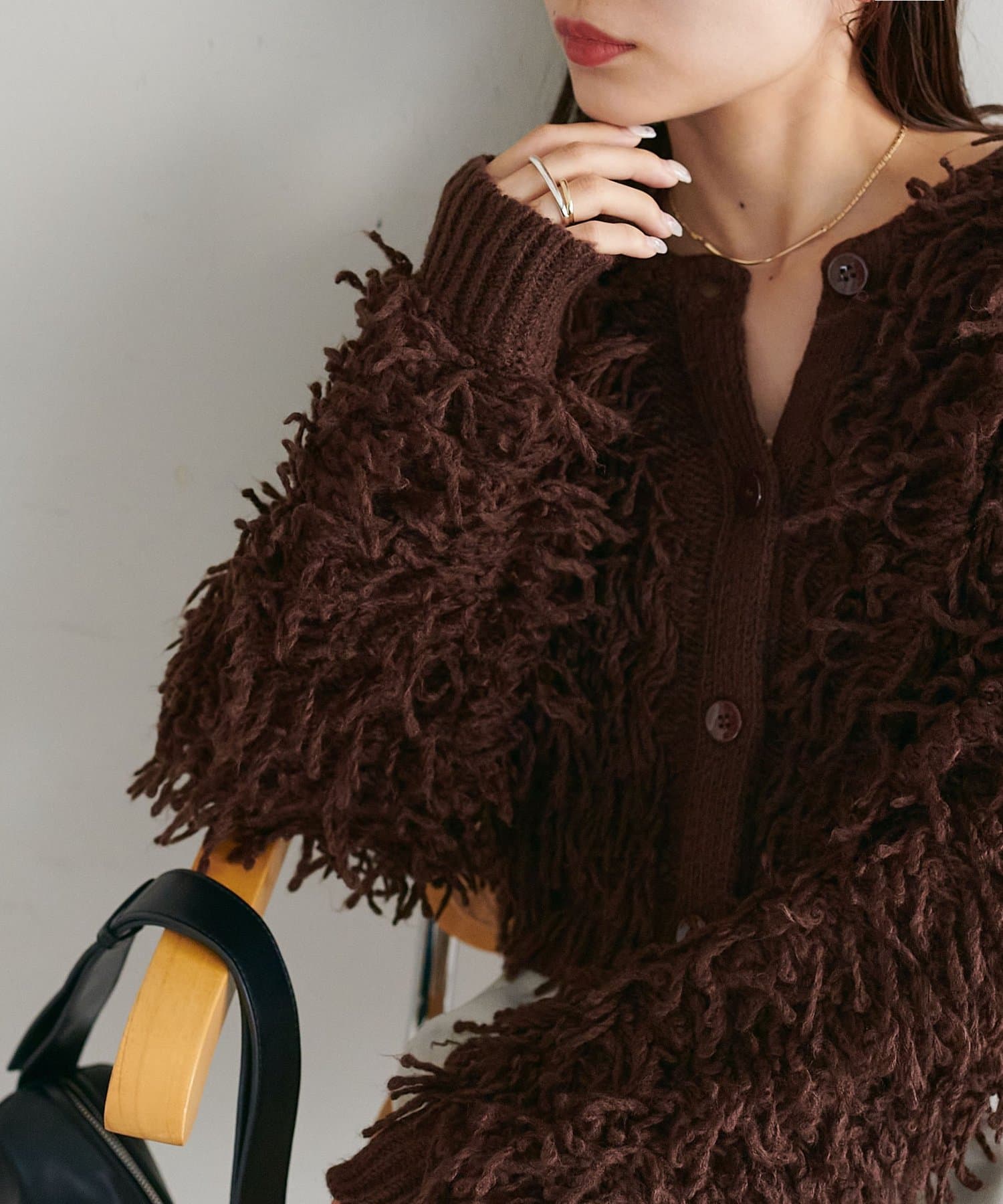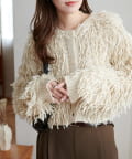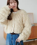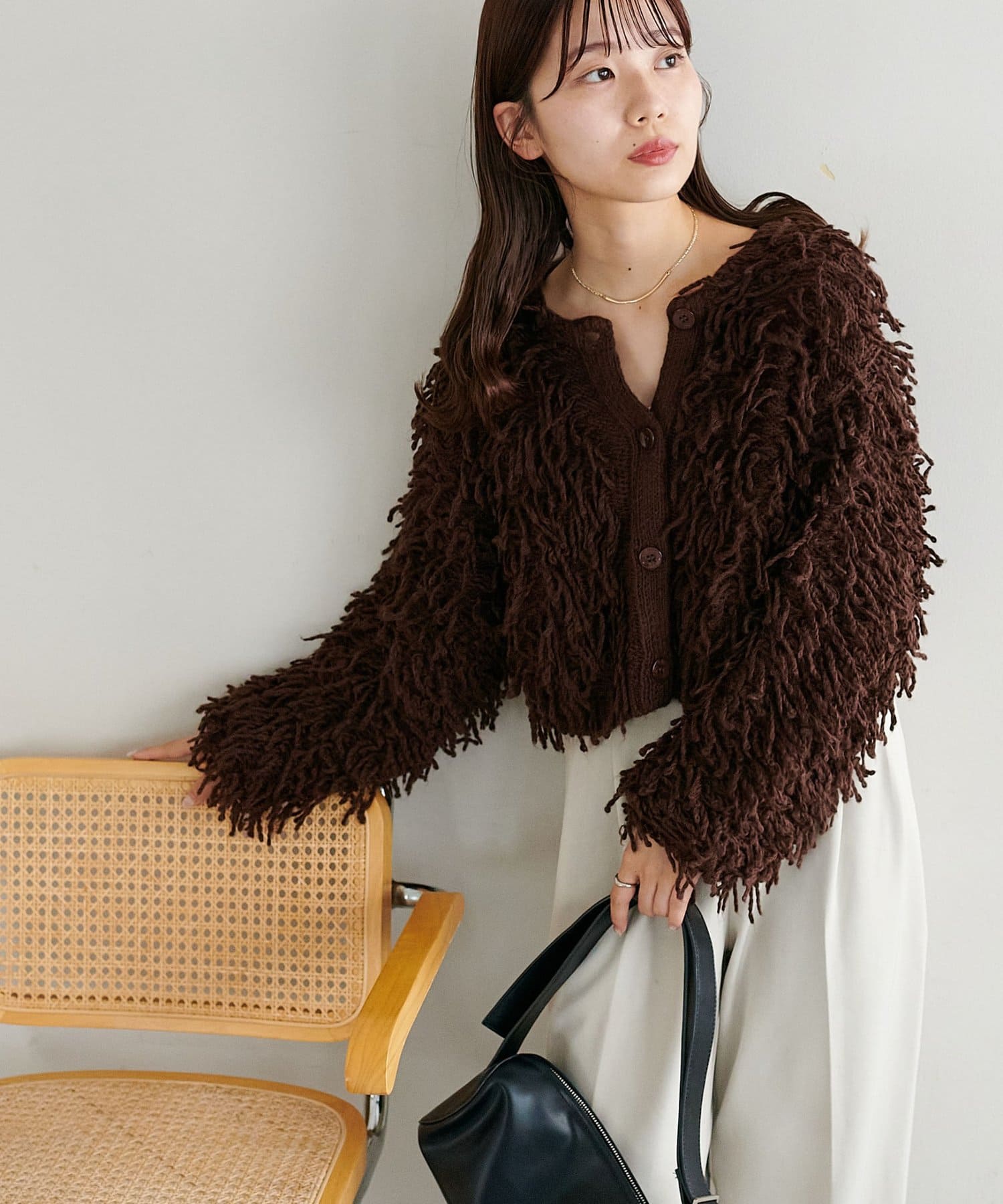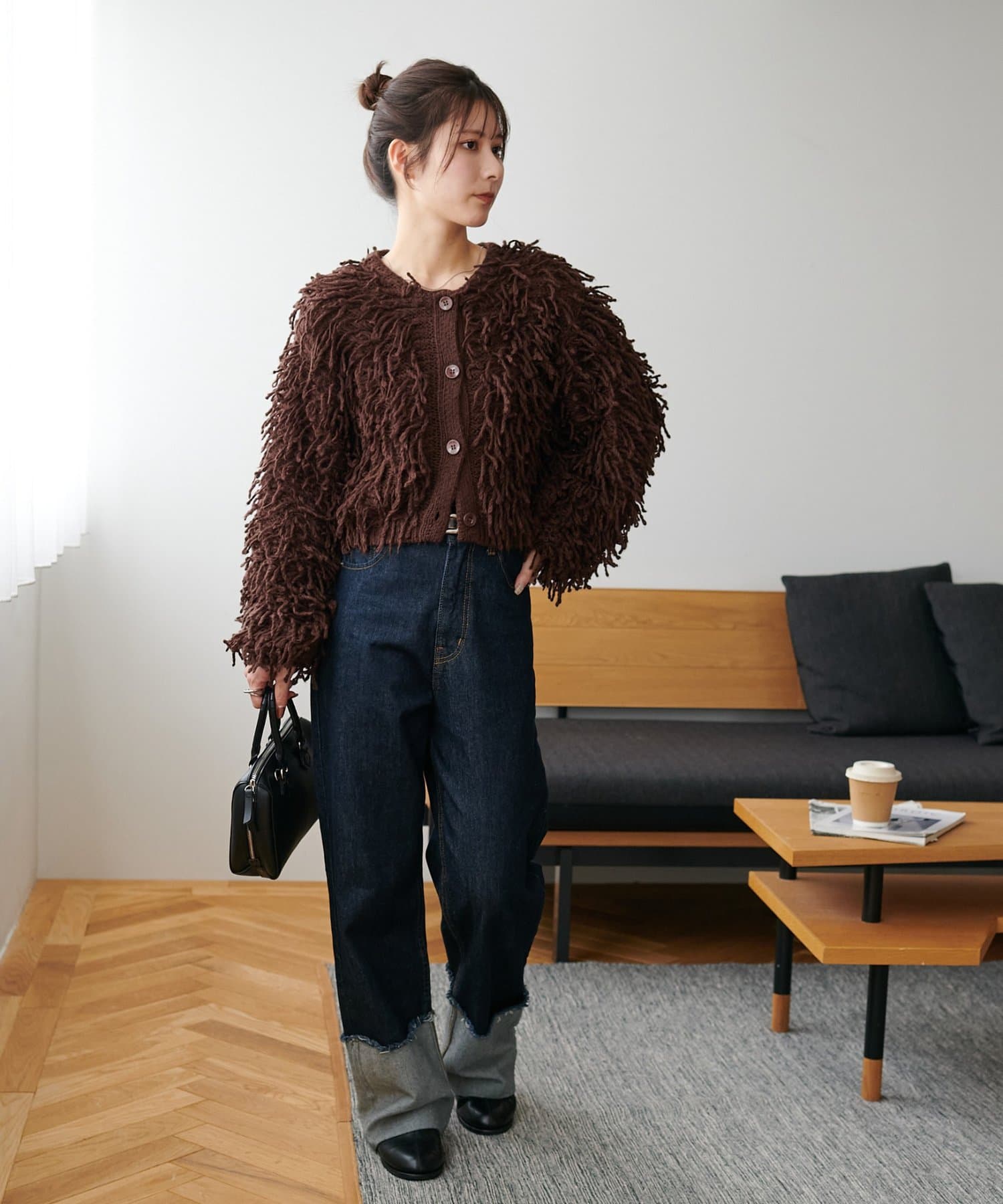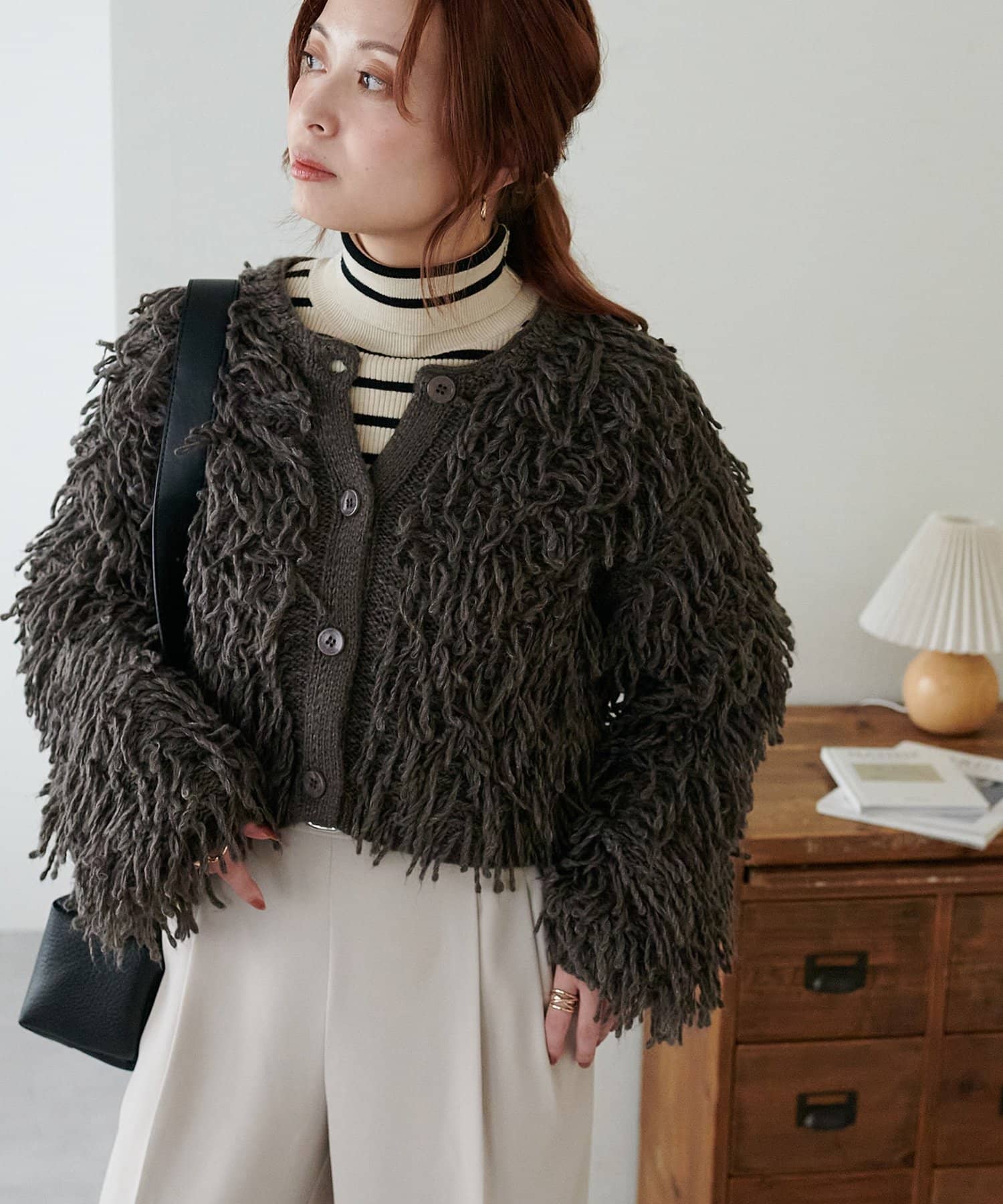 目を惹くボリュームのあるフリンジ素材が魅力。ボリューム感がありながらも、ショート丈なのでスッキリ見えします。前後2WAY仕様で、カーディガンとしても着用できるので様々な着こなしを楽しめます♩