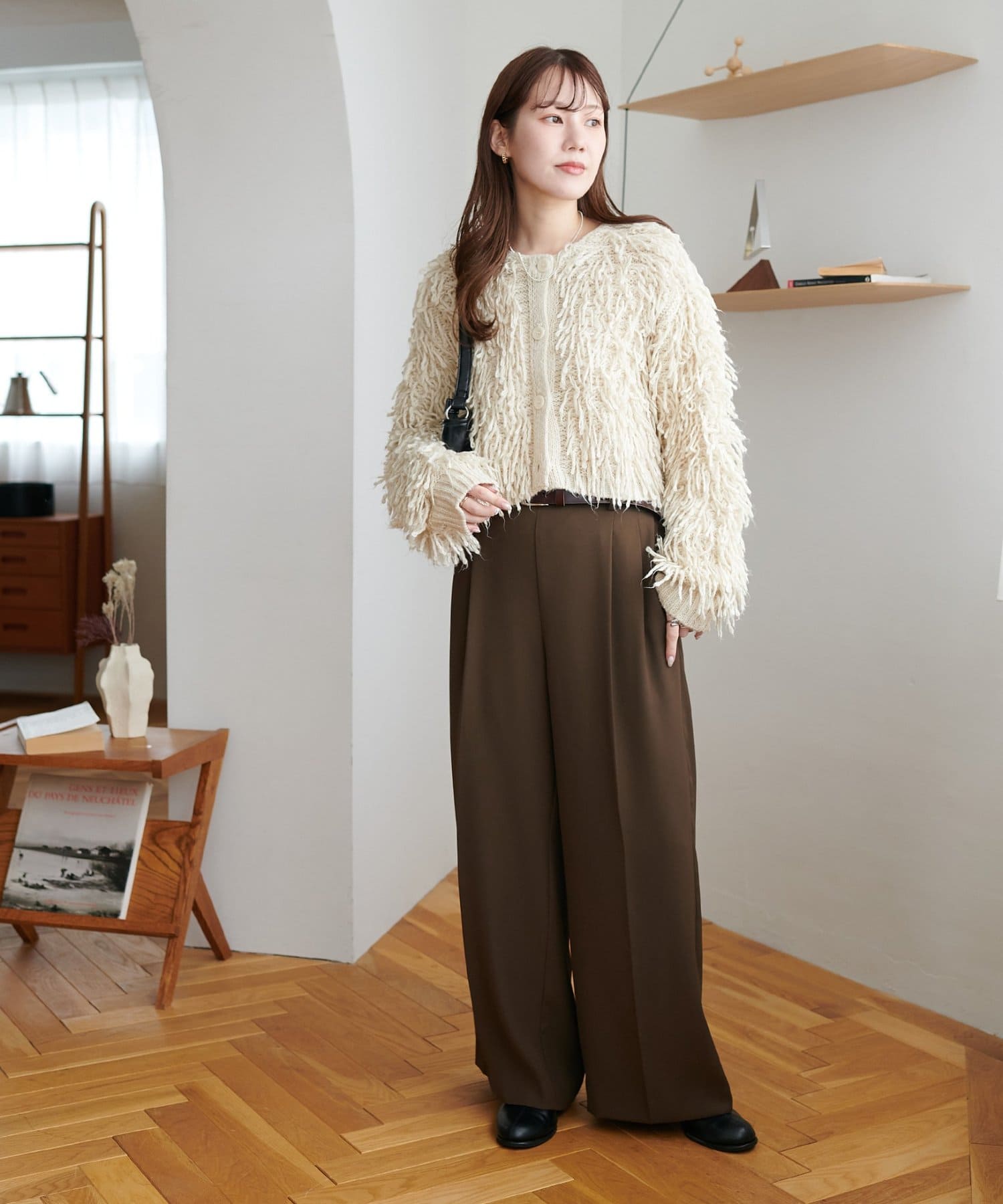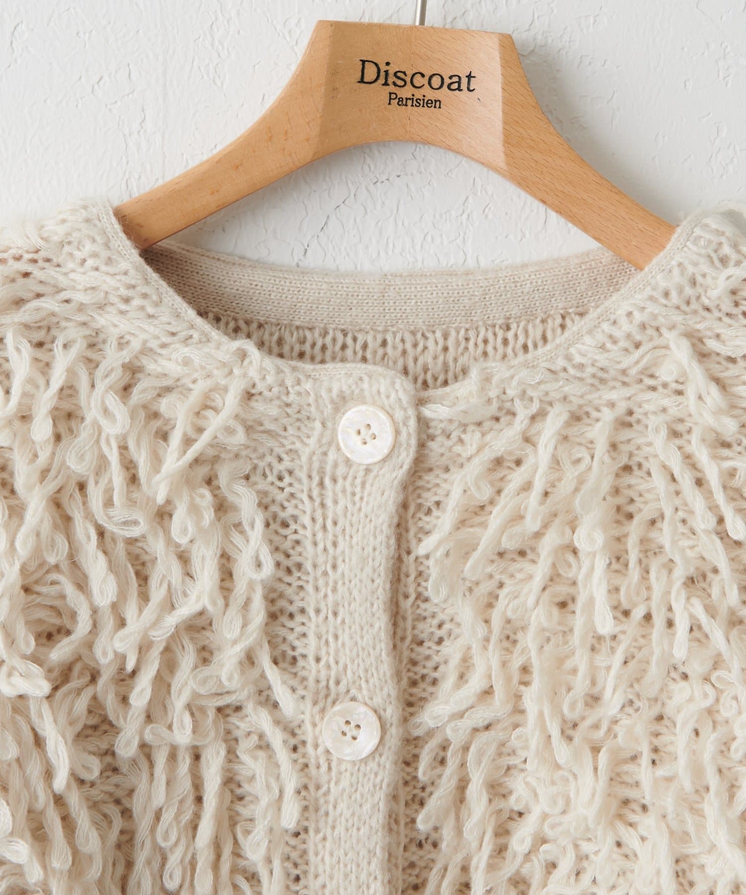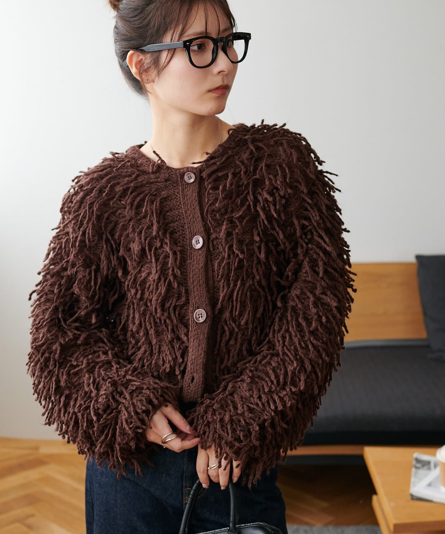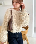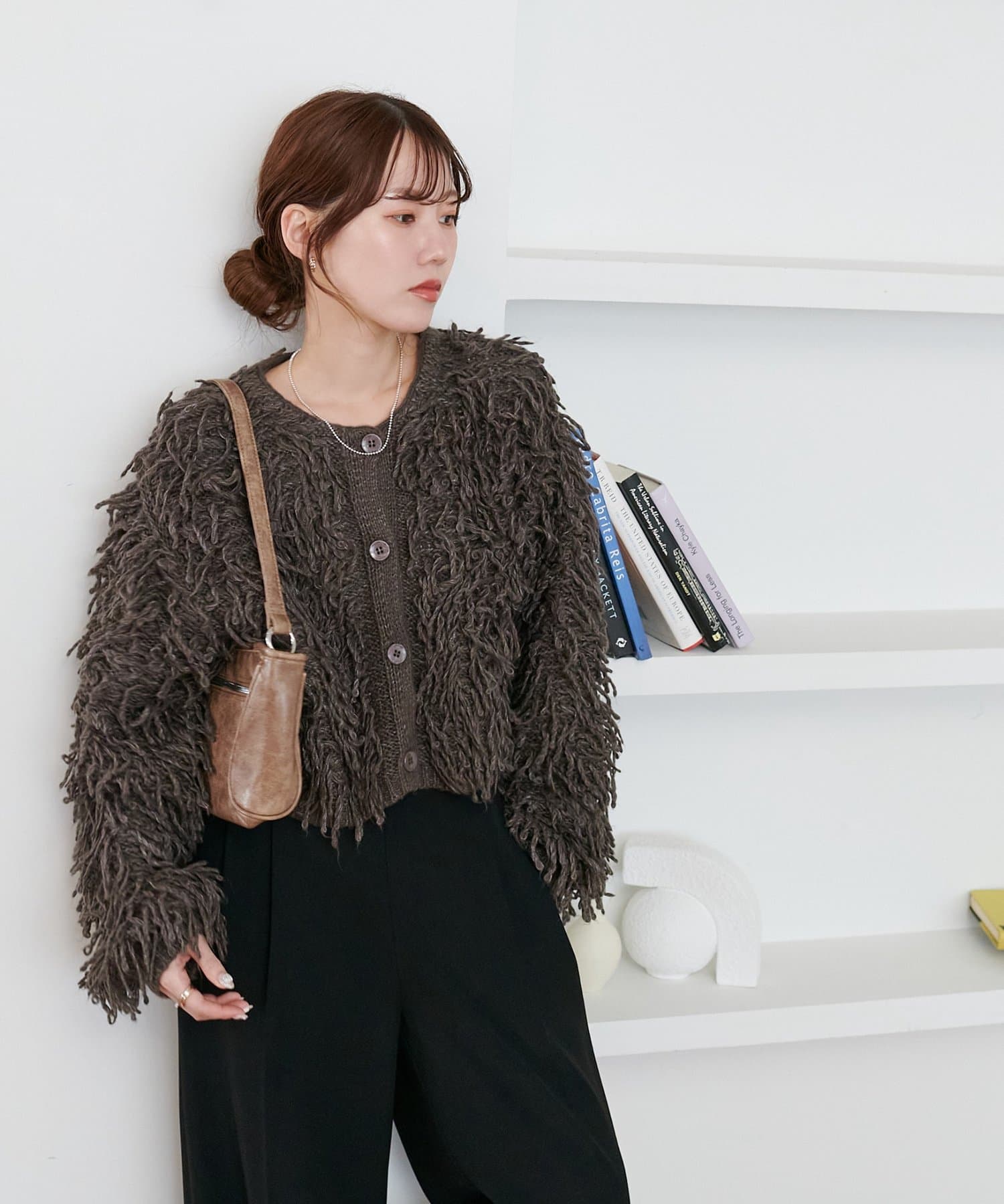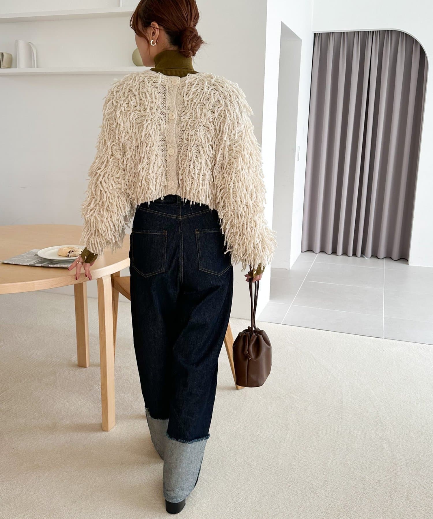 目を惹くボリュームのあるフリンジ素材が魅力。ボリューム感がありながらも、ショート丈なのでスッキリ見えします。前後2WAY仕様で、カーディガンとしても着用できるので様々な着こなしを楽しめます♩