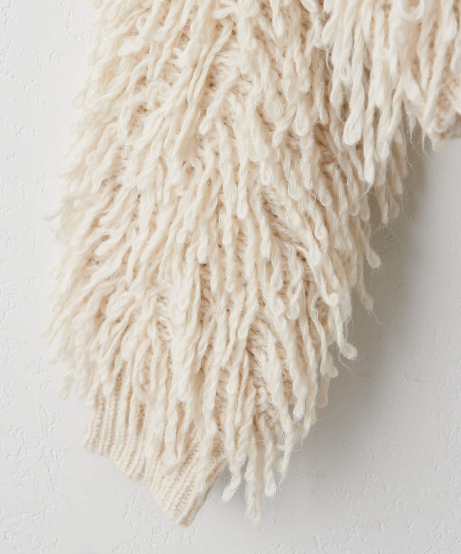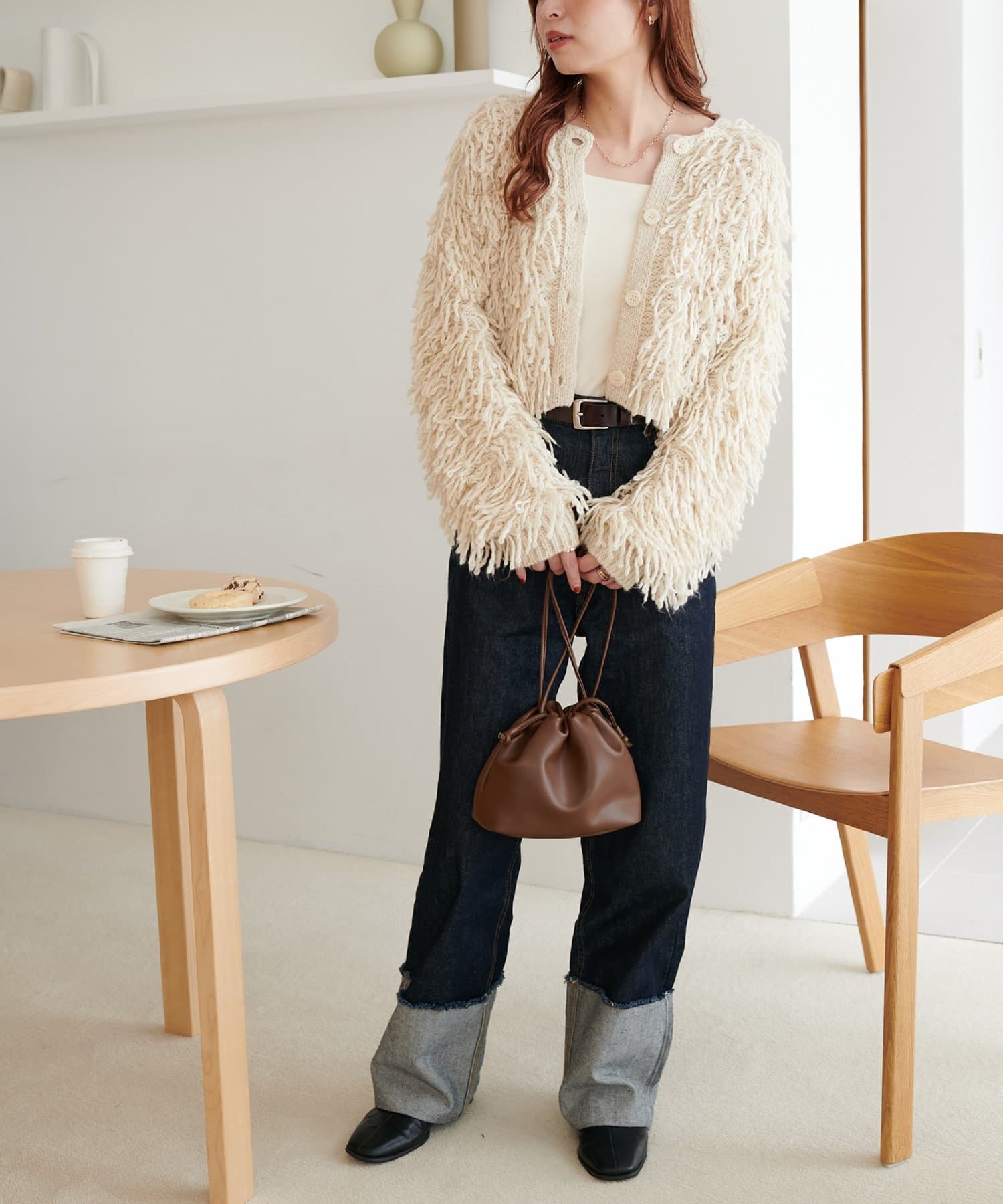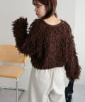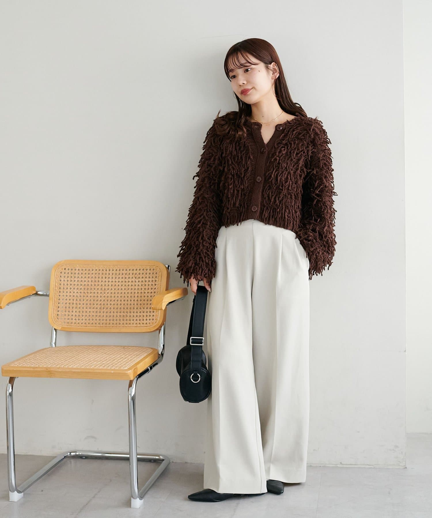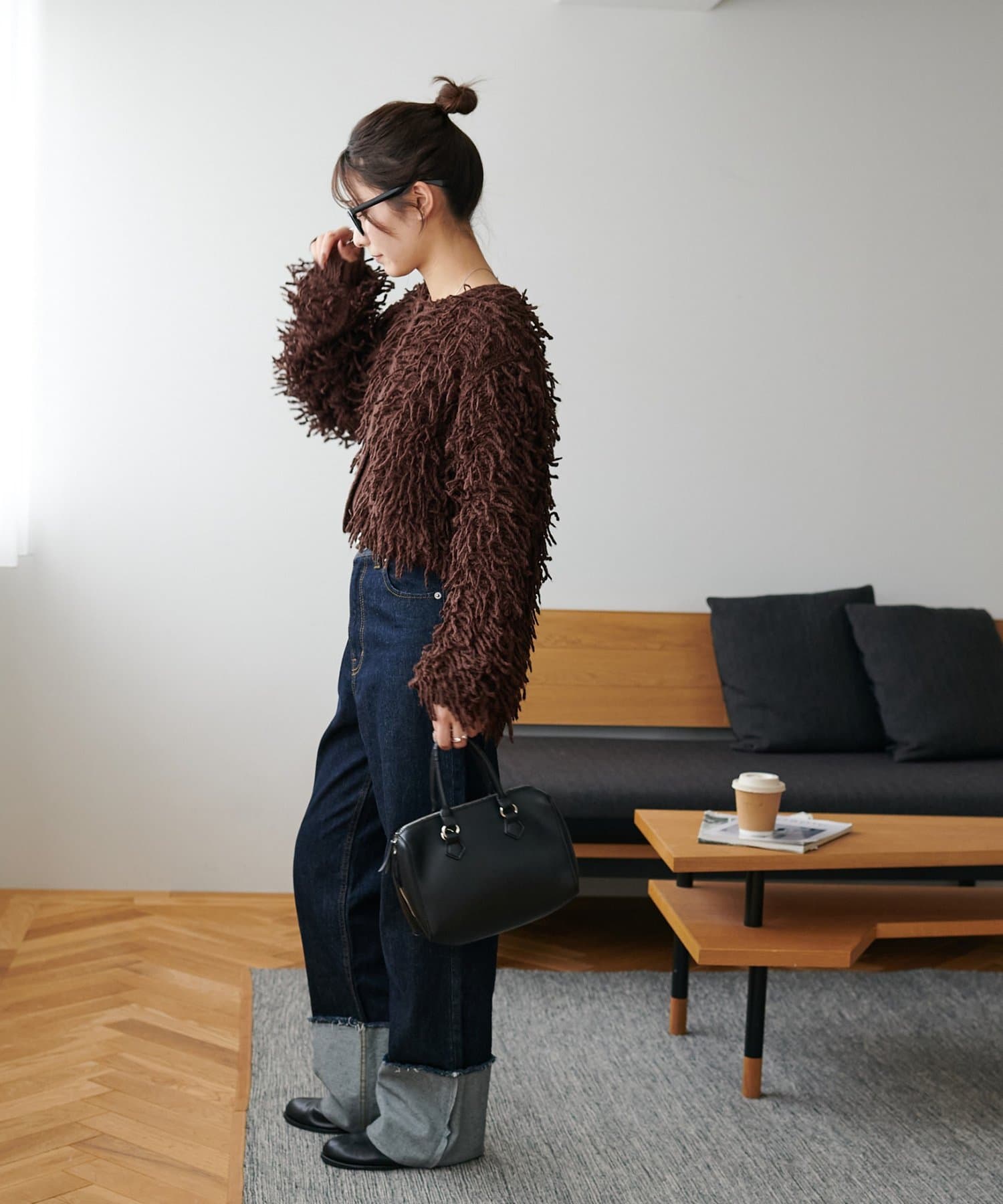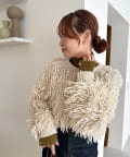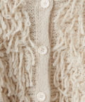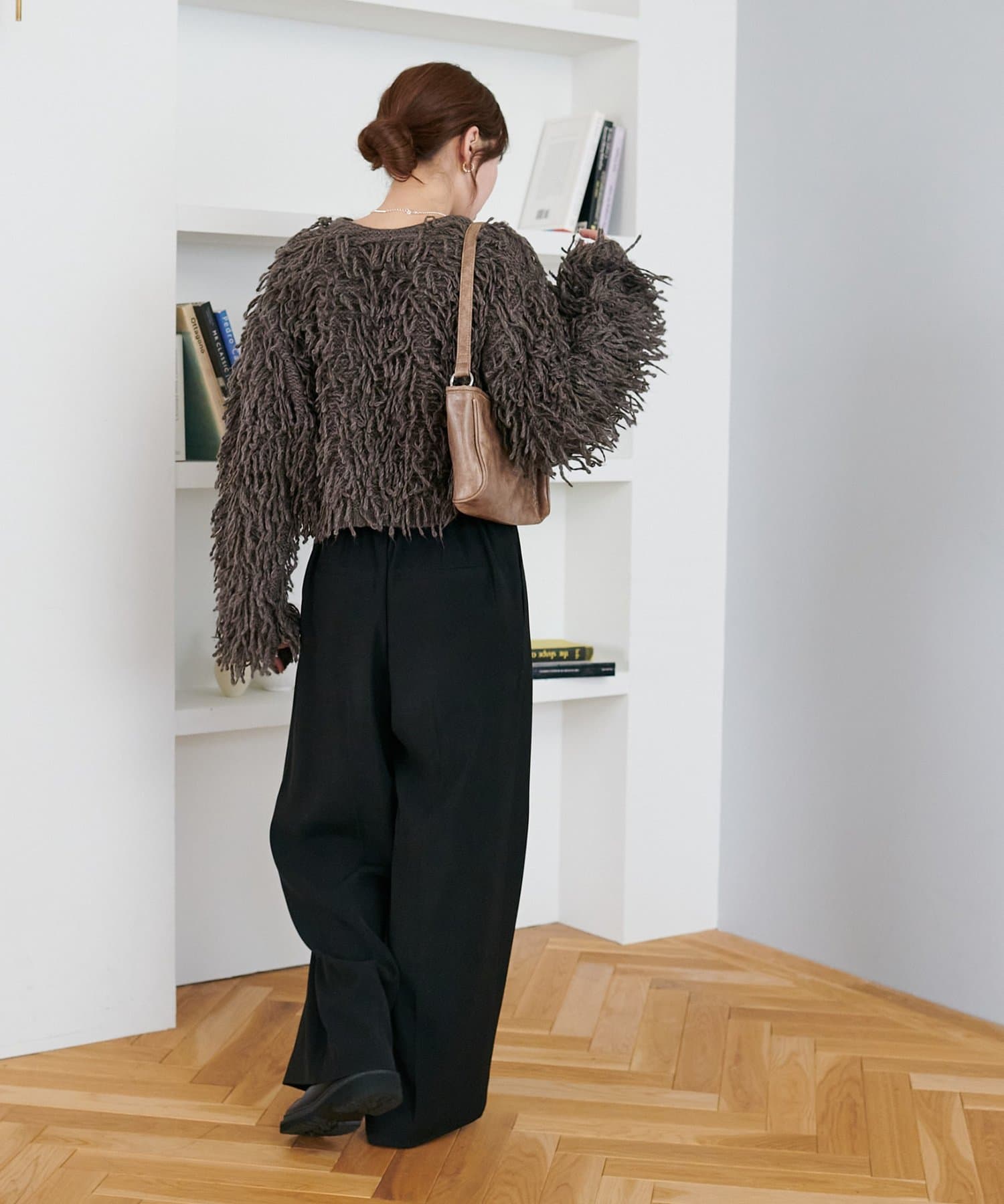 目を惹くボリュームのあるフリンジ素材が魅力。ボリューム感がありながらも、ショート丈なのでスッキリ見えします。前後2WAY仕様で、カーディガンとしても着用できるので様々な着こなしを楽しめます♩