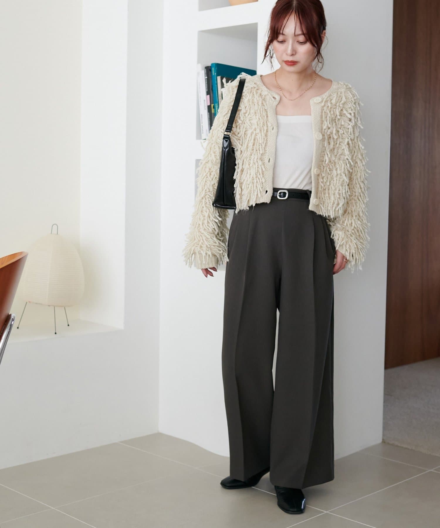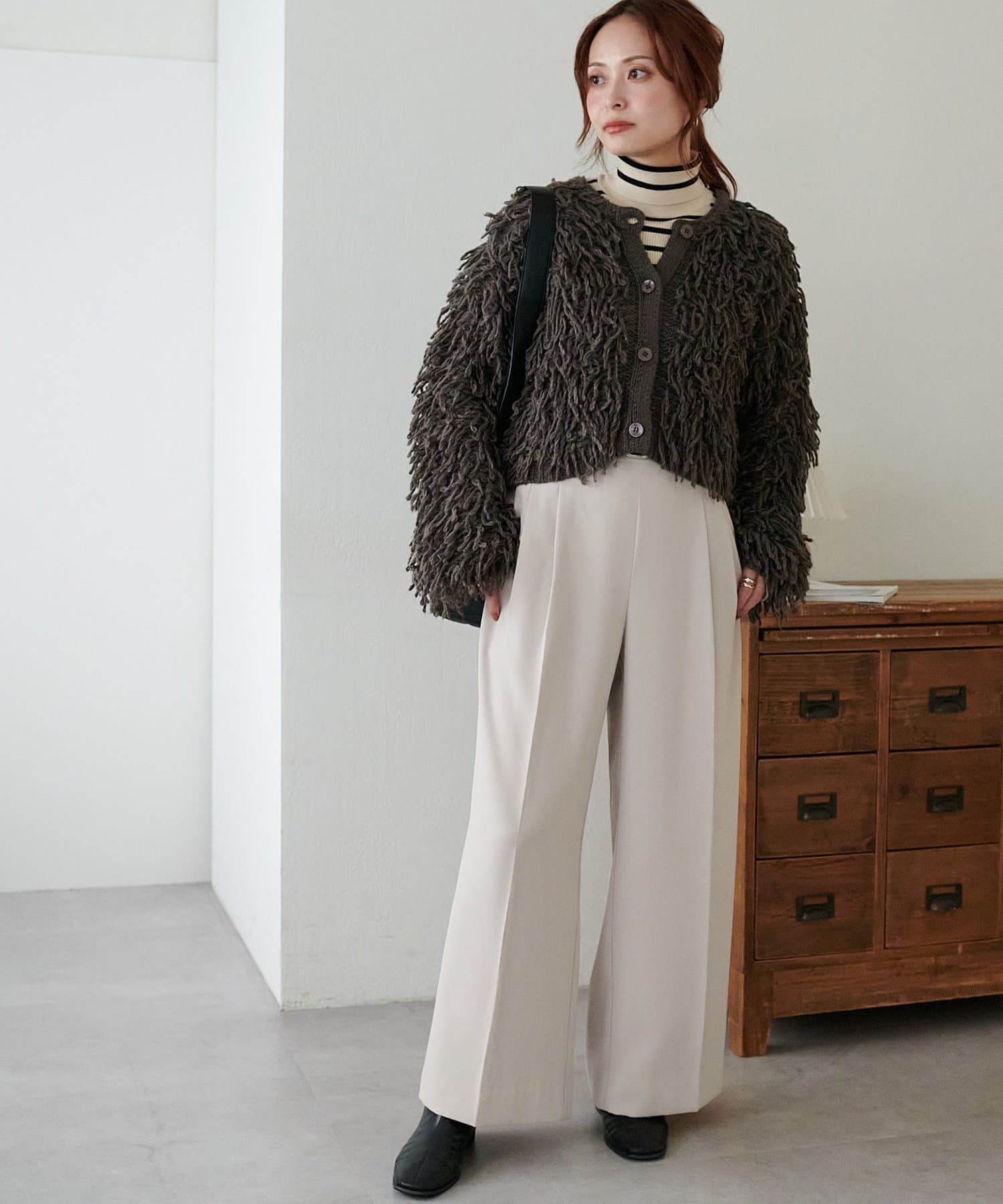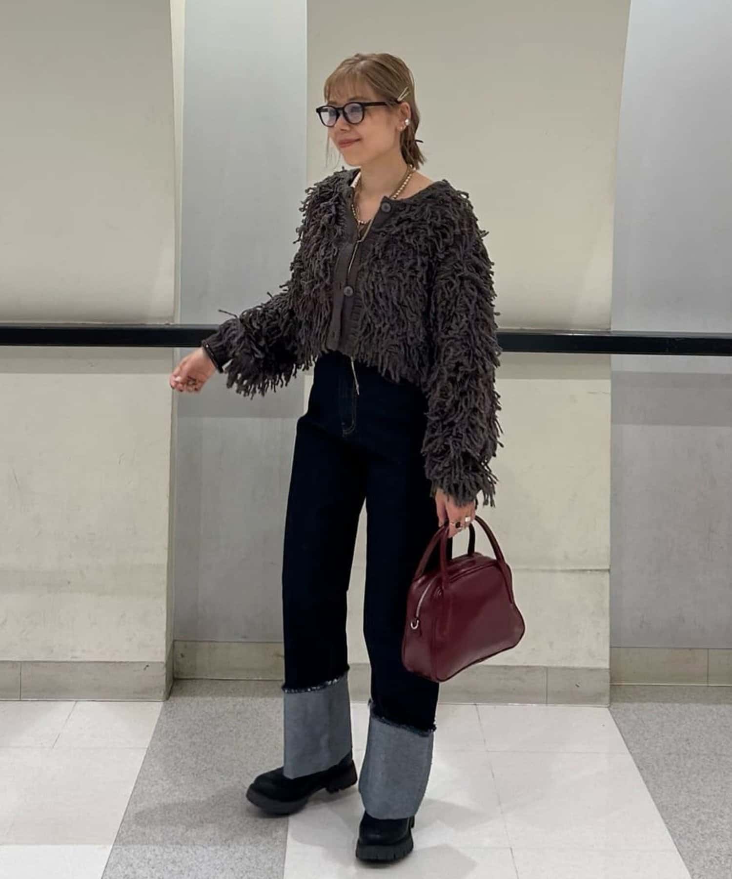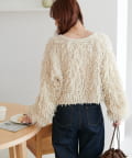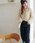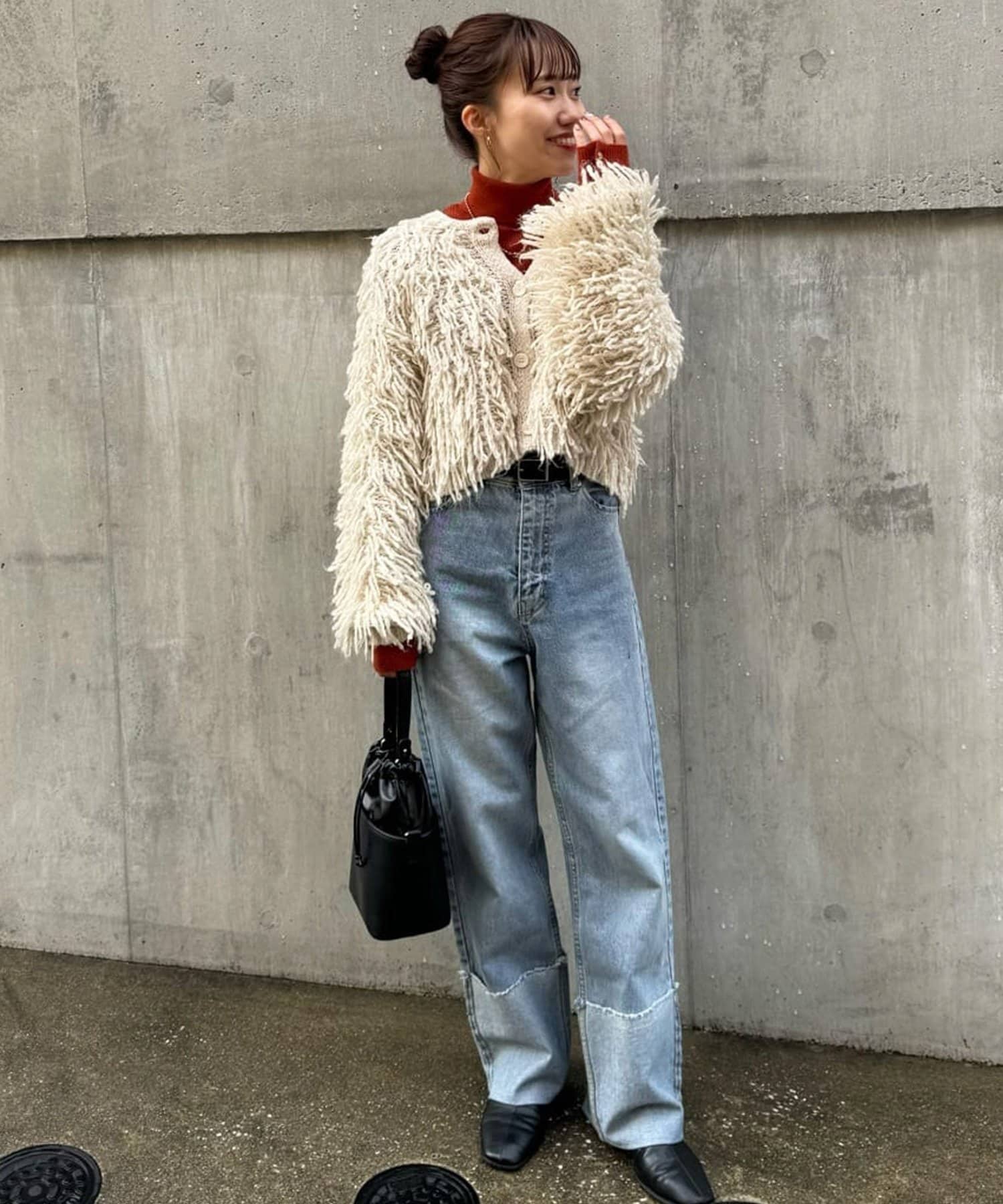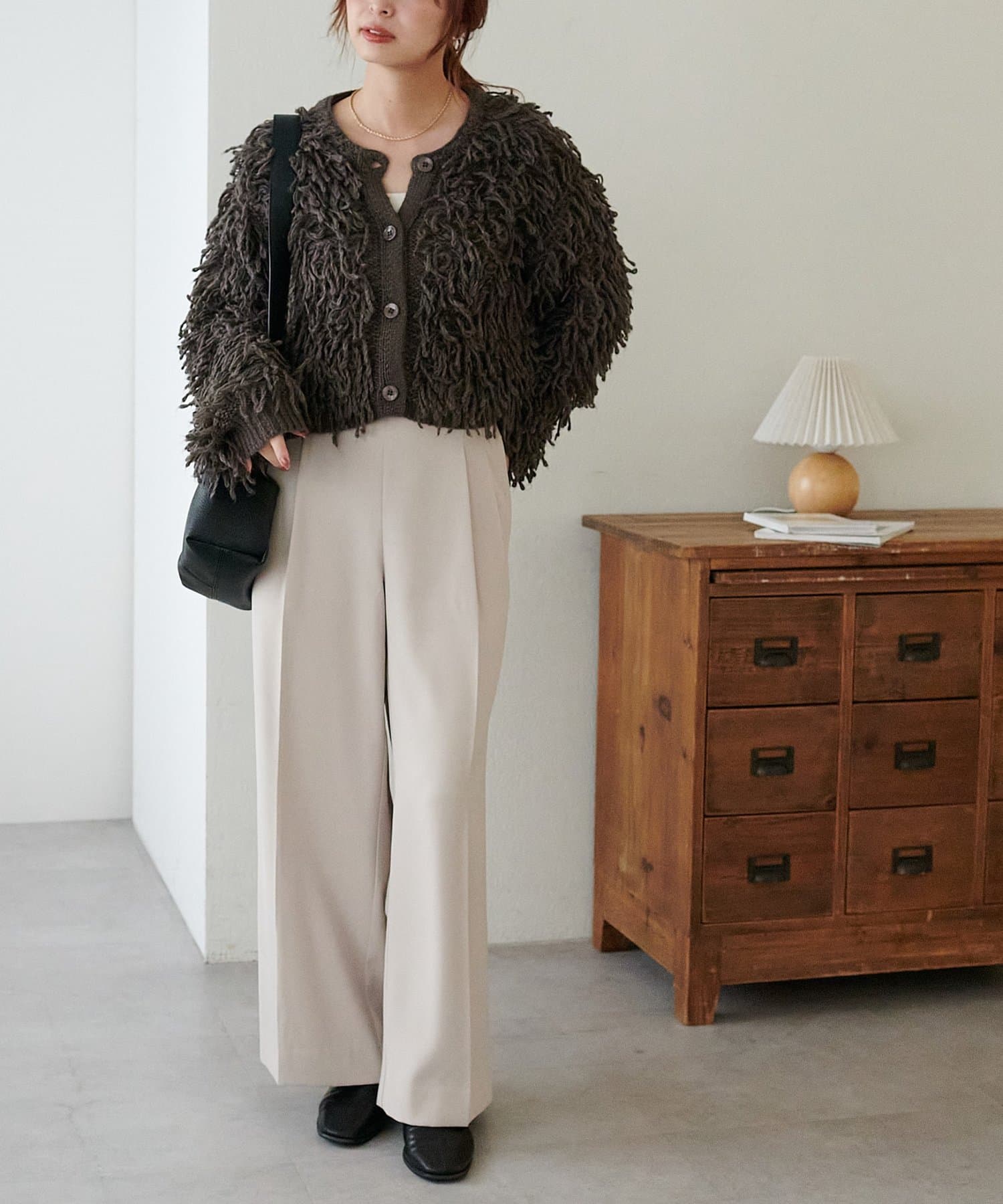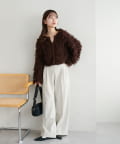 目を惹くボリュームのあるフリンジ素材が魅力。ボリューム感がありながらも、ショート丈なのでスッキリ見えします。前後2WAY仕様で、カーディガンとしても着用できるので様々な着こなしを楽しめます♩